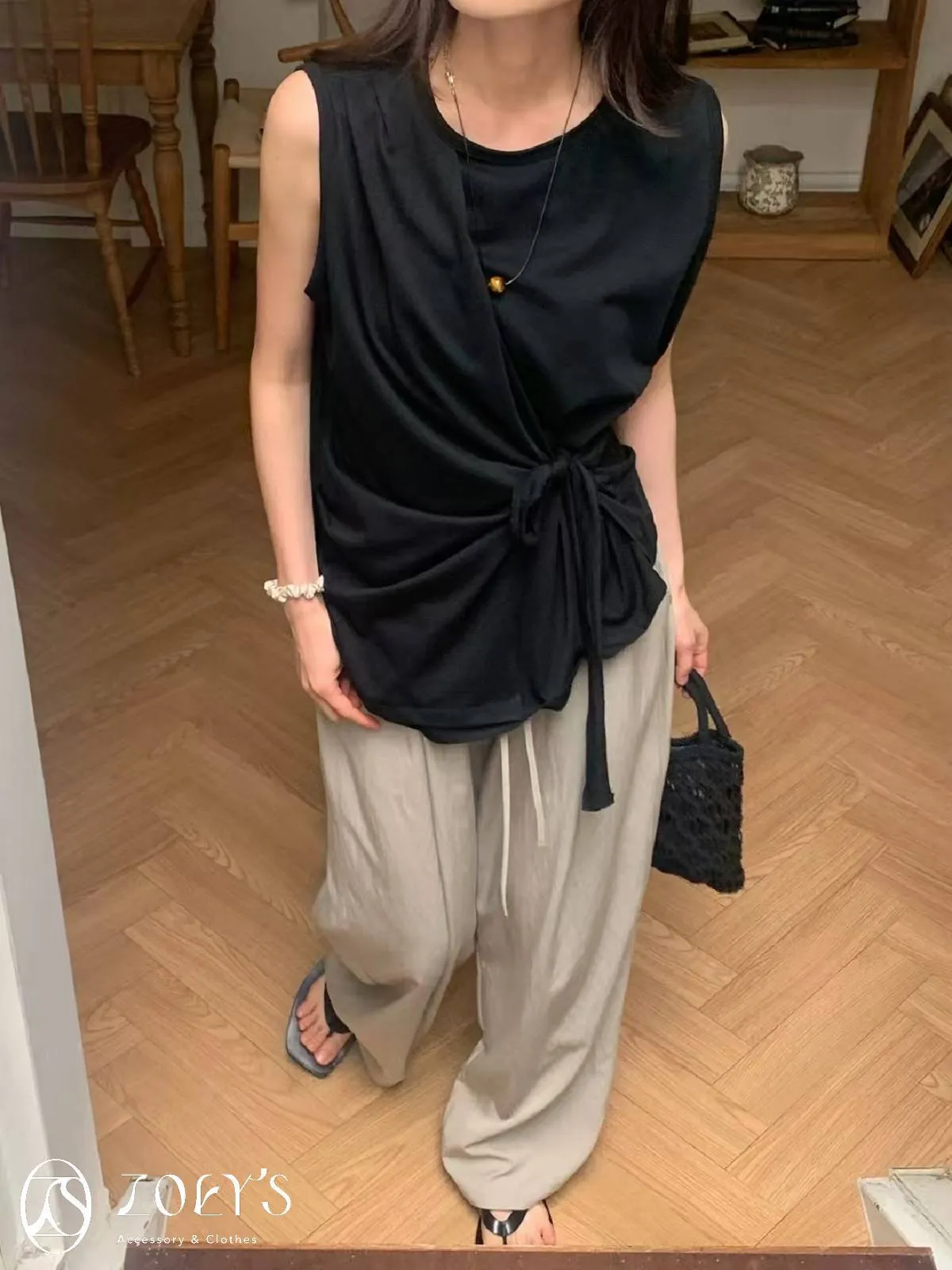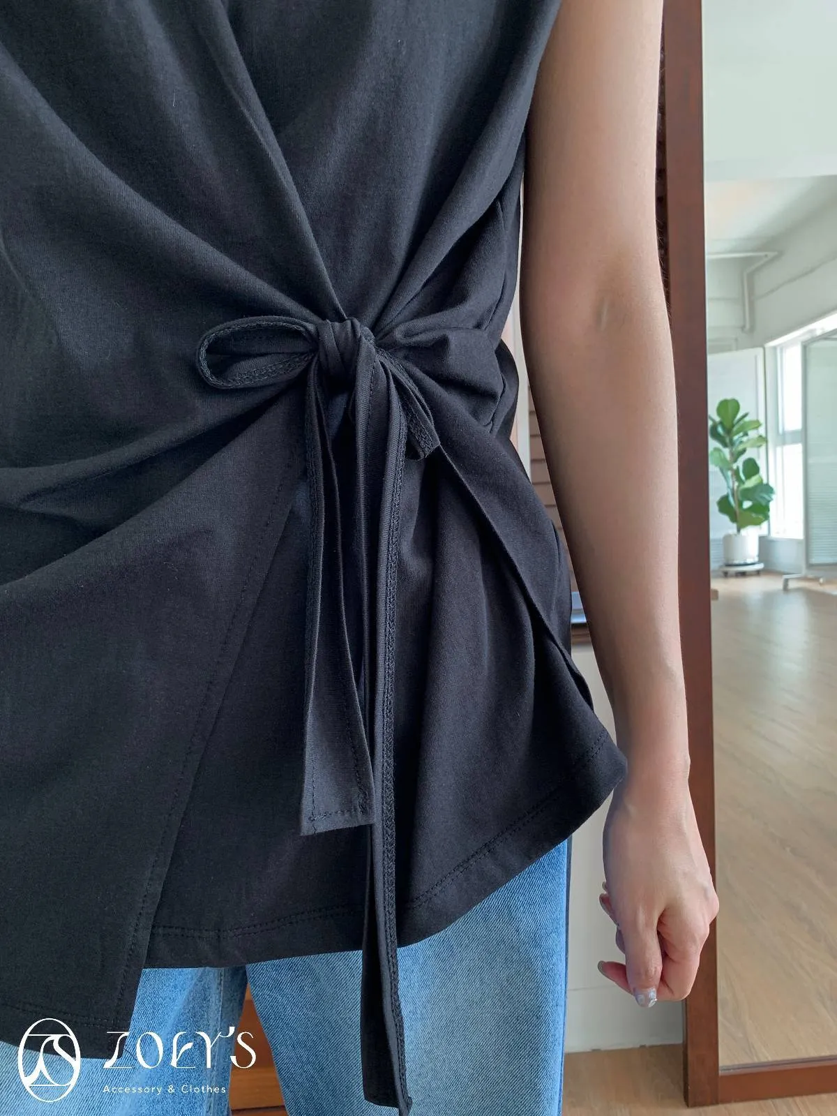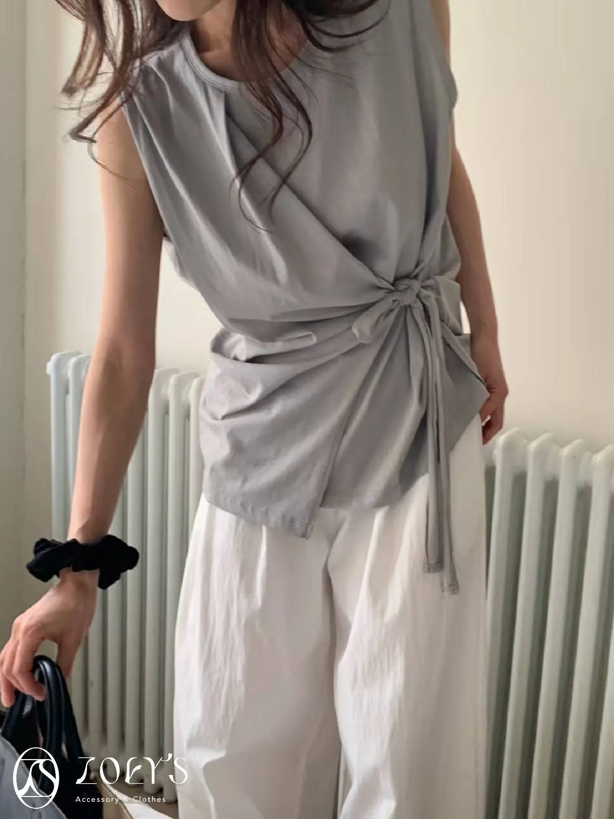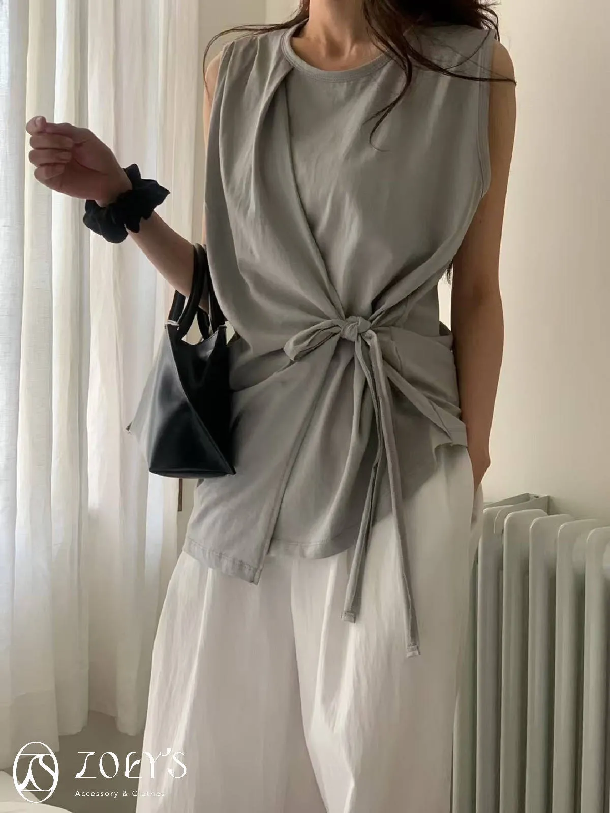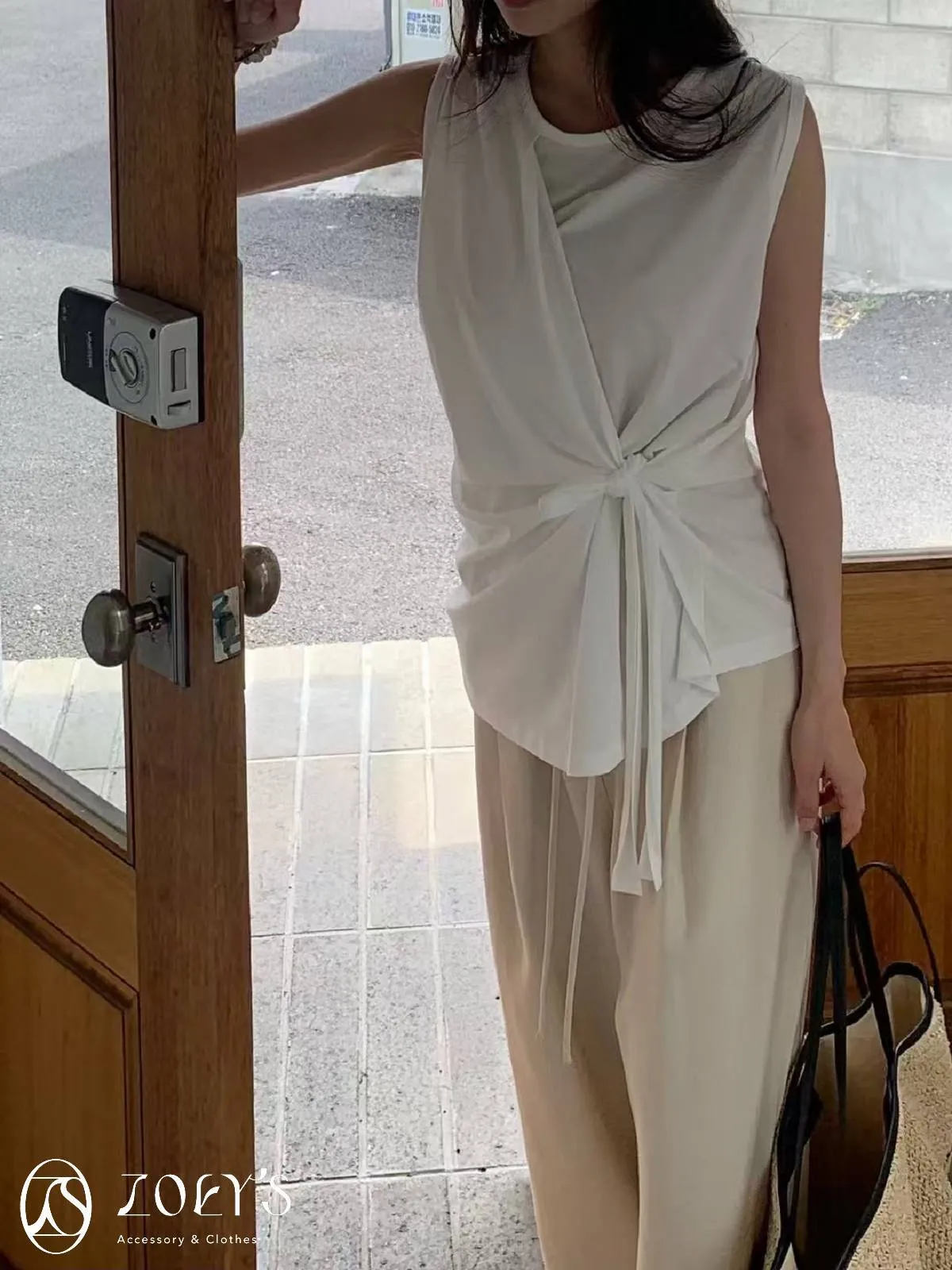 領口右邊單褶往下延伸,綁結是兩條繩子,隨意綁蝴蝶結就好