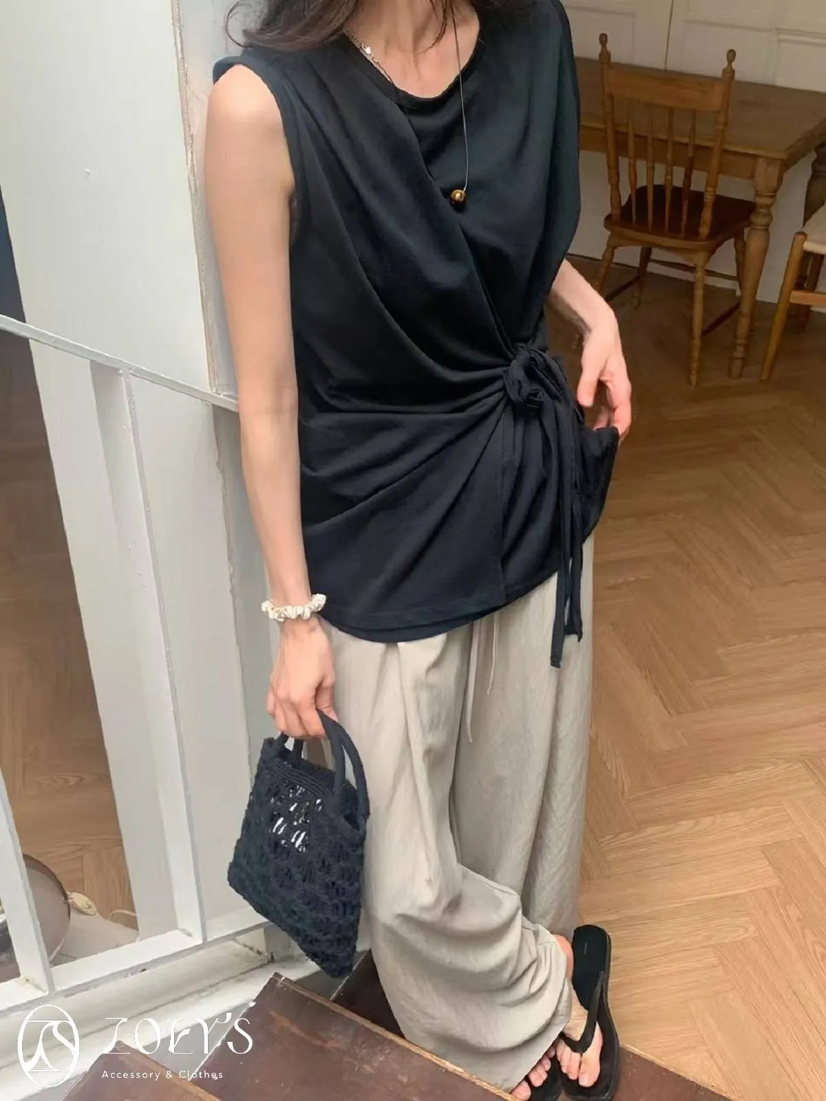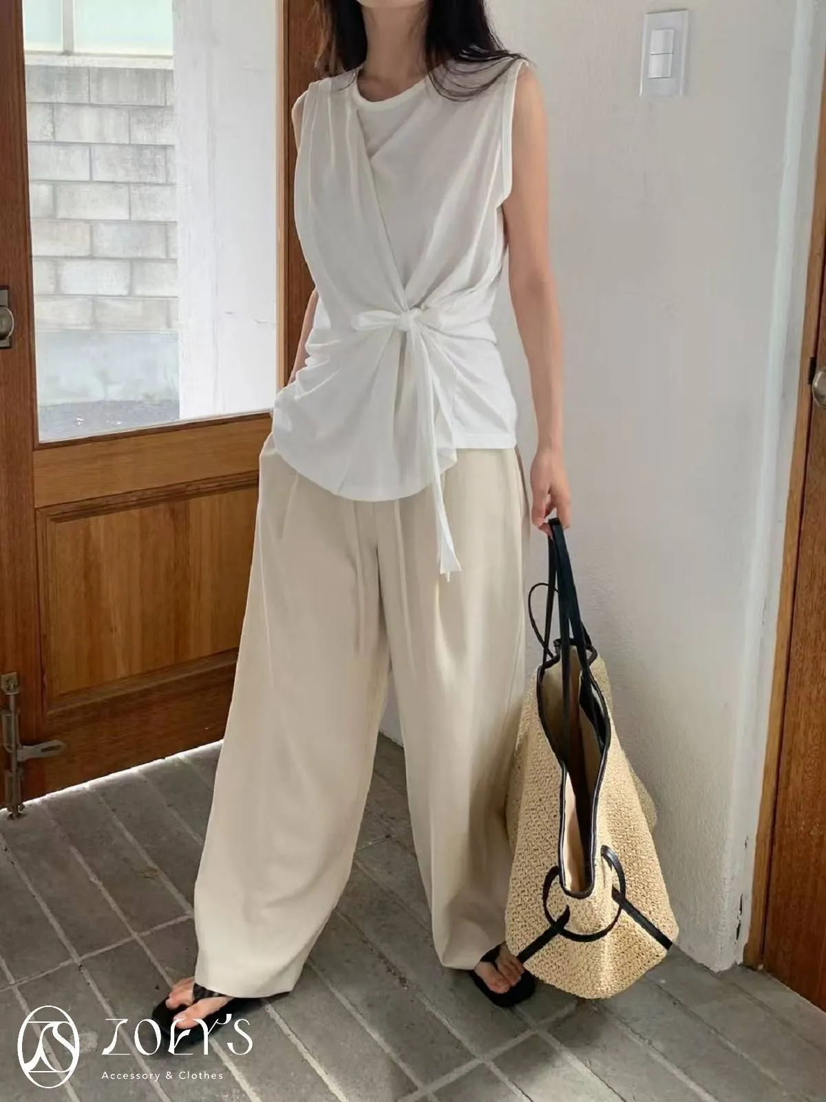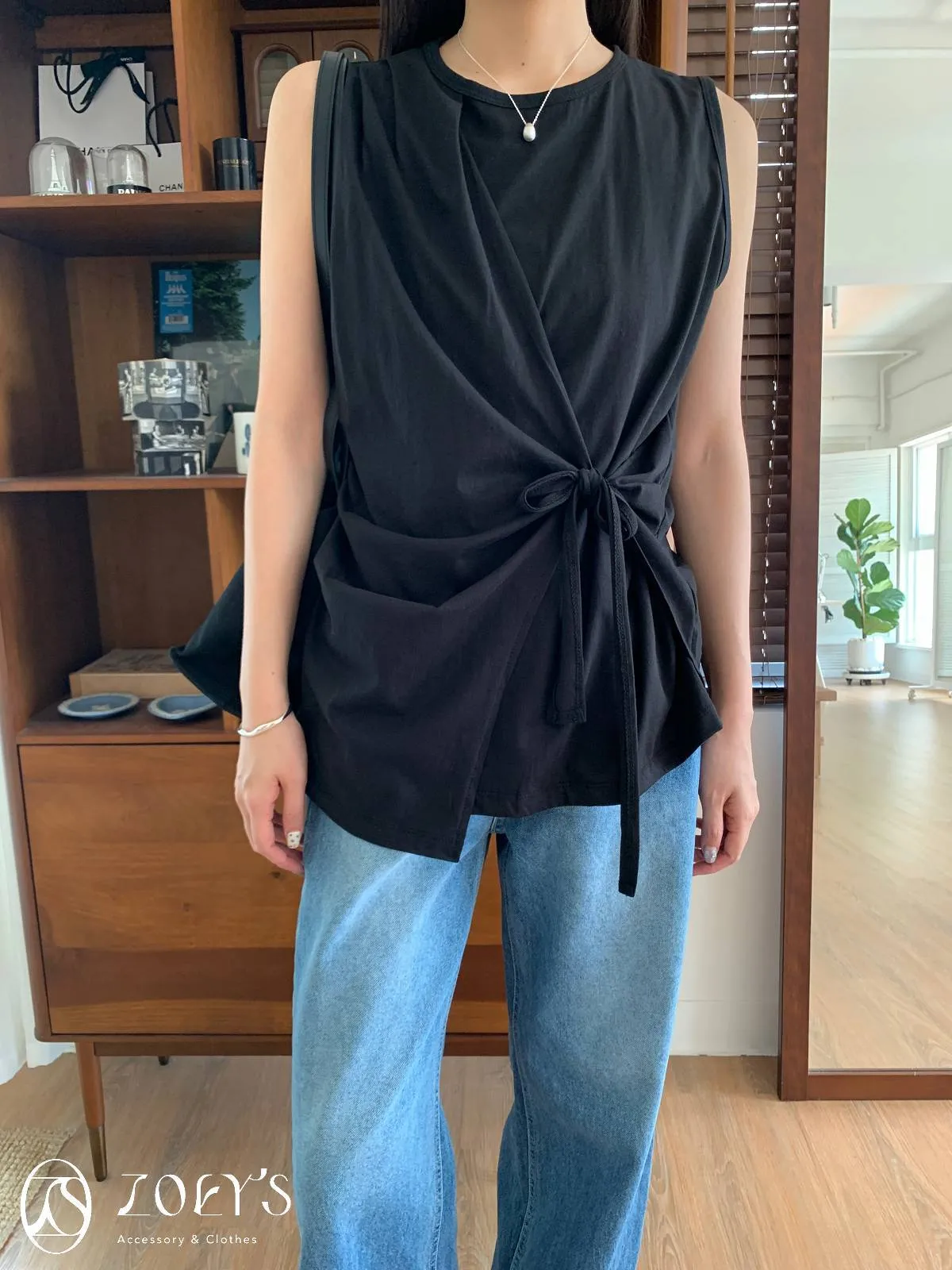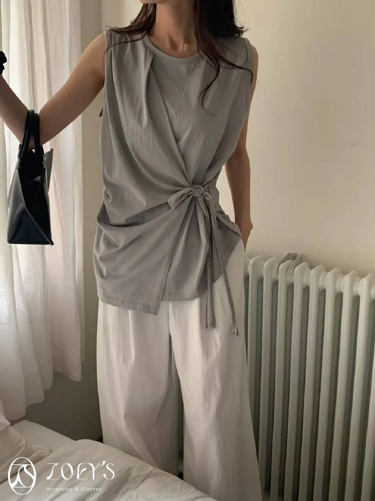 領口右邊單褶往下延伸,綁結是兩條繩子,隨意綁蝴蝶結就好