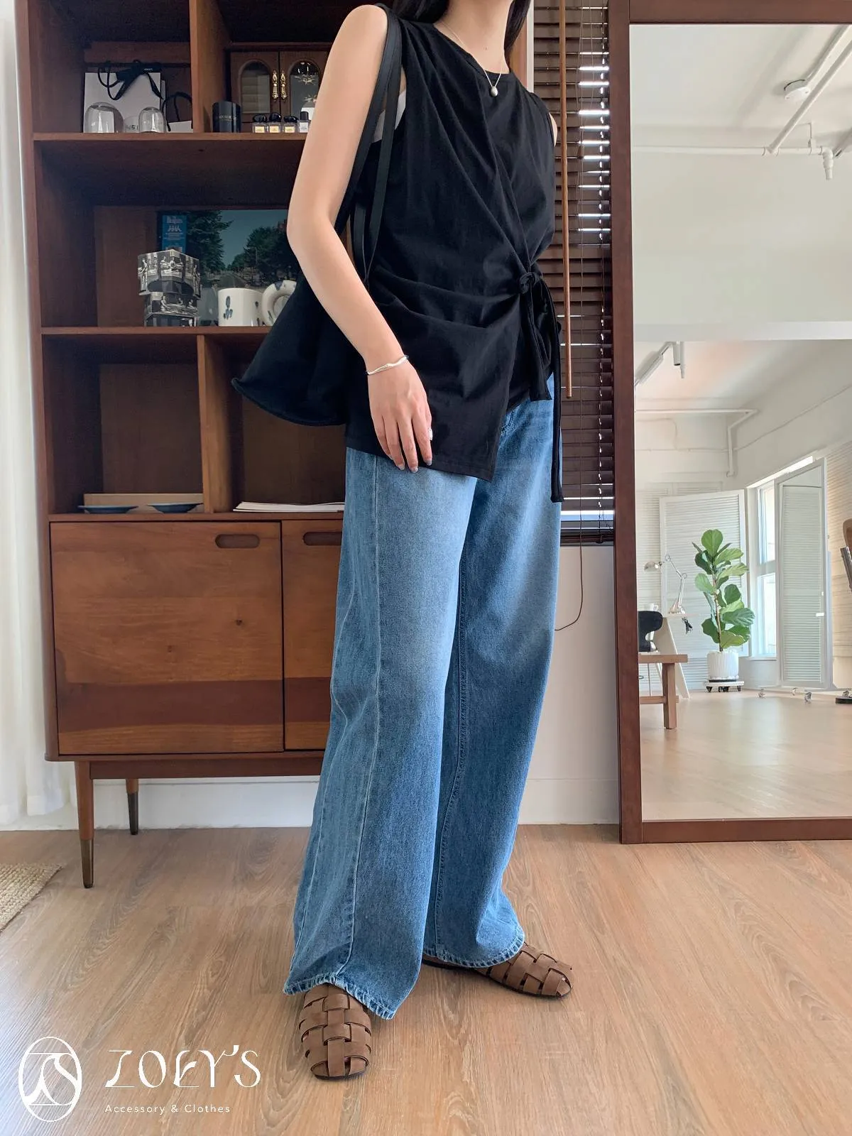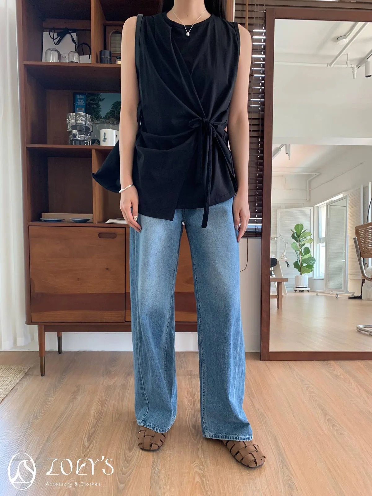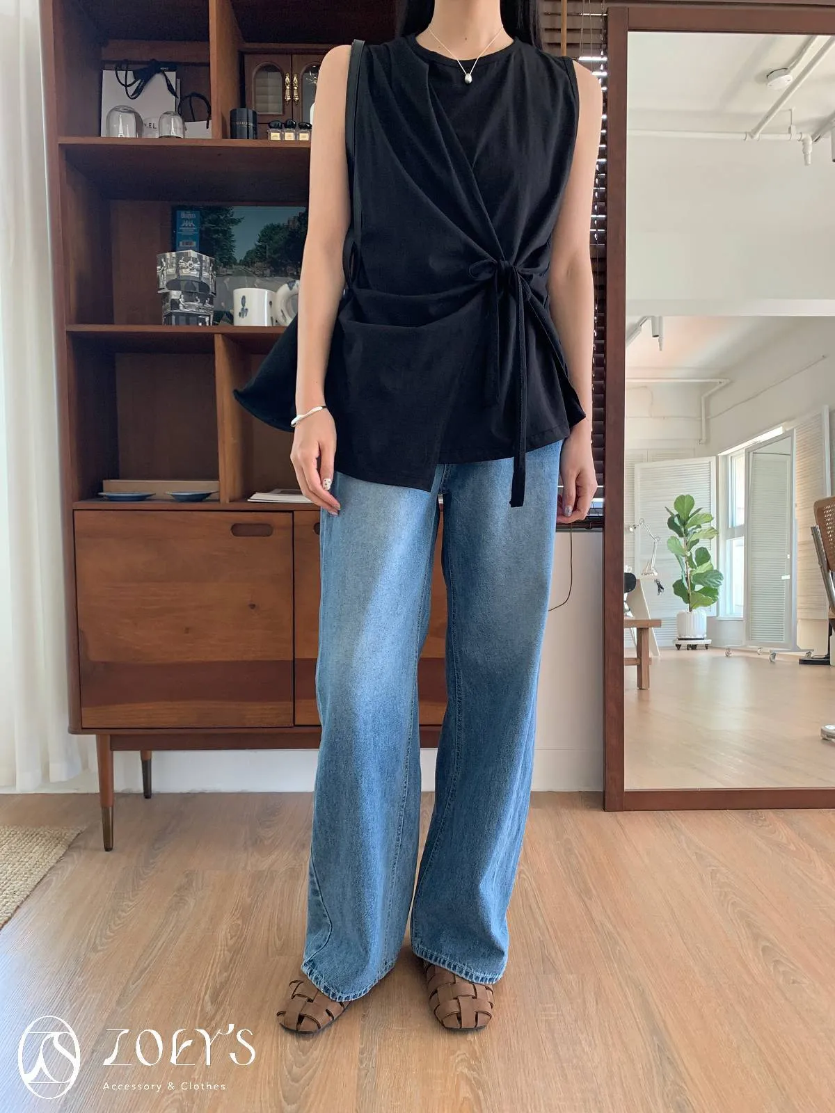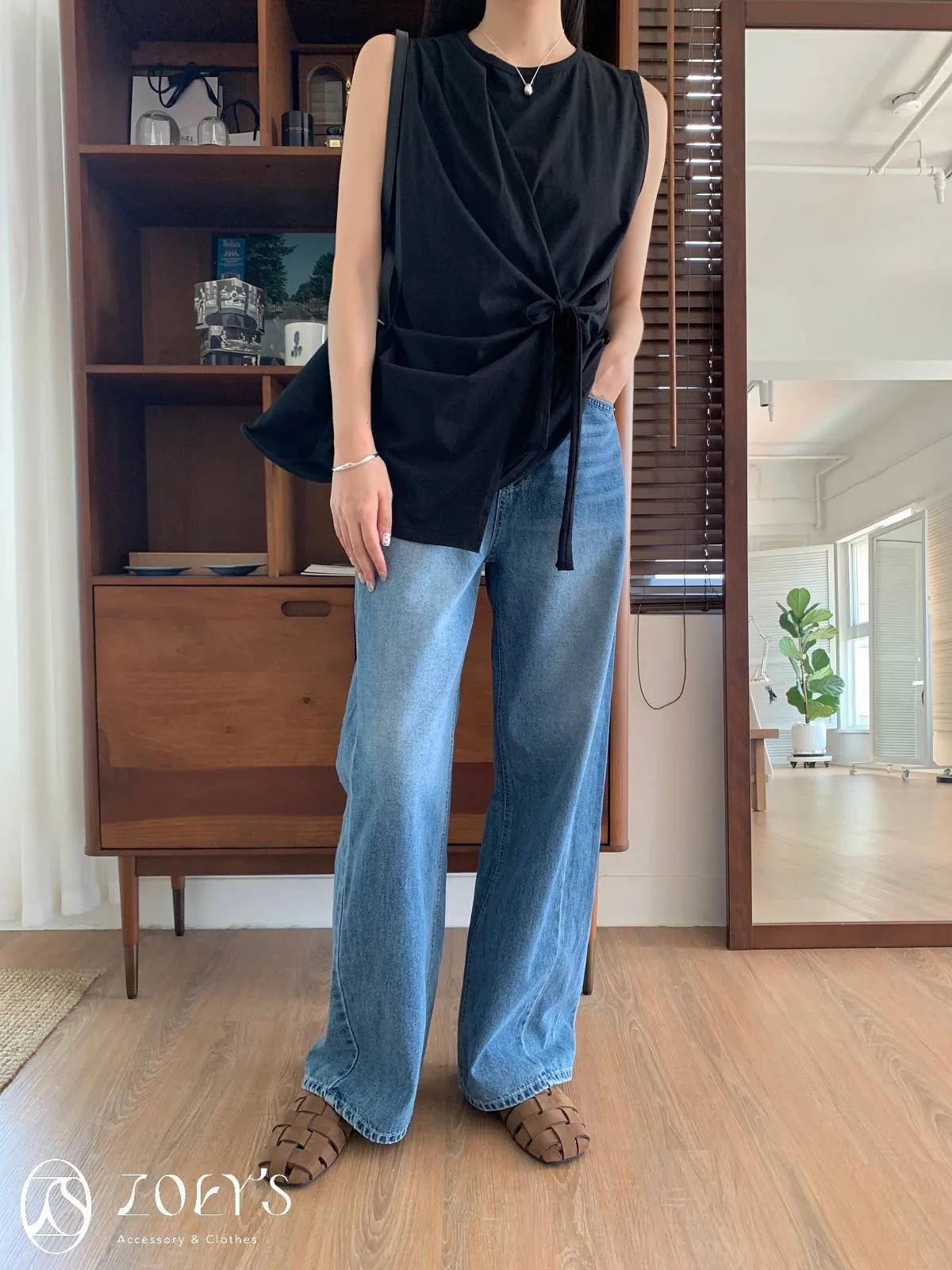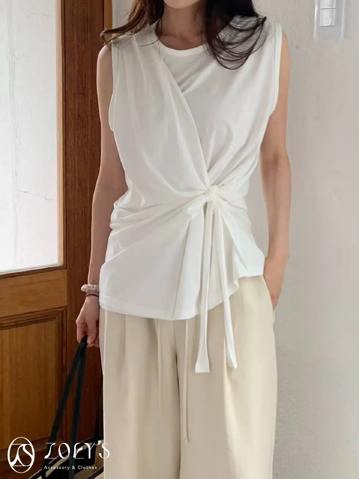 領口右邊單褶往下延伸,綁結是兩條繩子,隨意綁蝴蝶結就好