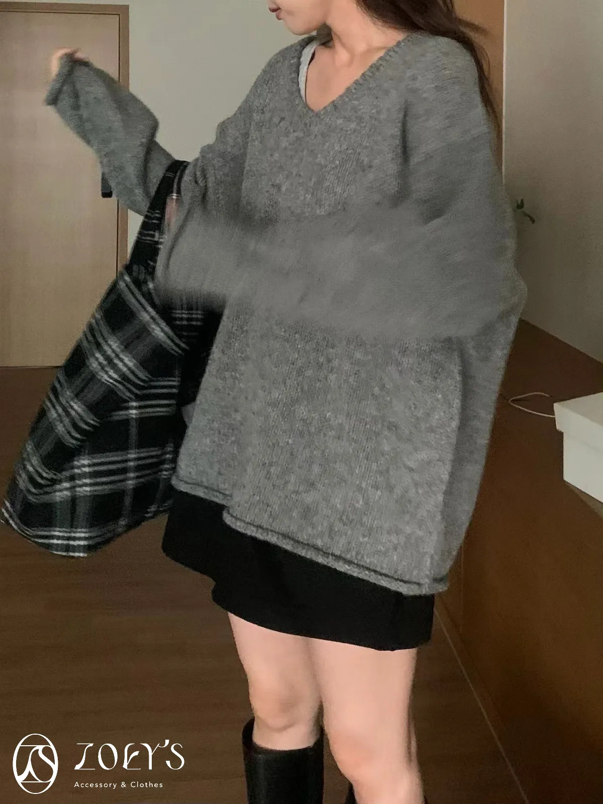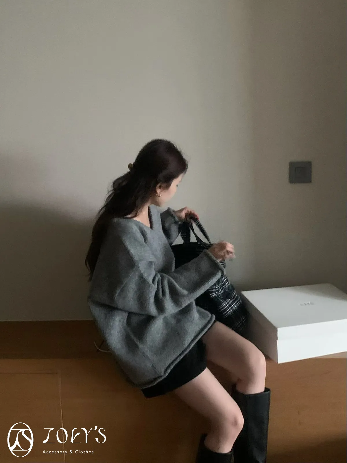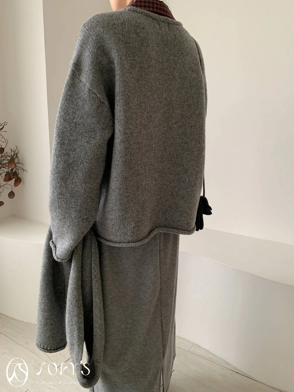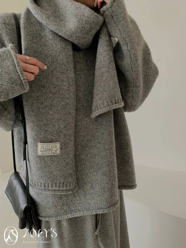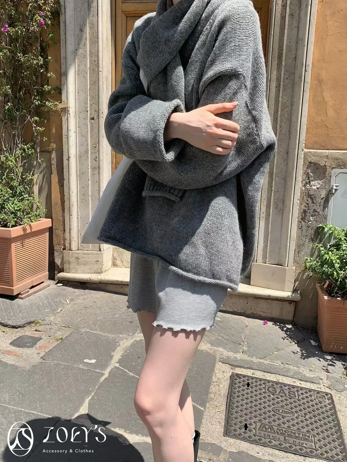 正韓 捲邊V領羊毛衫&圍巾SET 灰/米