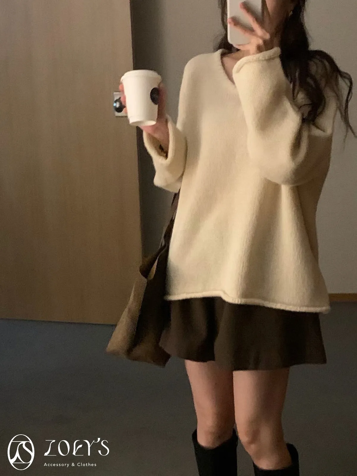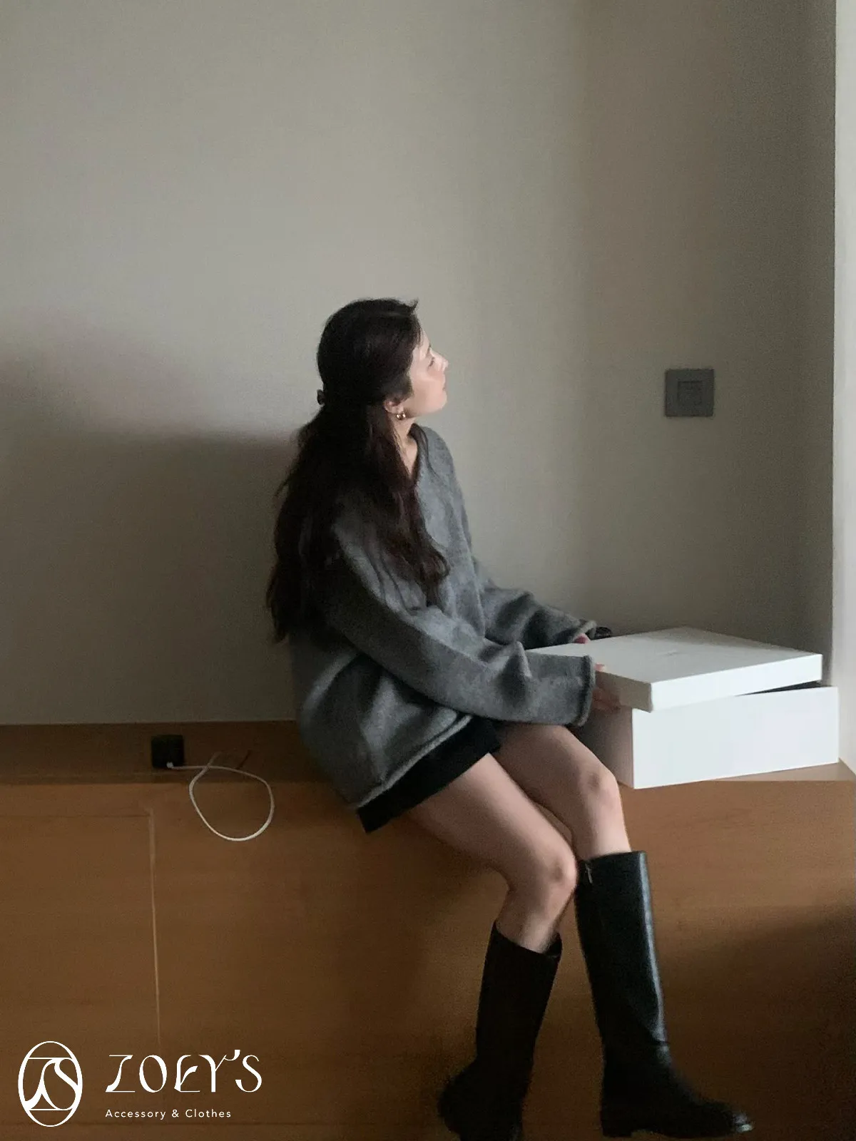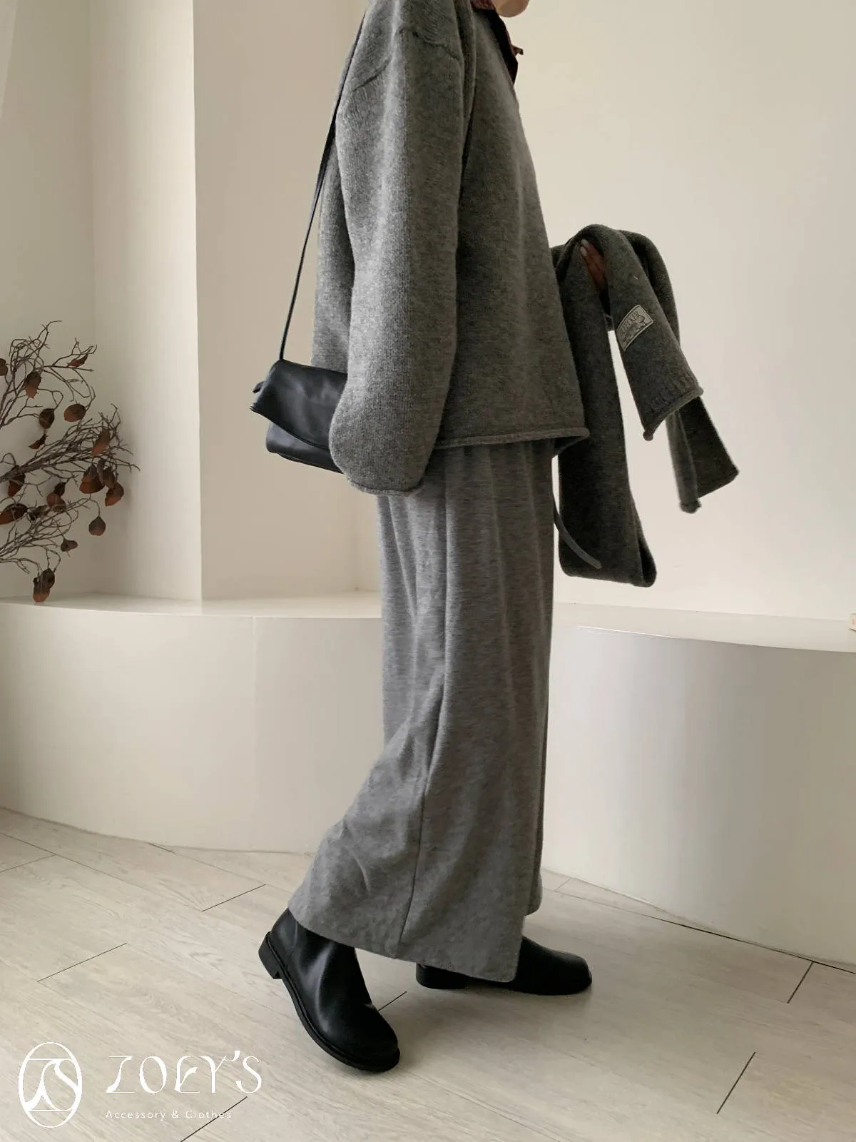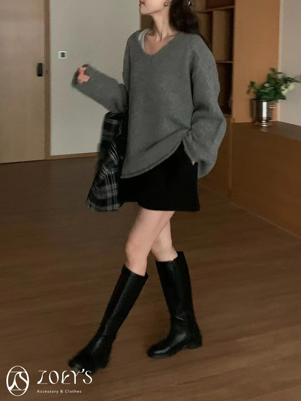 正韓 捲邊V領羊毛衫&圍巾SET 灰/米