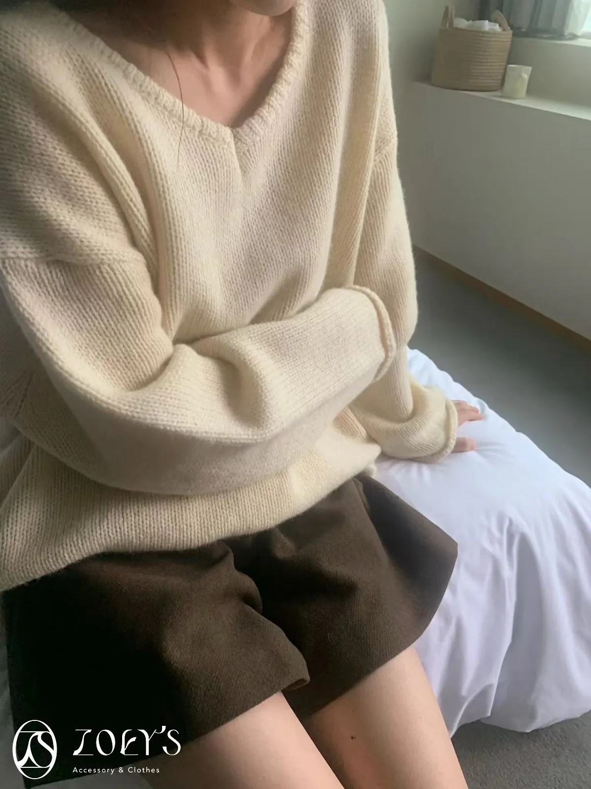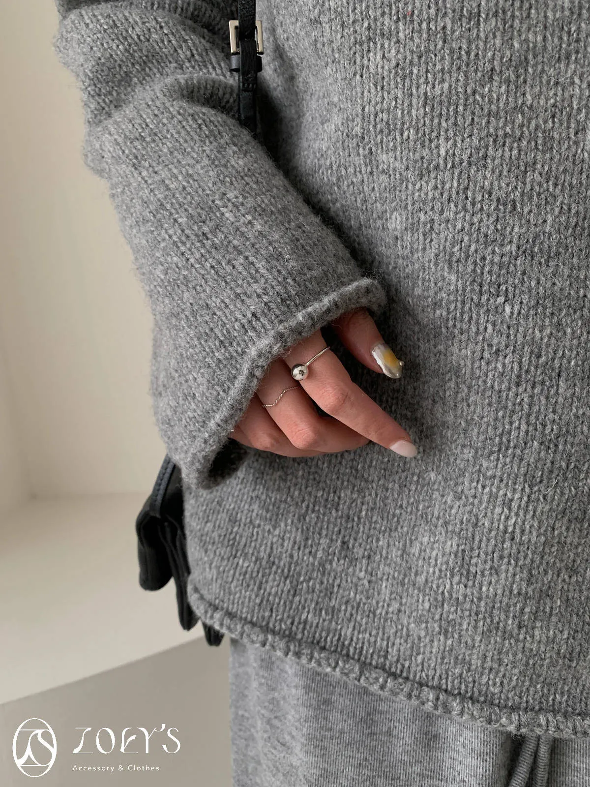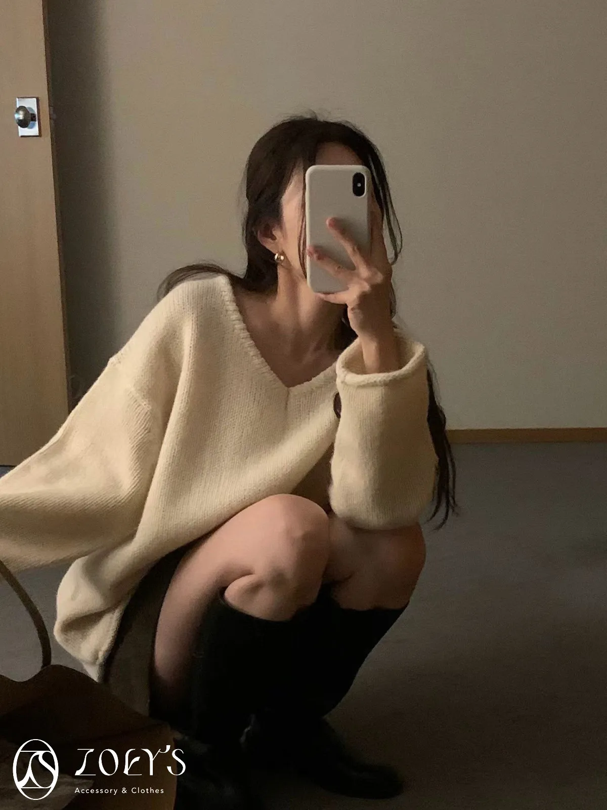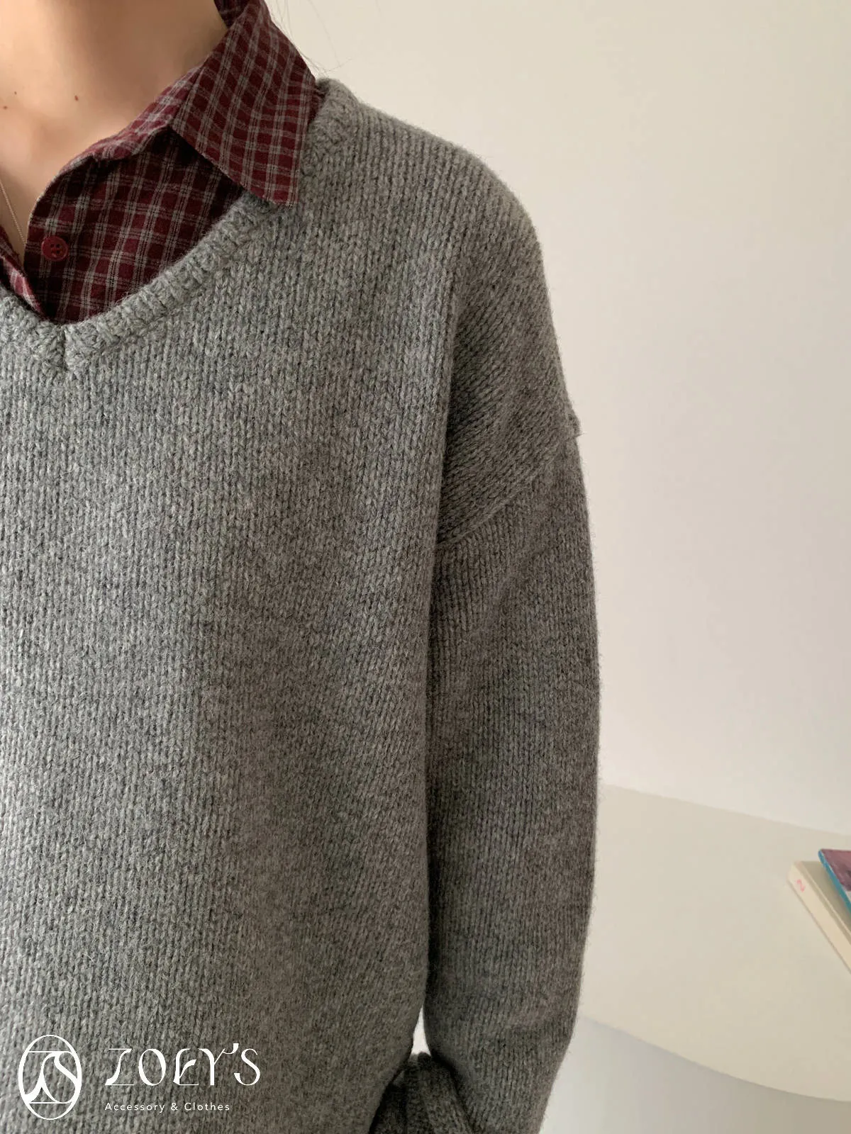 正韓 捲邊V領羊毛衫&圍巾SET 灰/米