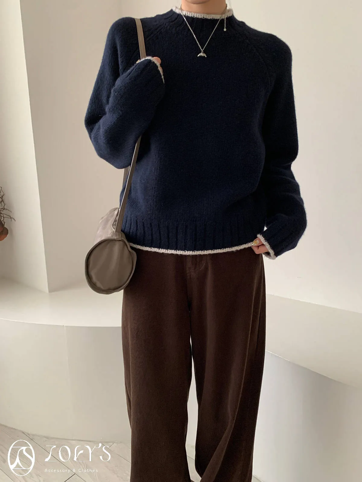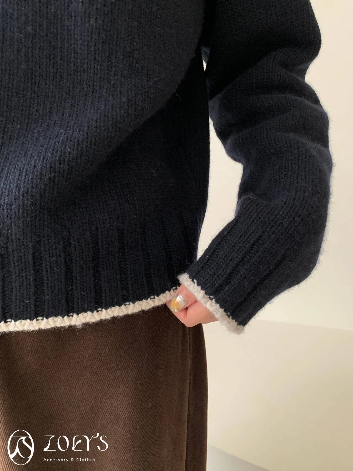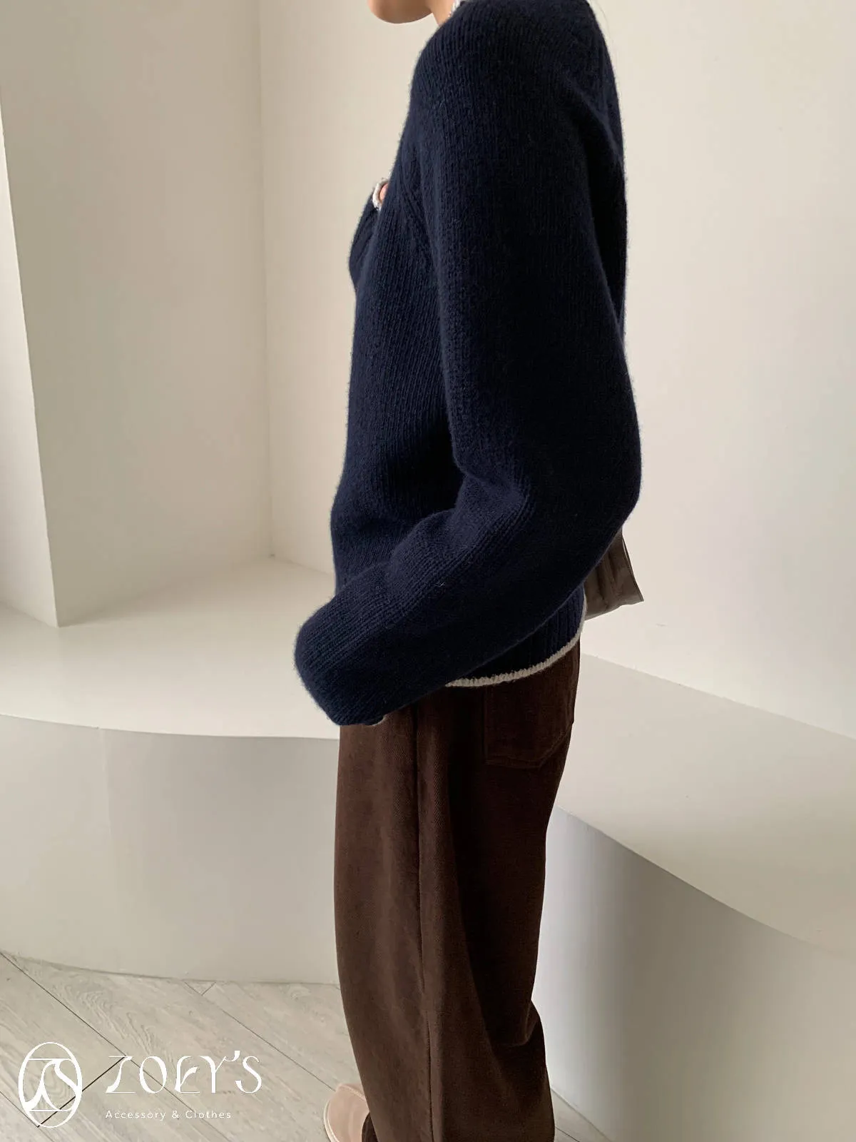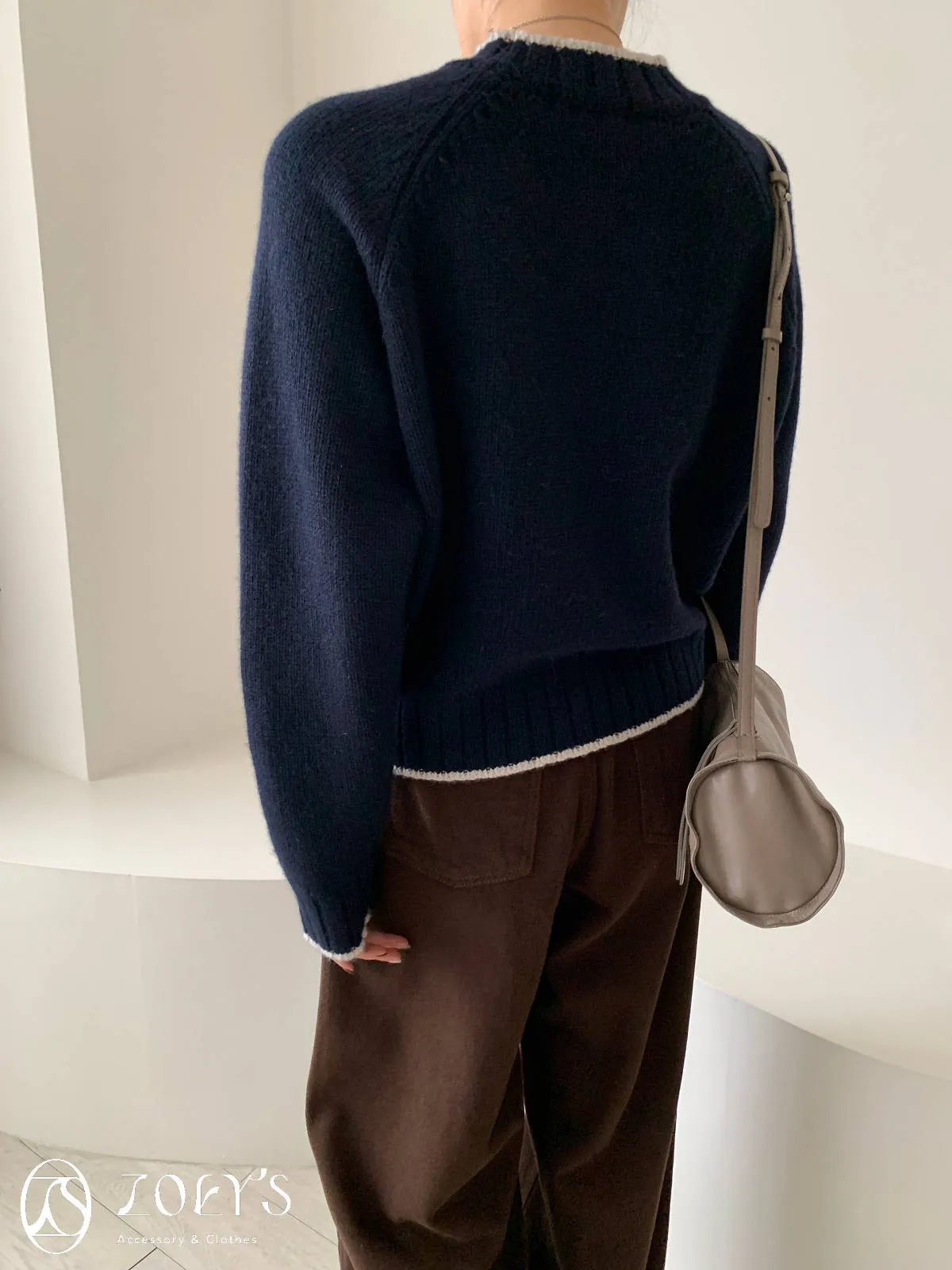 正韓 撞色滾邊小立領羊毛衫 深藍/米