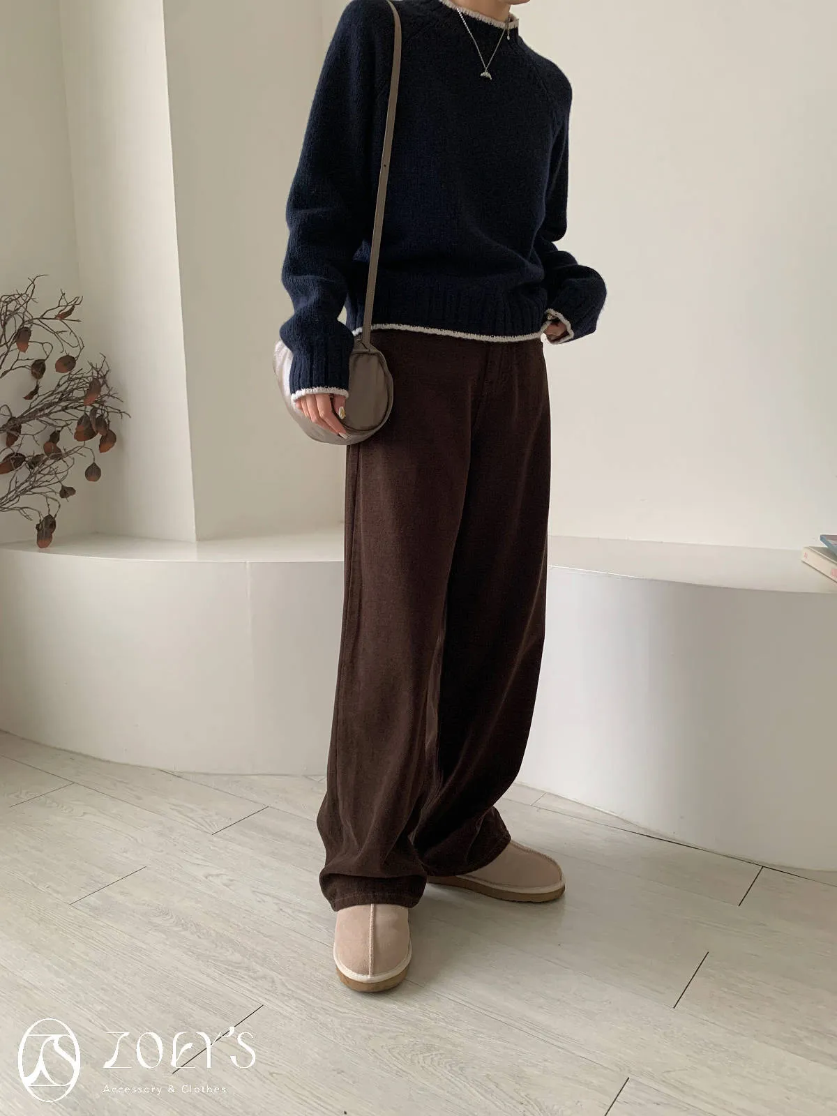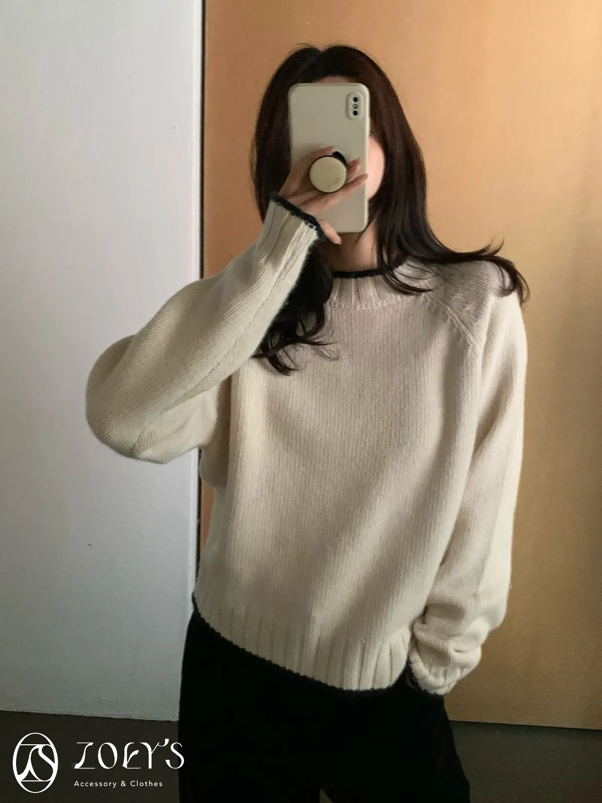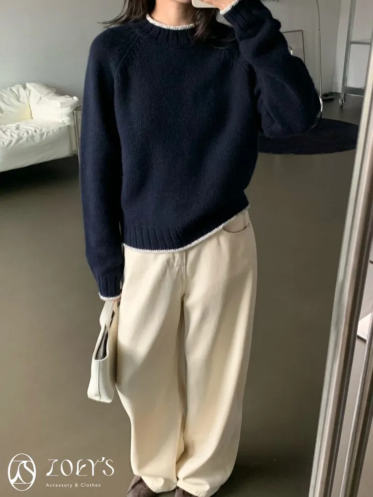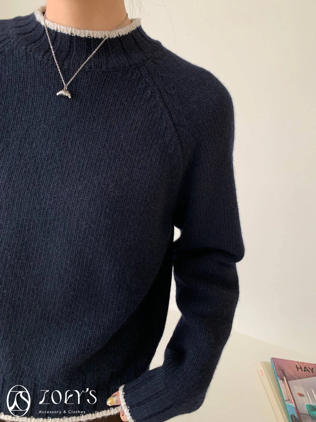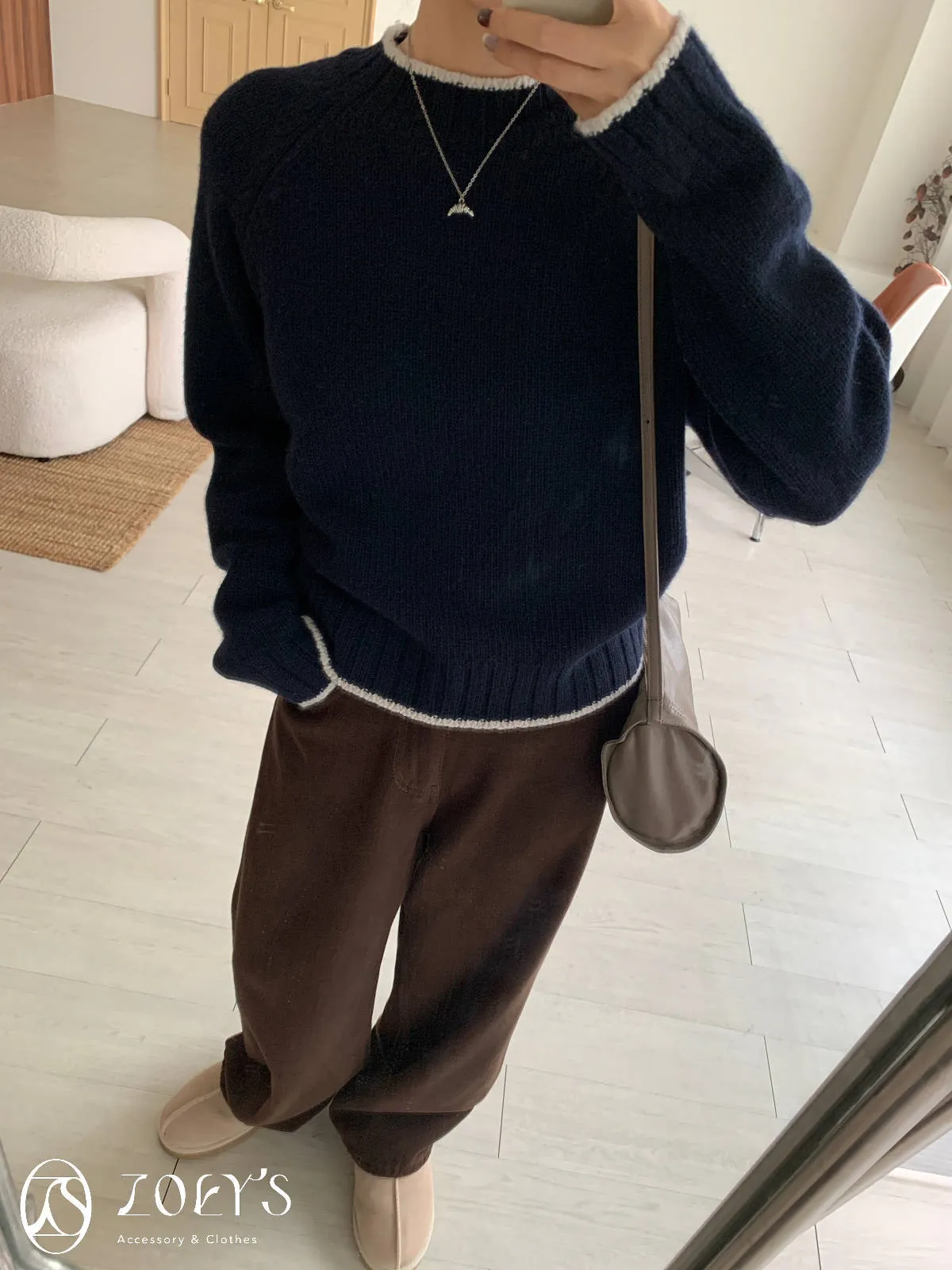 正韓 撞色滾邊小立領羊毛衫 深藍/米