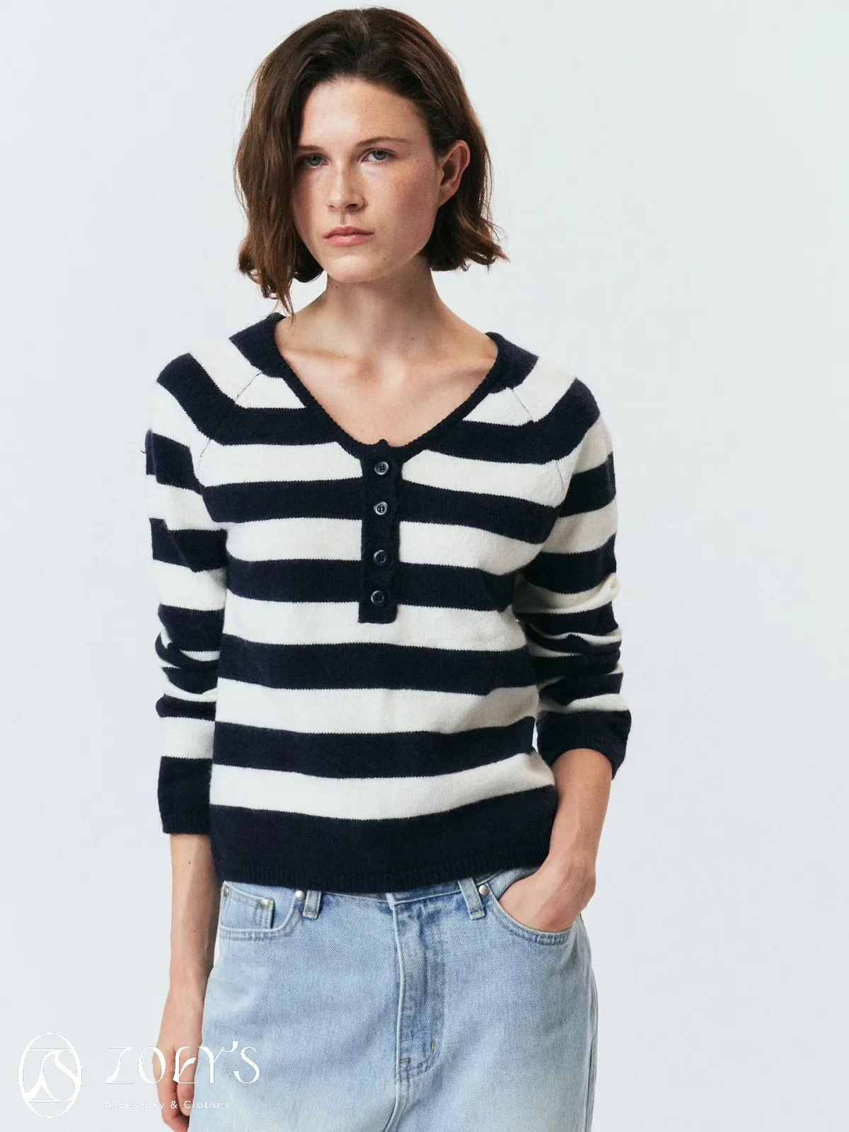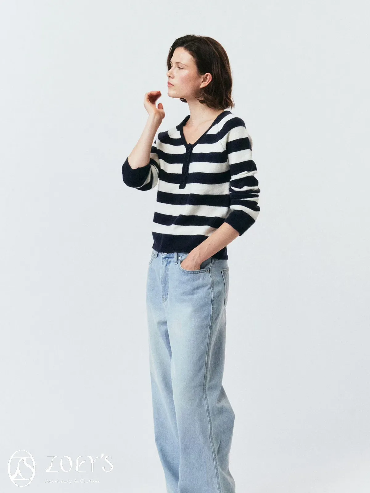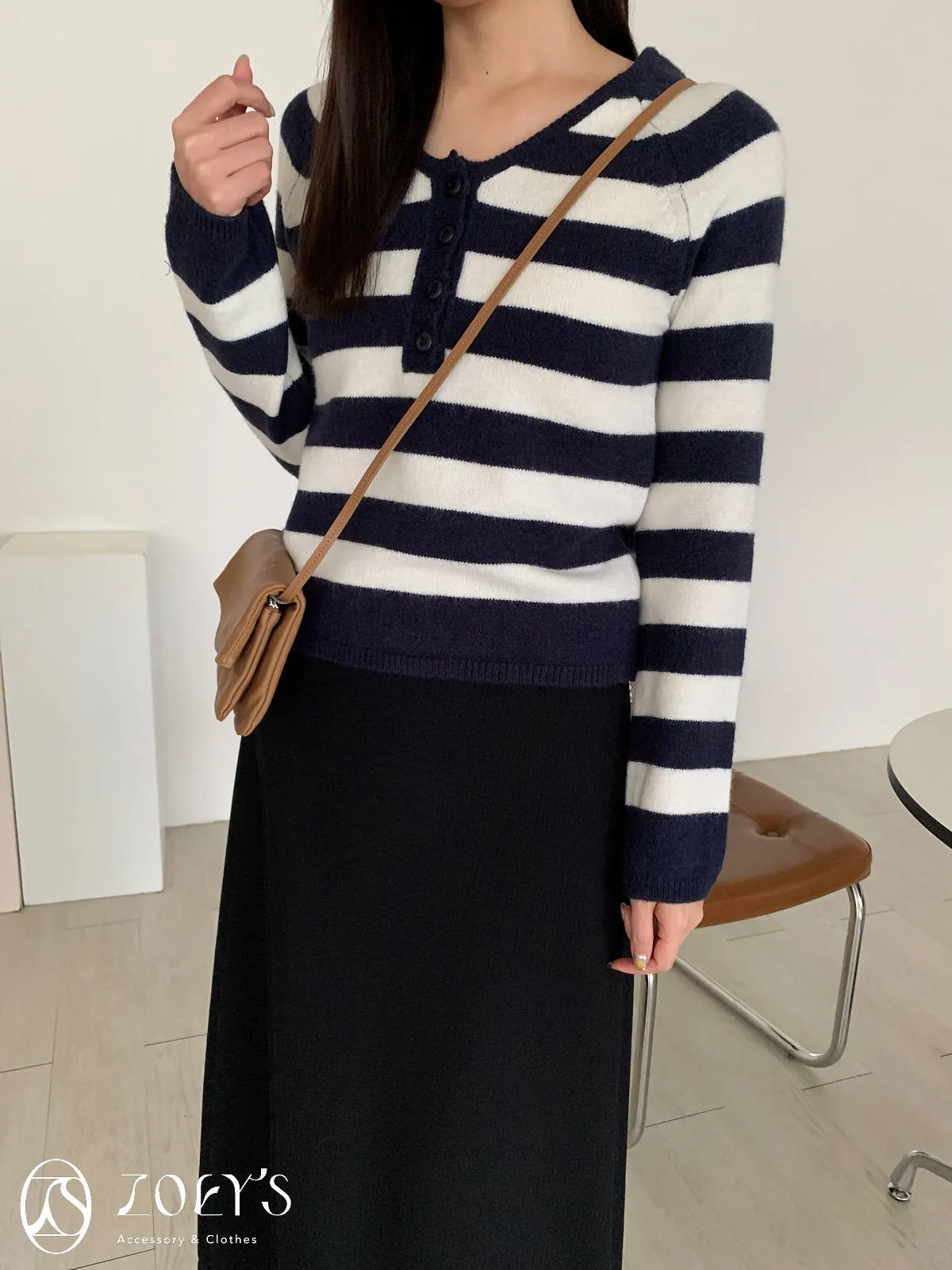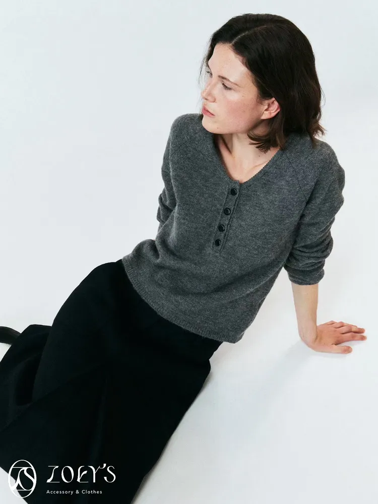 正韓 微V領排扣針織衫 橫紋/深灰
