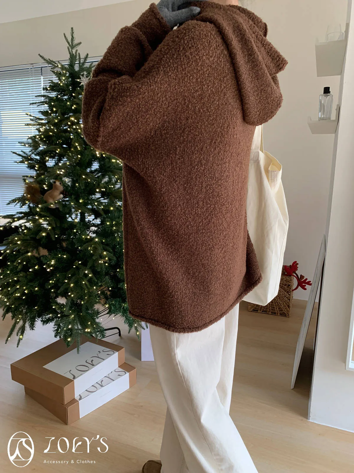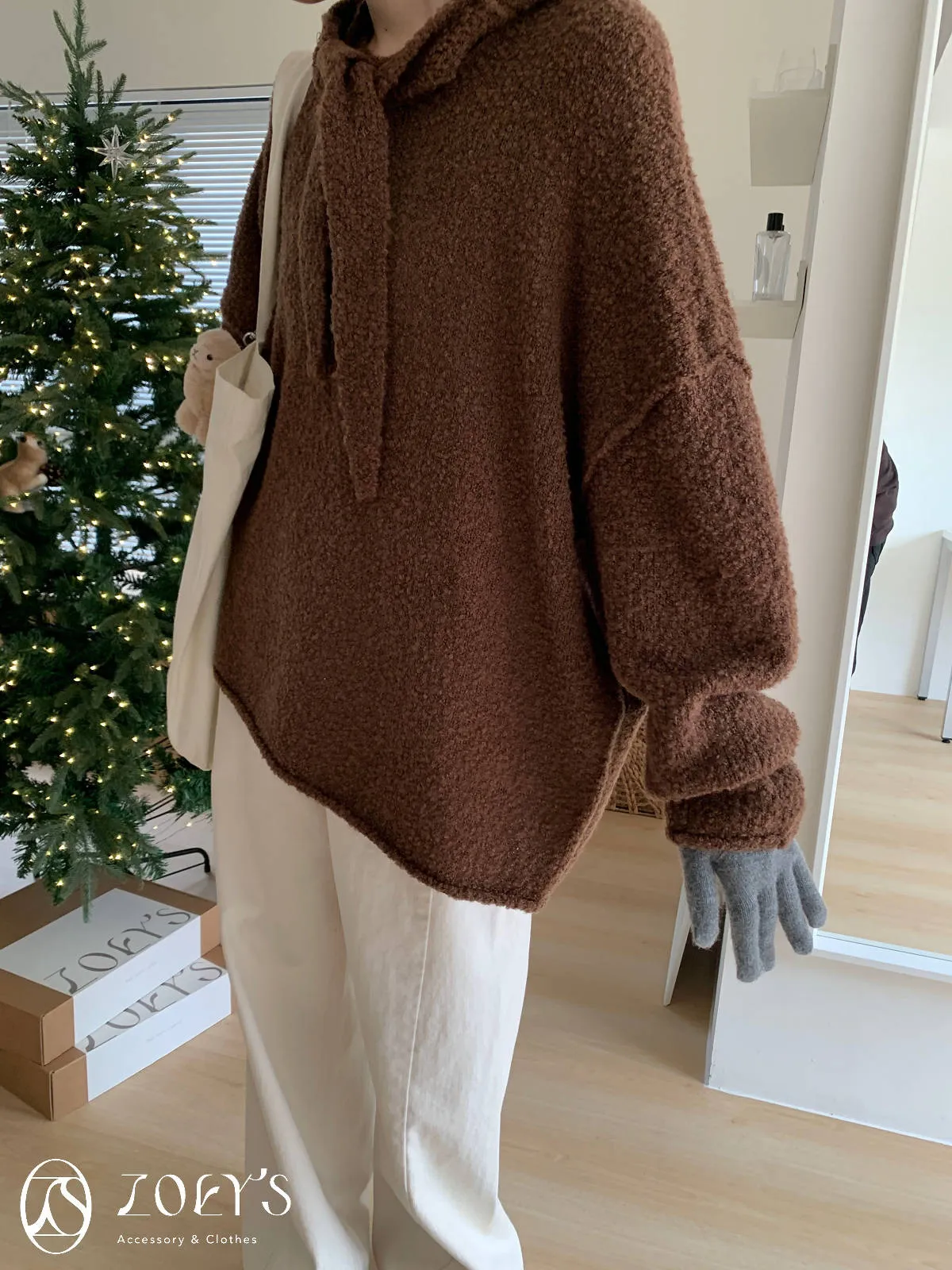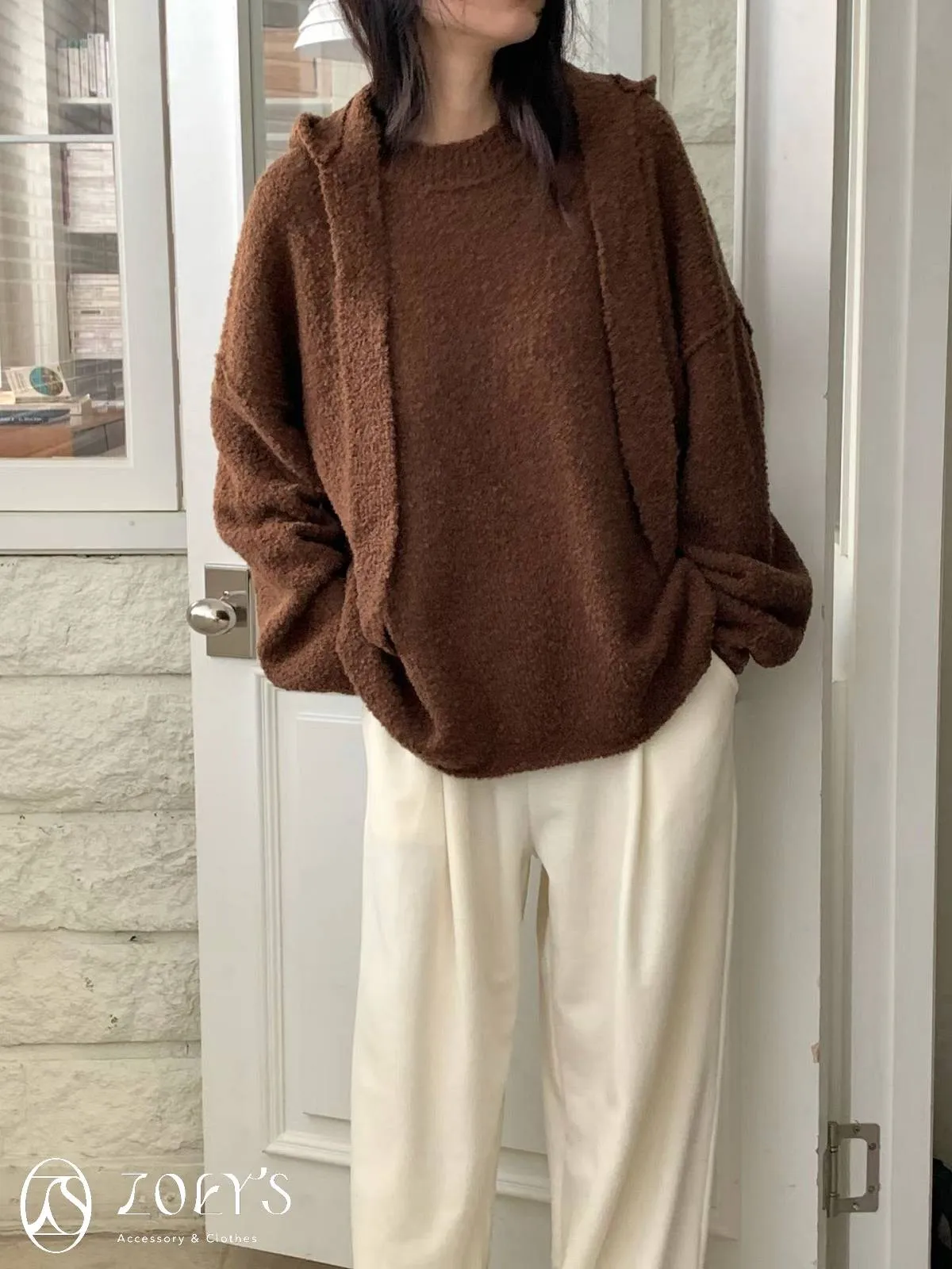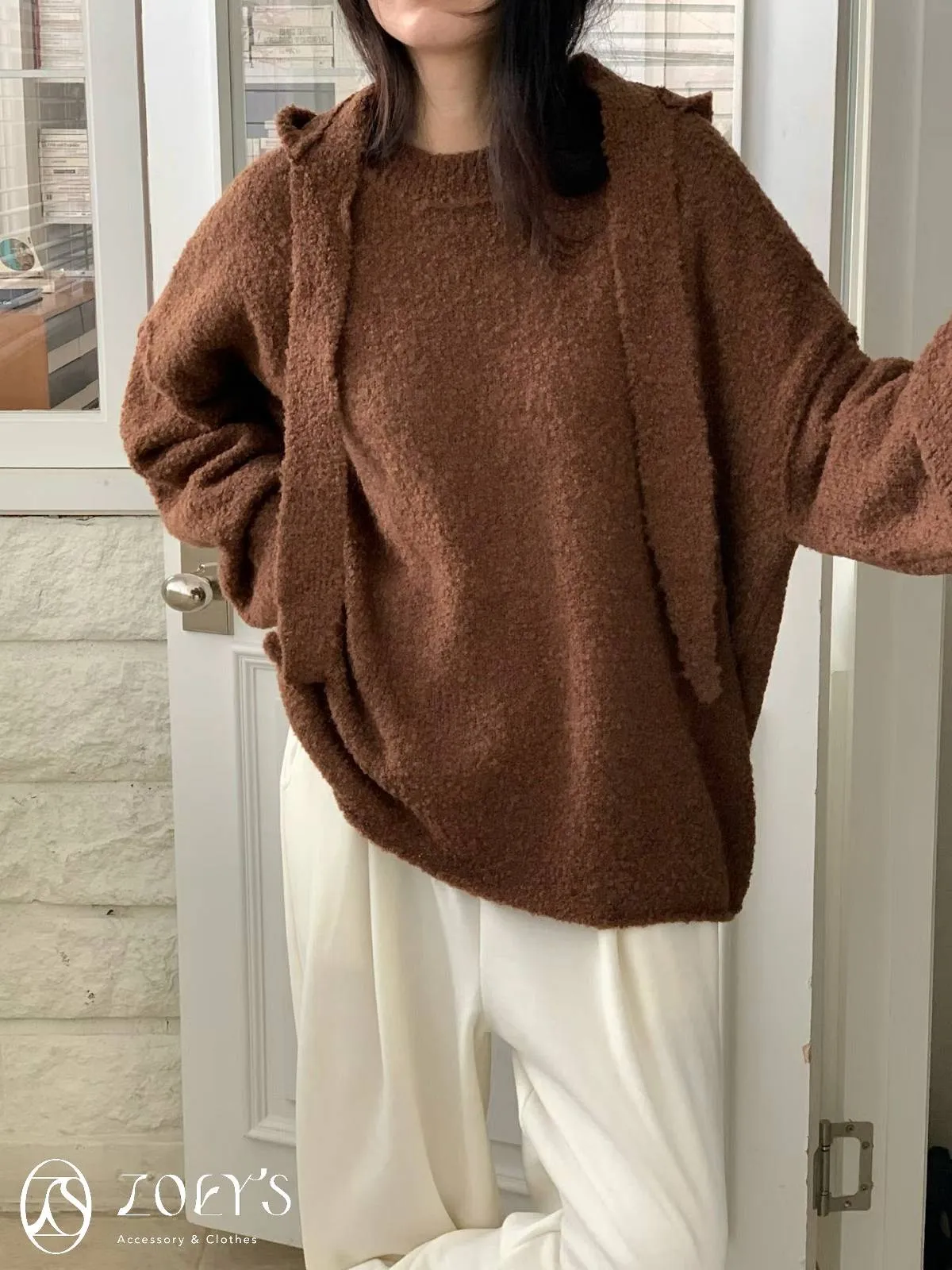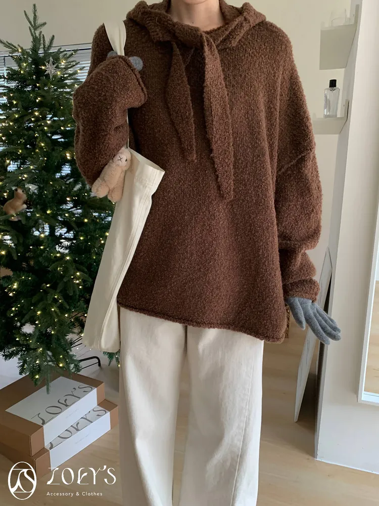 正韓 連帽圍巾長版泰迪羊毛衫 咖/米白