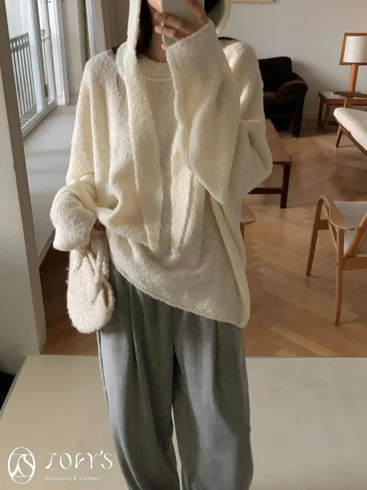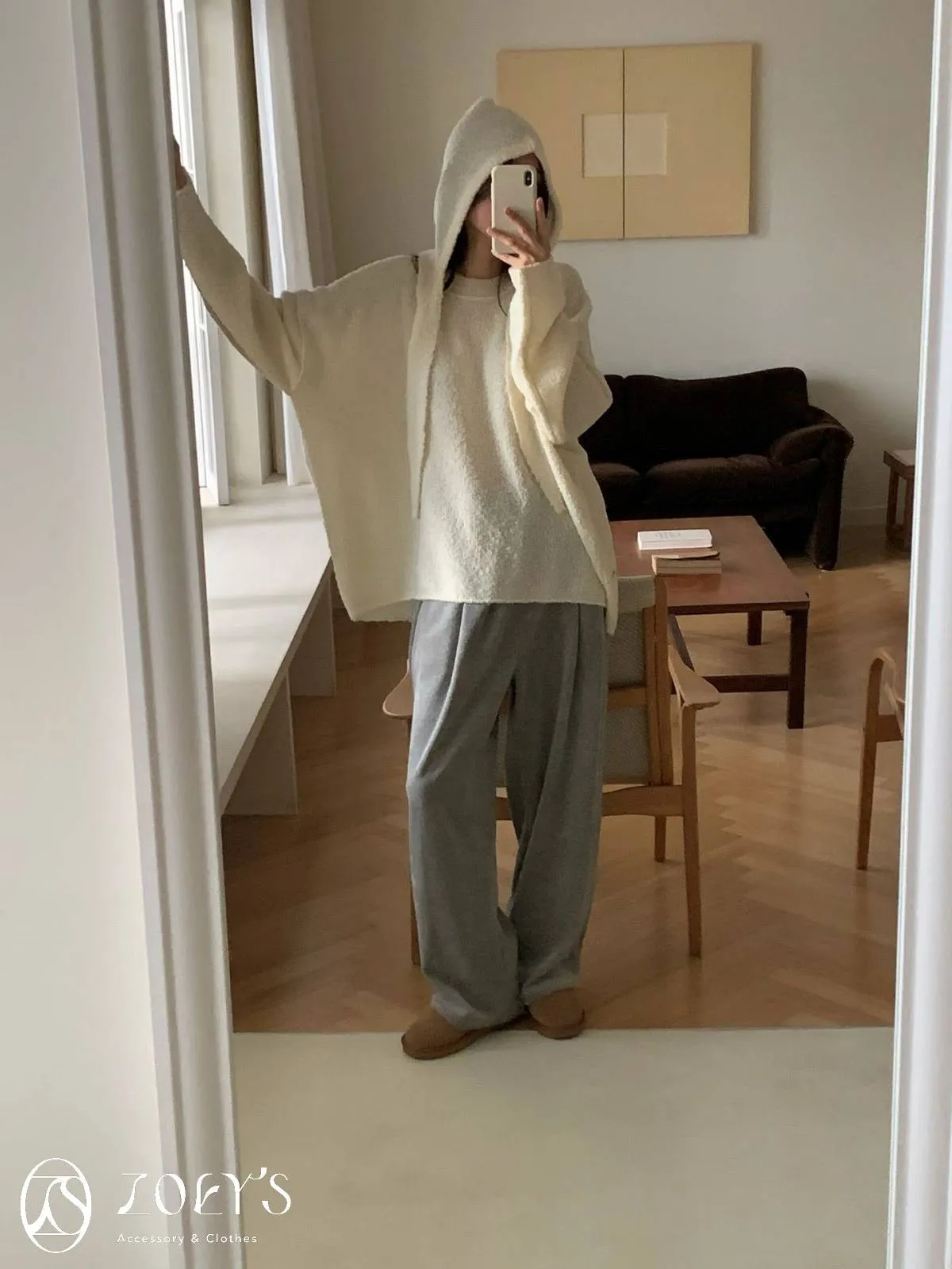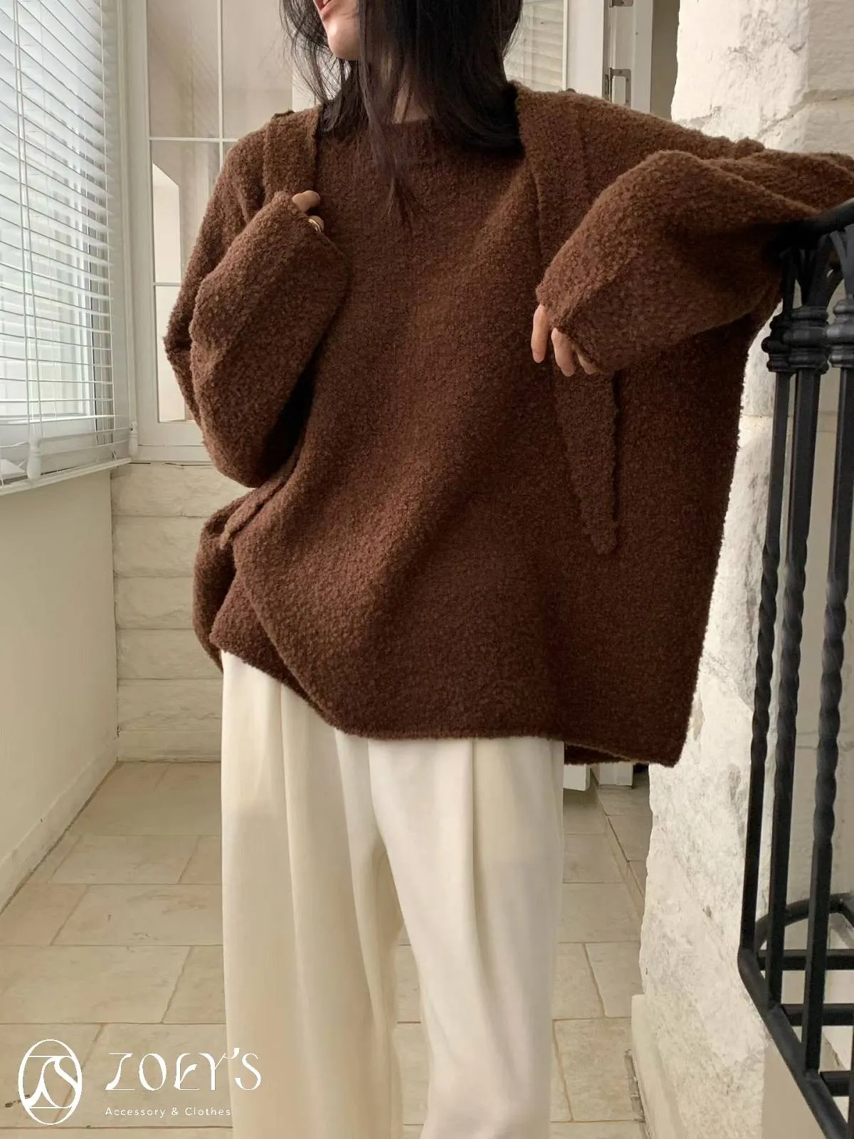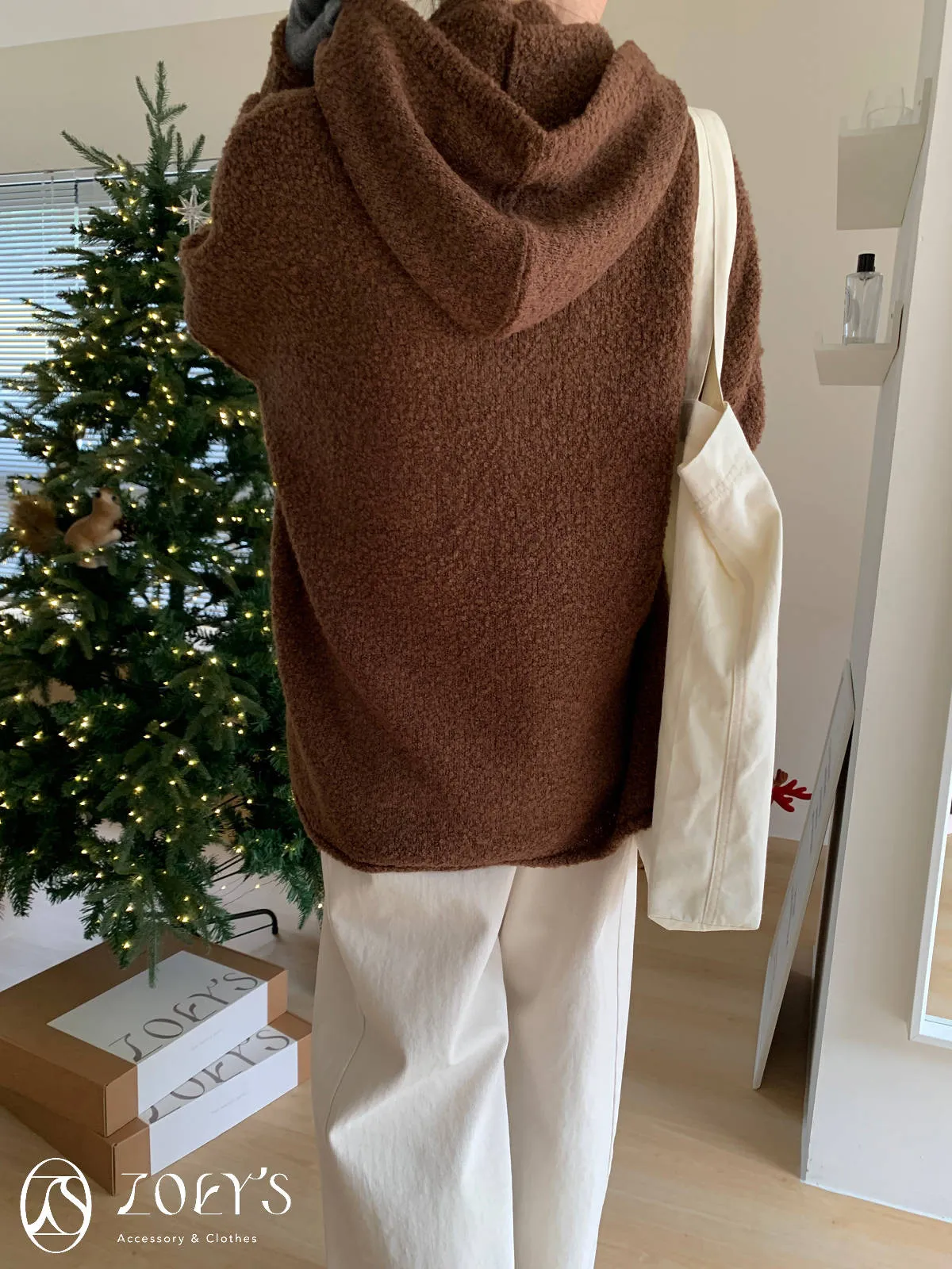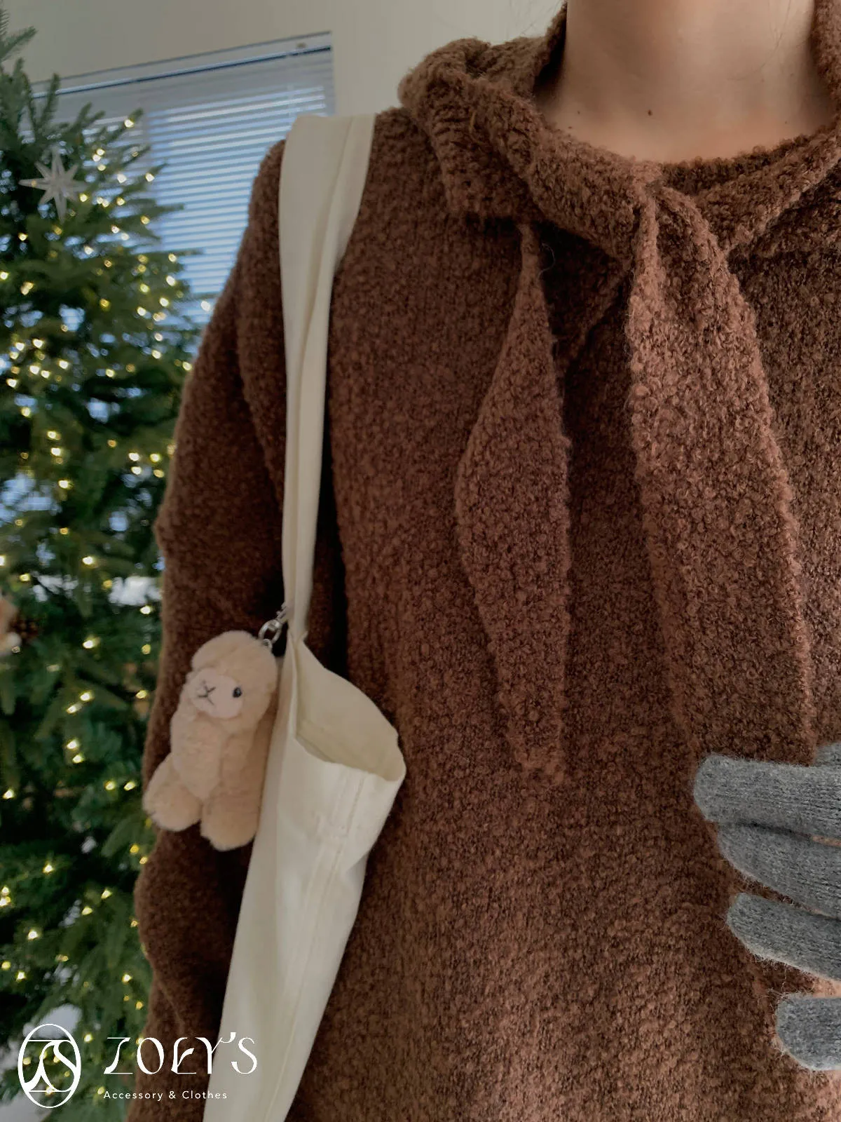 正韓 連帽圍巾長版泰迪羊毛衫 咖/米白