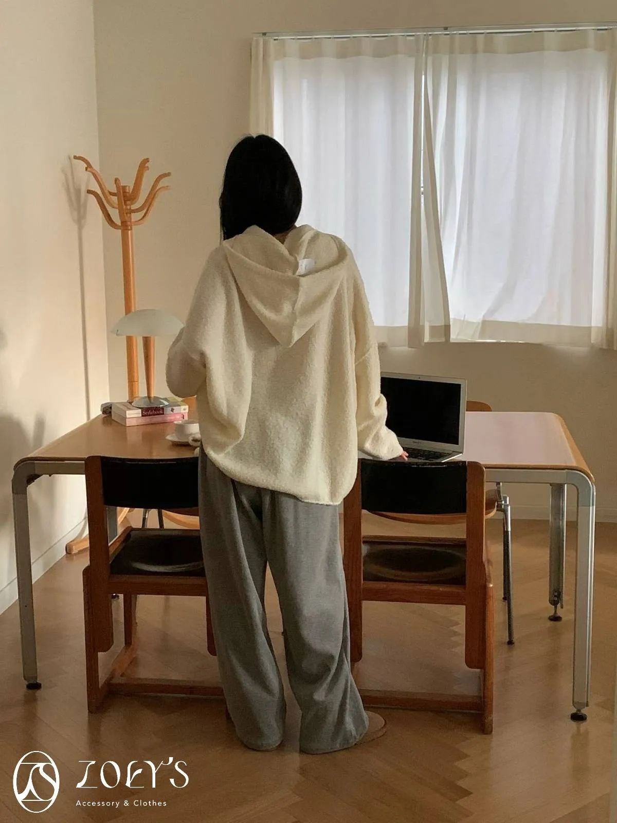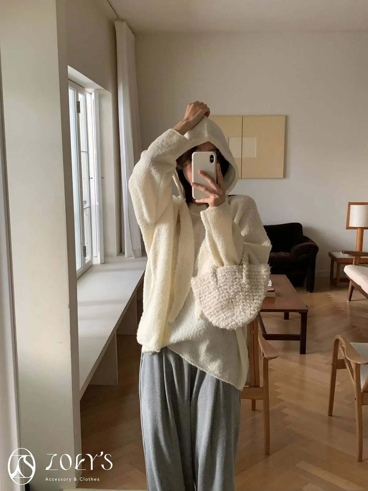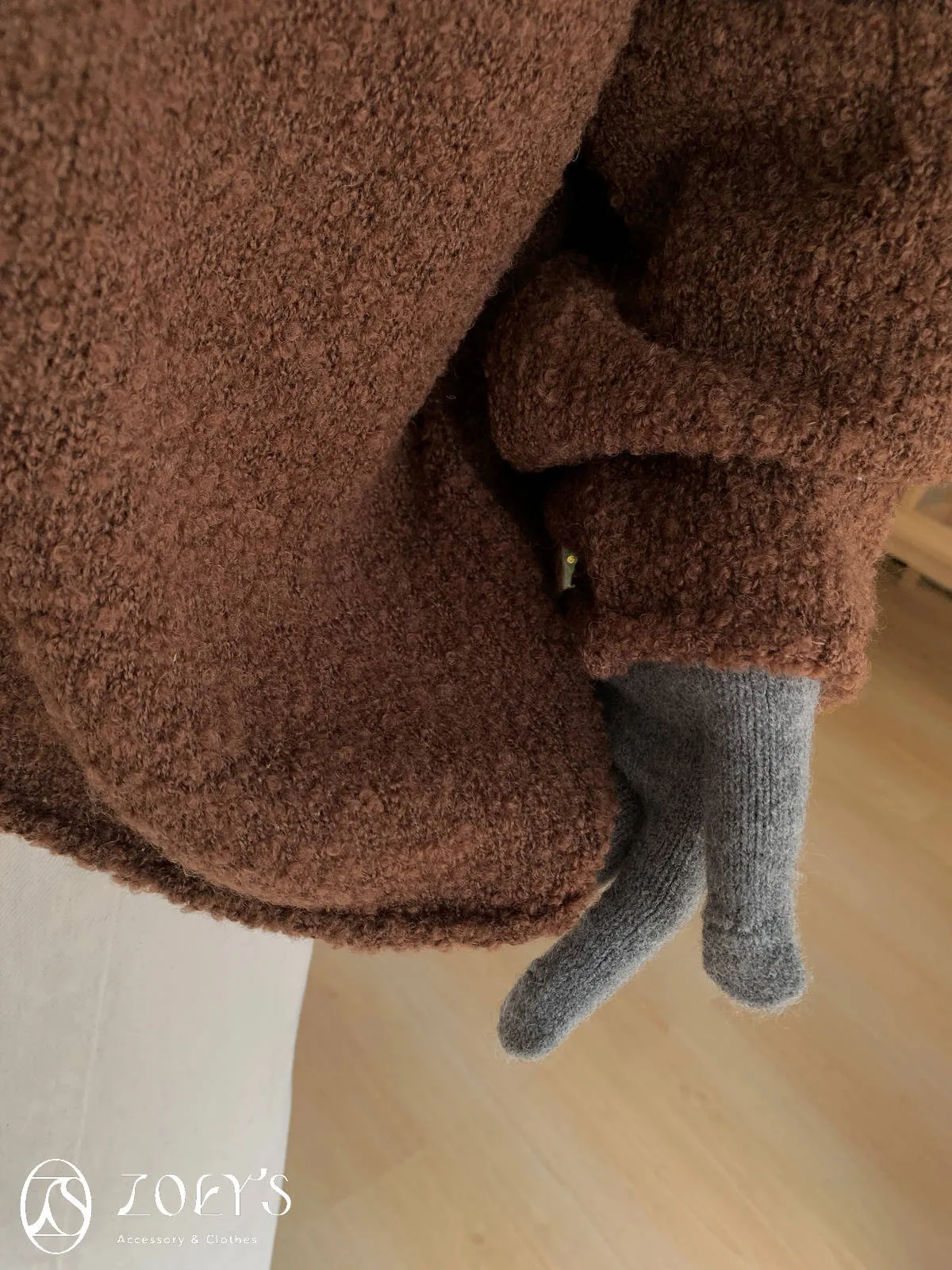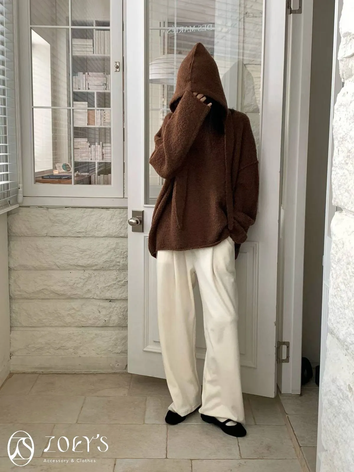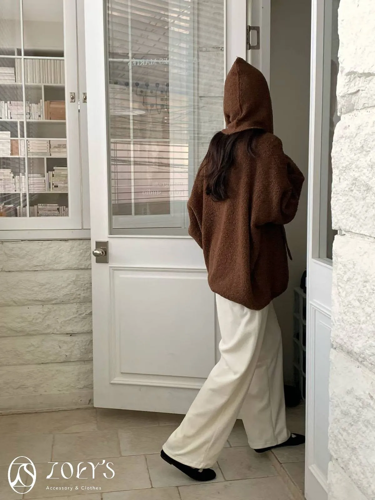 正韓 連帽圍巾長版泰迪羊毛衫 咖/米白