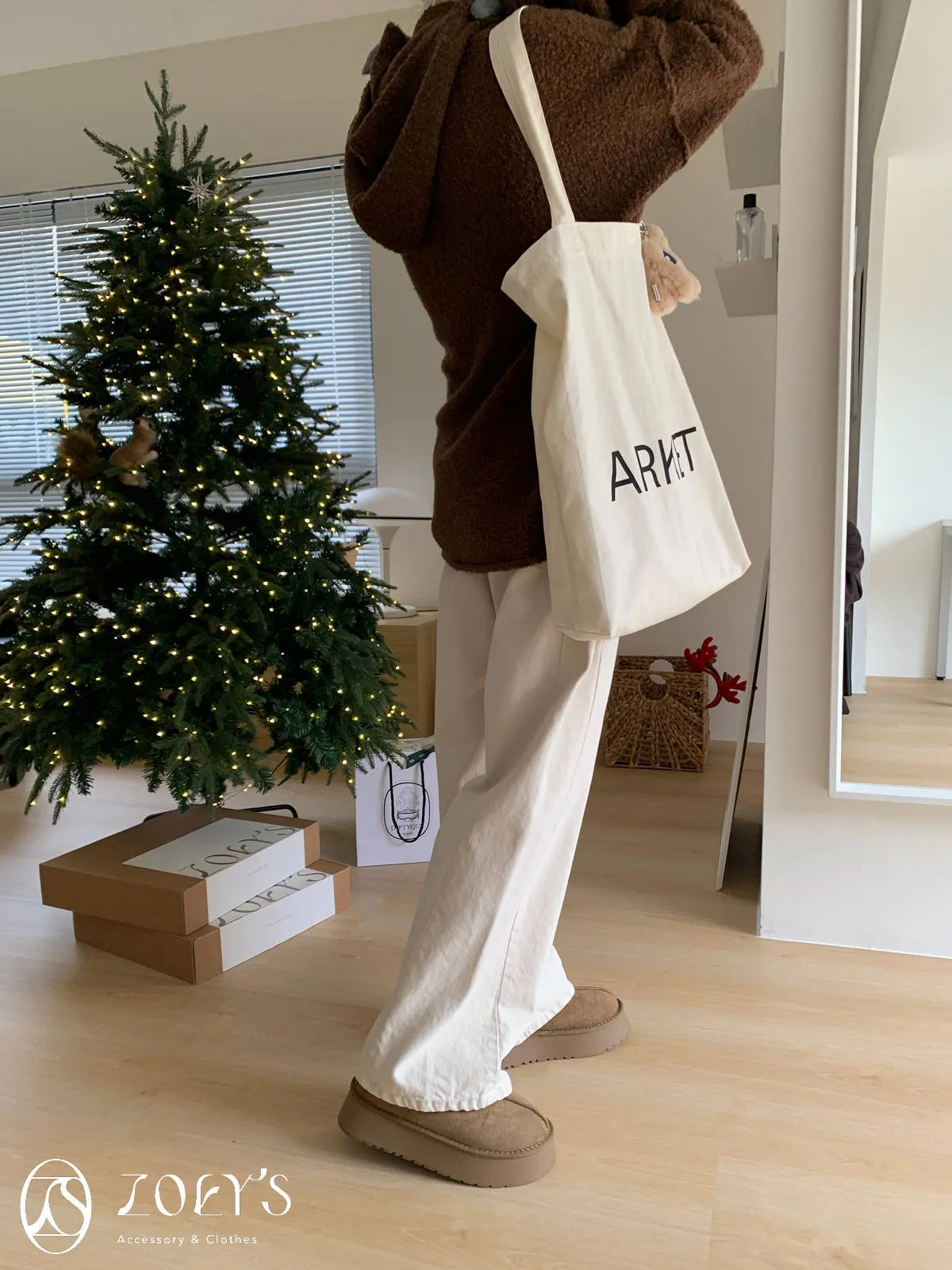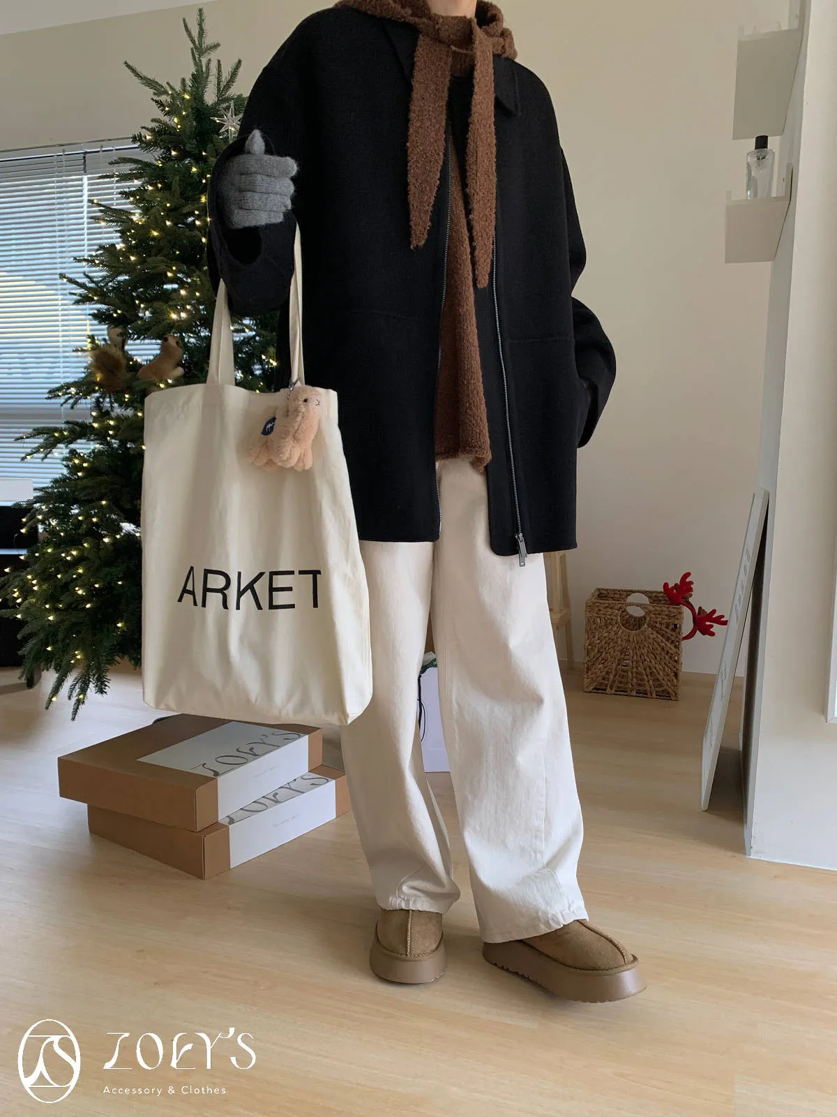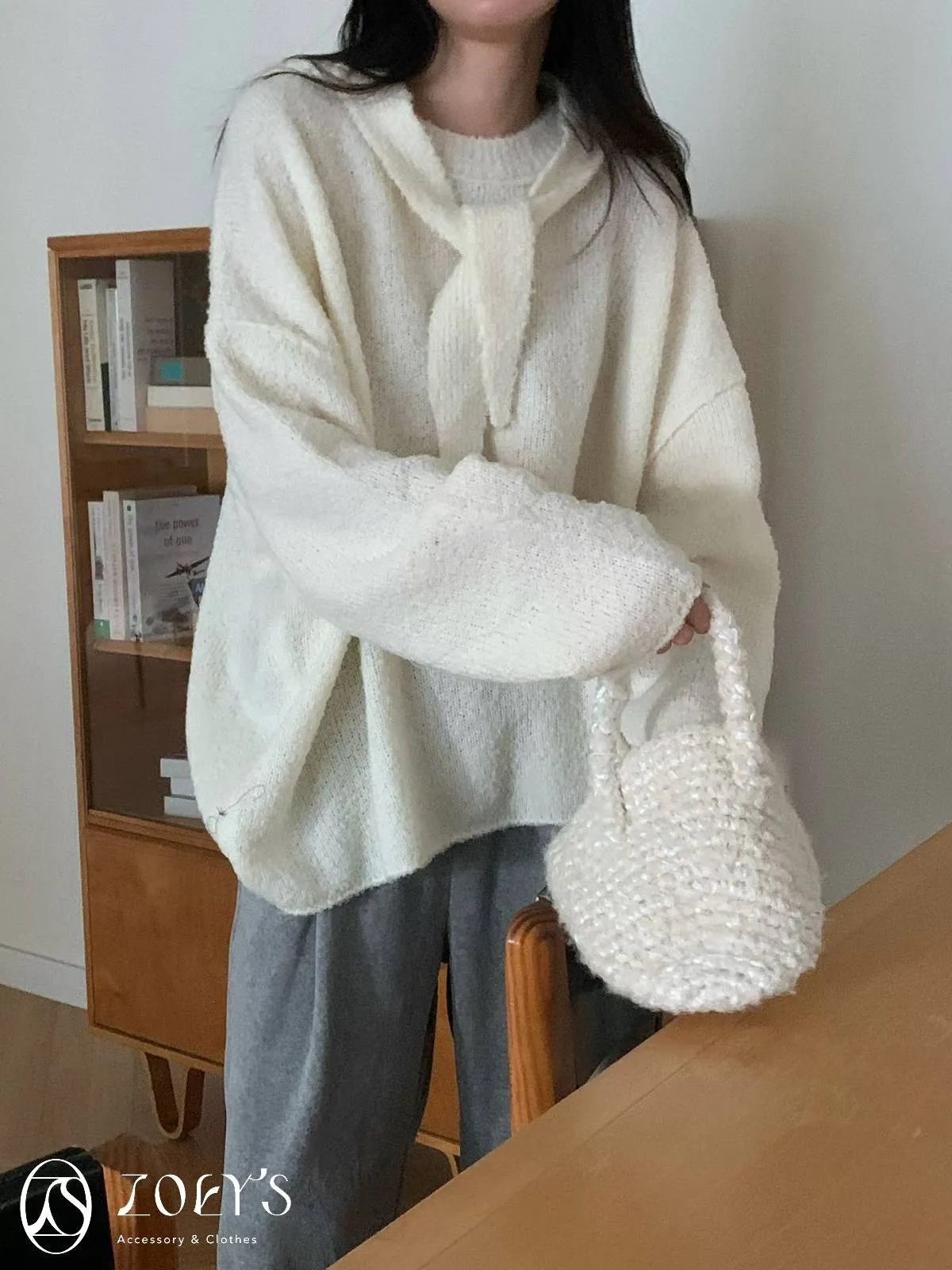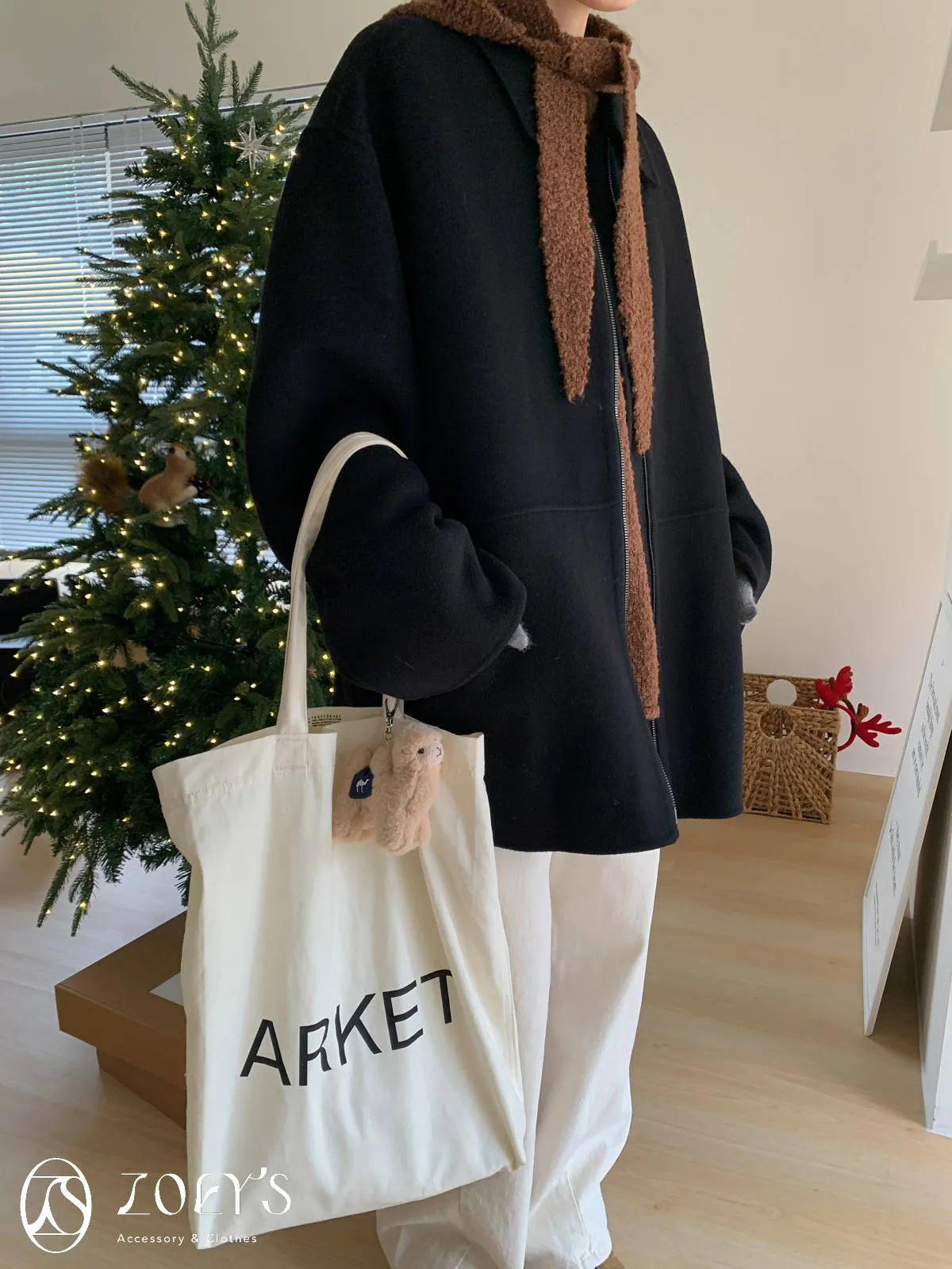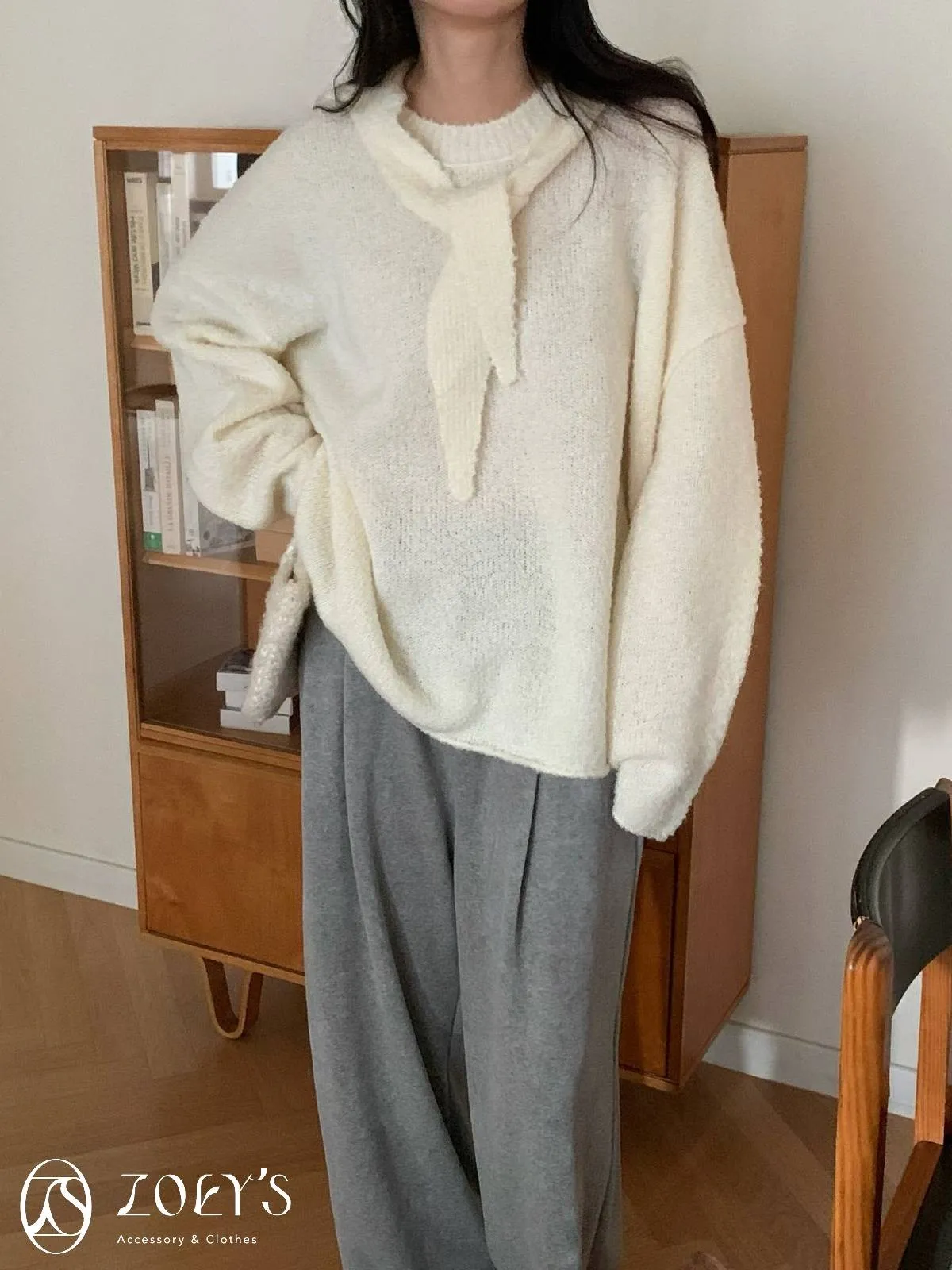 正韓 連帽圍巾長版泰迪羊毛衫 咖/米白