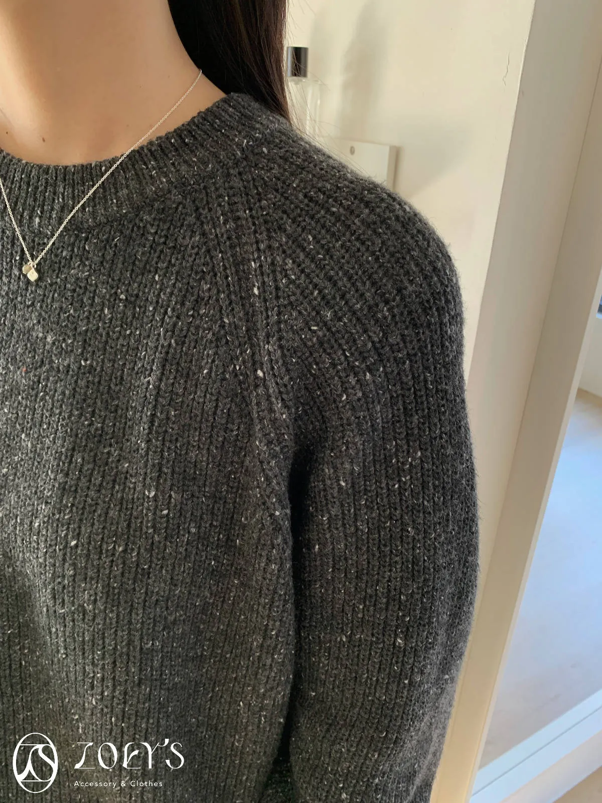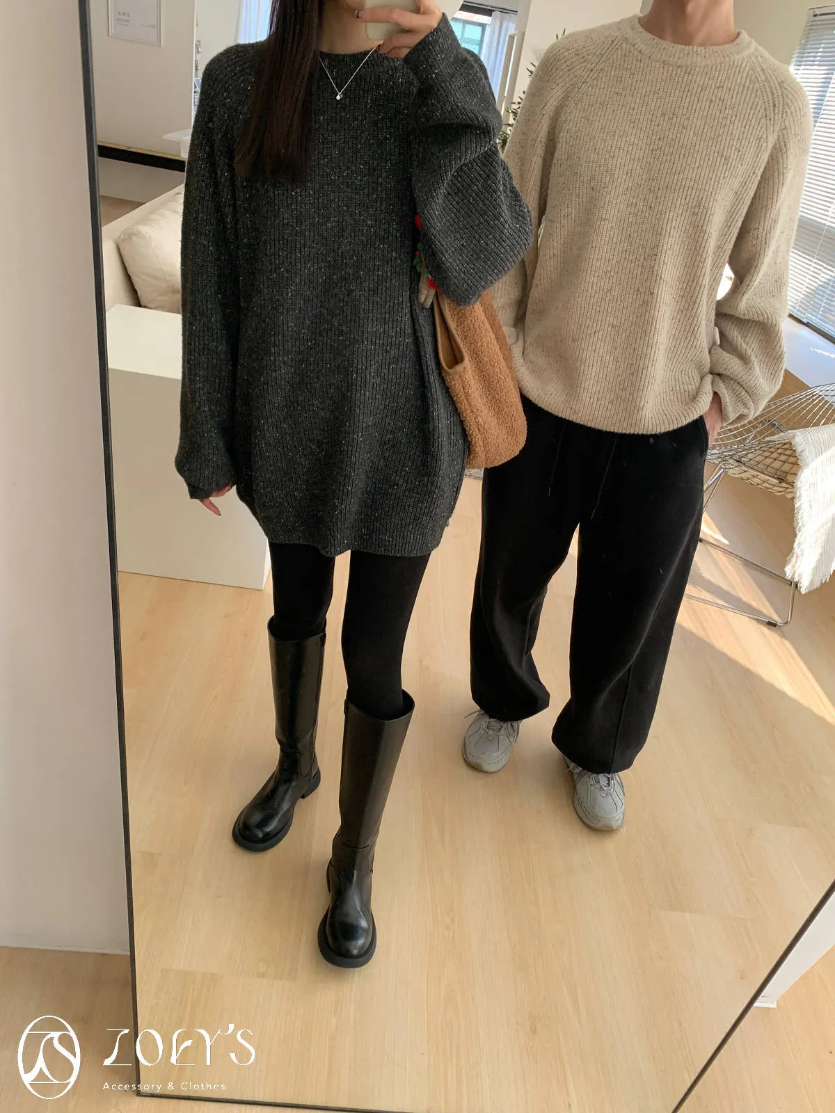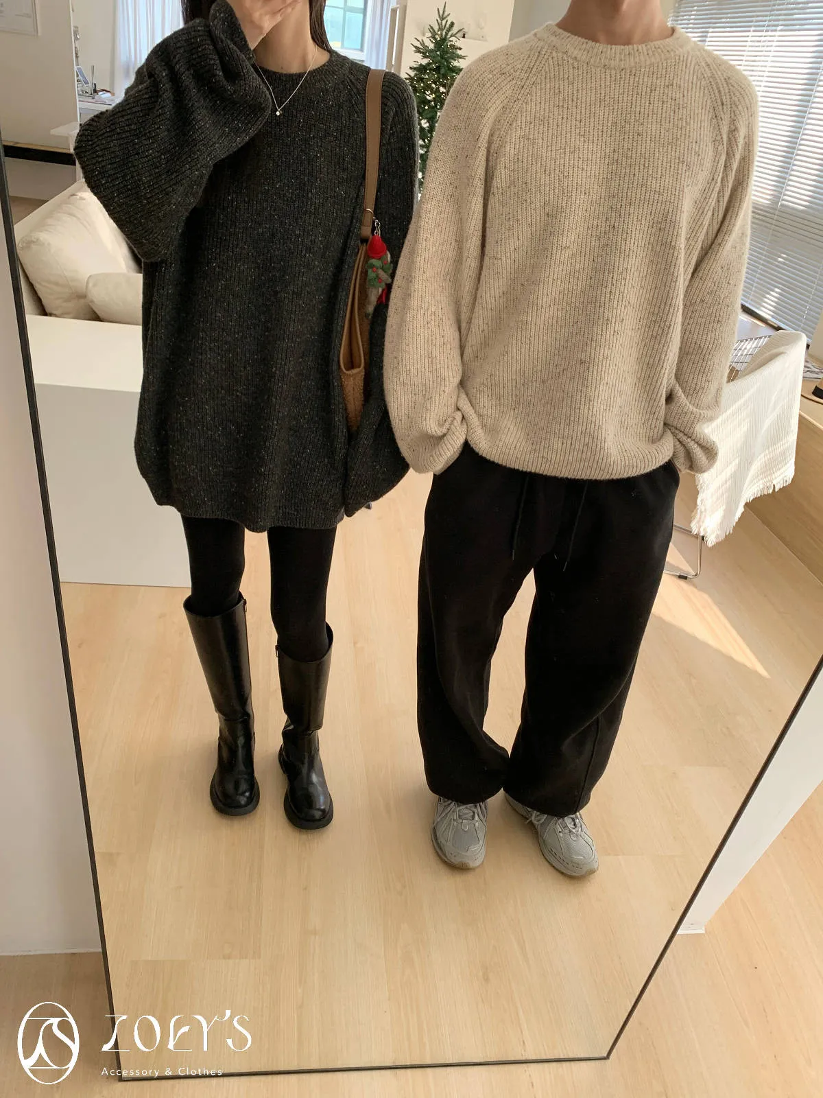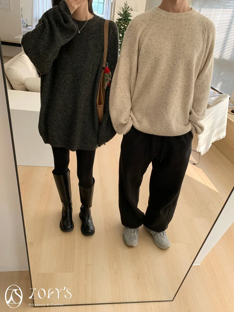 正韓 斜肩袖小雜點情侶毛衣 墨黑/燕麥