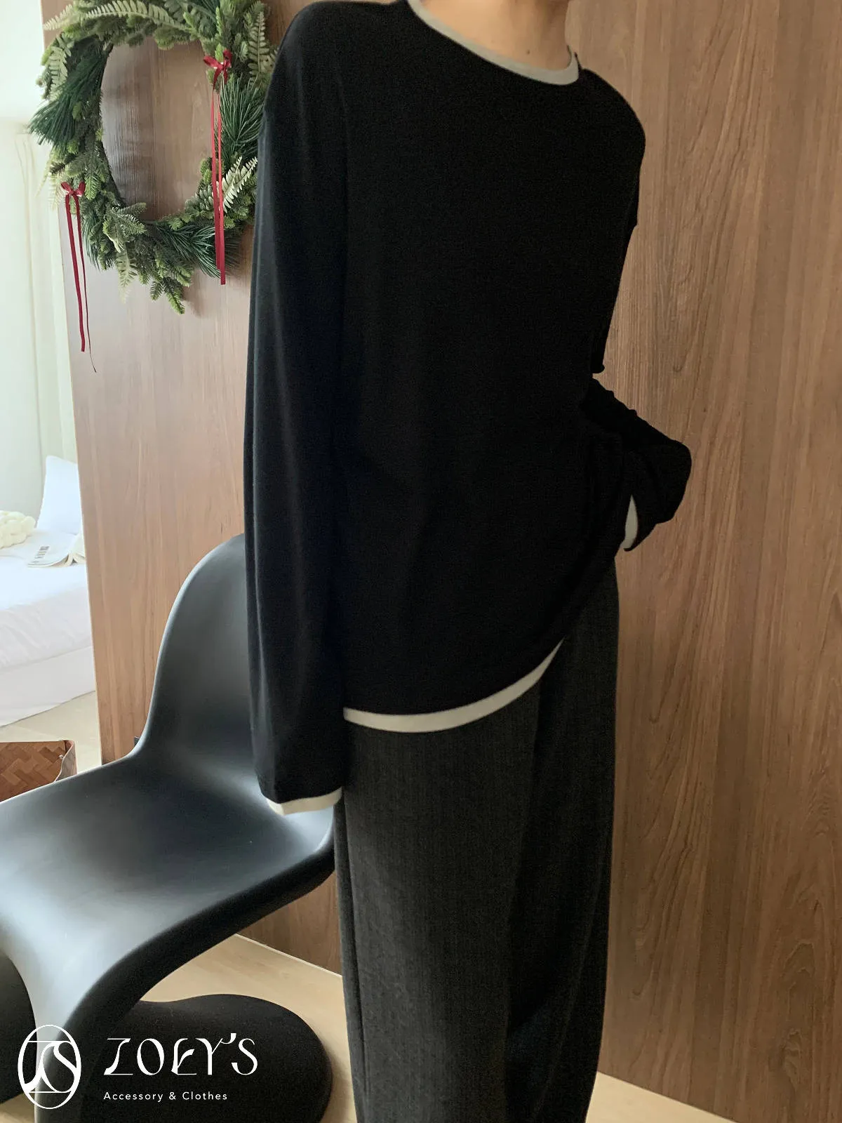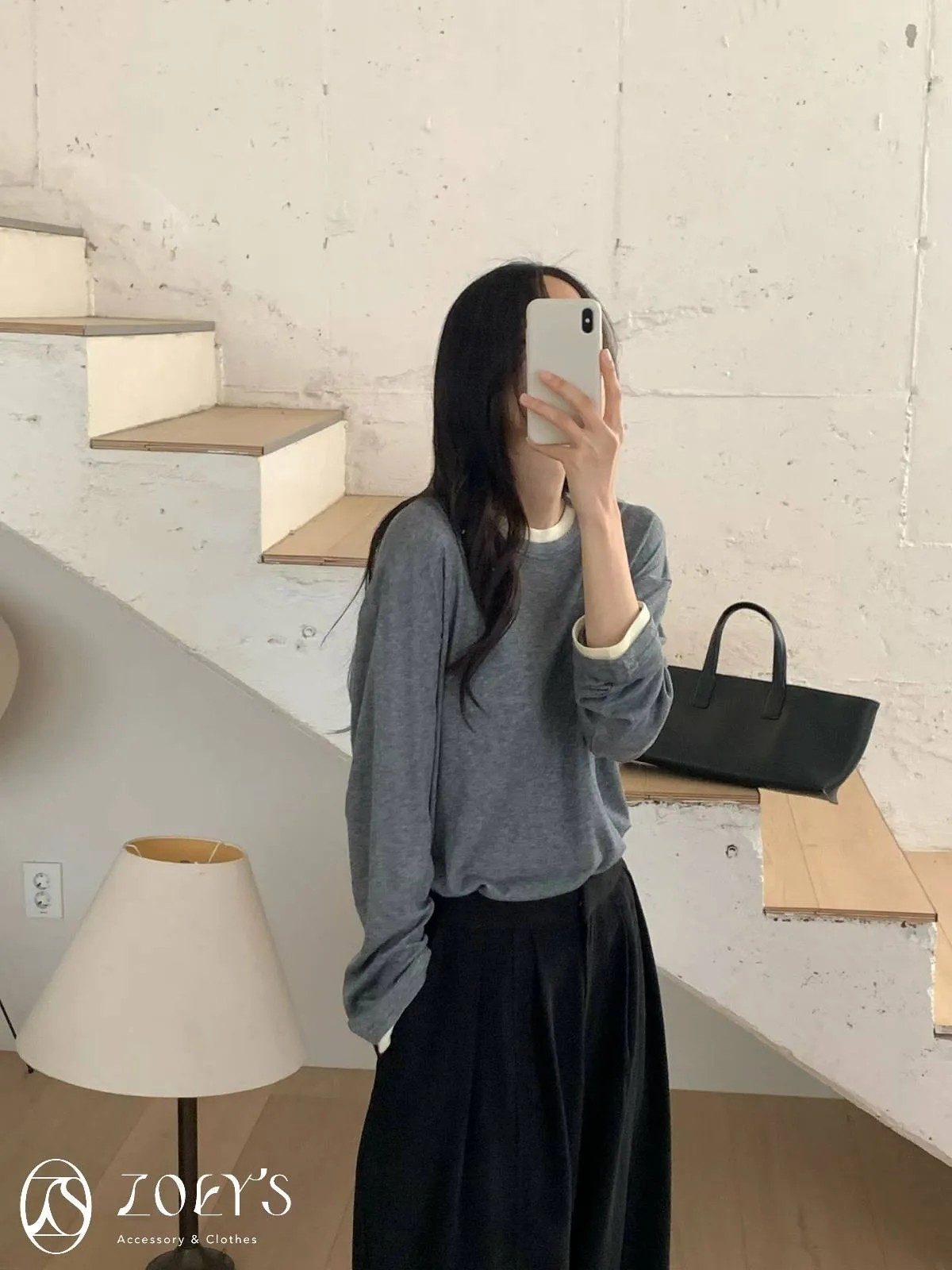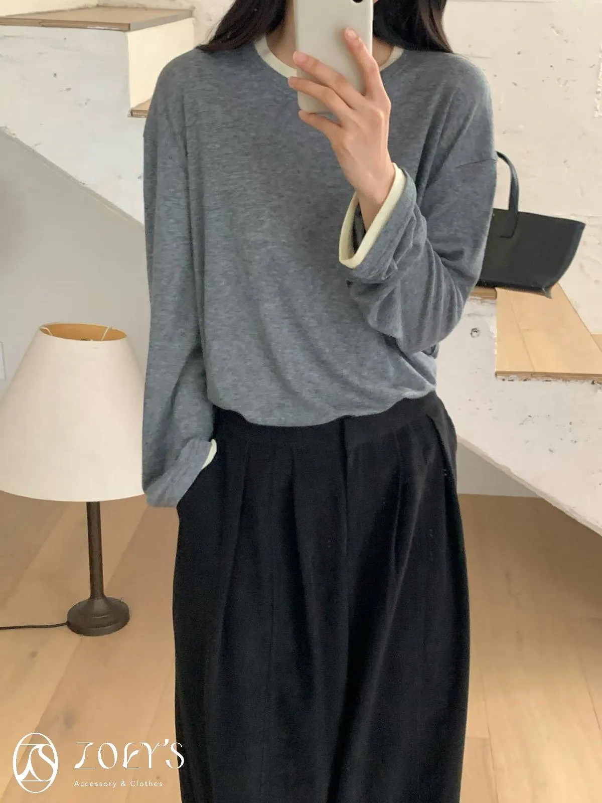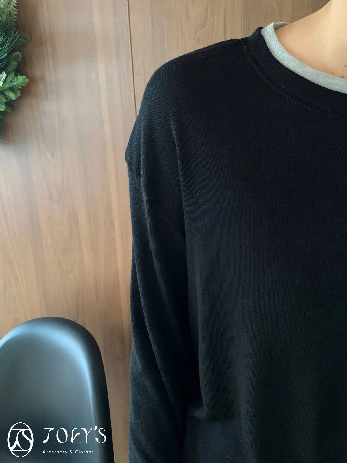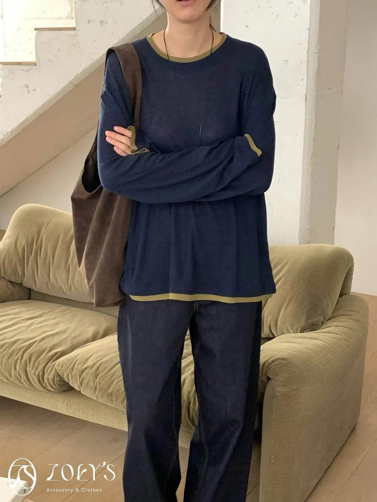 正韓 配色假兩件天絲羊毛薄上衣 深藍/灰/黑
