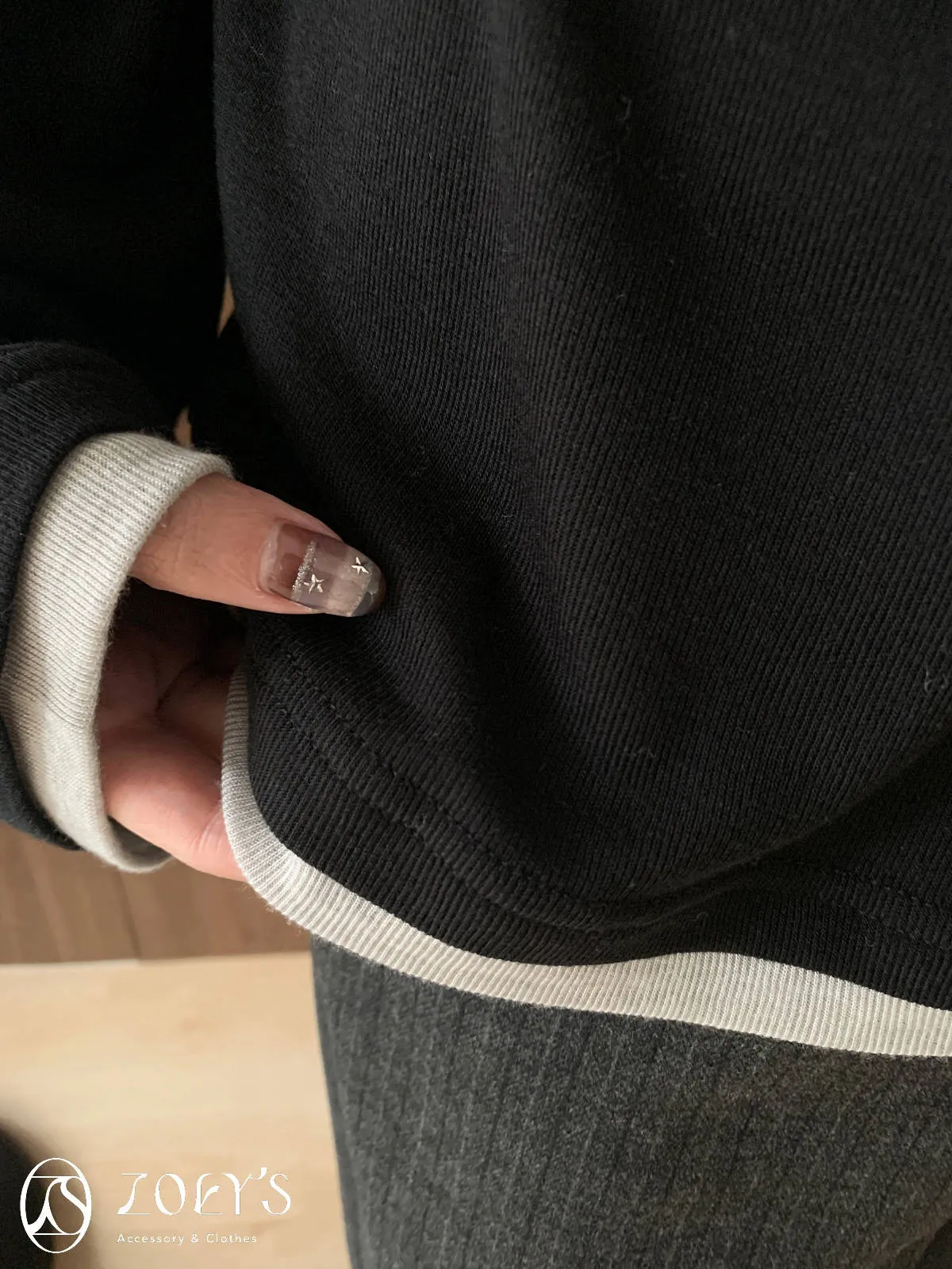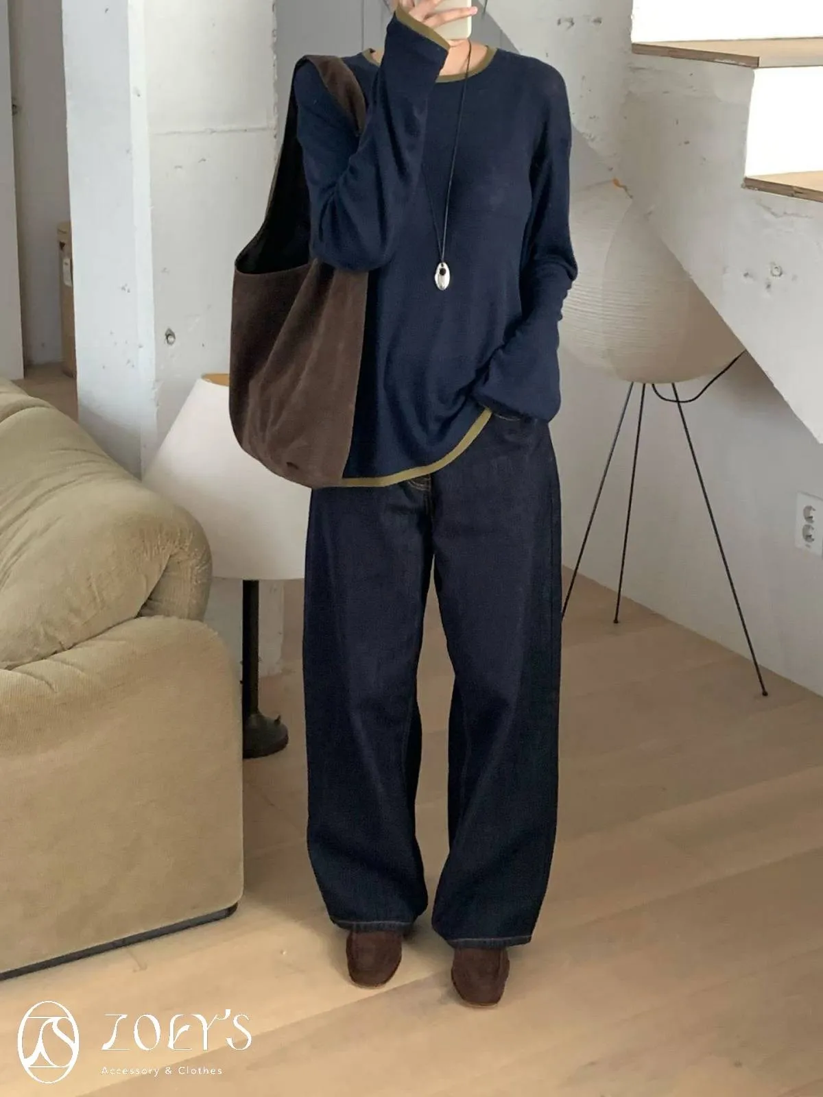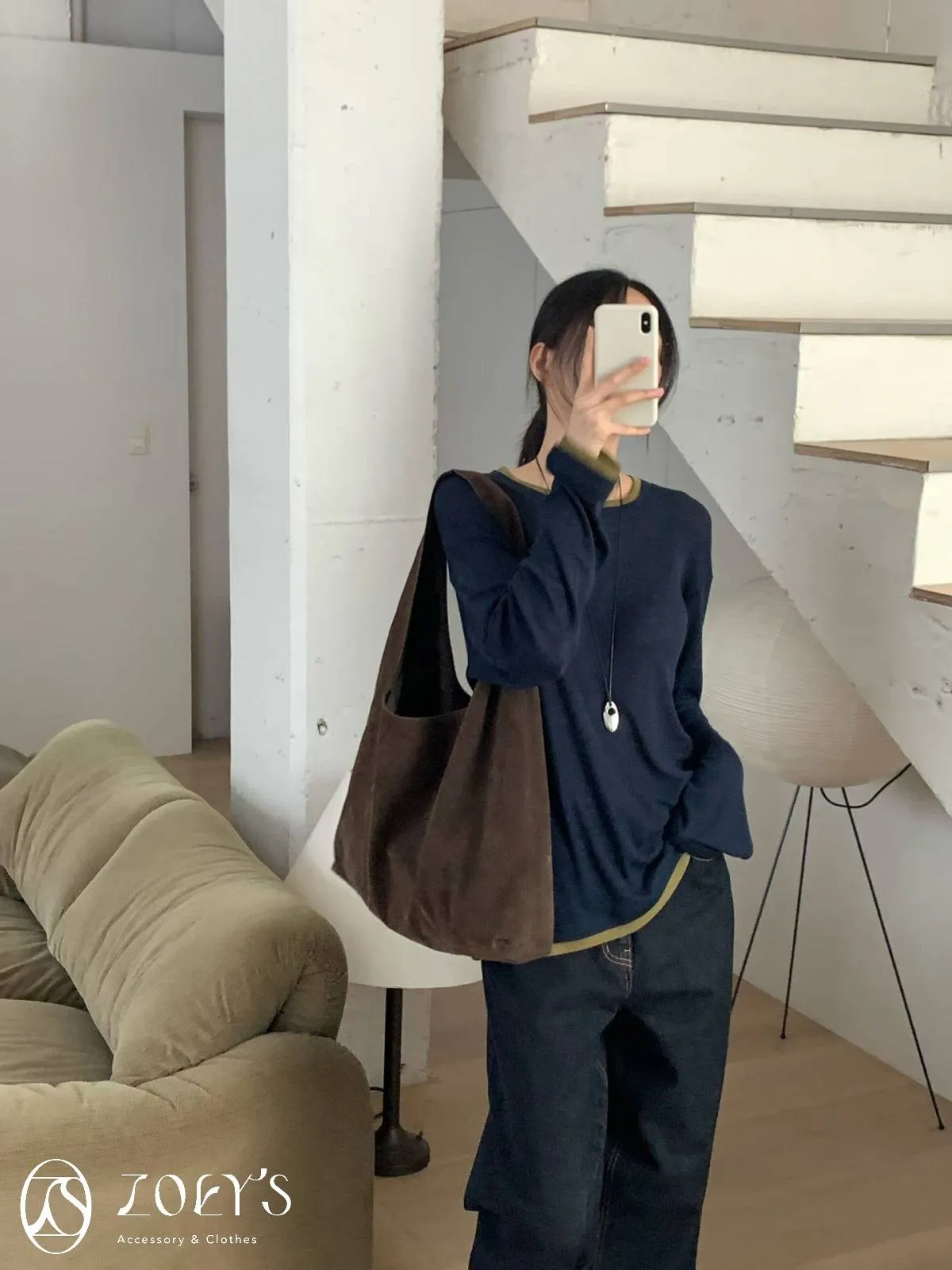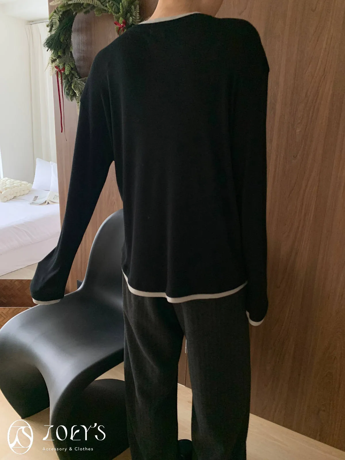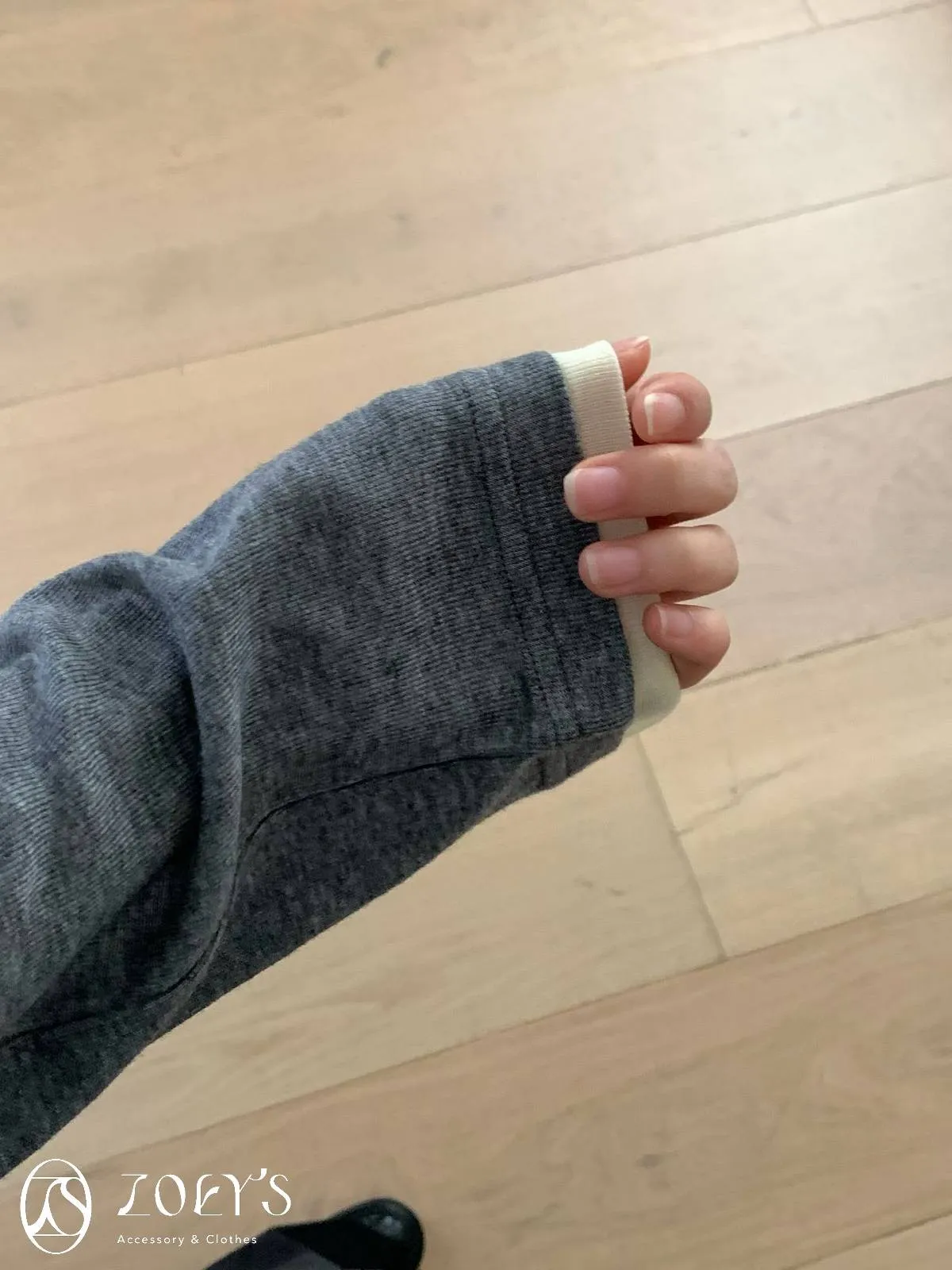 正韓 配色假兩件天絲羊毛薄上衣 深藍/灰/黑