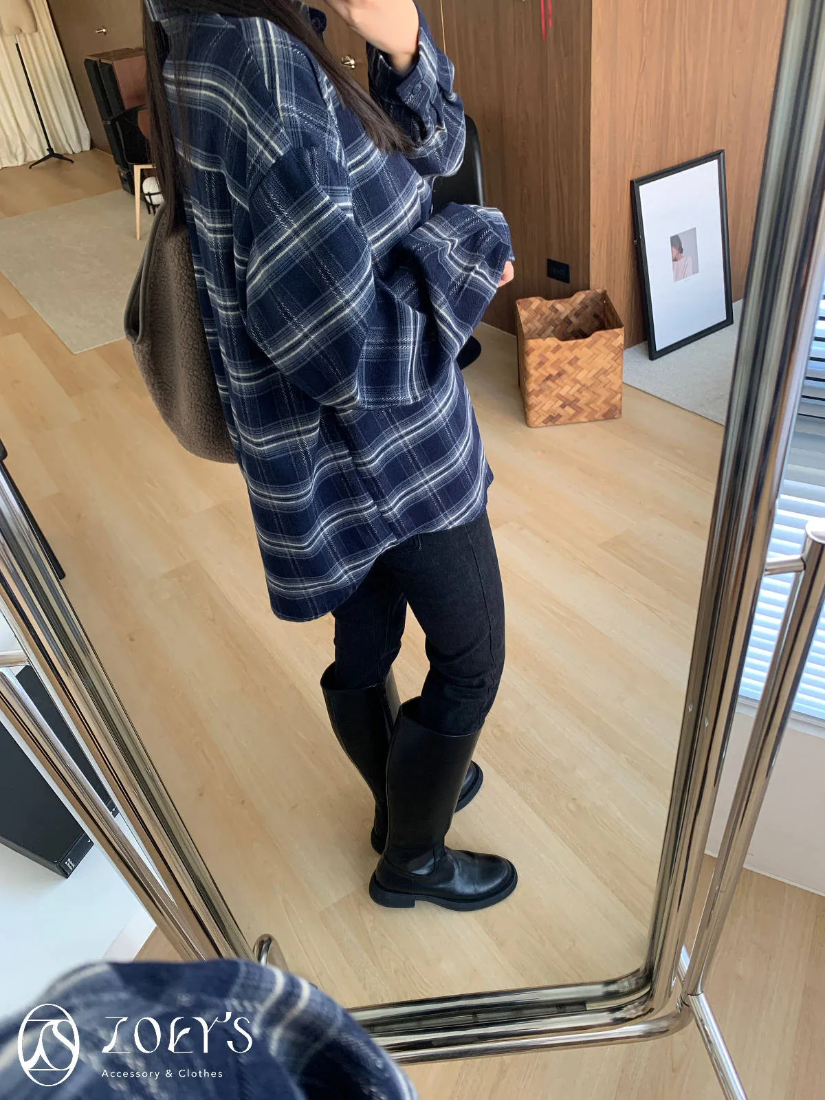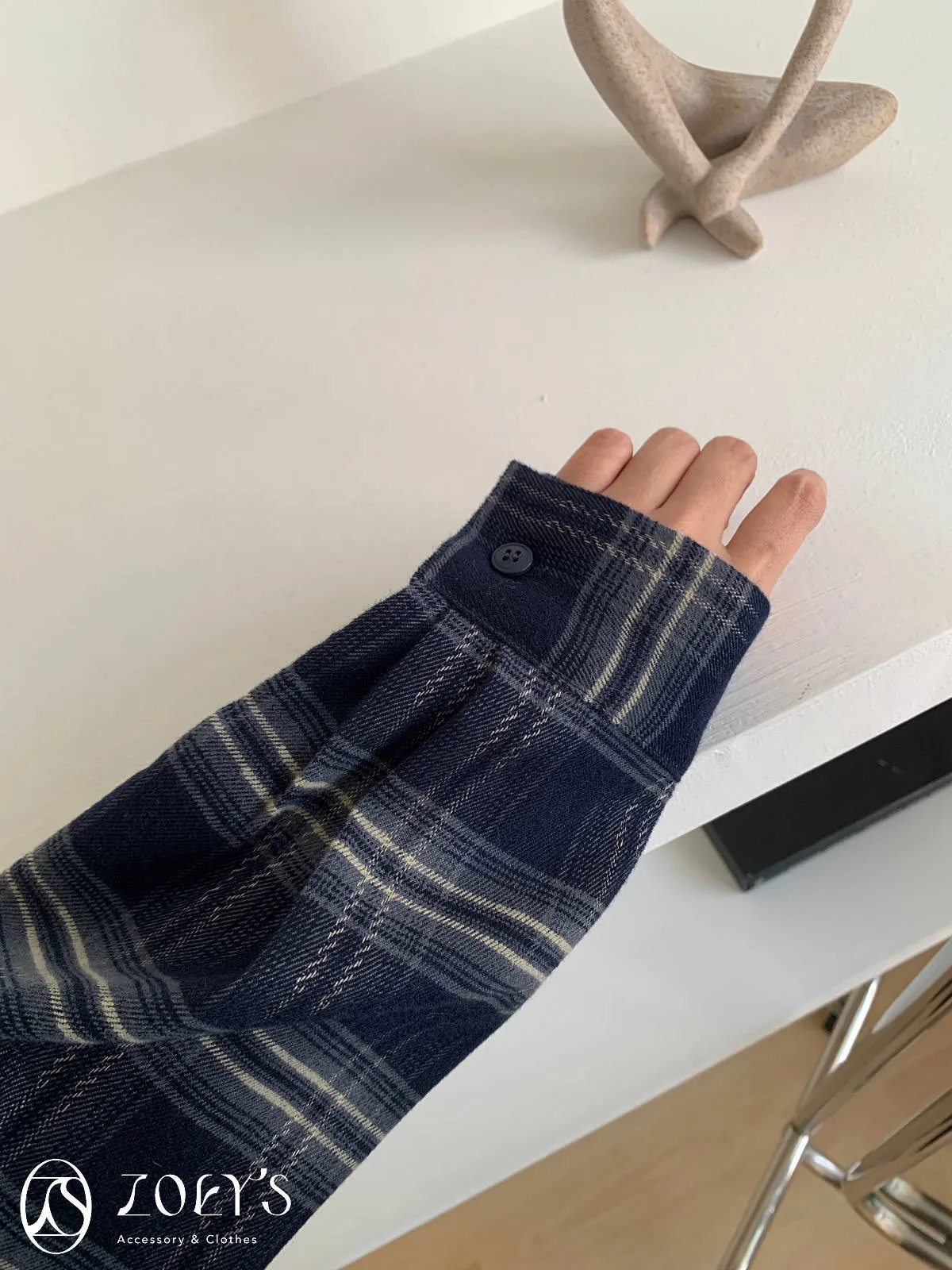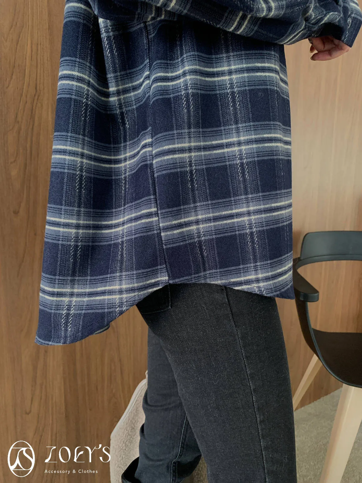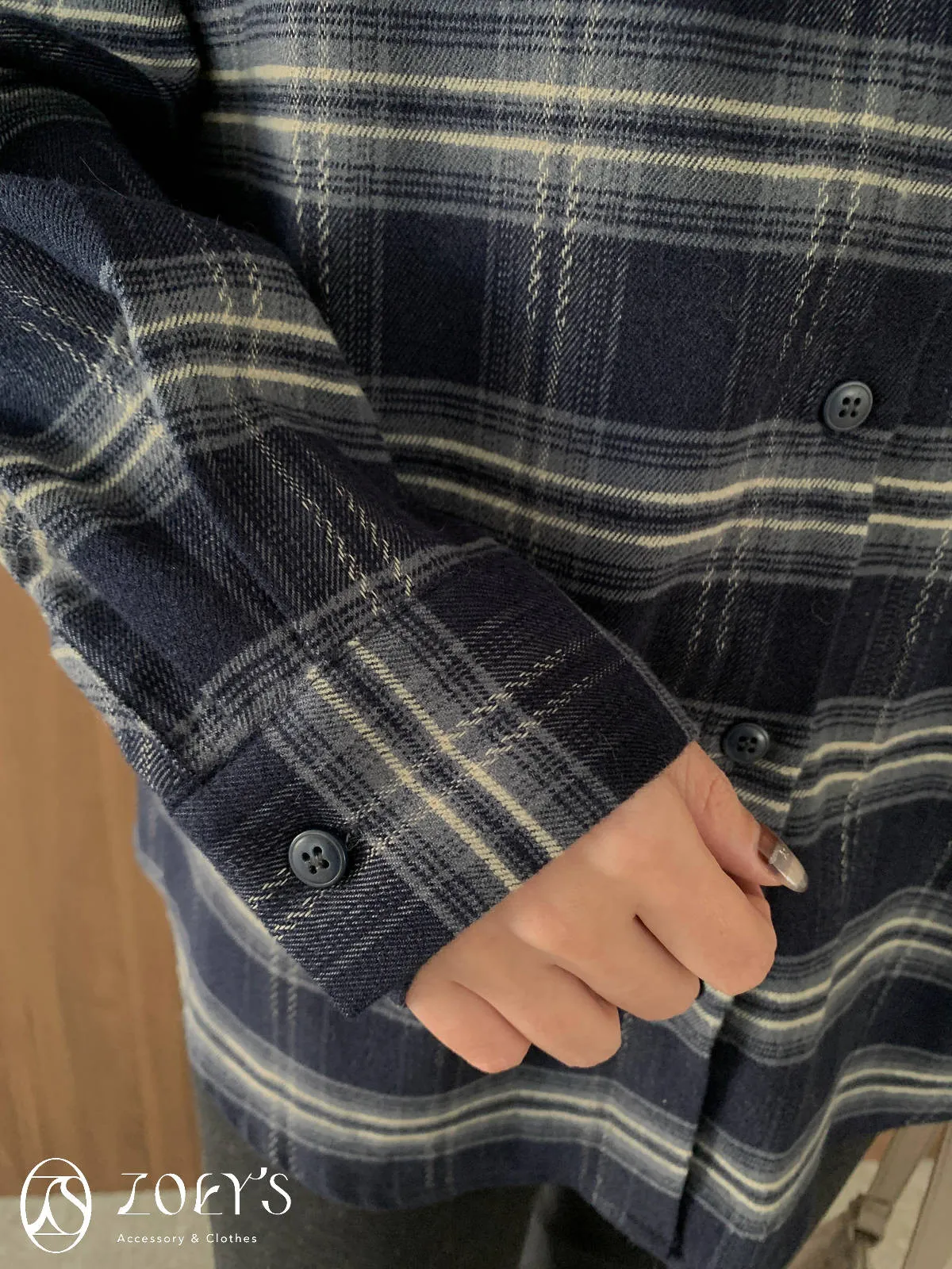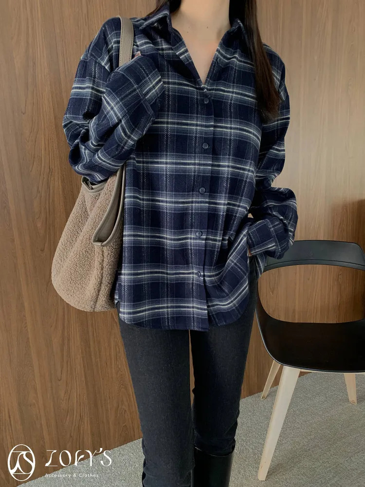 正韓 薄毛呢感格紋襯衫 深藍/咖