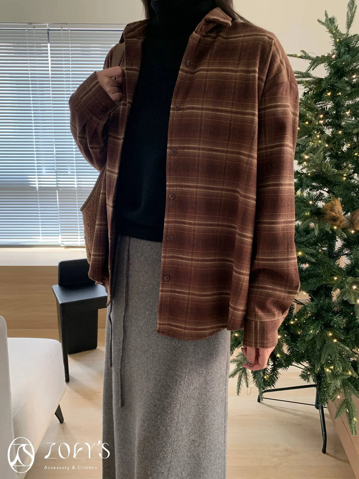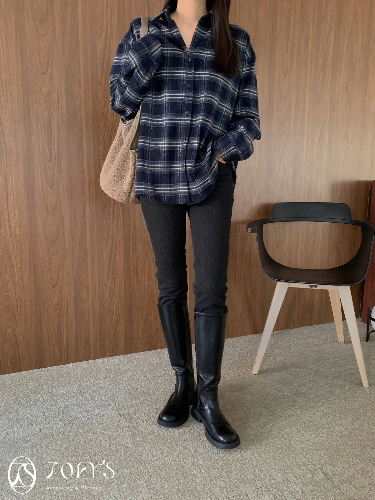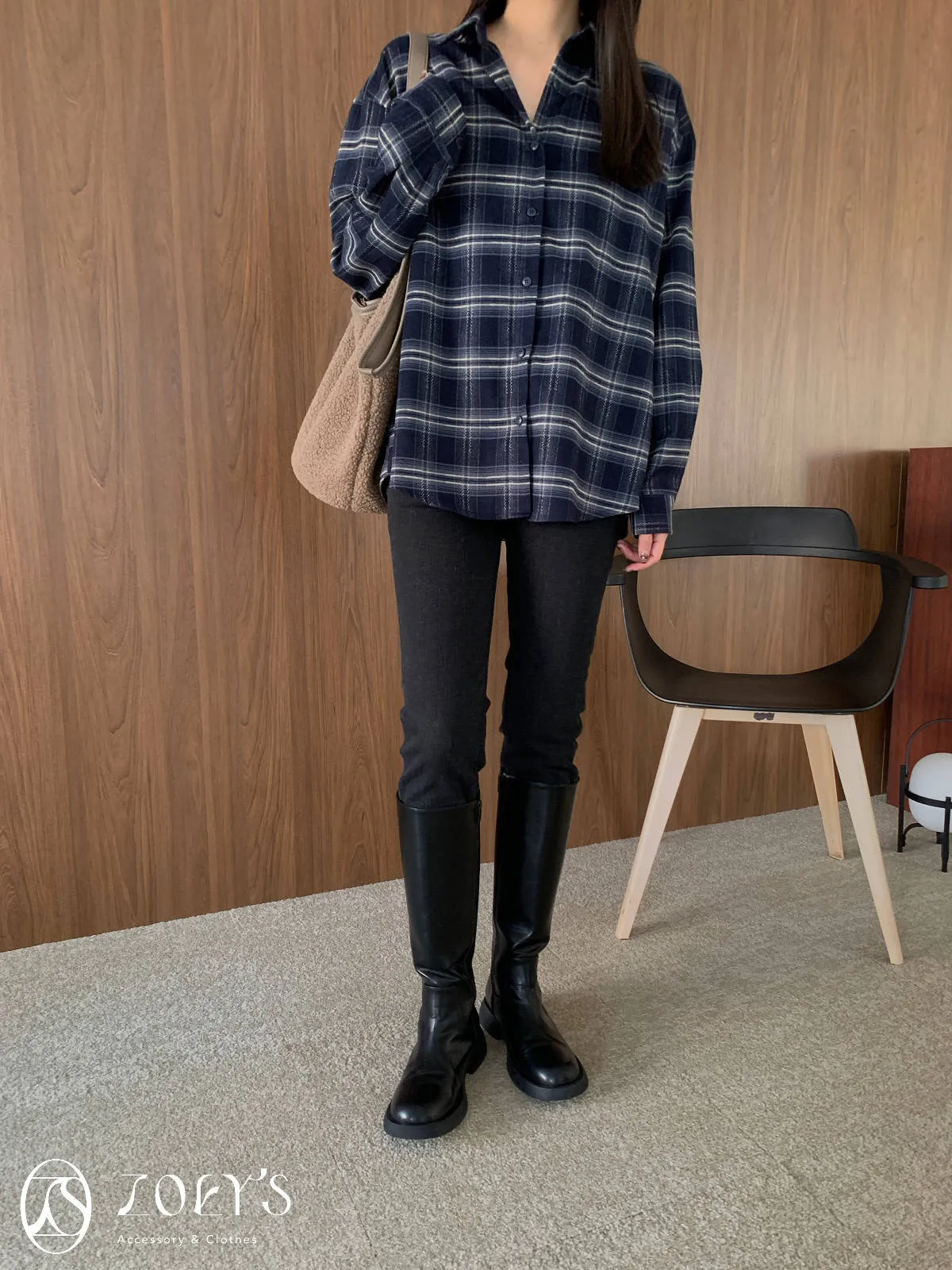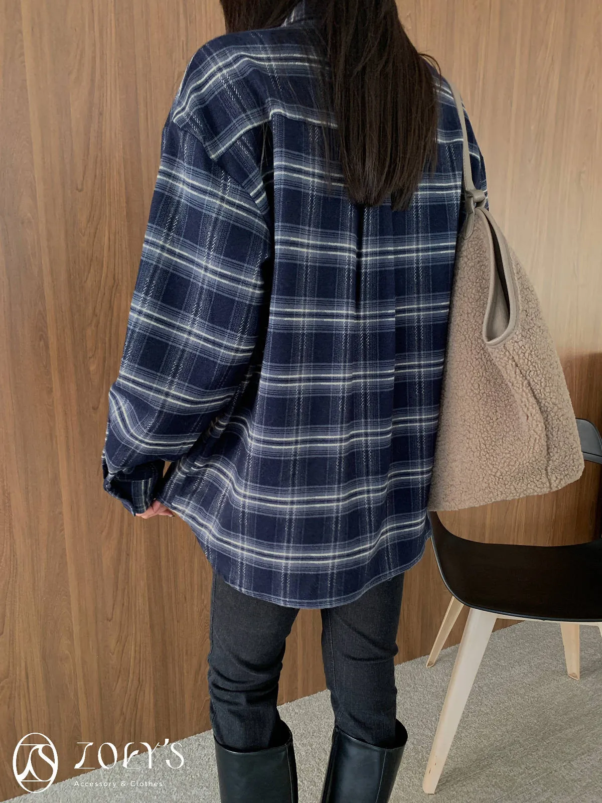 正韓 薄毛呢感格紋襯衫 深藍/咖