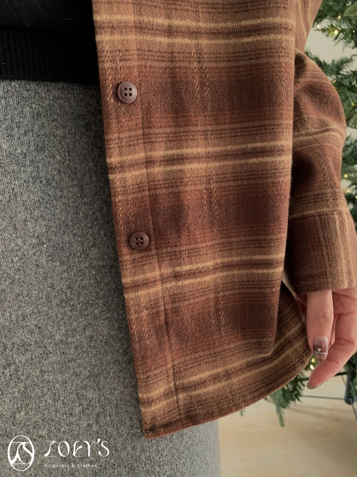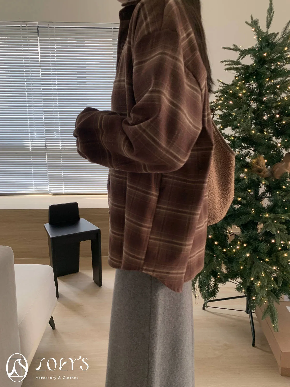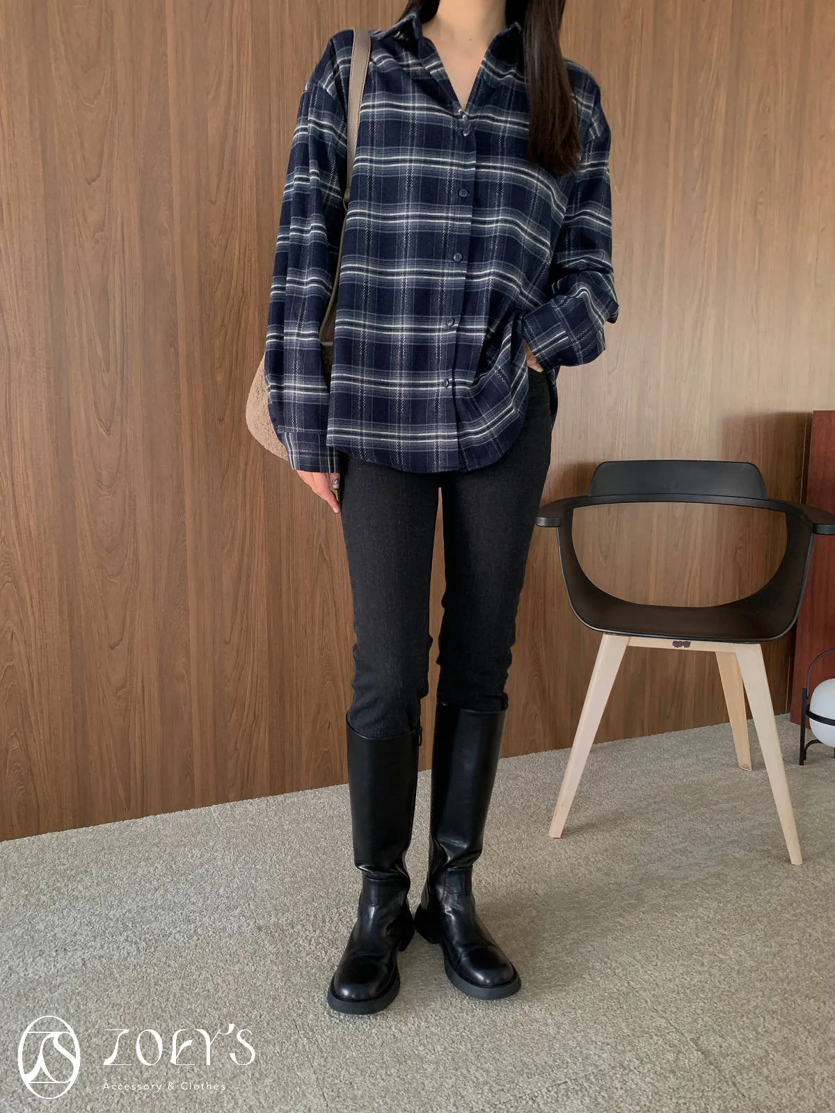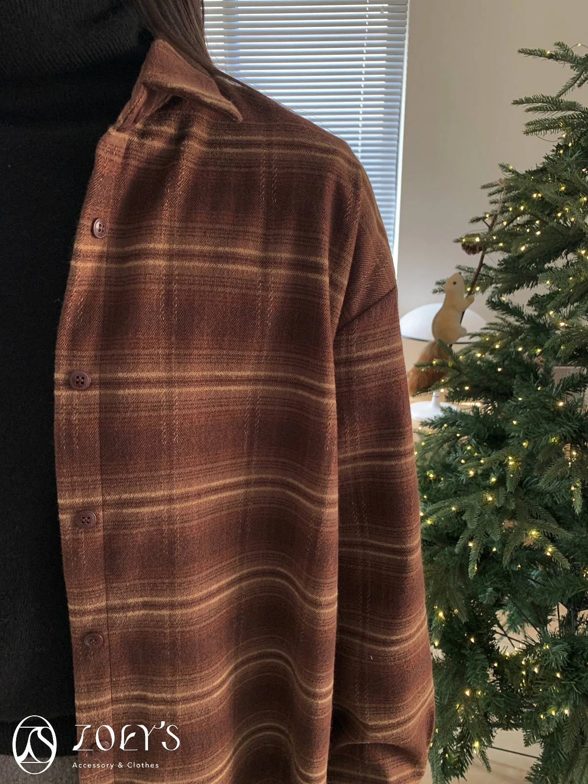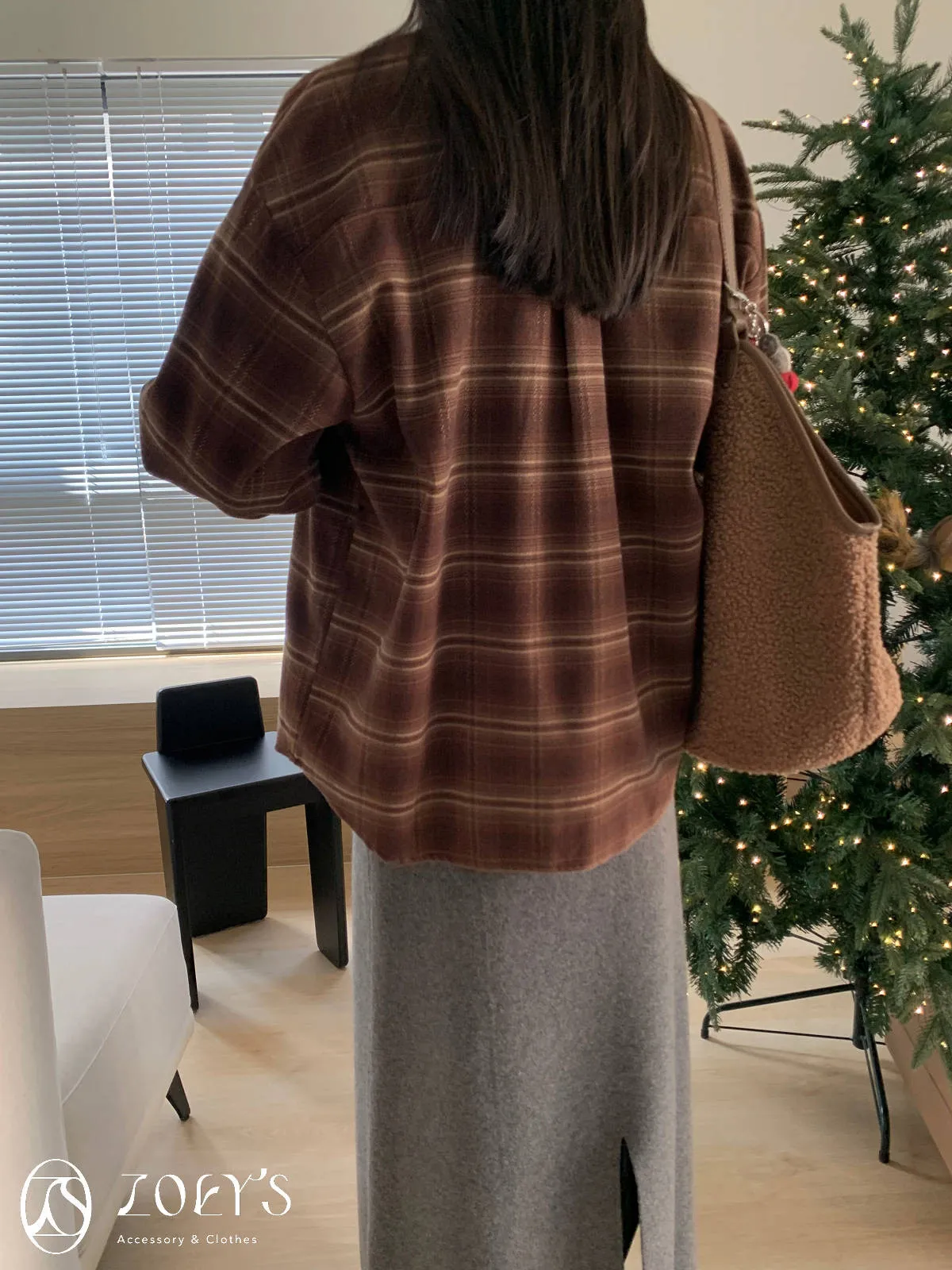 正韓 薄毛呢感格紋襯衫 深藍/咖