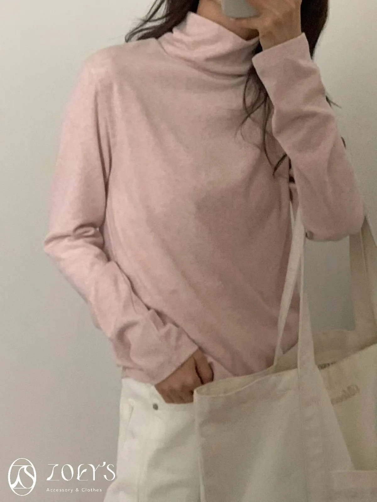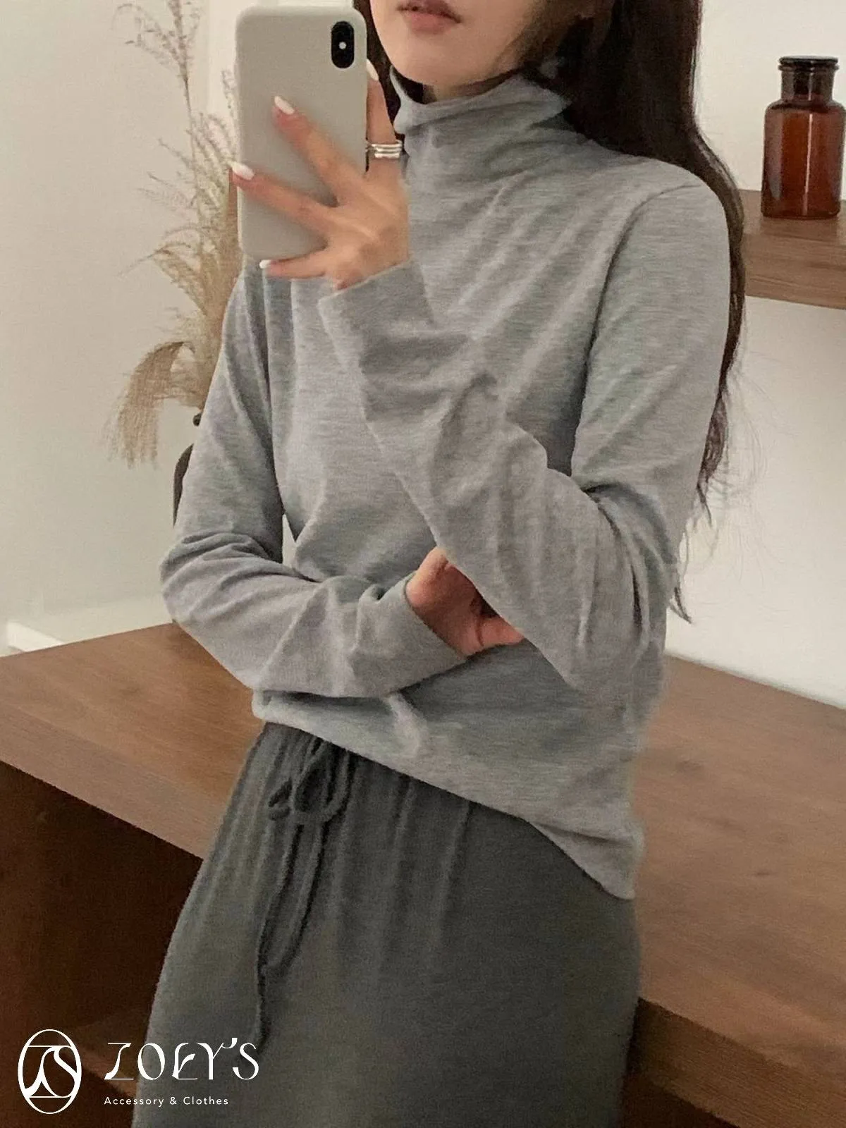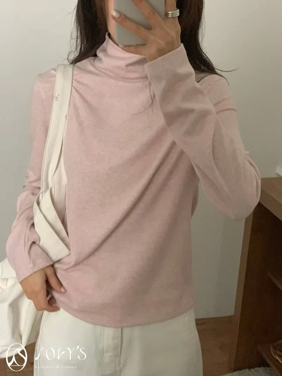 正韓 柔彈高領人造絲薄上衣 粉/灰/卡其/灰白
