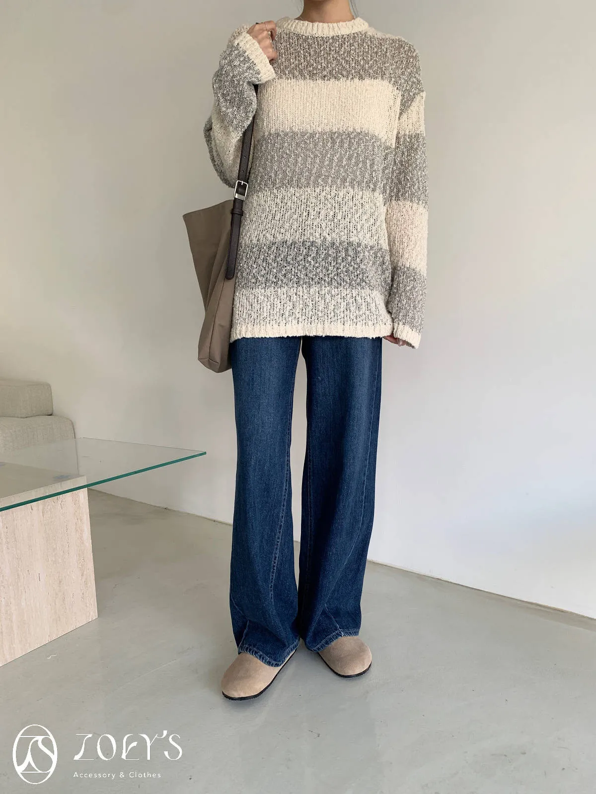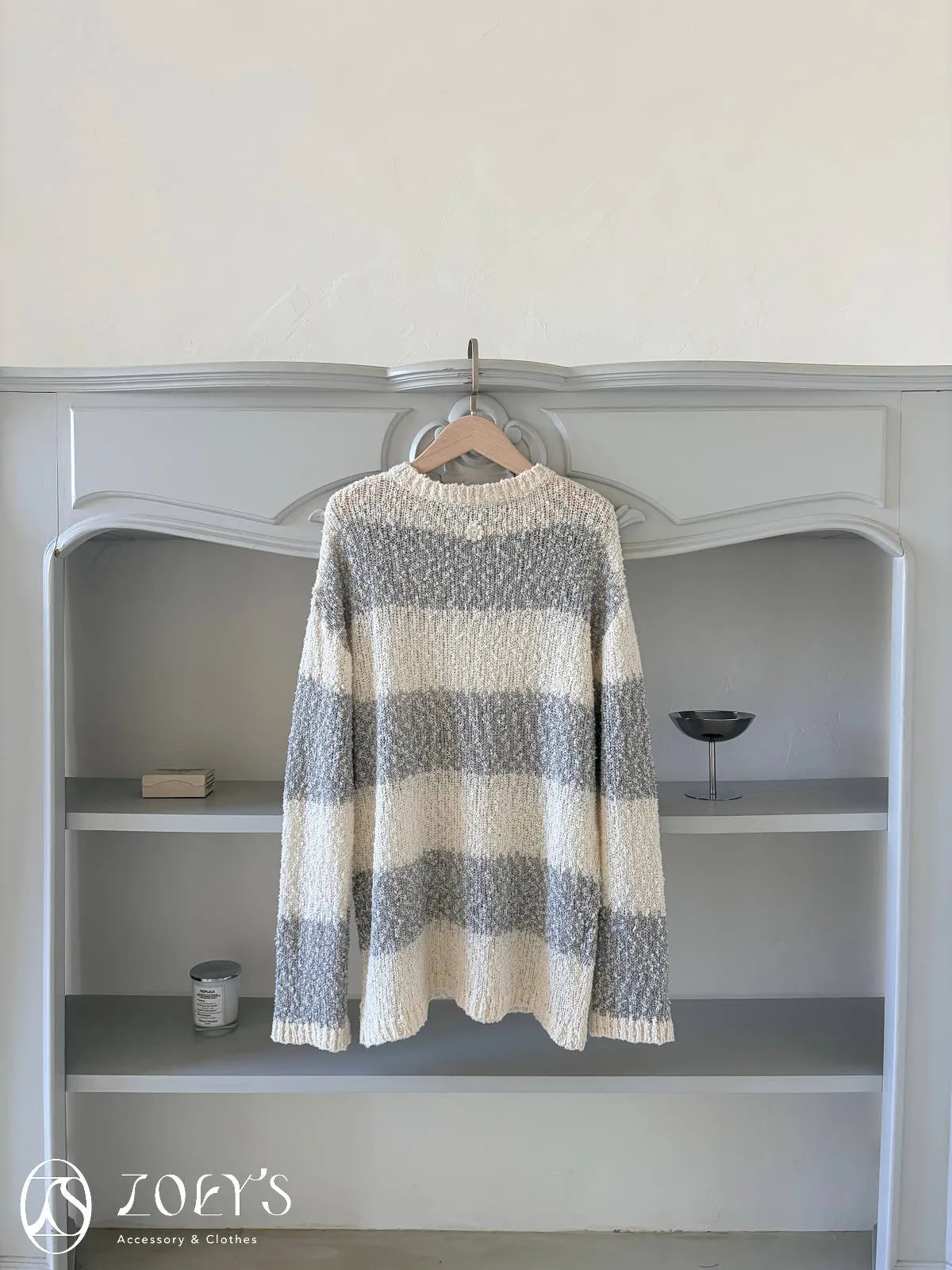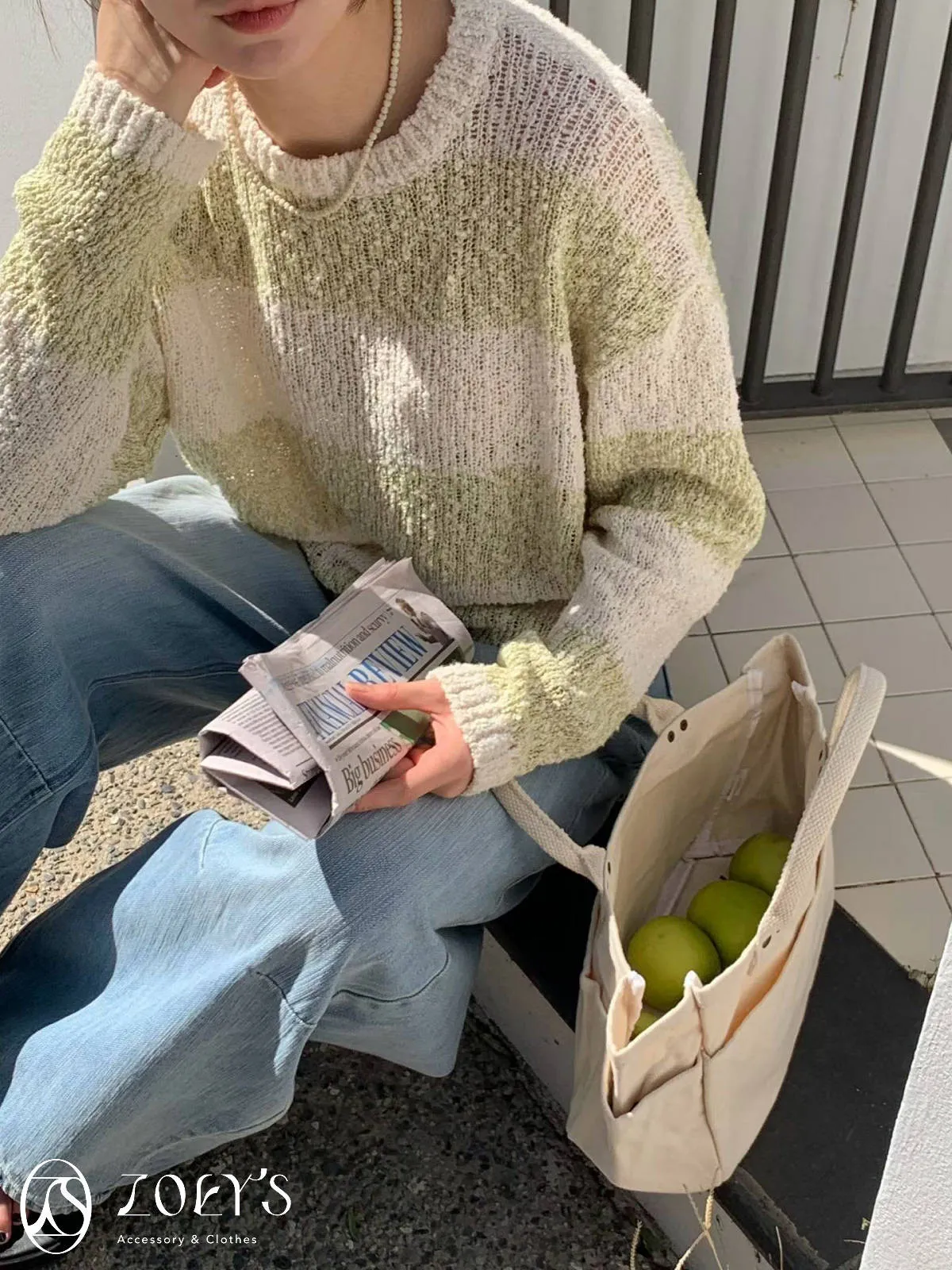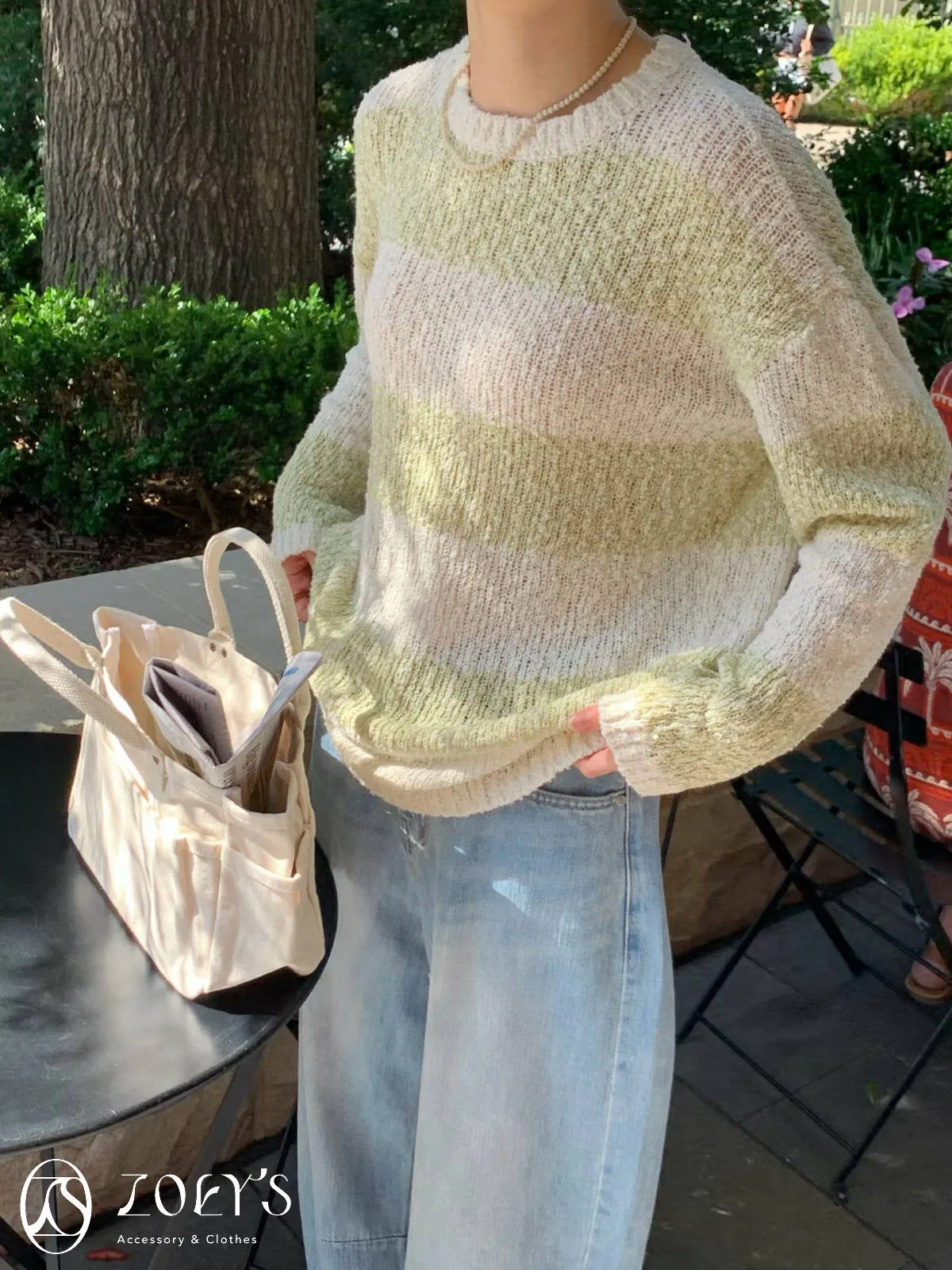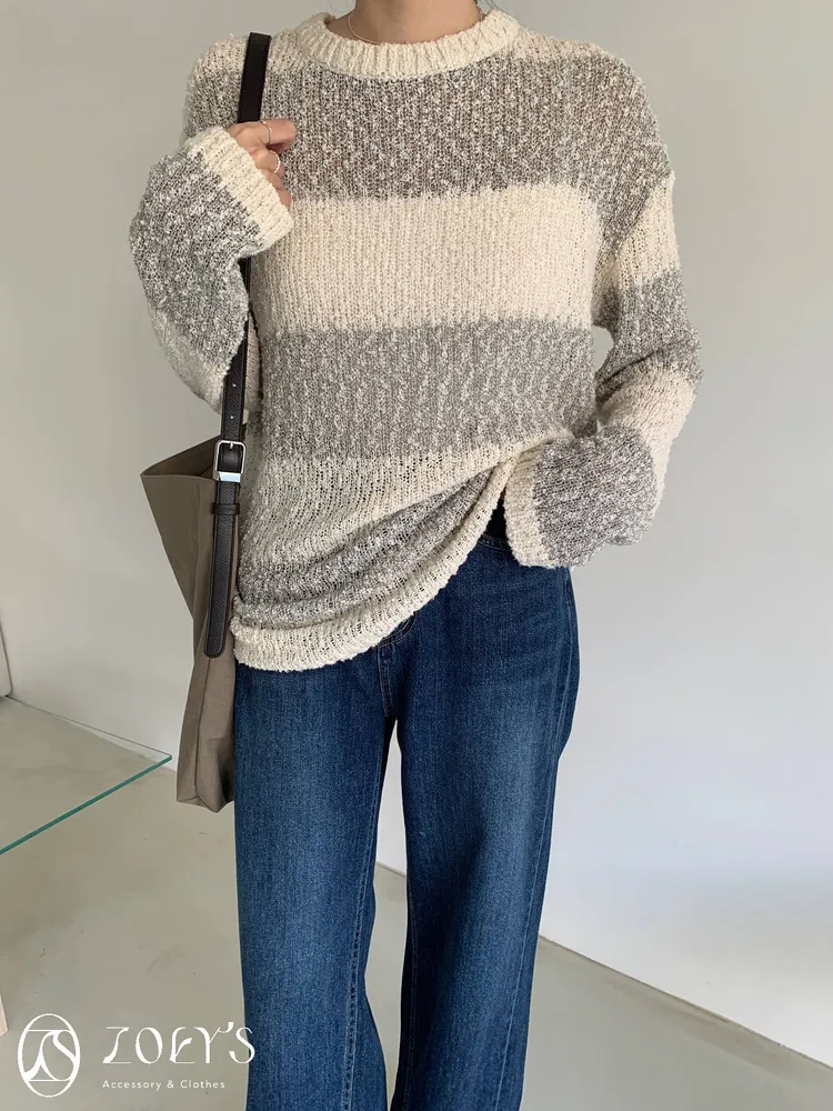 正韓 雪花寬橫紋長版勾針衫 綠/灰