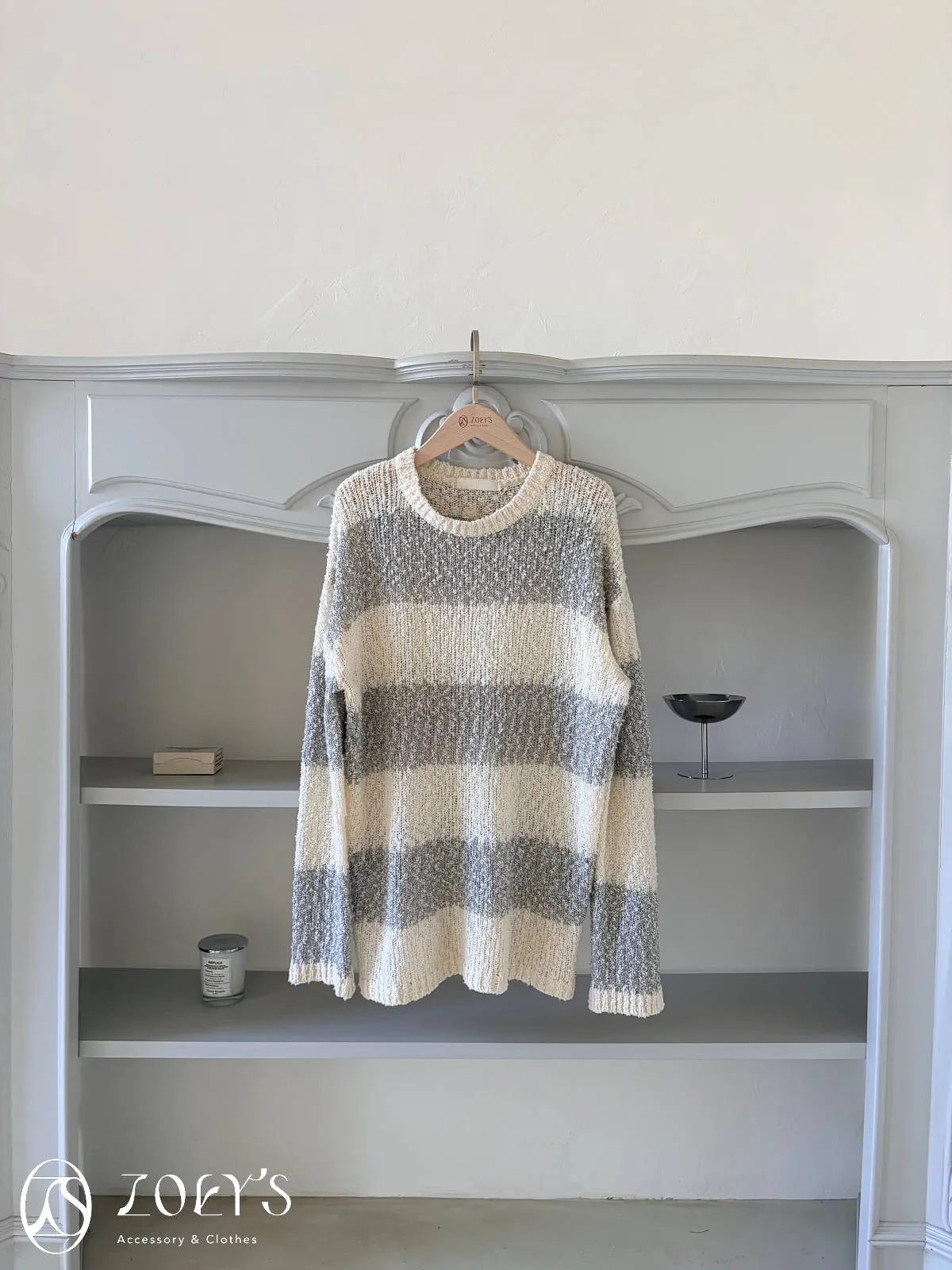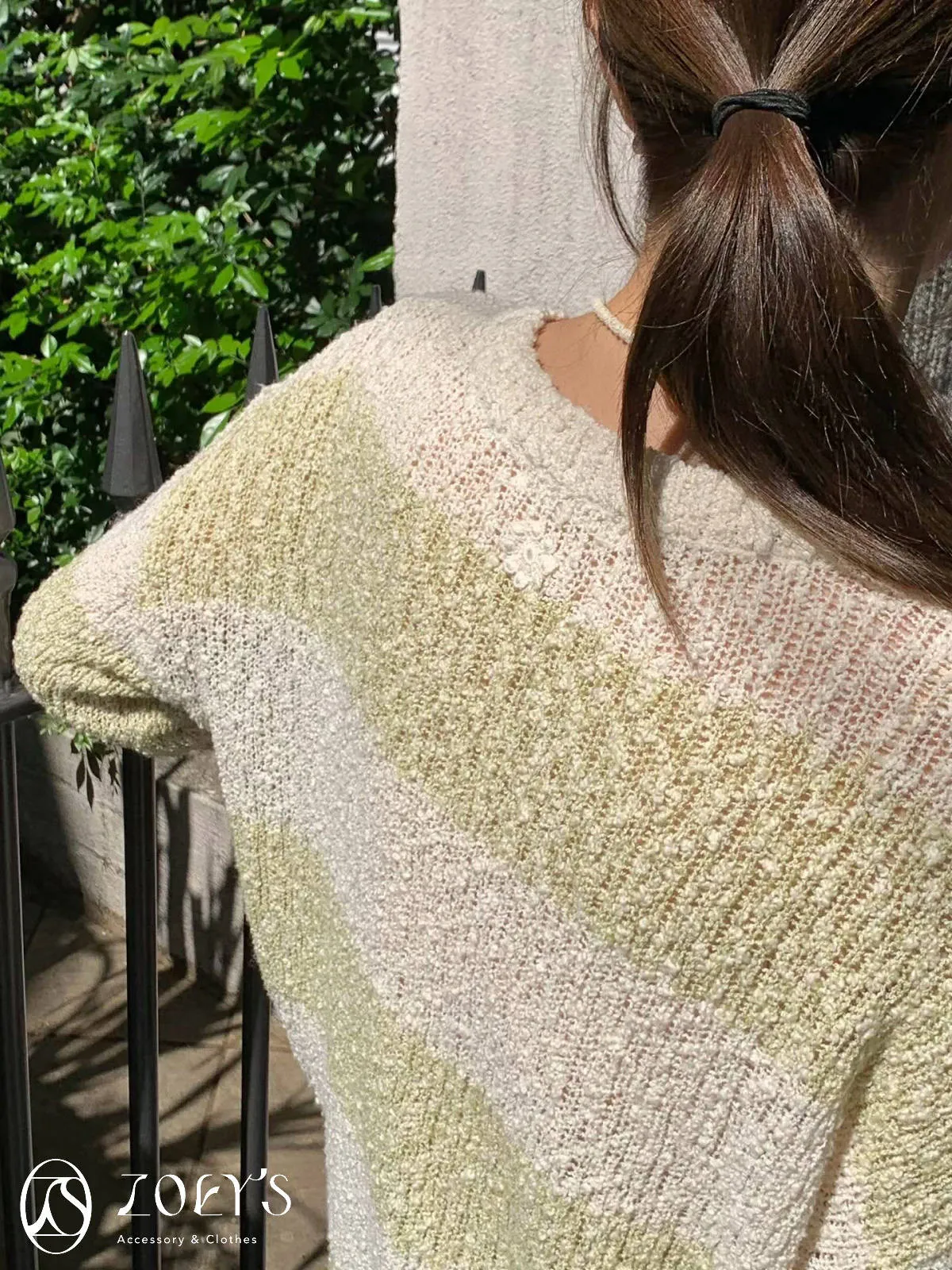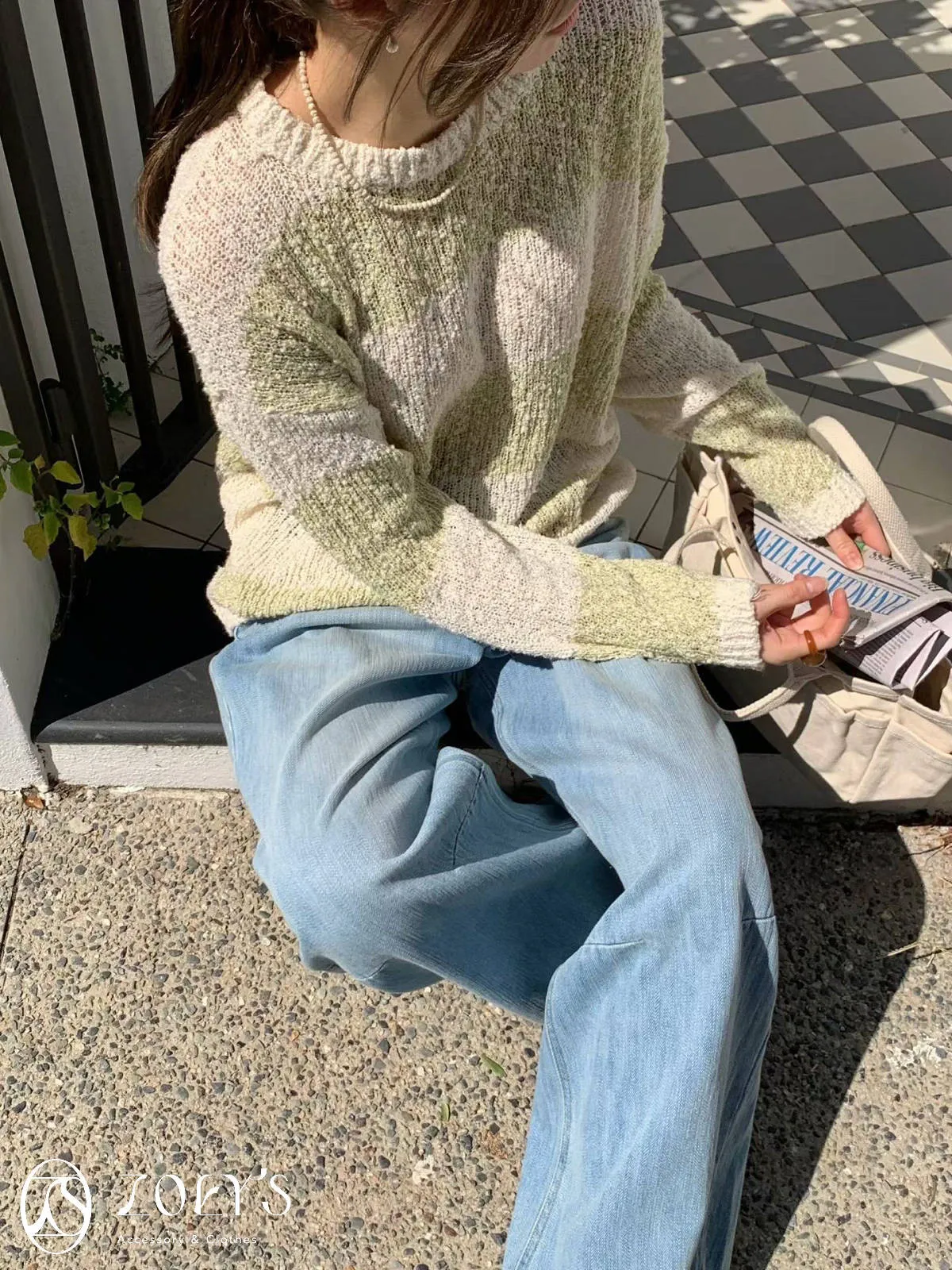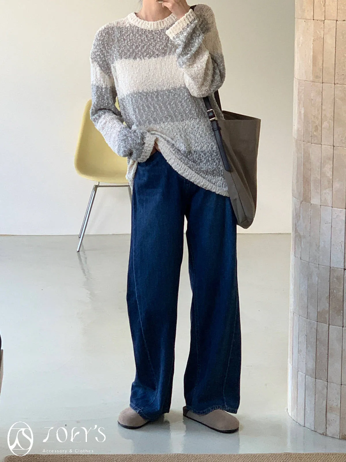 正韓 雪花寬橫紋長版勾針衫 綠/灰