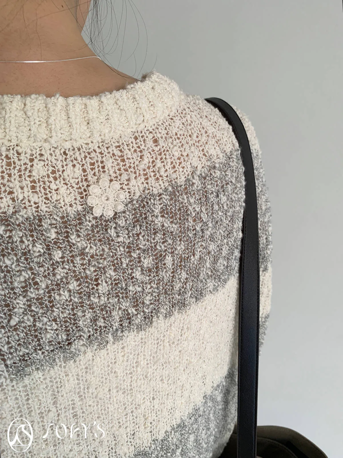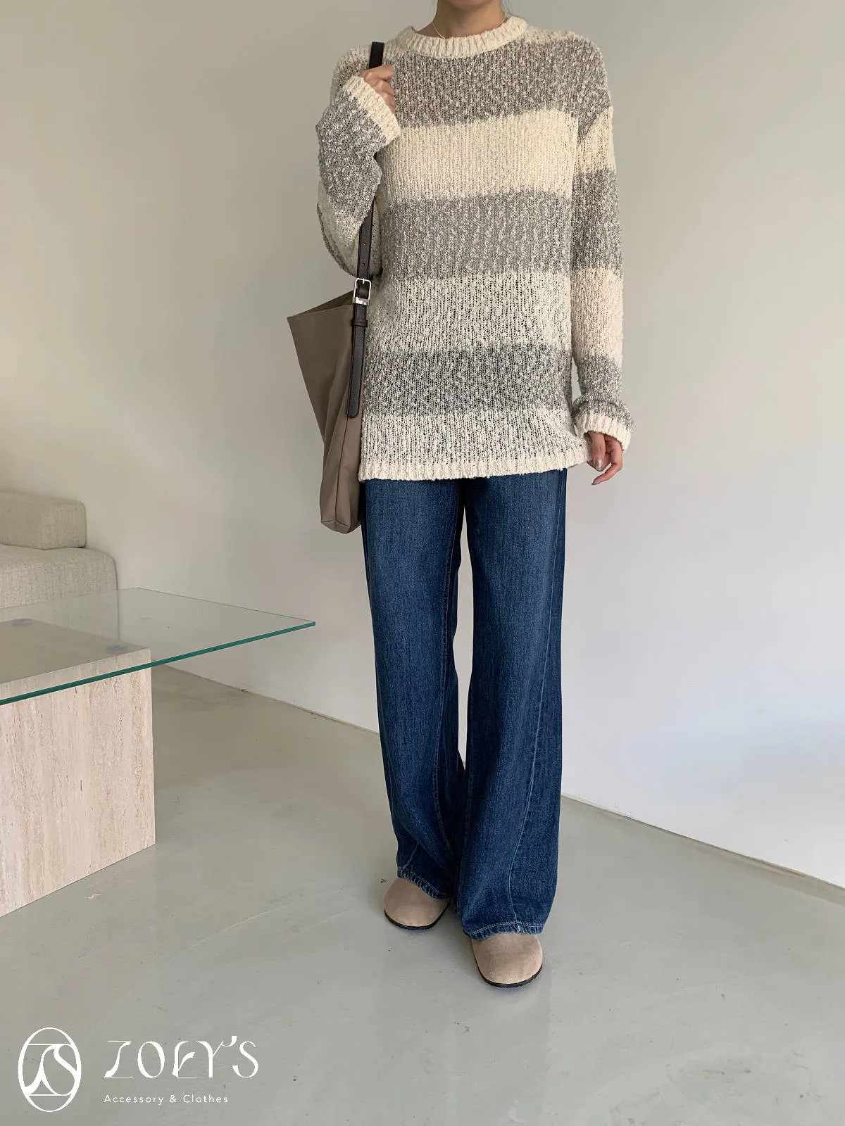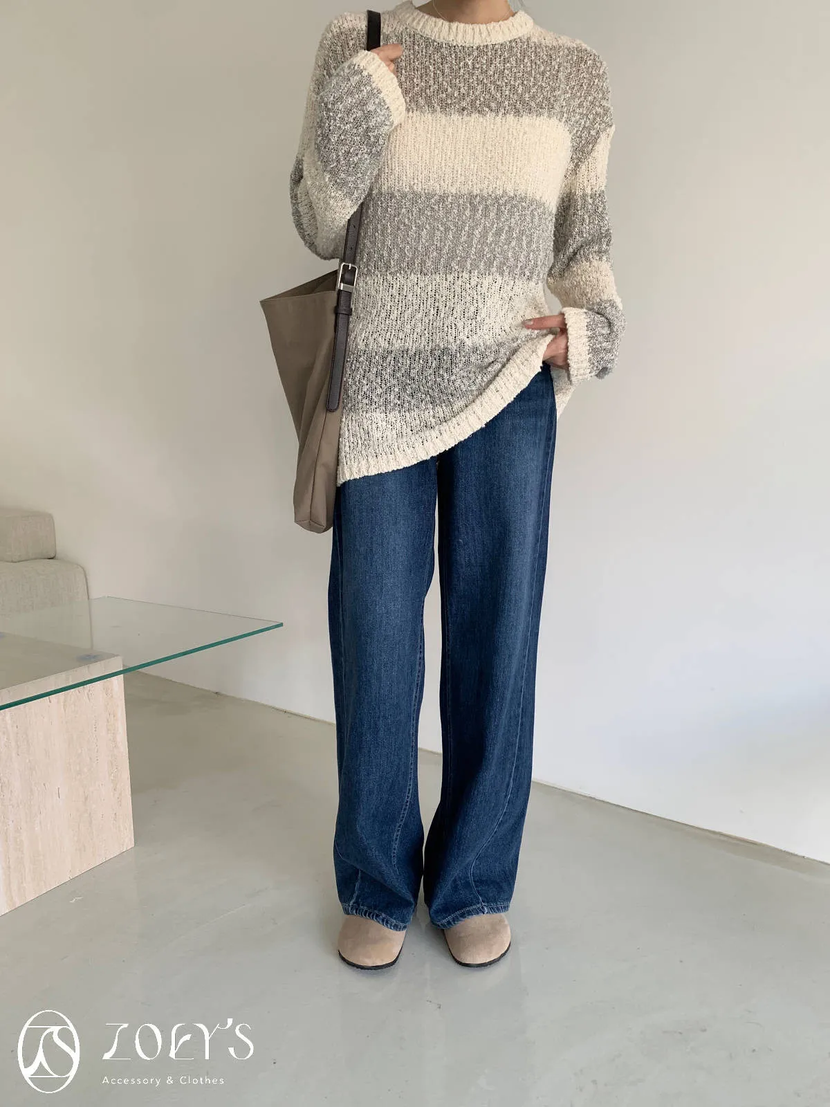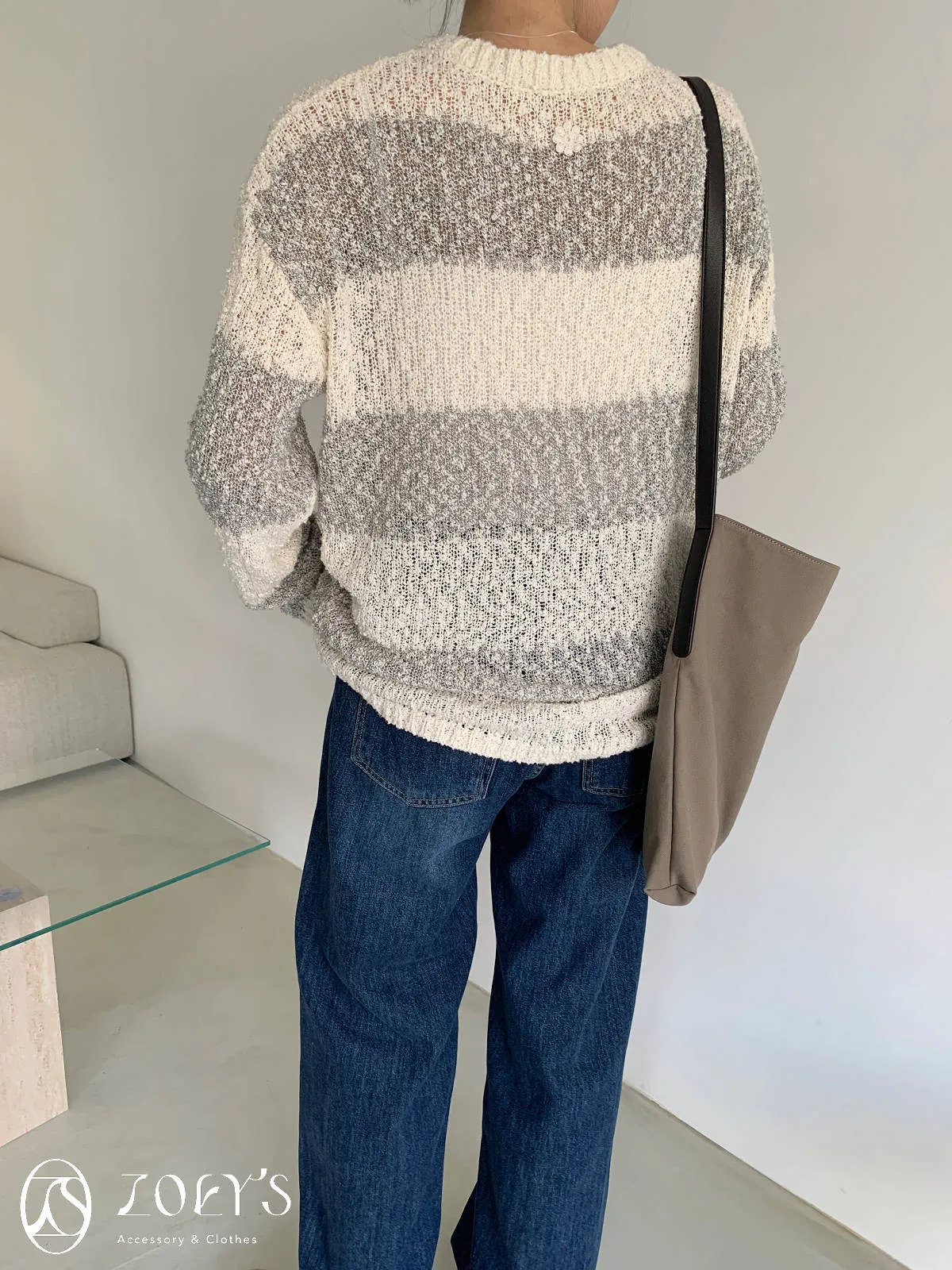 正韓 雪花寬橫紋長版勾針衫 綠/灰