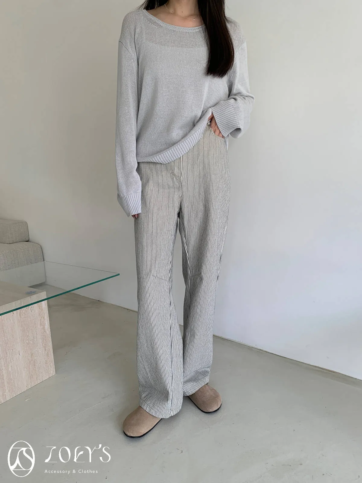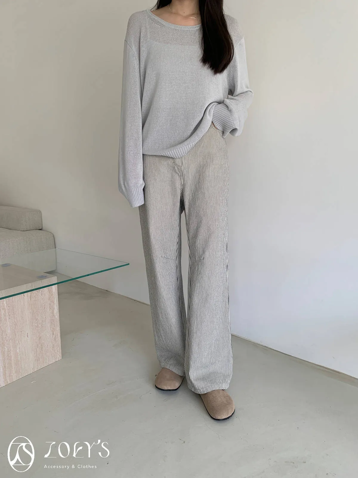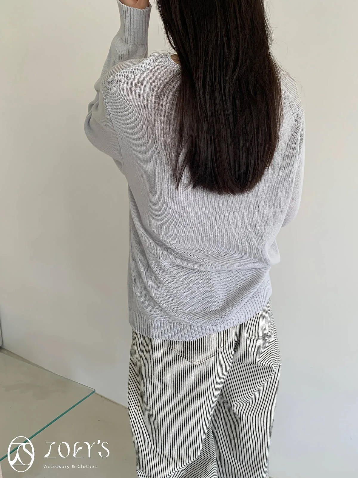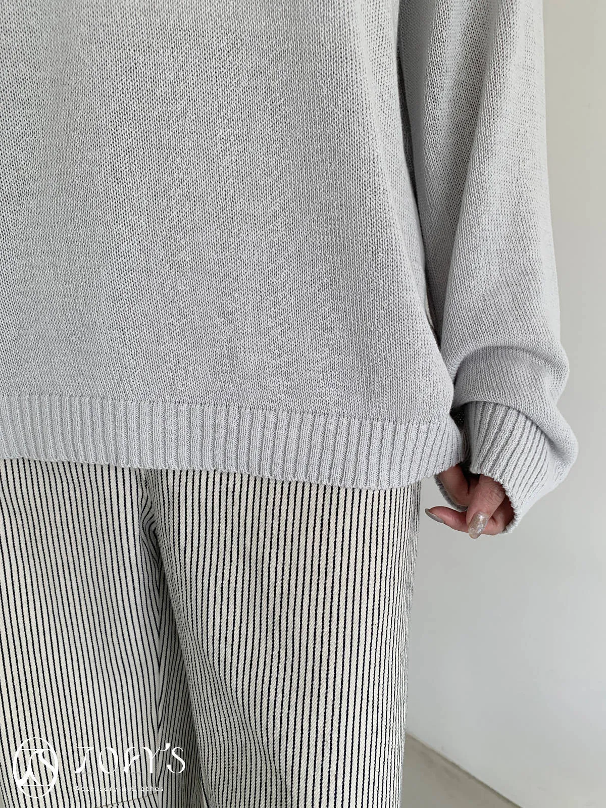正韓 寬鬆圓領細螺紋薄勾針衫 淡灰藍/薄荷/白