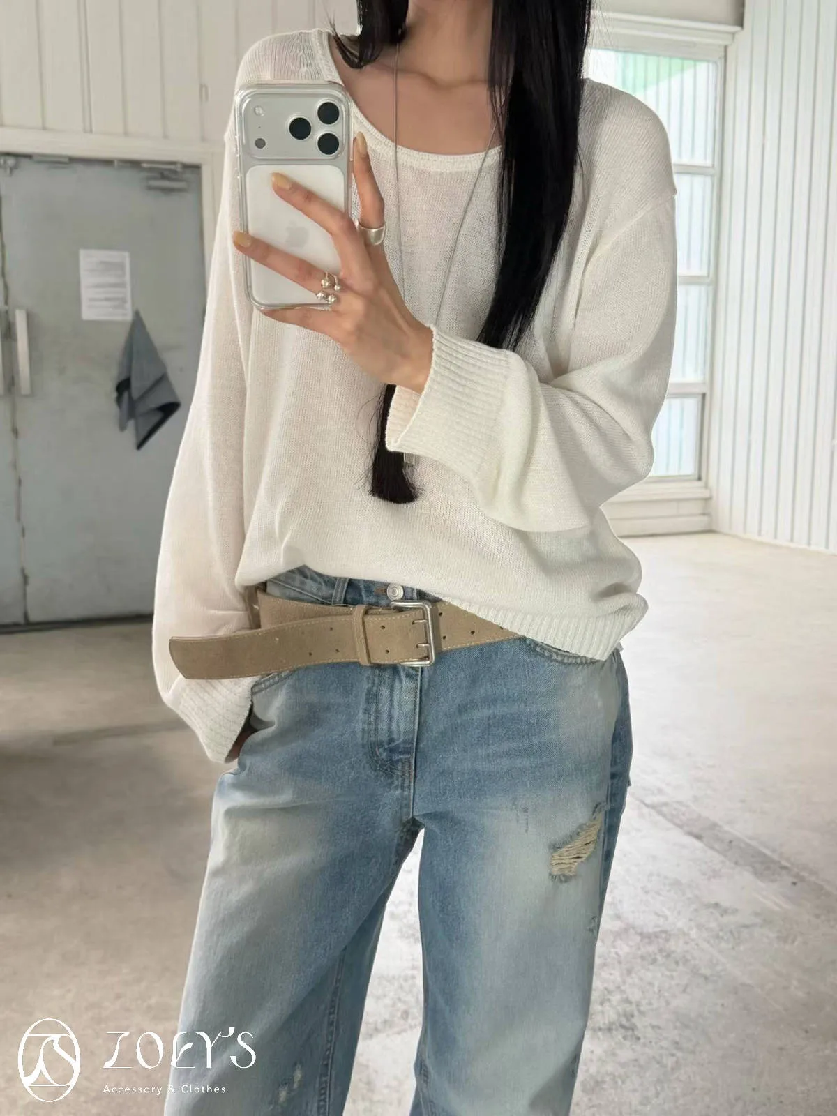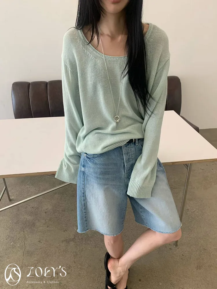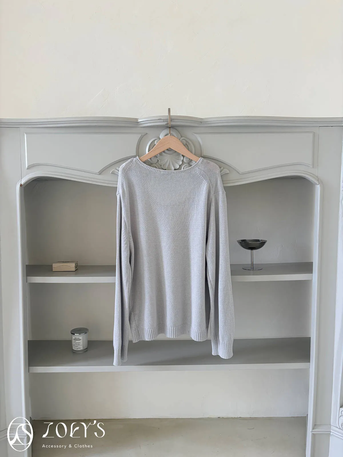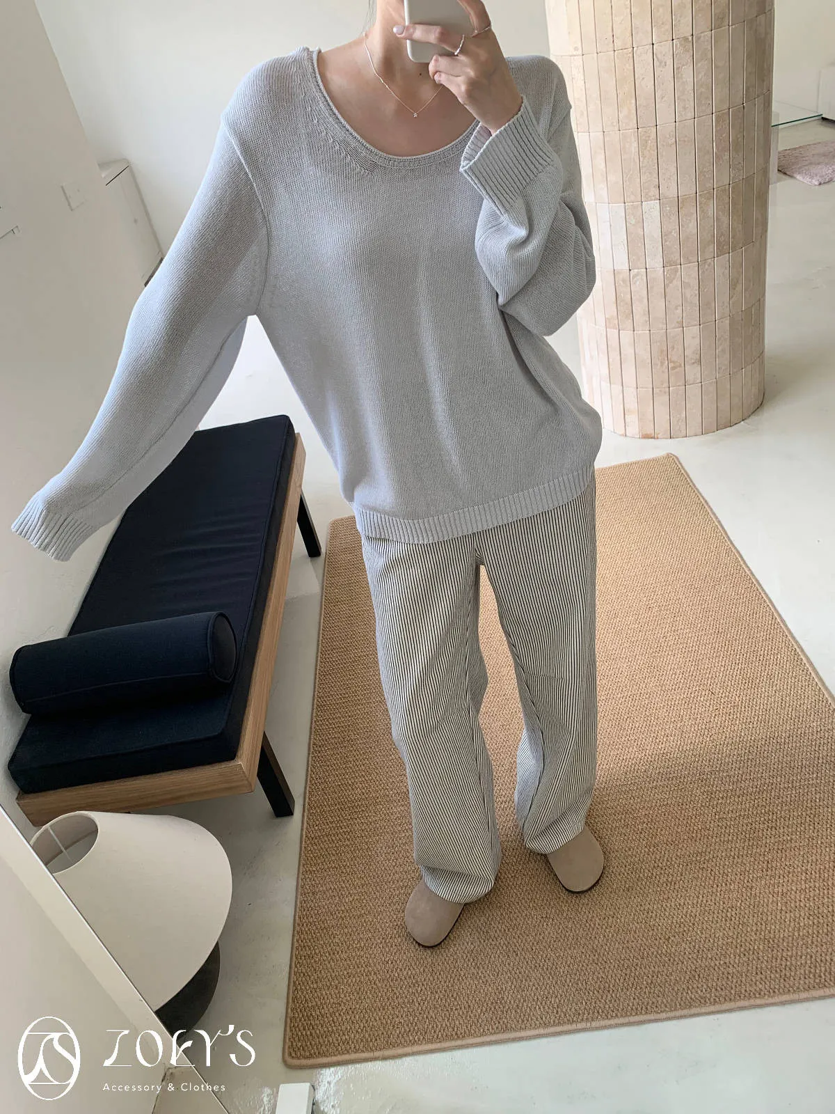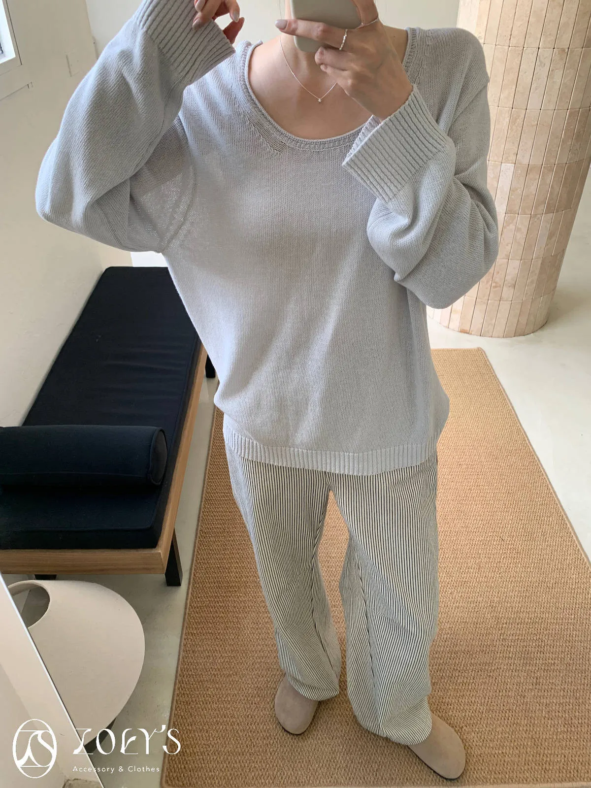 正韓 寬鬆圓領細螺紋薄勾針衫 淡灰藍/薄荷/白