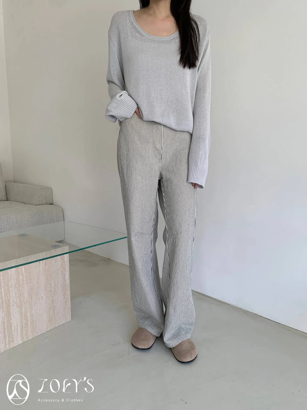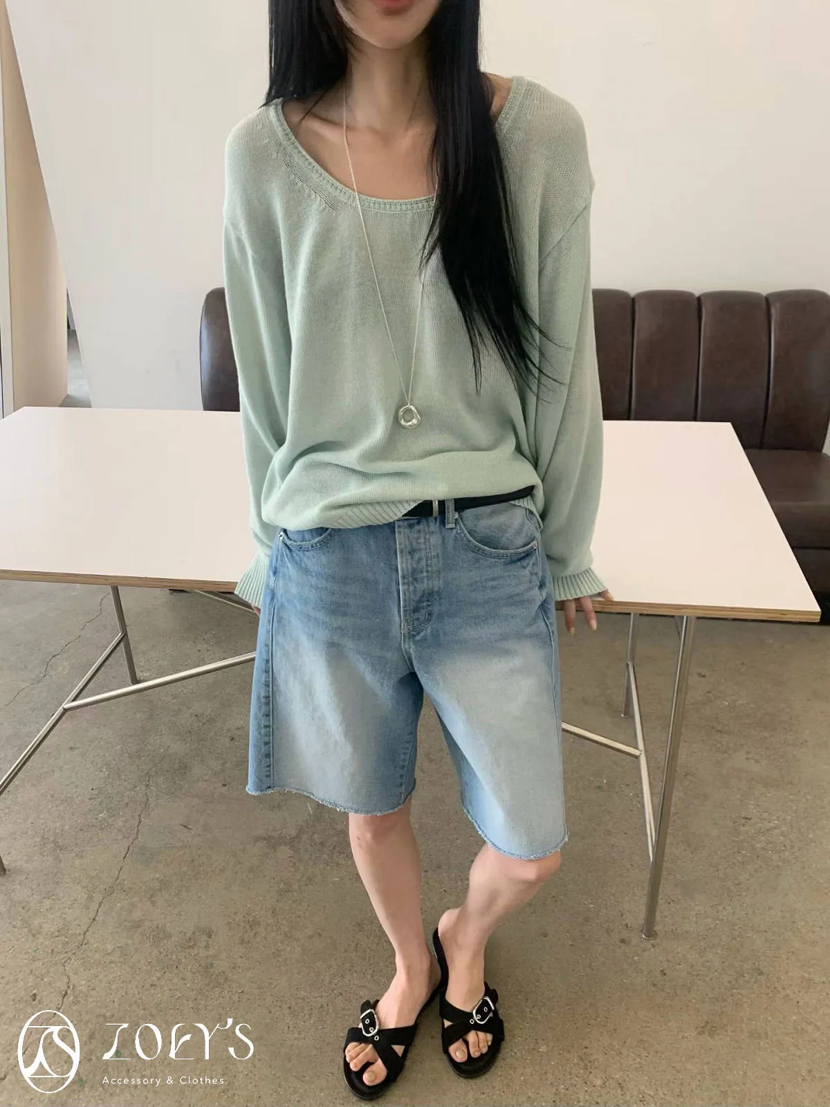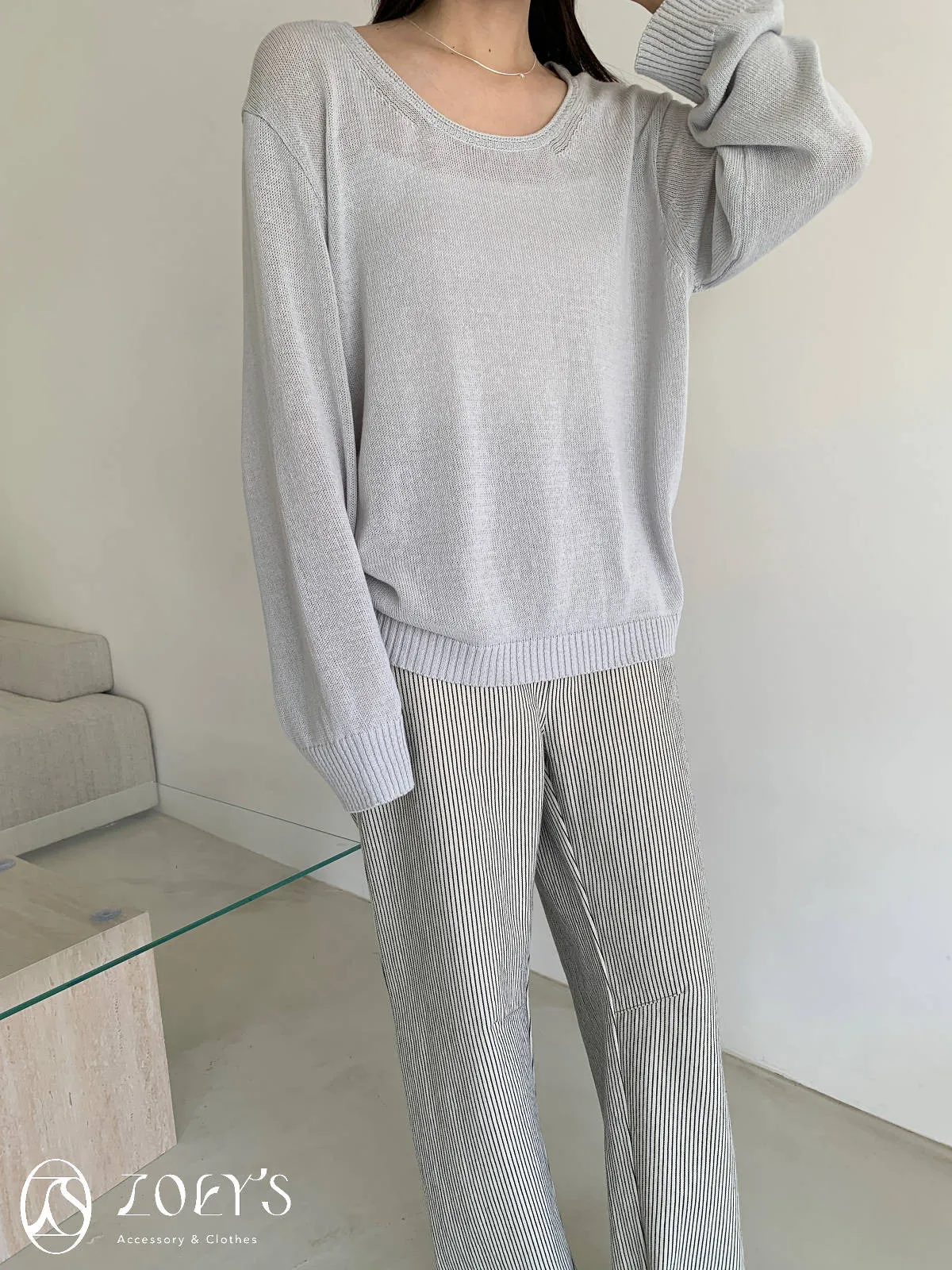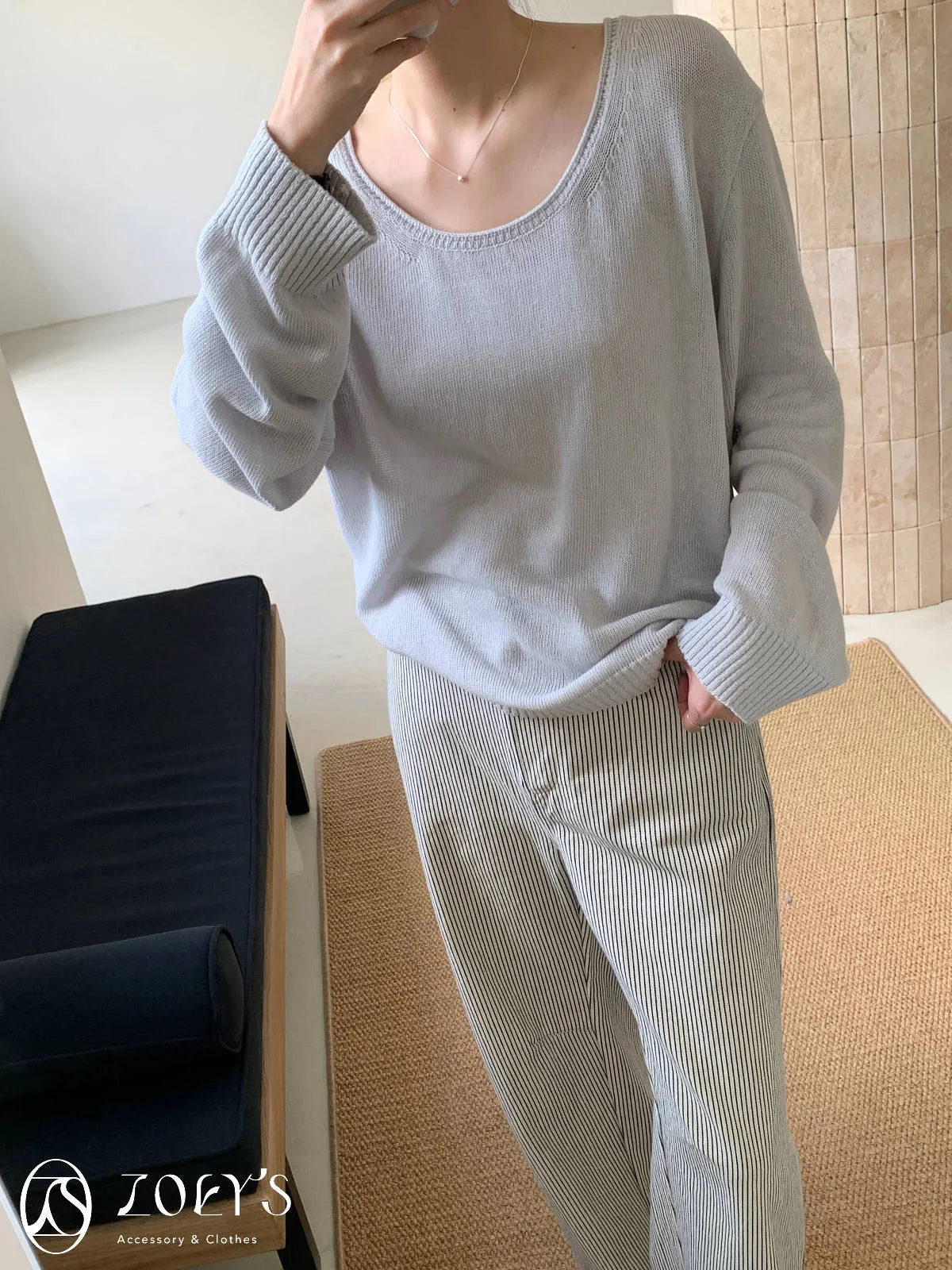 正韓 寬鬆圓領細螺紋薄勾針衫 淡灰藍/薄荷/白