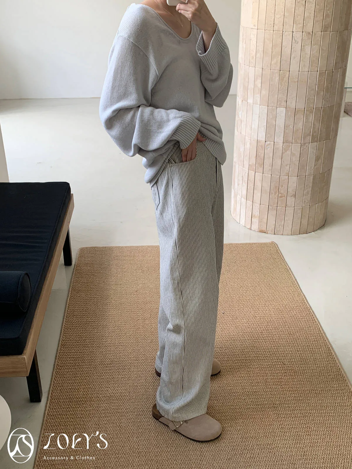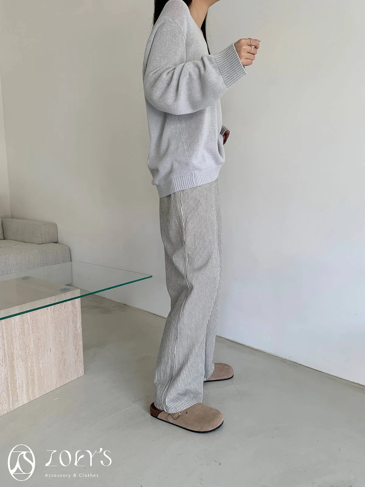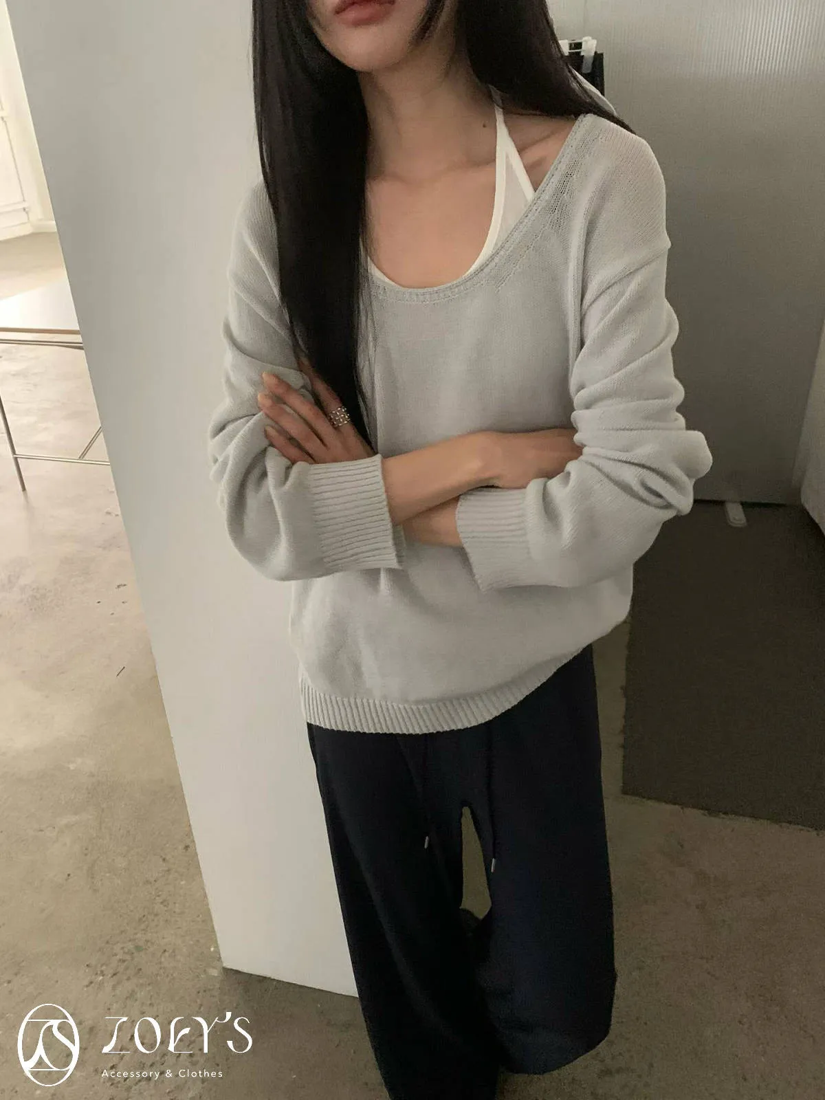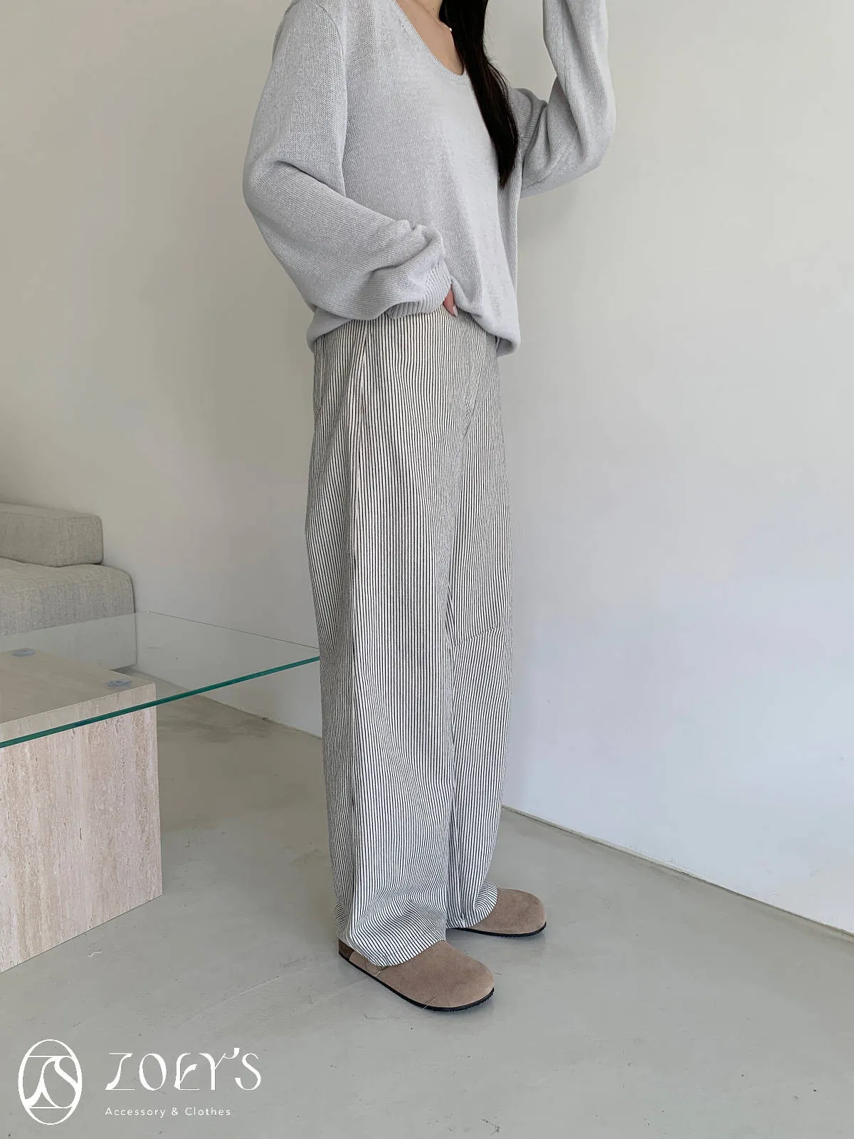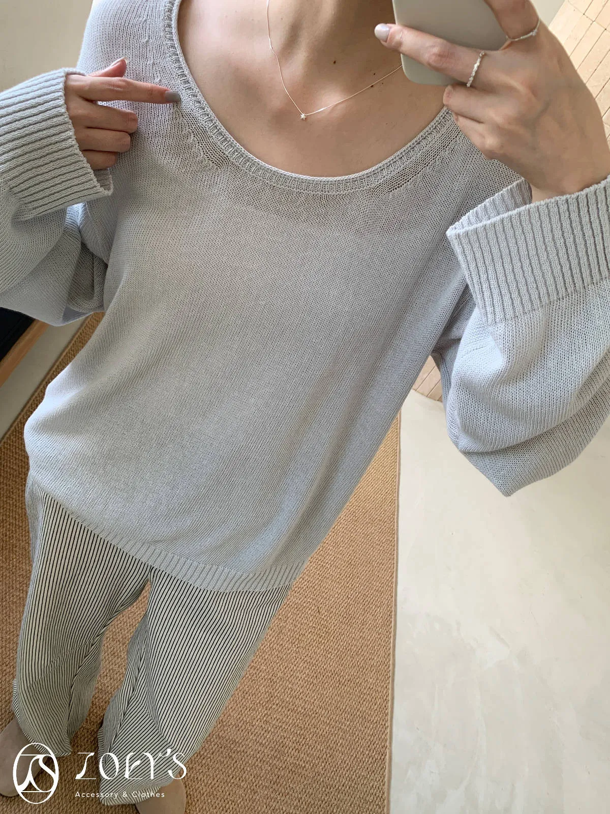 正韓 寬鬆圓領細螺紋薄勾針衫 淡灰藍/薄荷/白