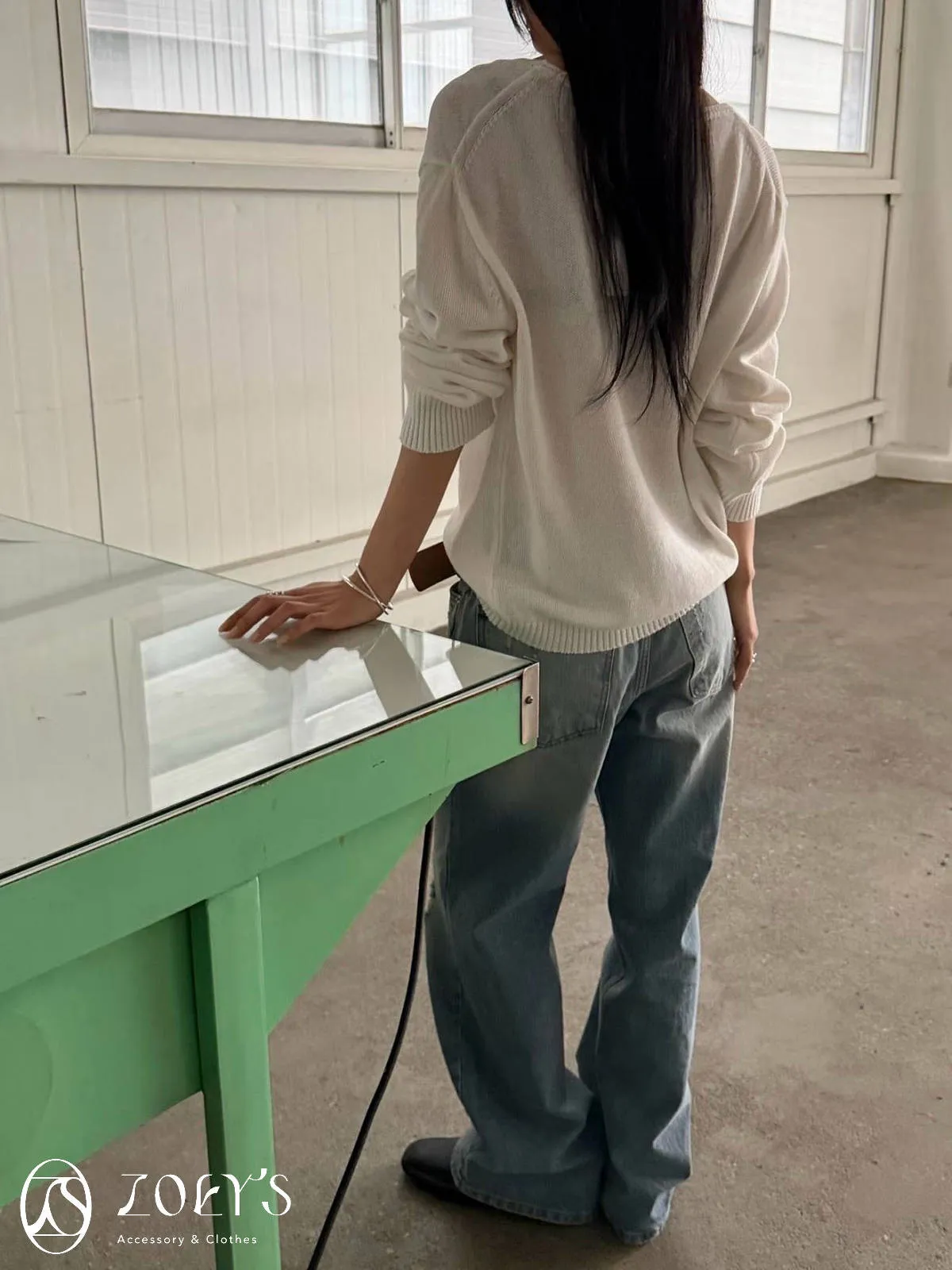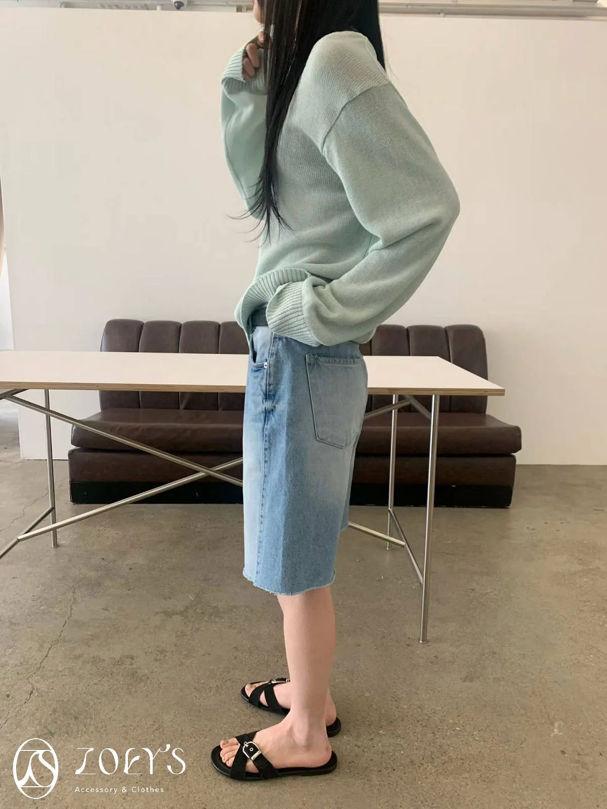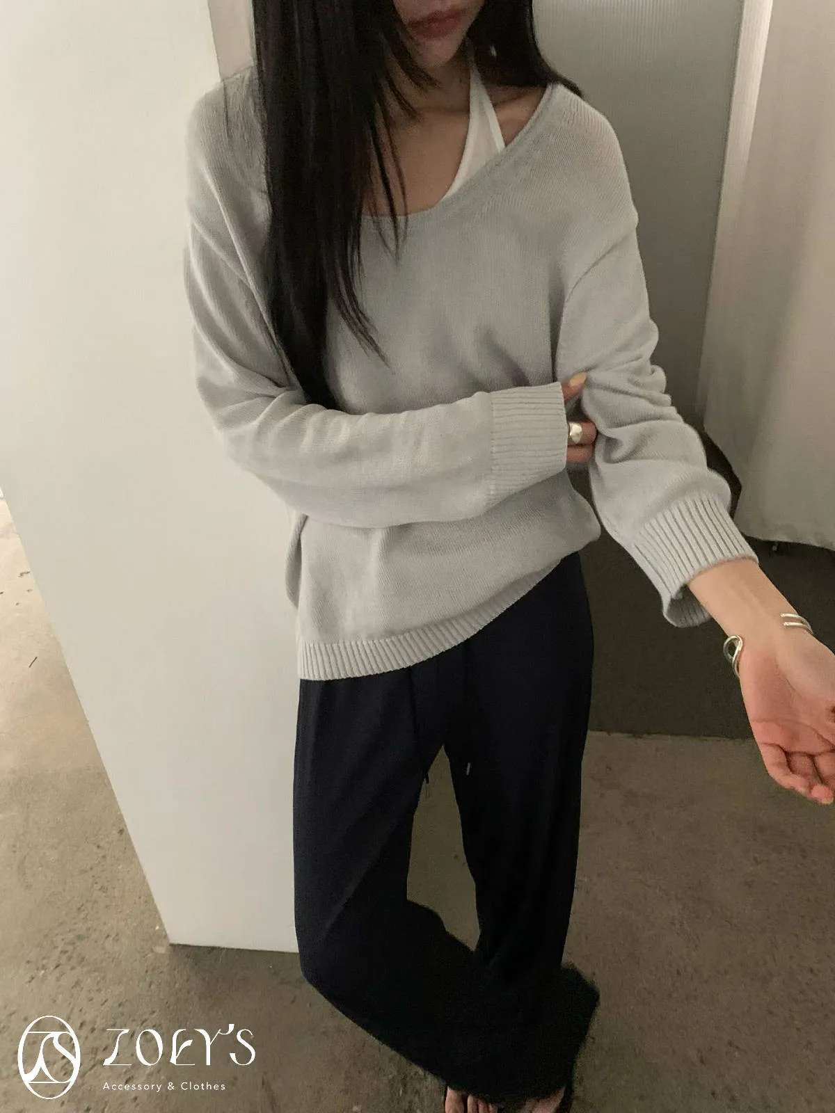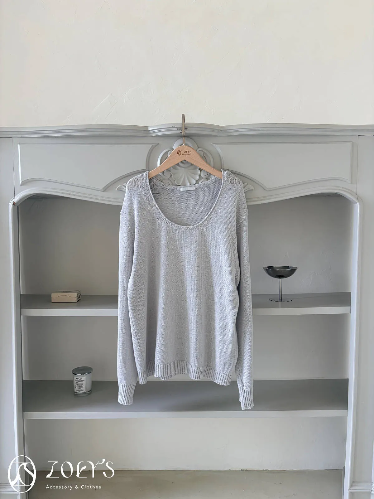 正韓 寬鬆圓領細螺紋薄勾針衫 淡灰藍/薄荷/白