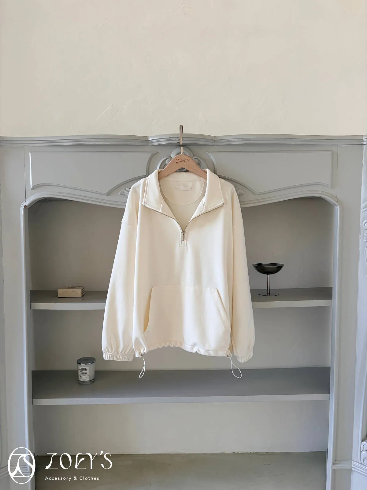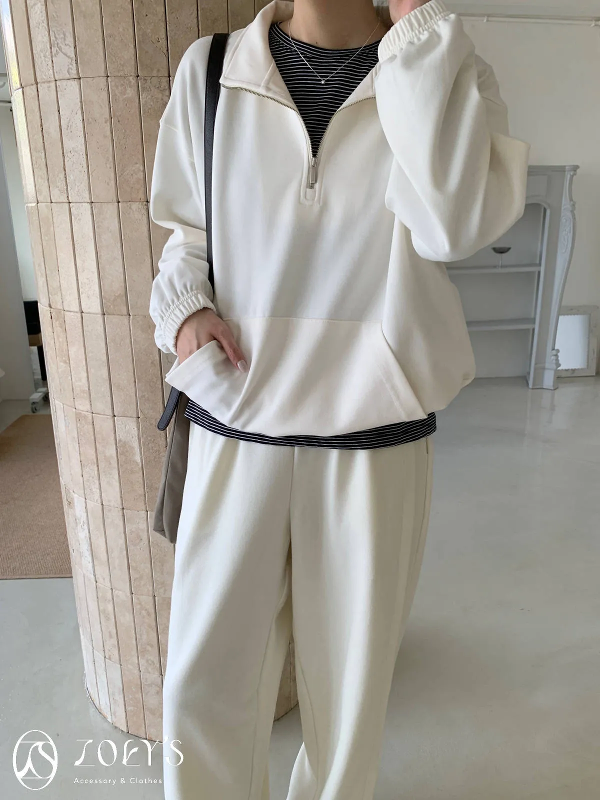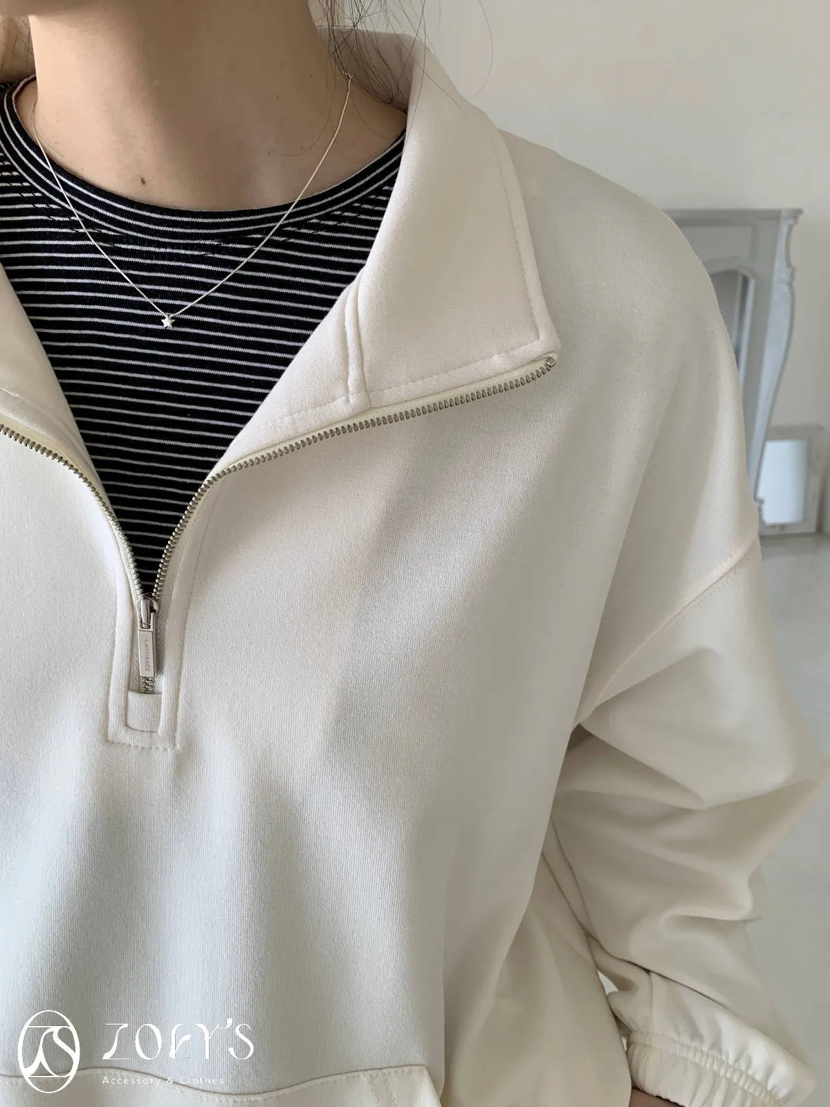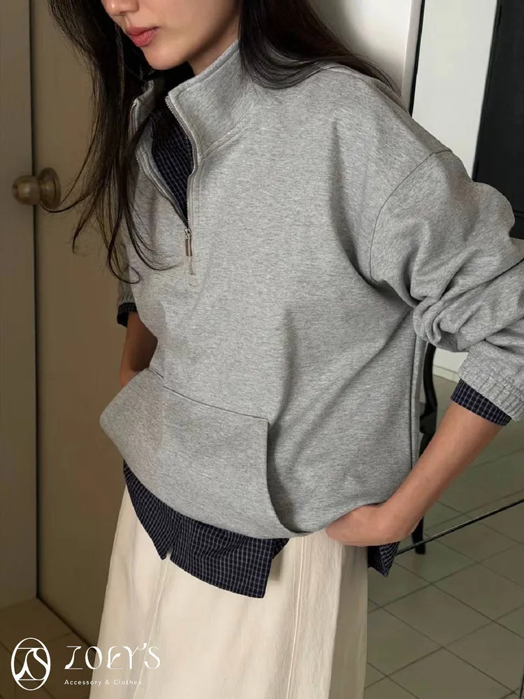 正韓 拉鍊立領滑棉大學T 灰/白