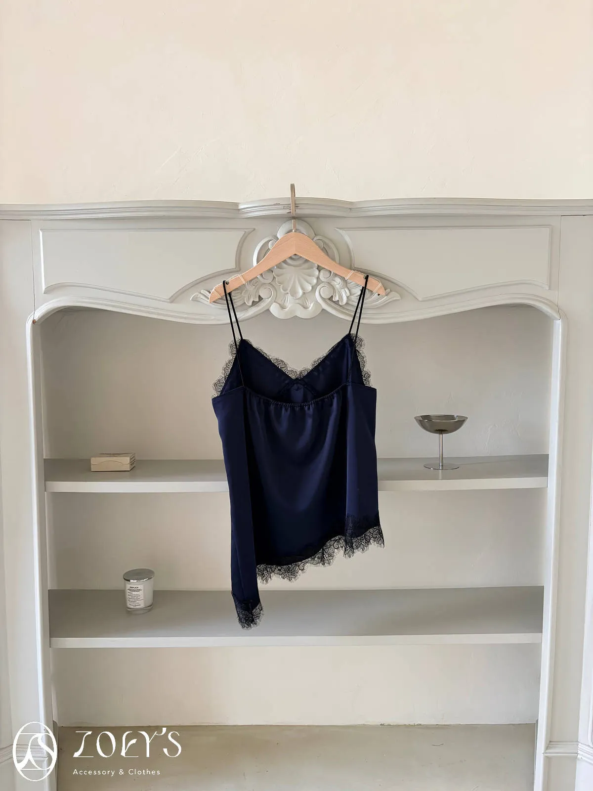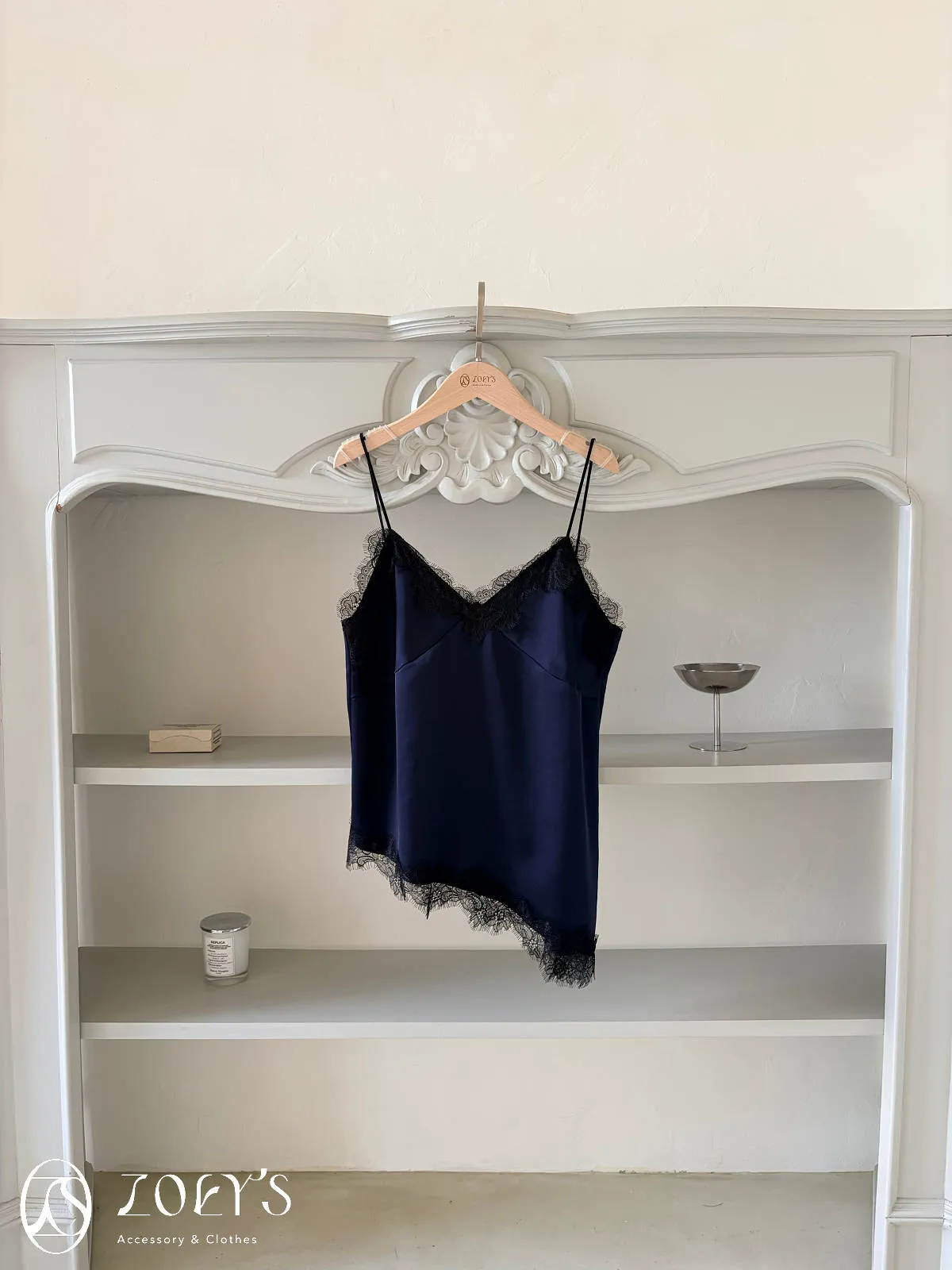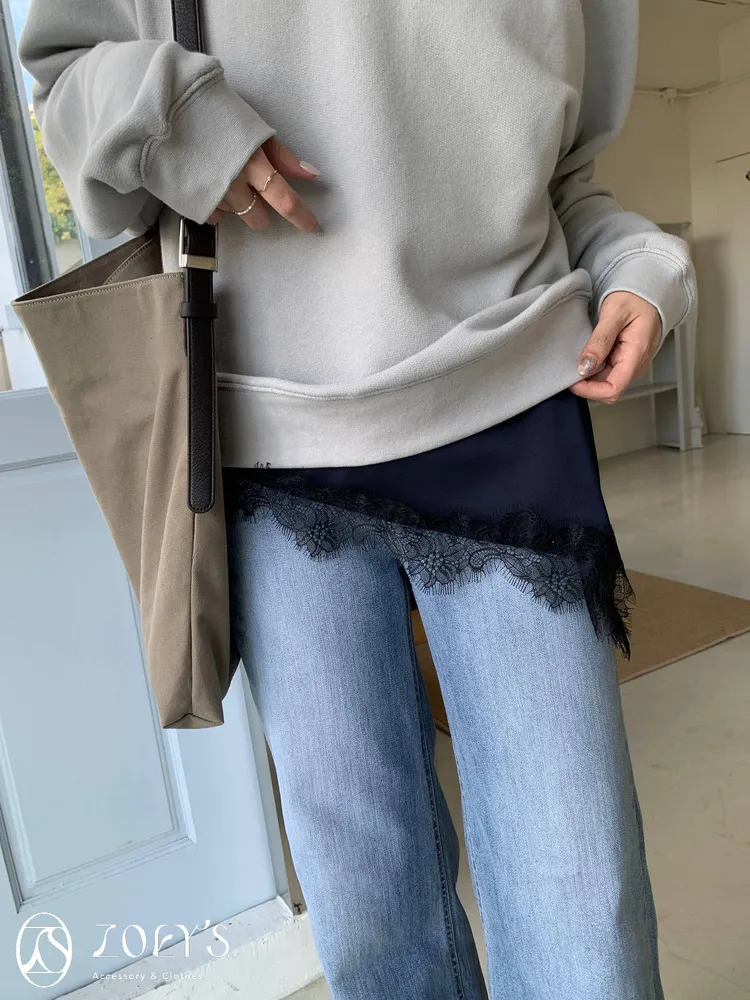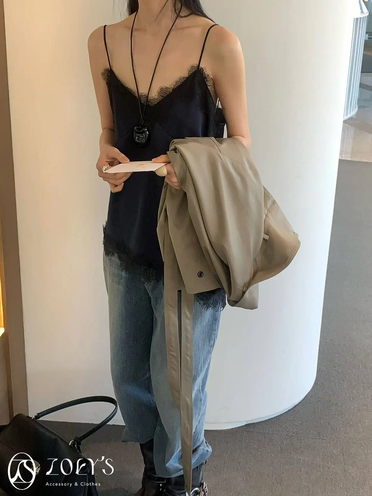 正韓 時髦斜蕾絲細肩背心 深藍/白