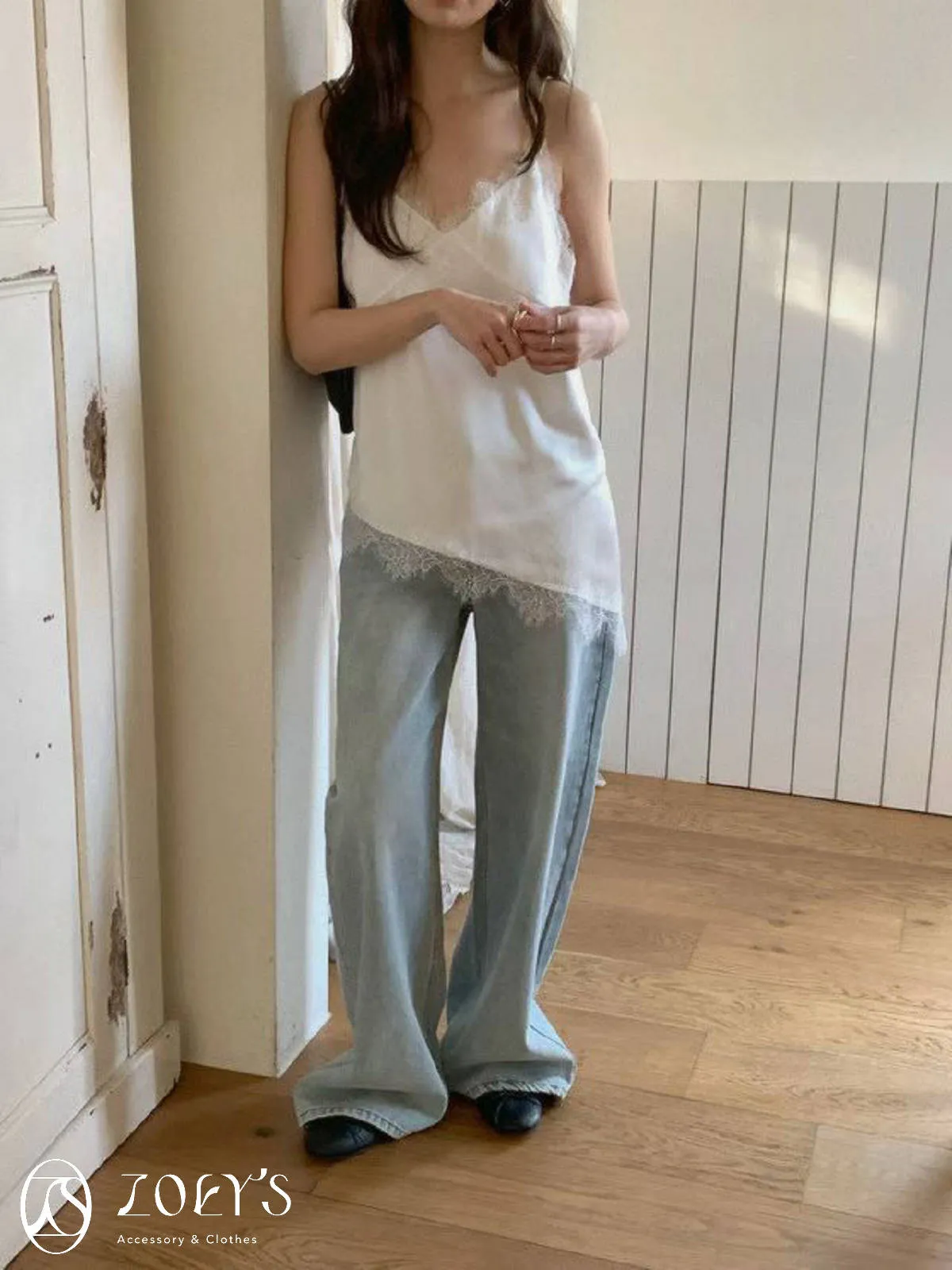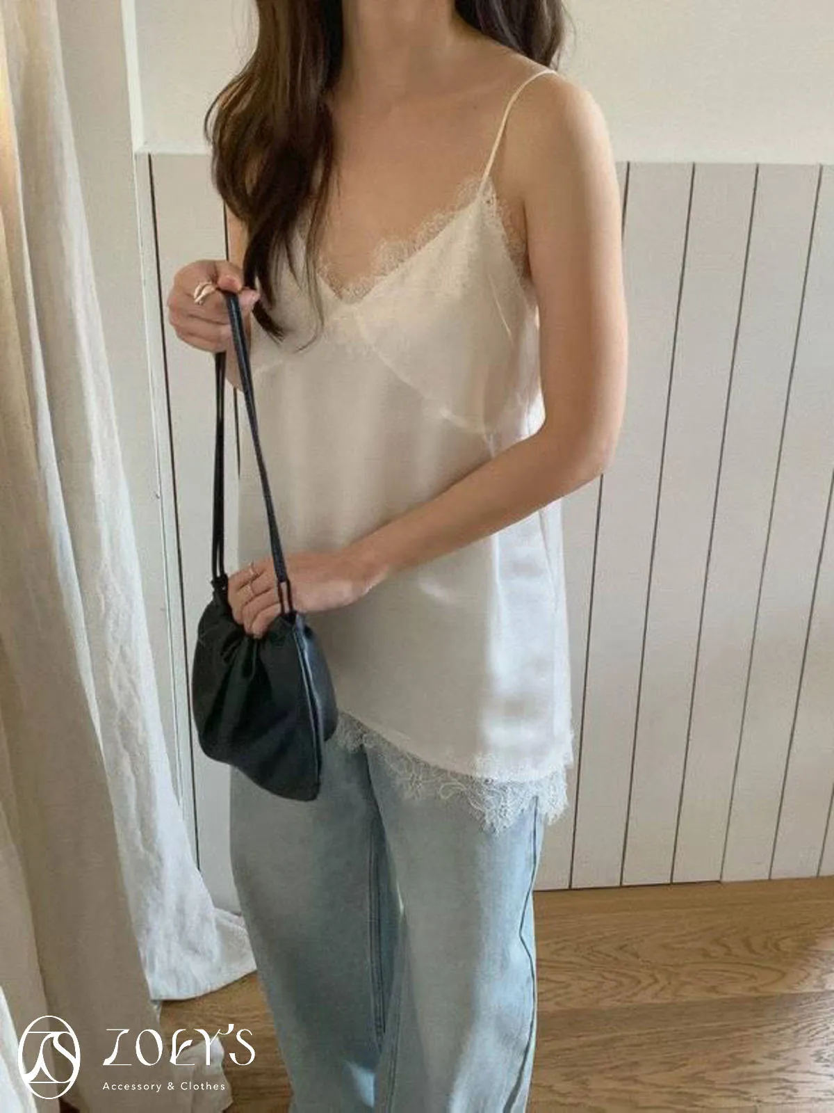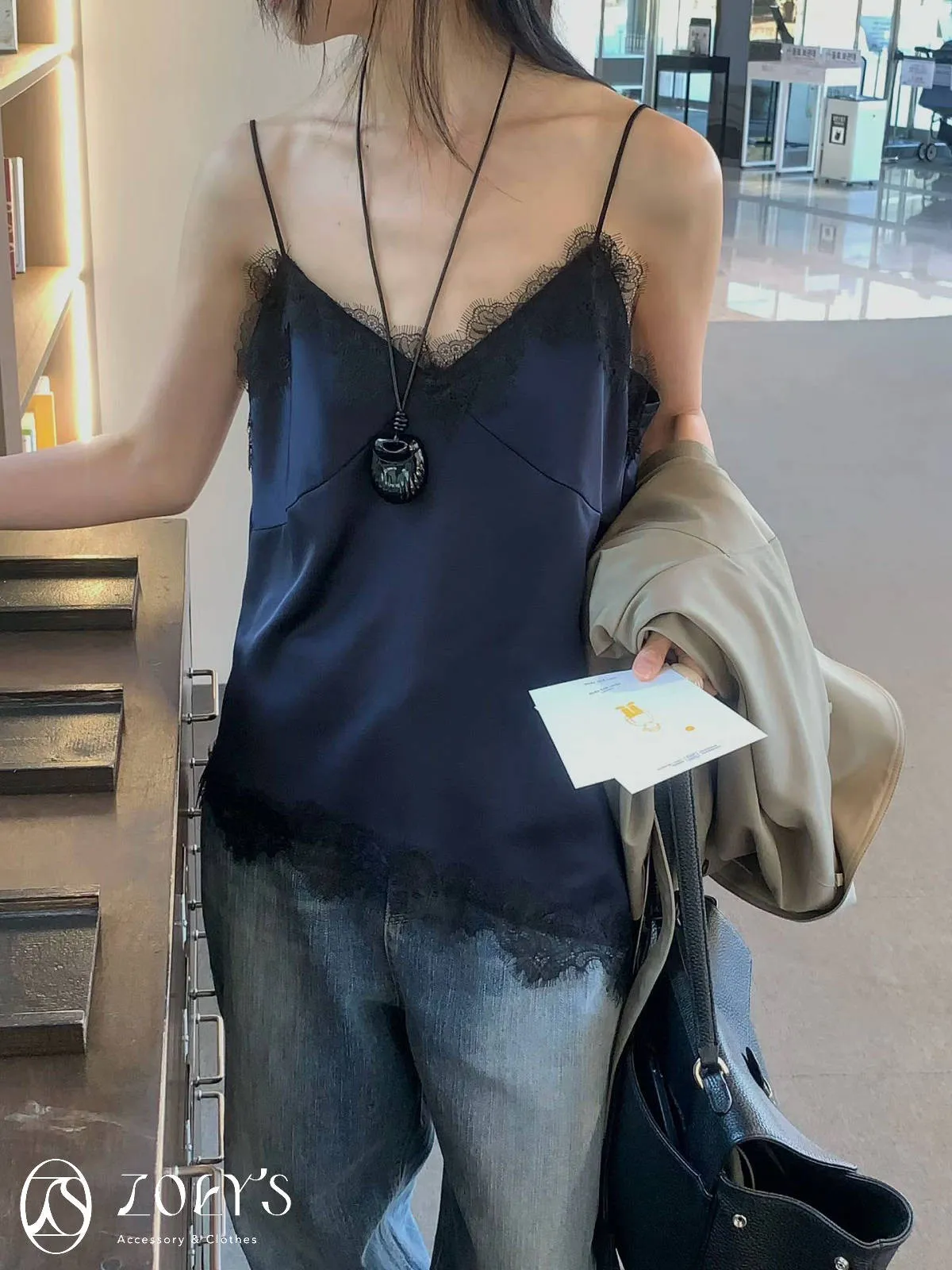 正韓 時髦斜蕾絲細肩背心 深藍/白