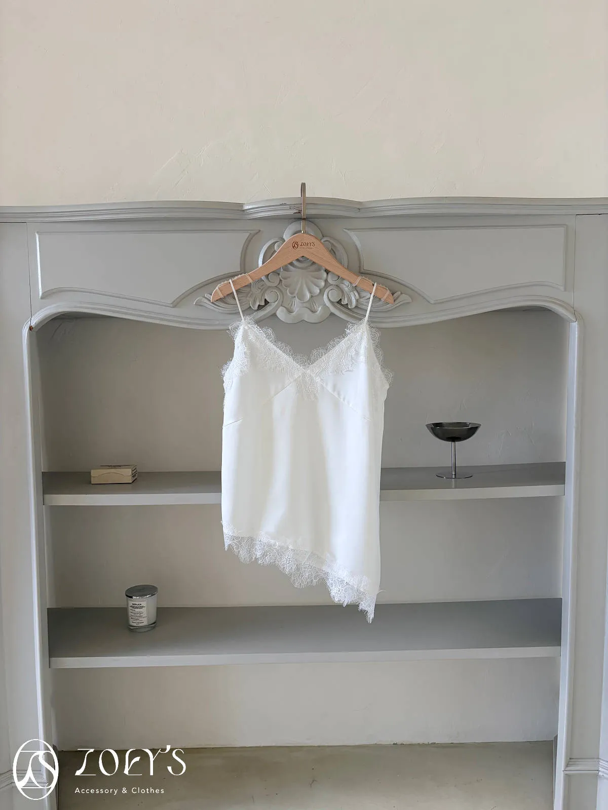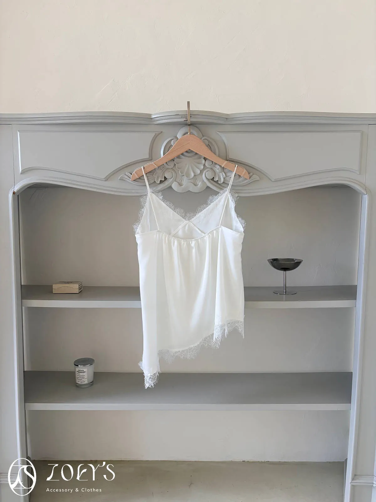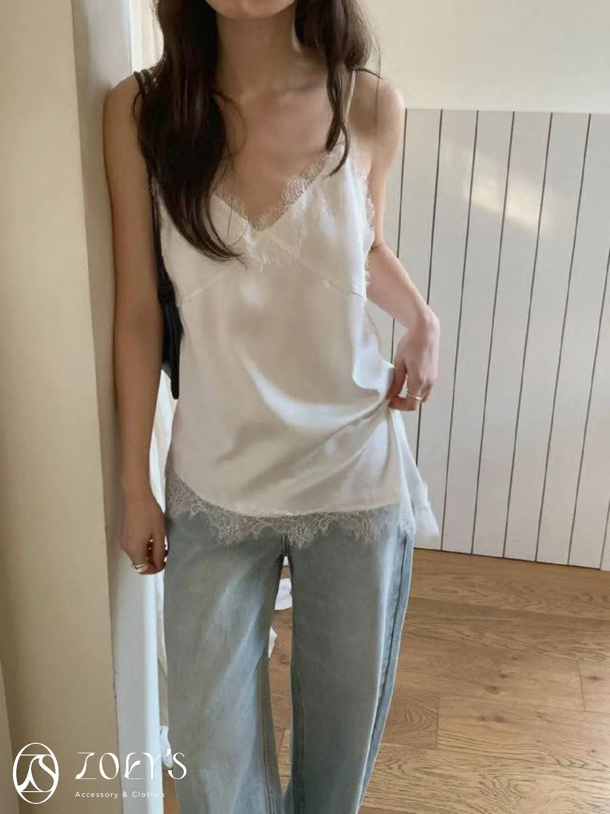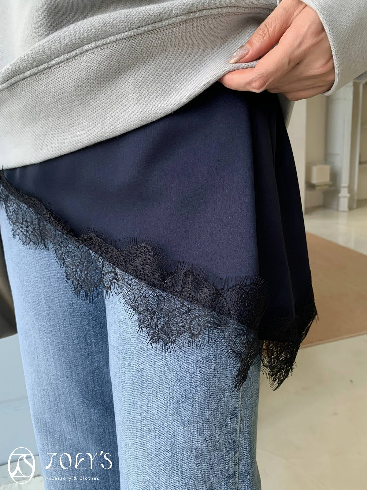 正韓 時髦斜蕾絲細肩背心 深藍/白