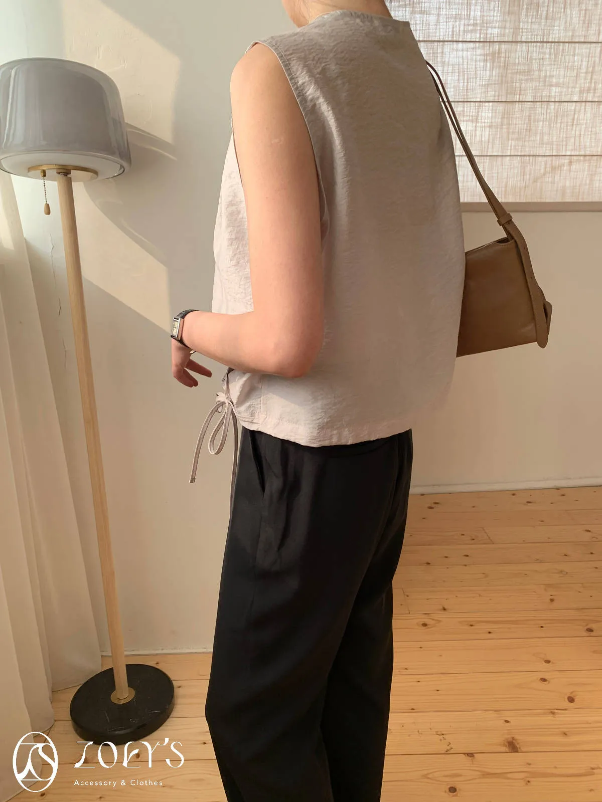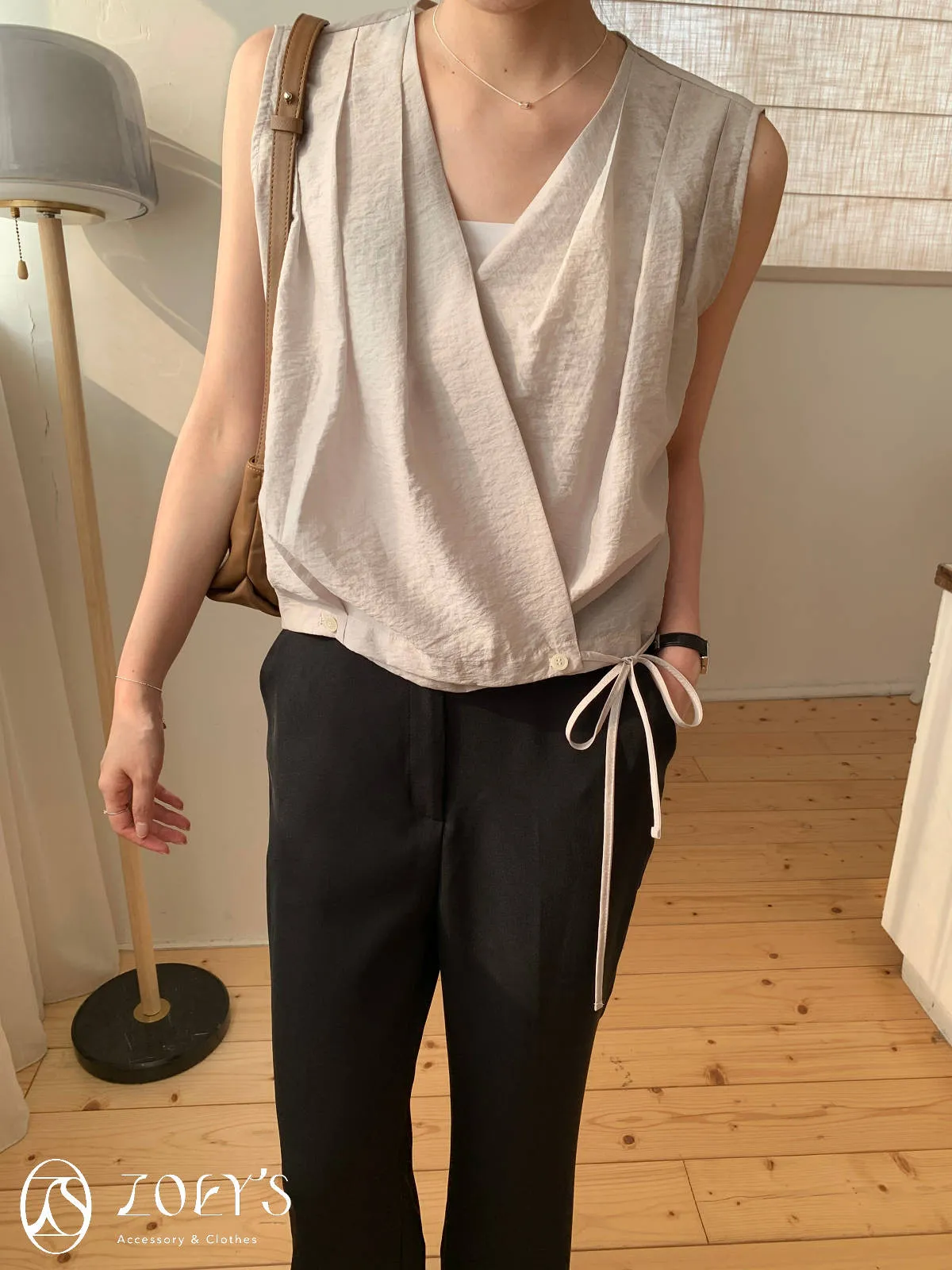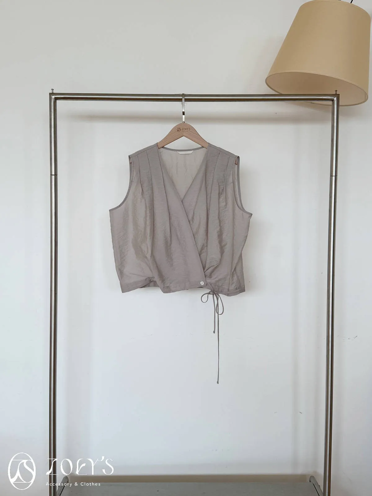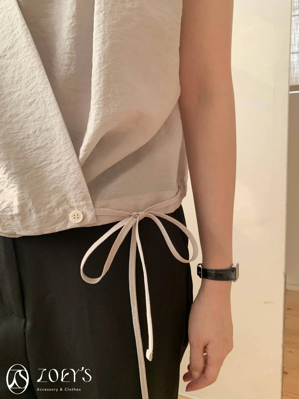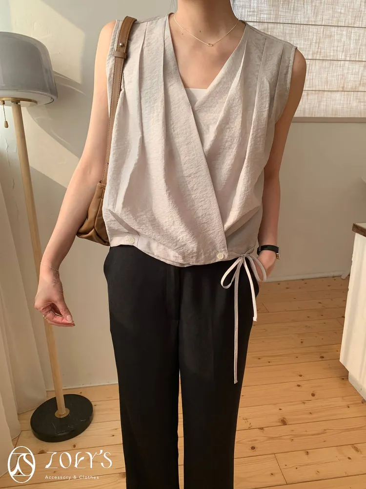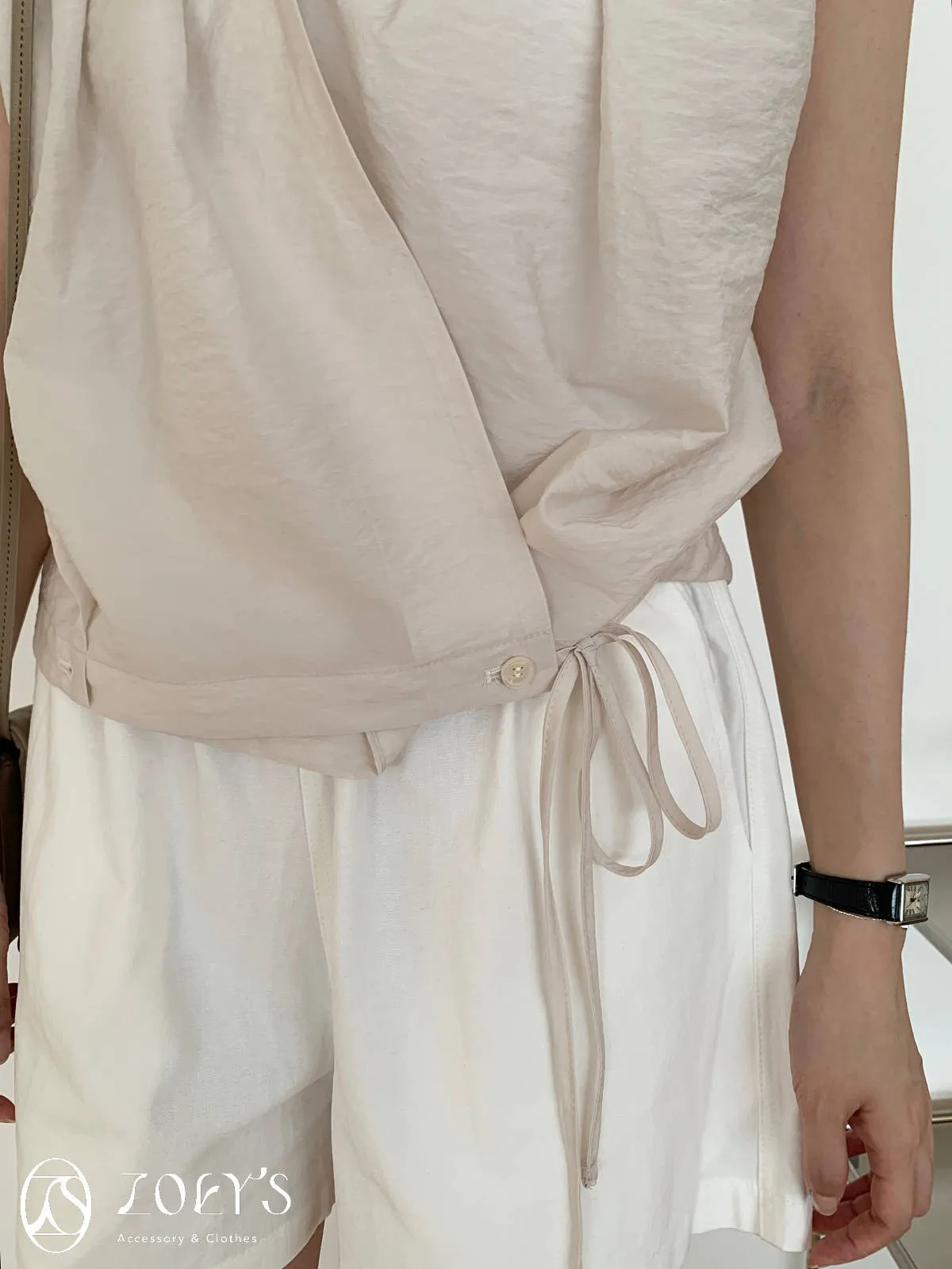 正韓 側扣綁繩無袖襯衫 裸米/灰