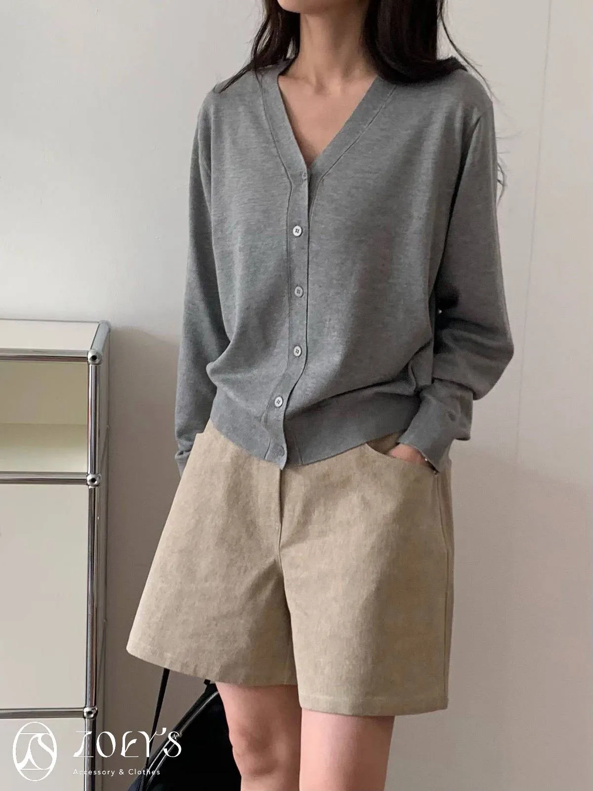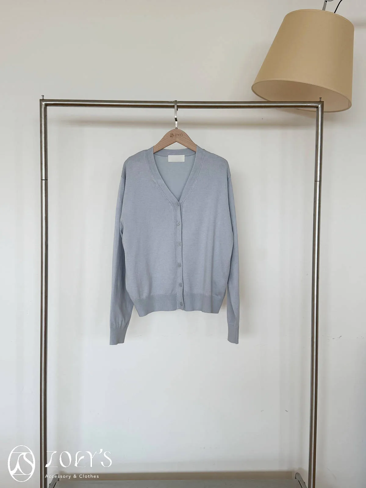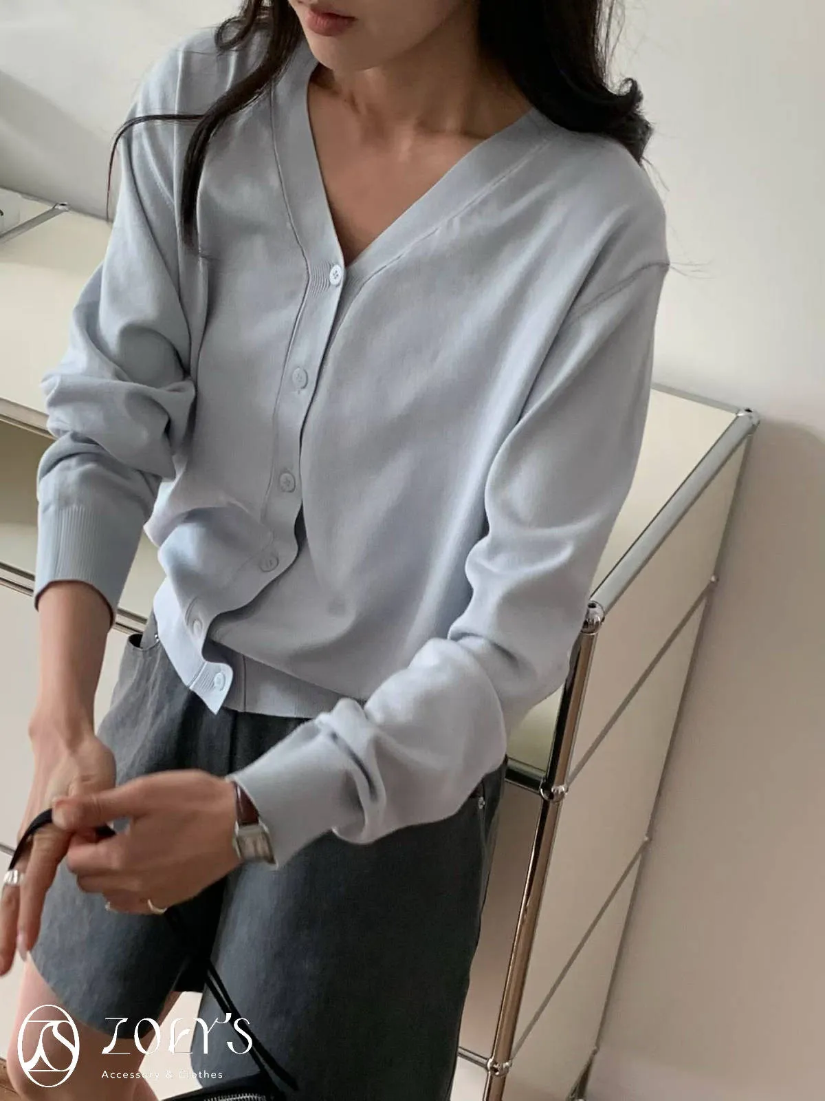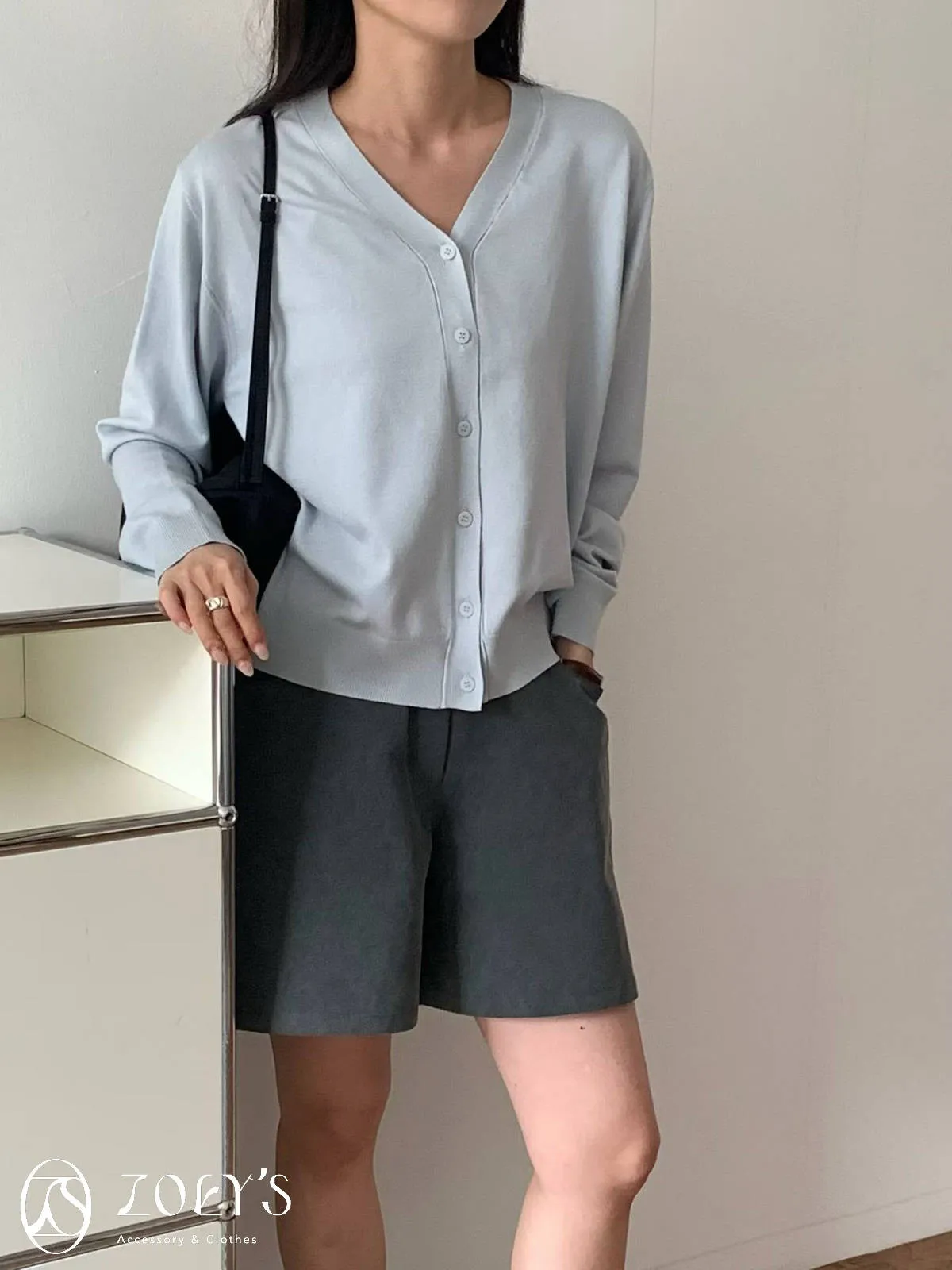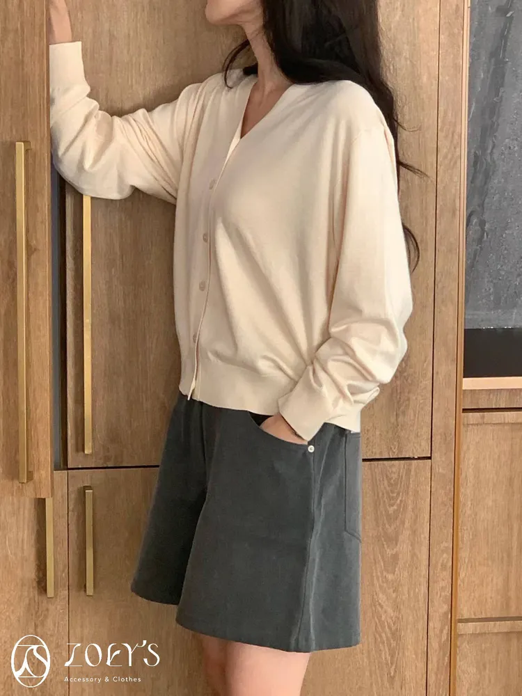 正韓 涼感薄織V領開襟衫 水藍/奶油/灰