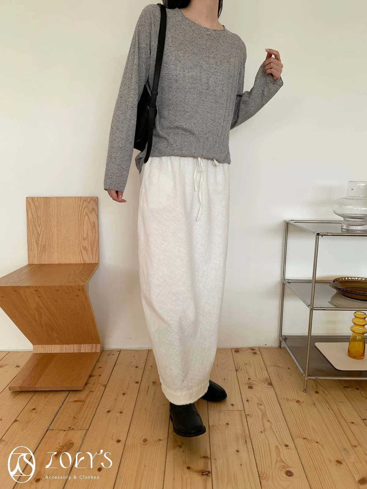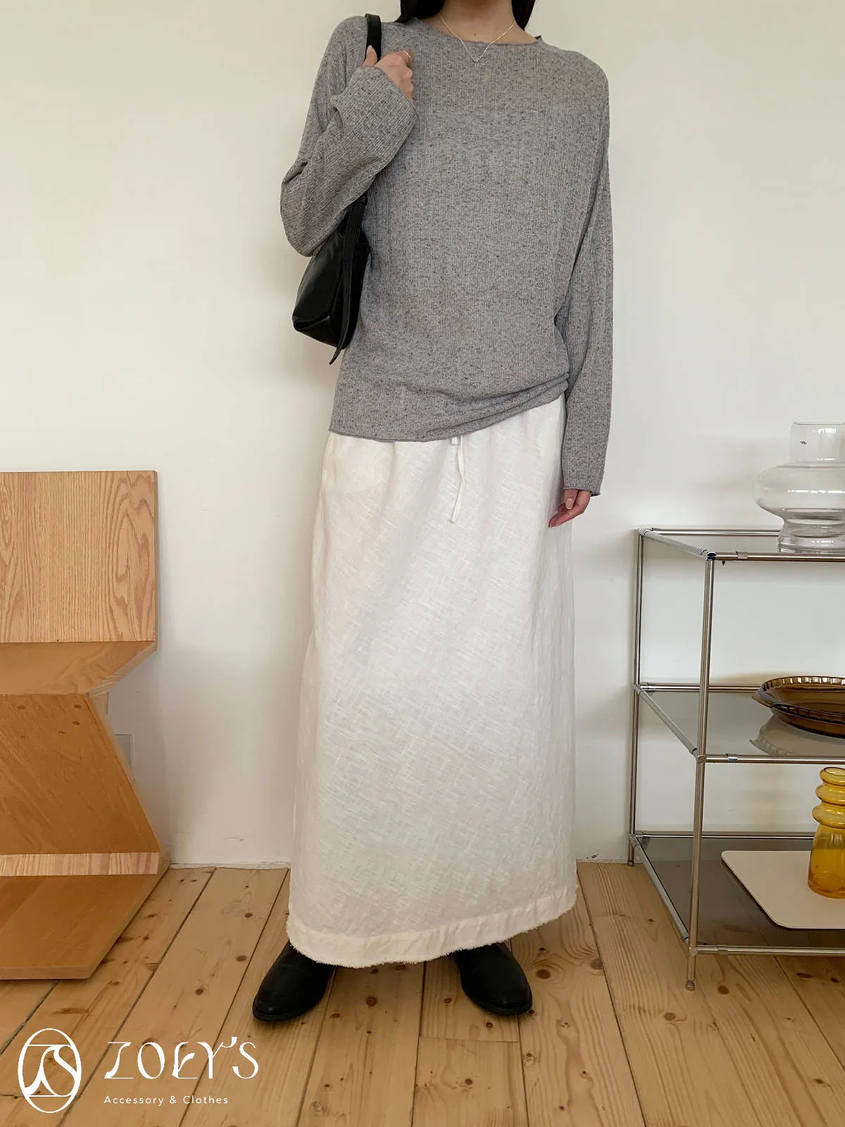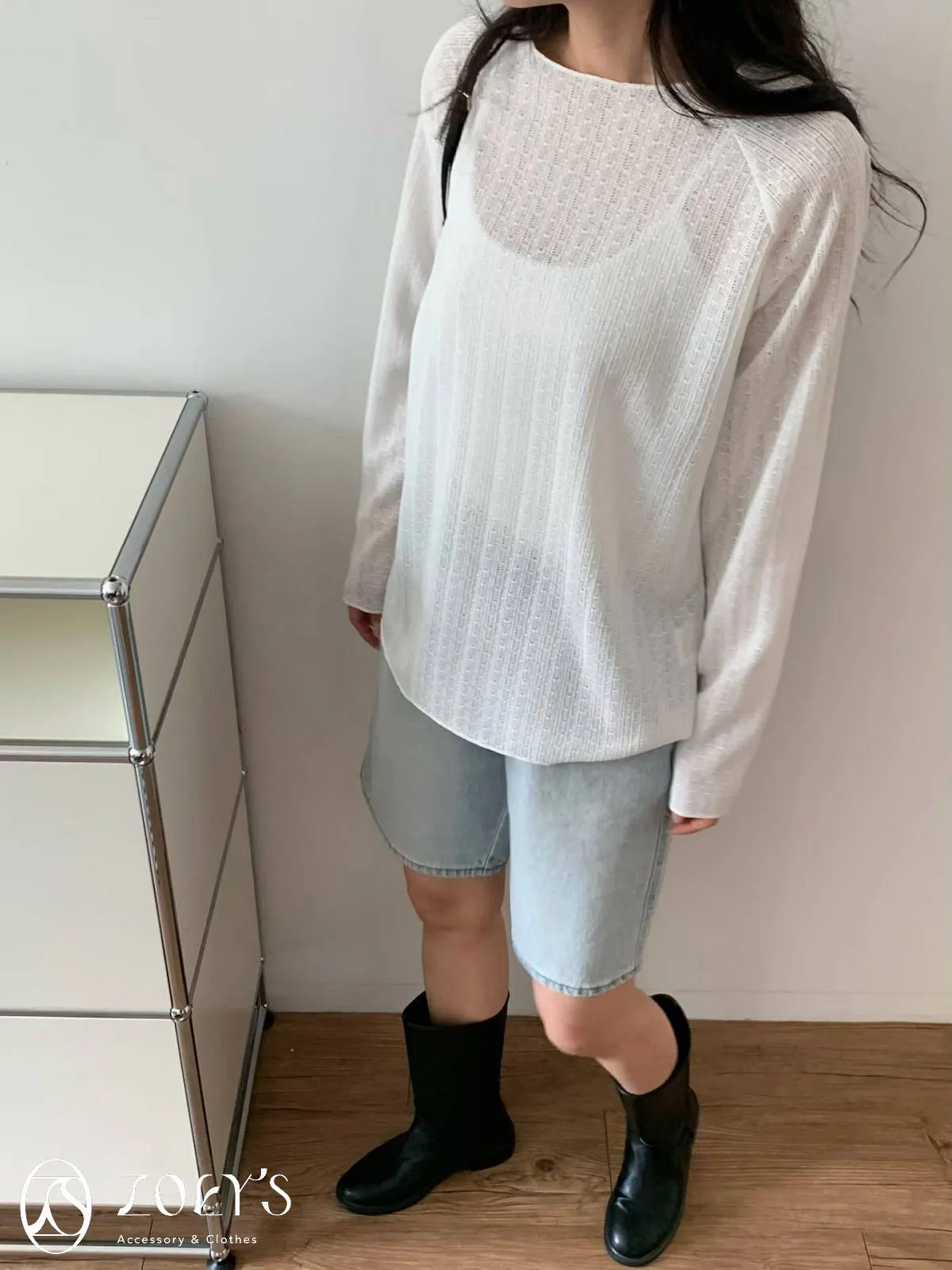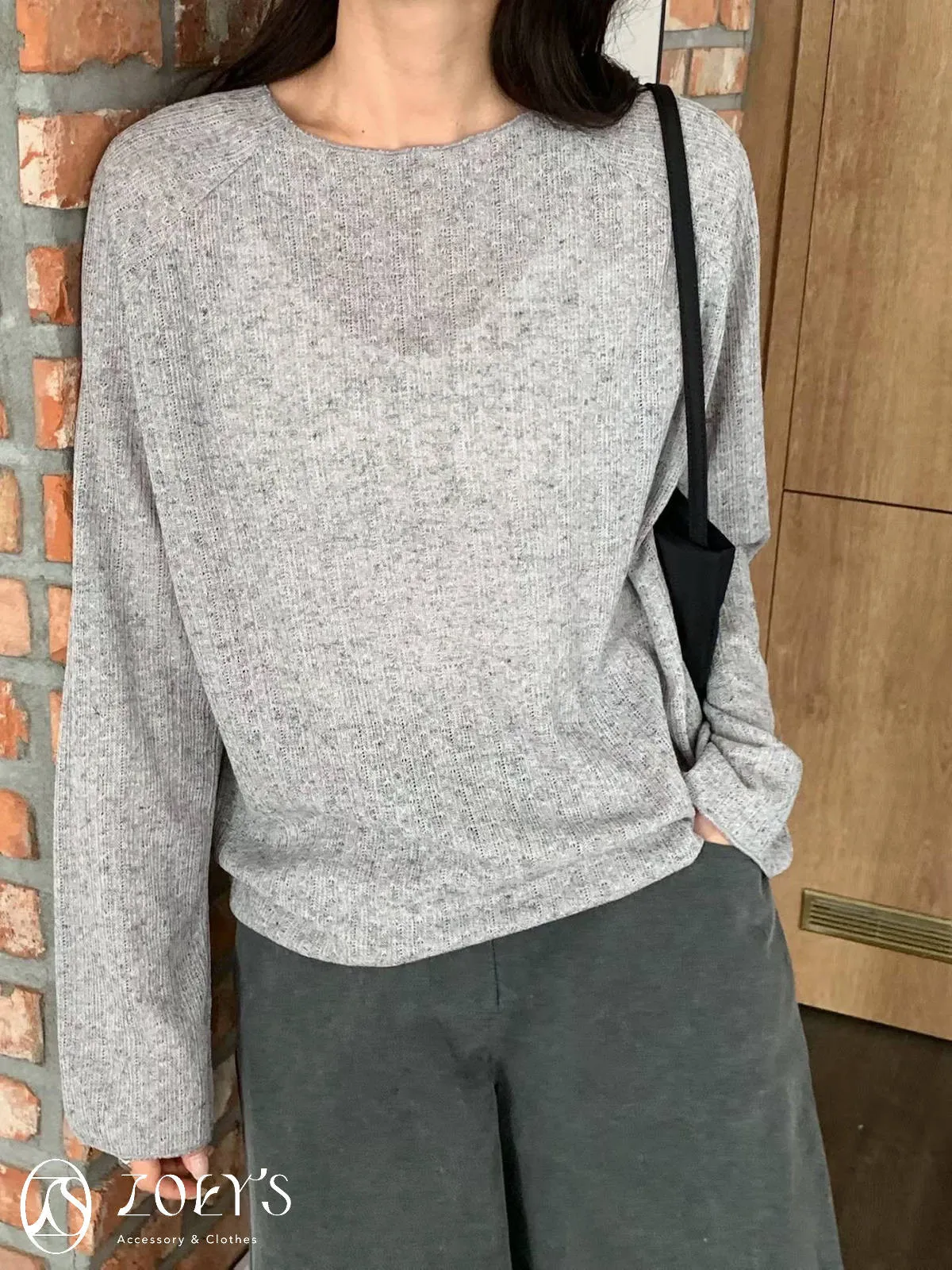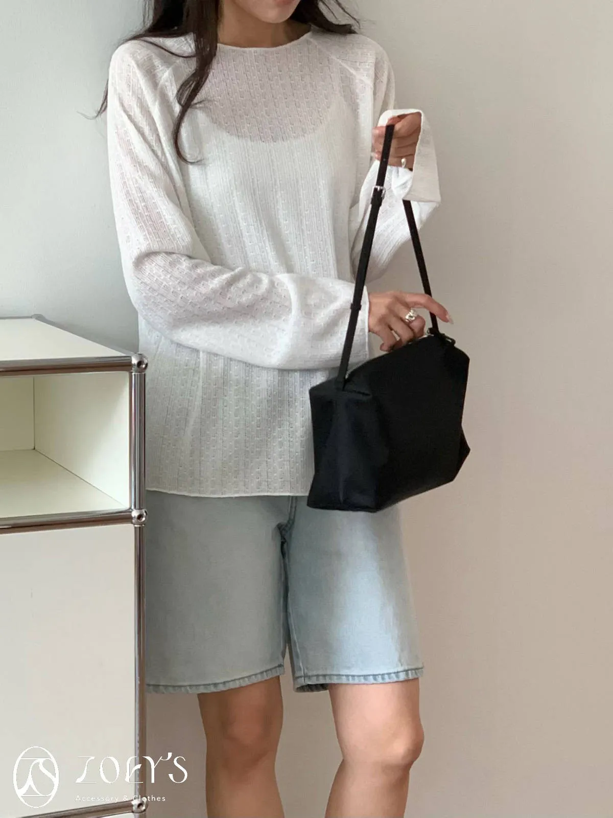 正韓 法式簍空斜肩袖上衣 灰/白