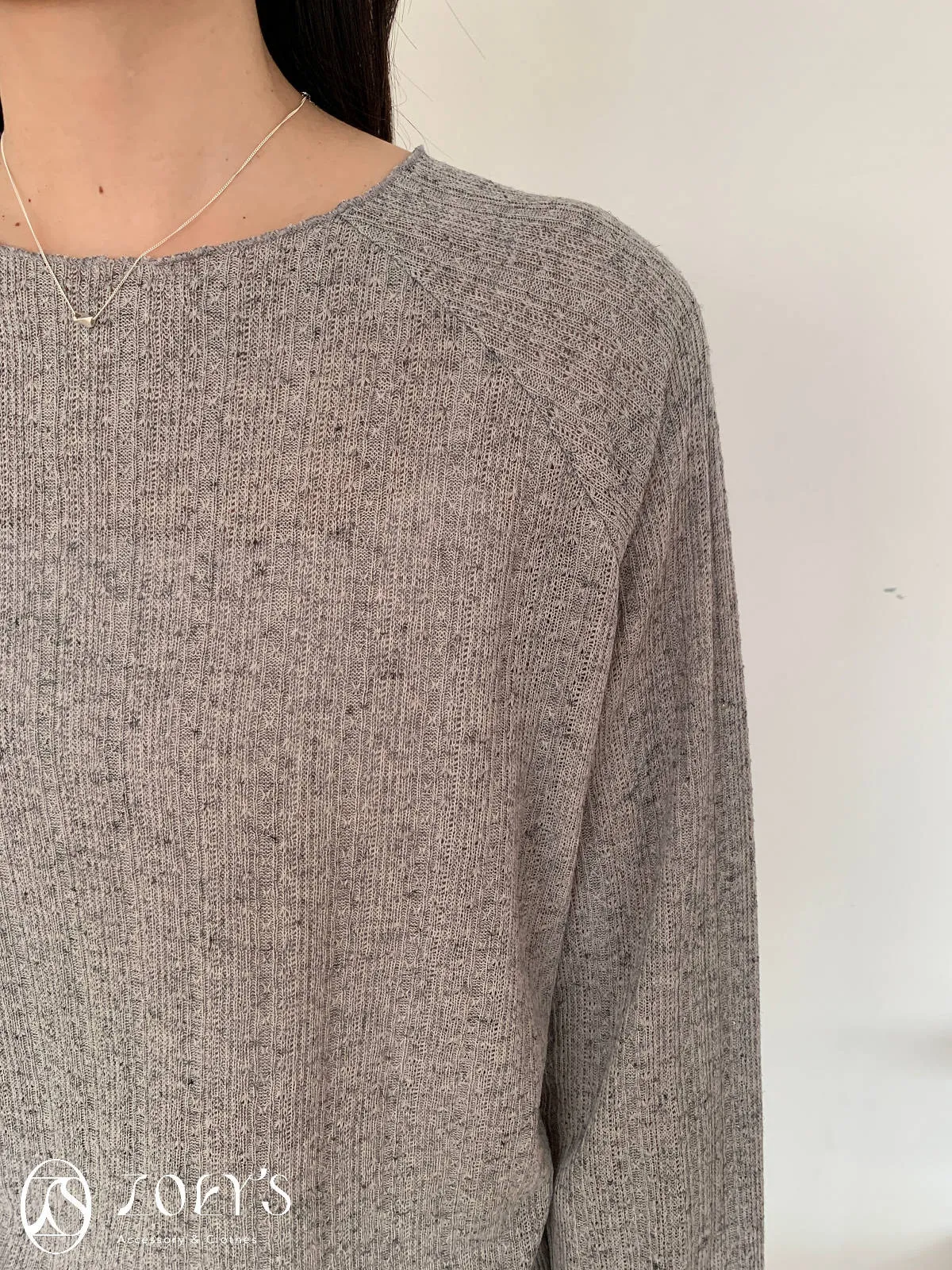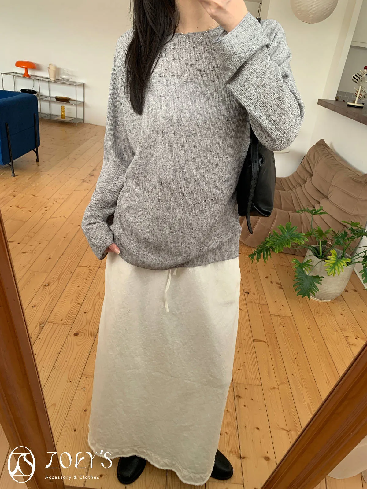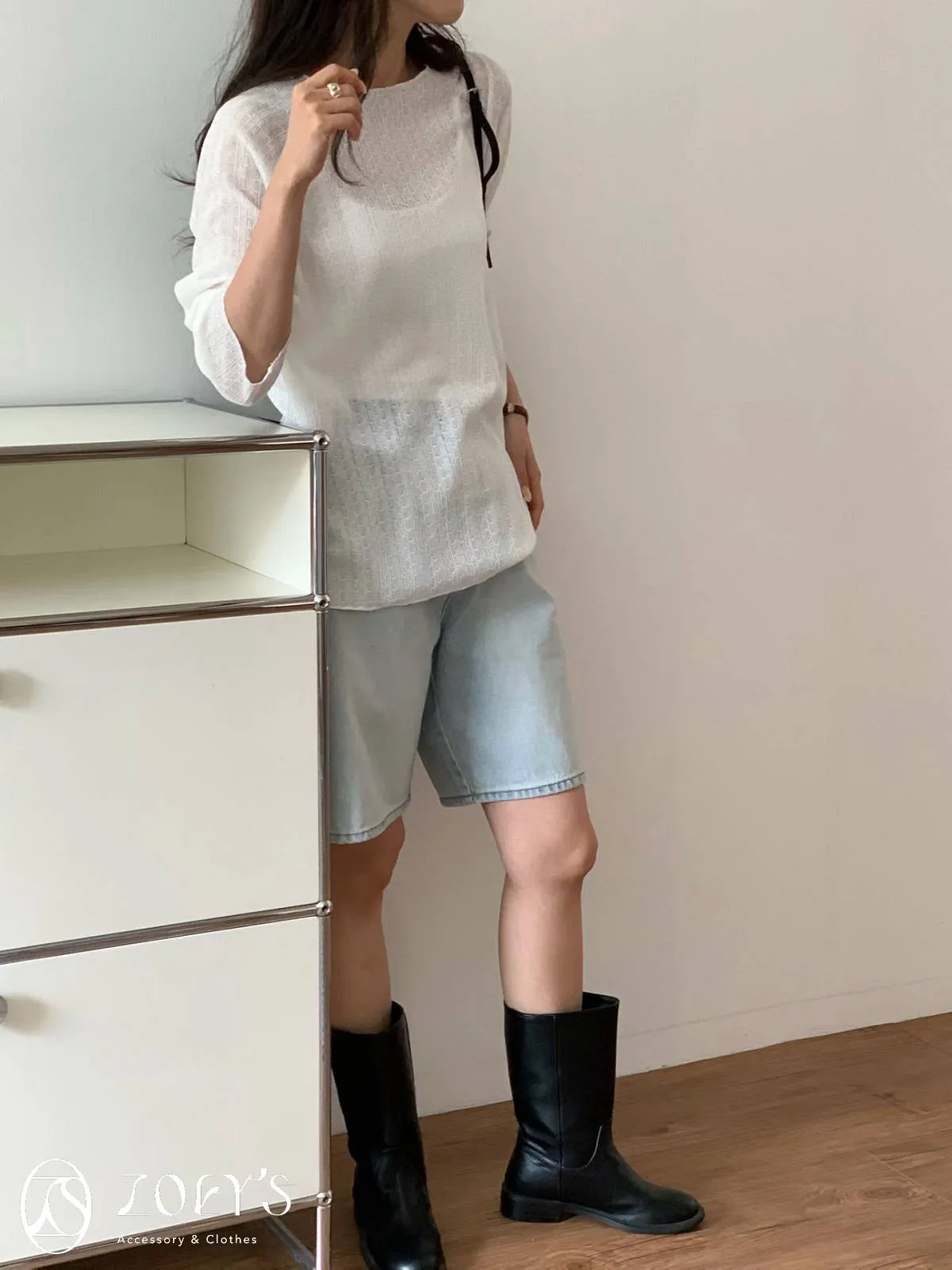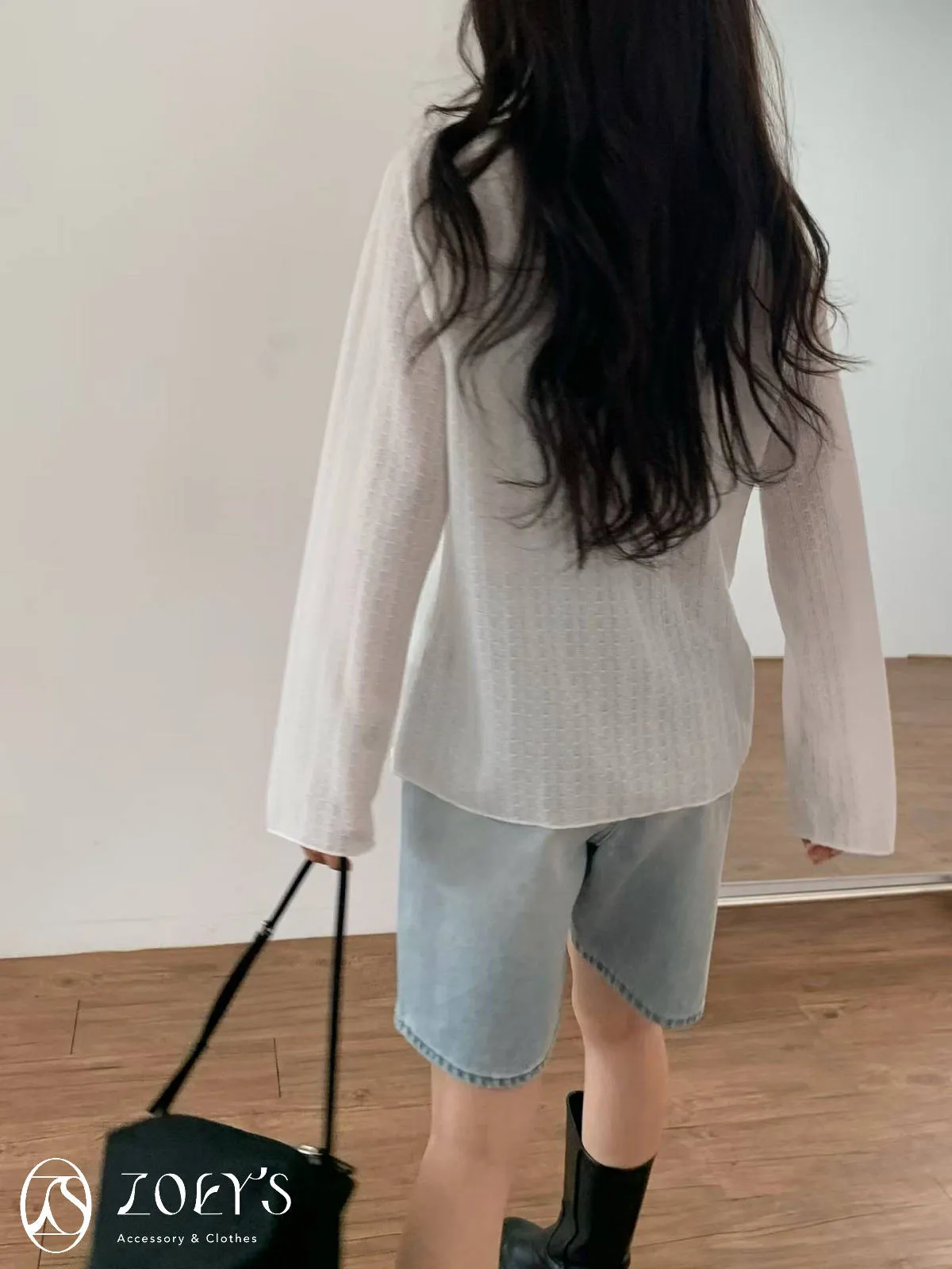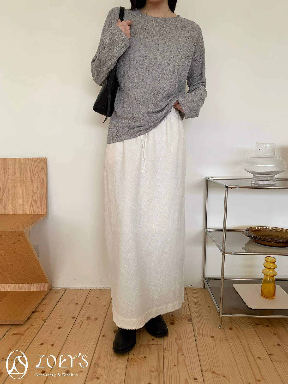 正韓 法式簍空斜肩袖上衣 灰/白
