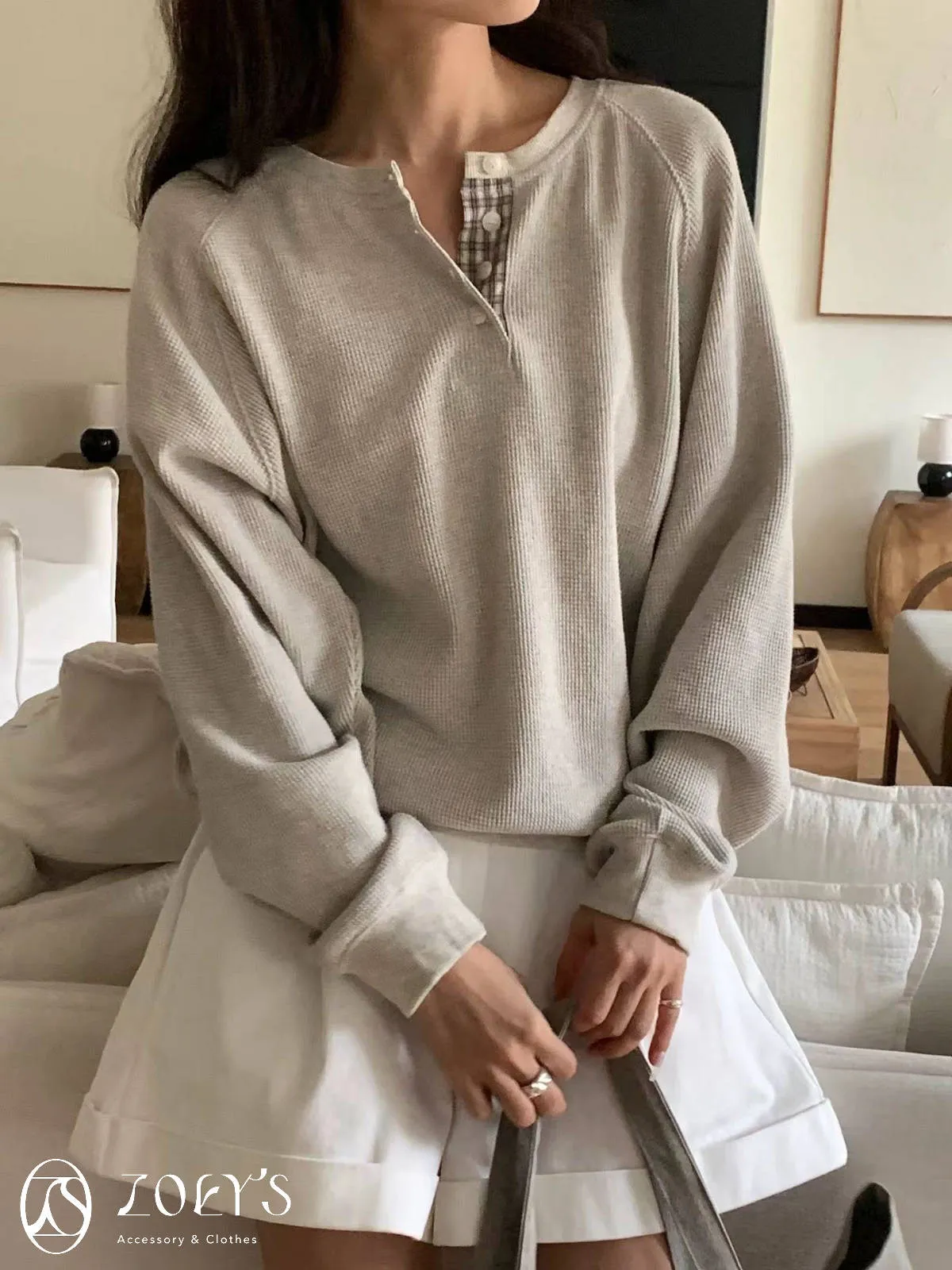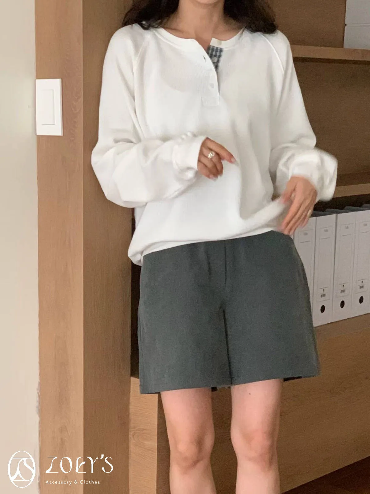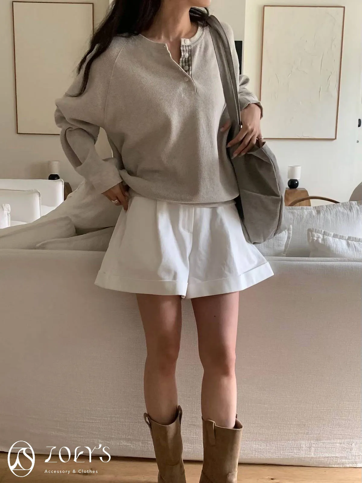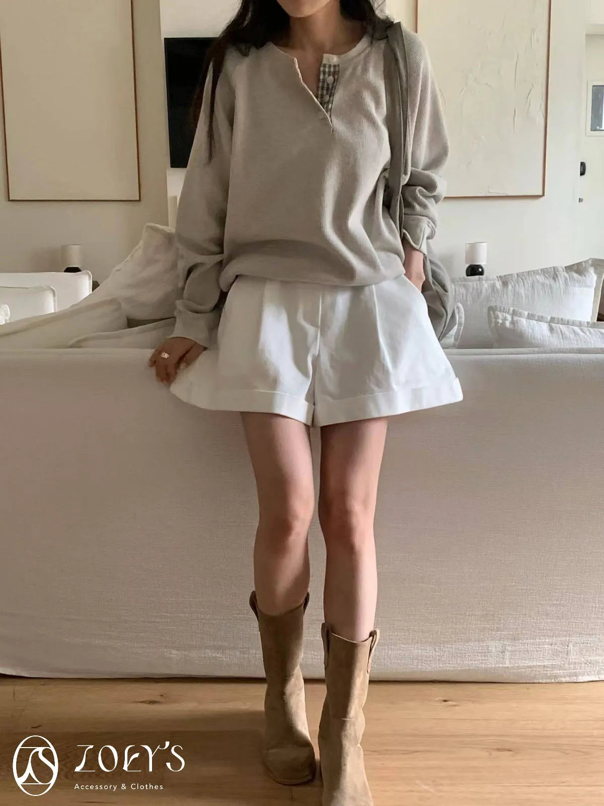 斜肩袖寬鬆版型配牛仔短褲+中筒靴look超好看!