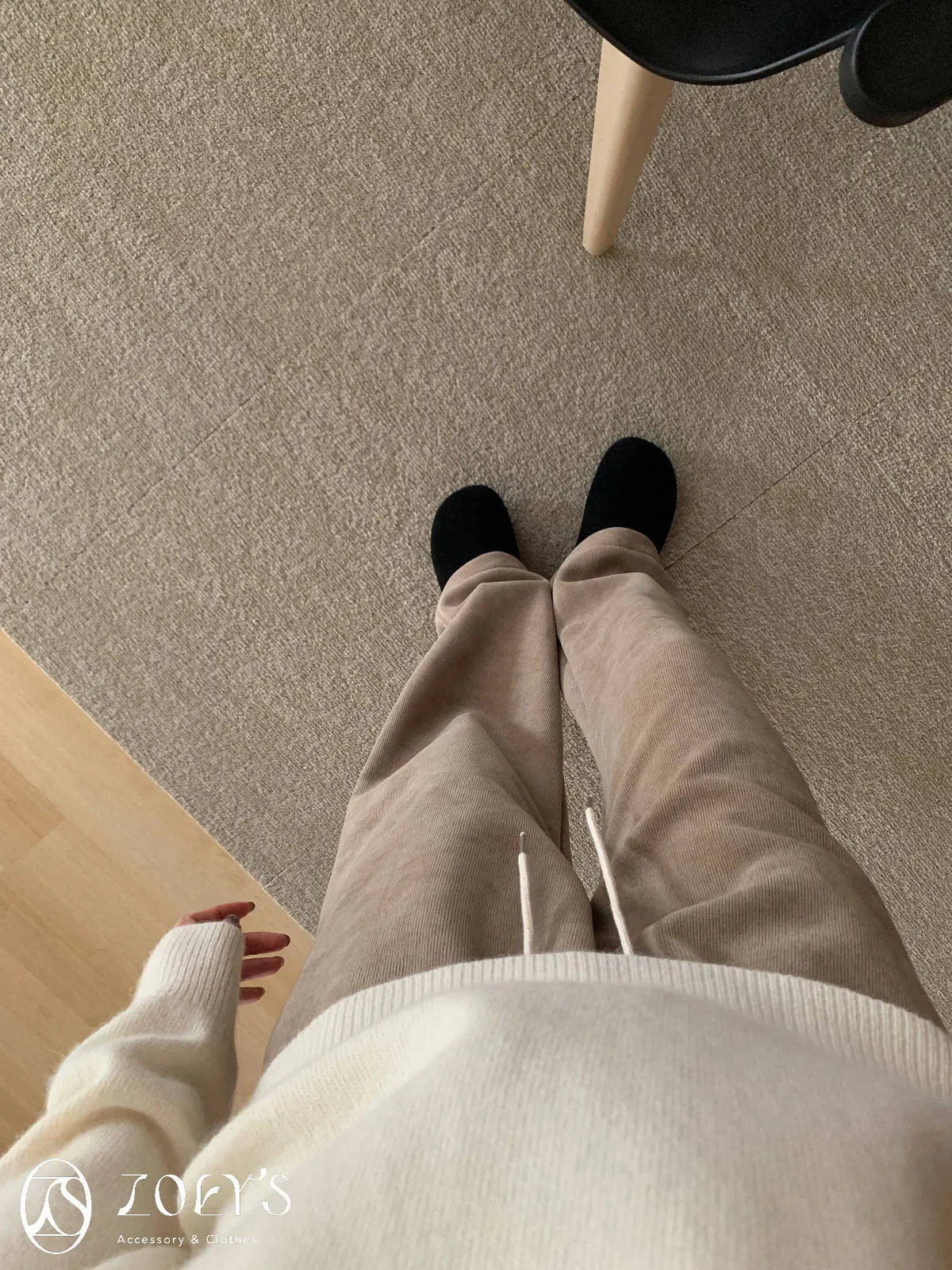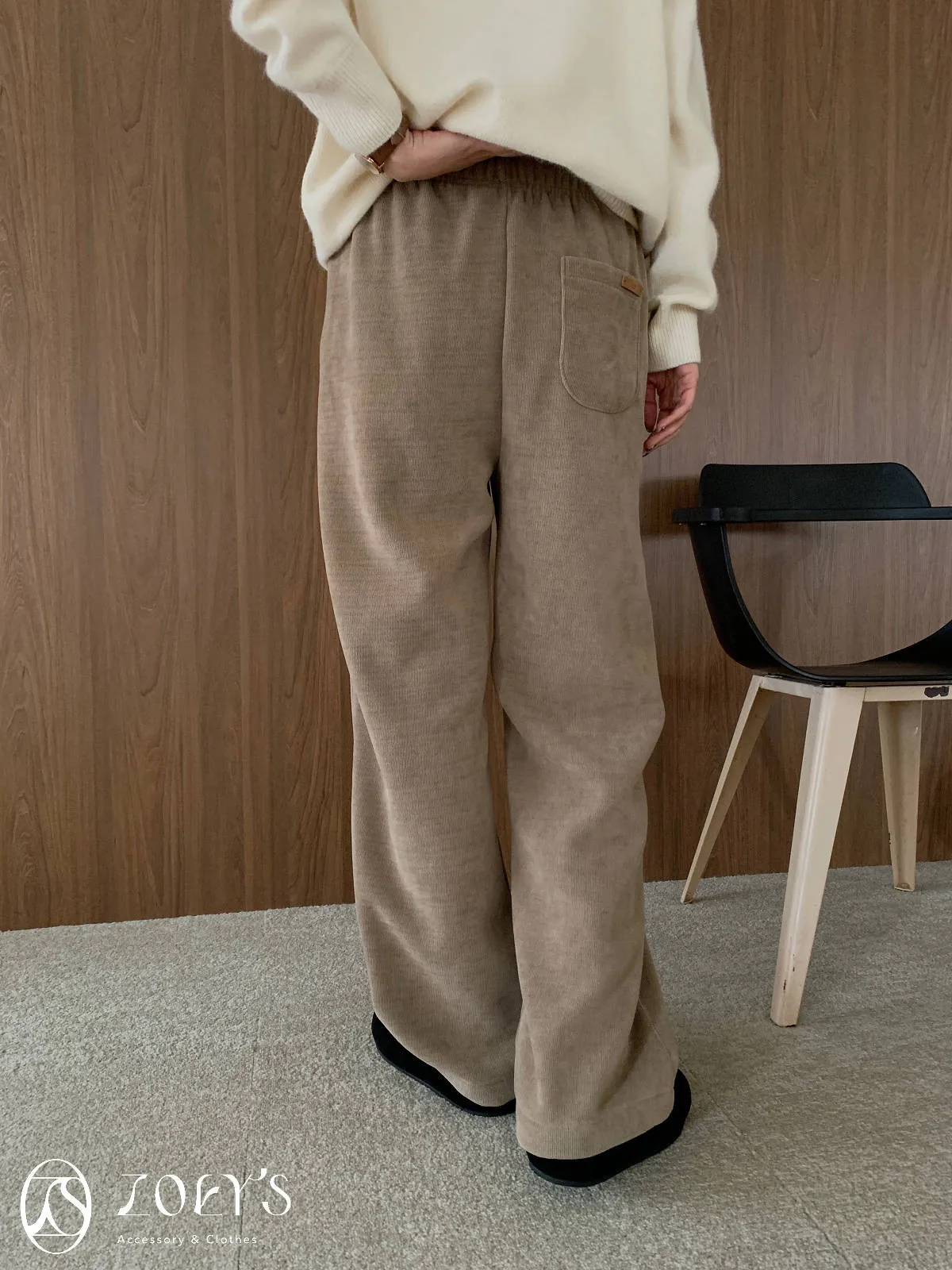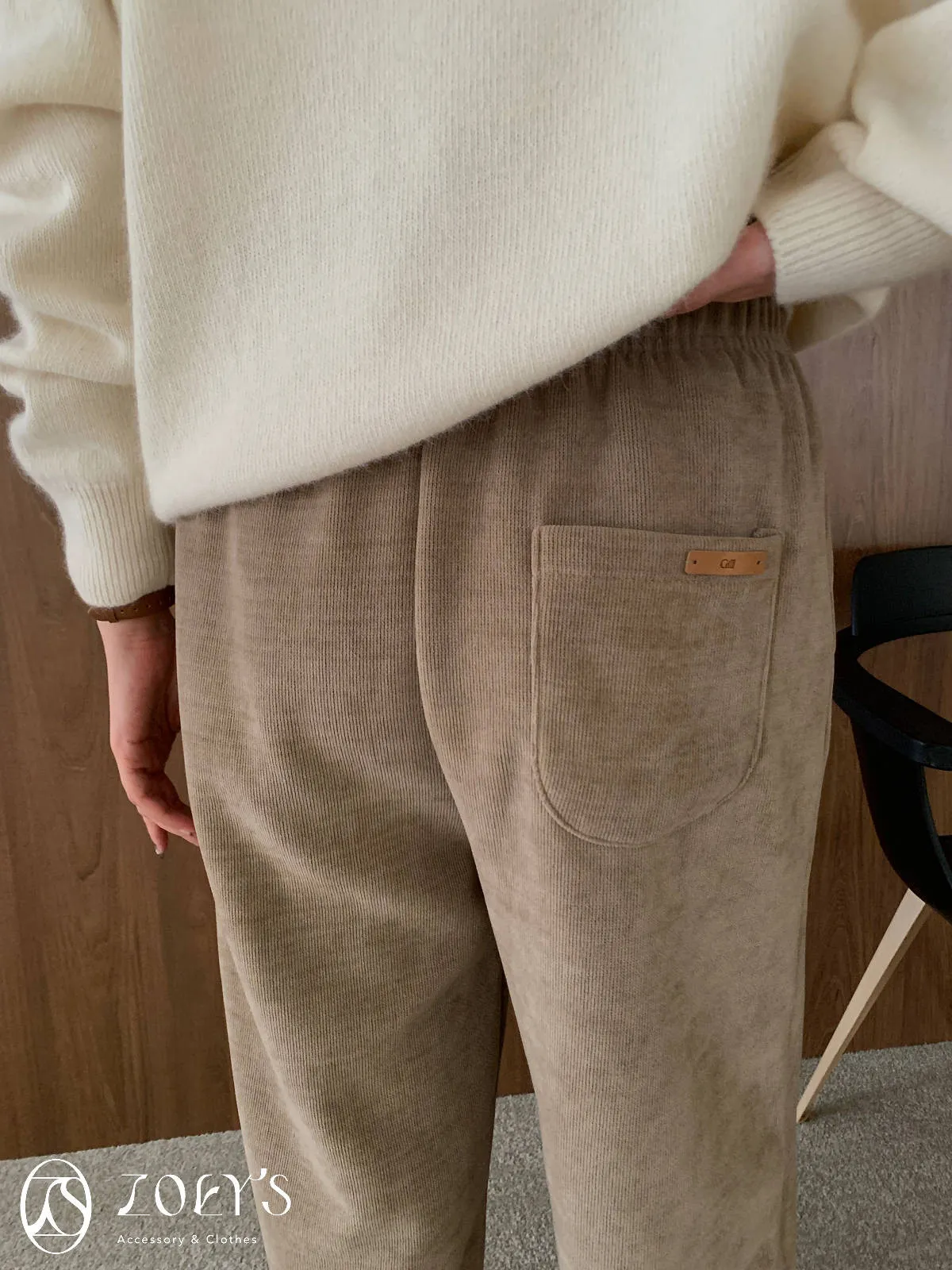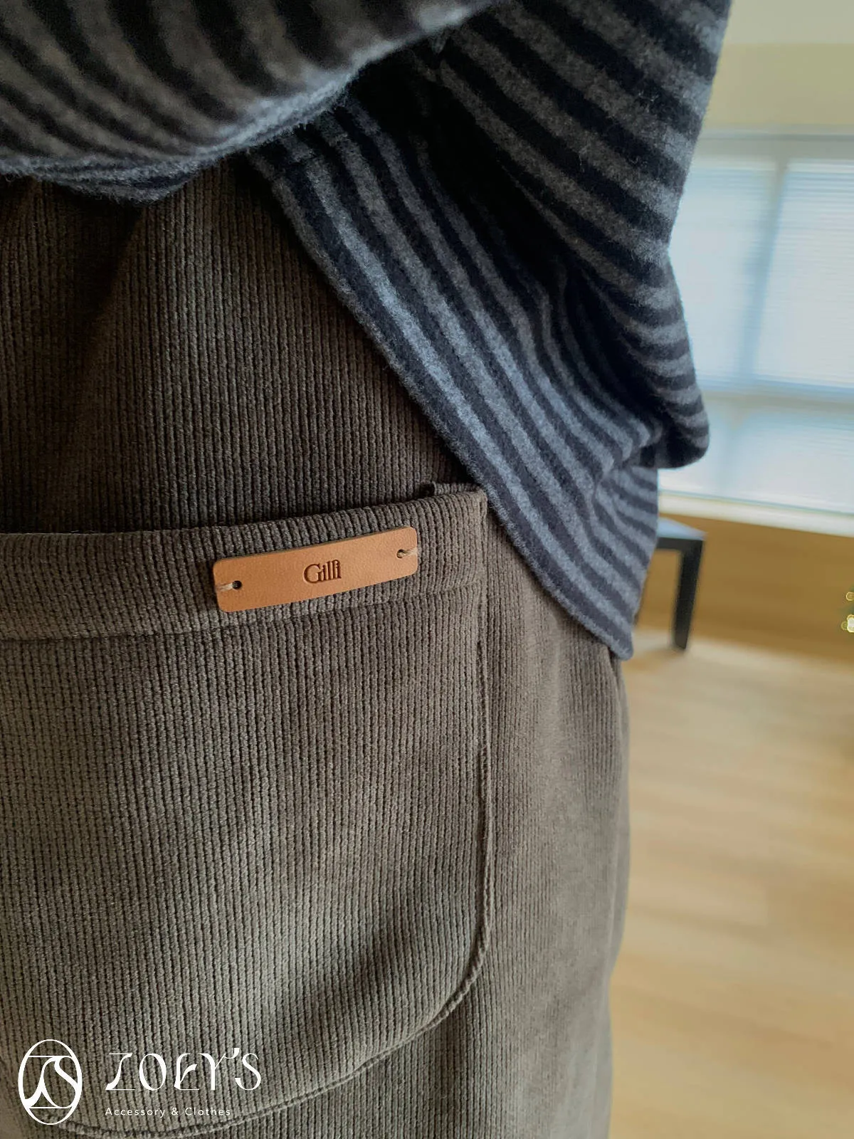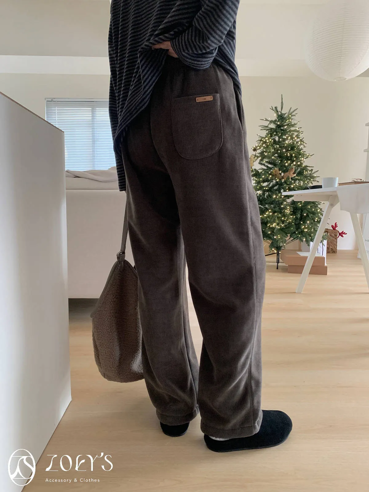 正韓 口袋小皮標療癒厚棉長褲 深灰綠/卡其