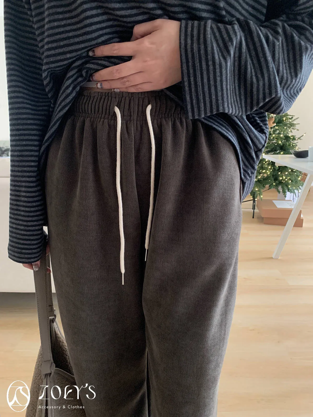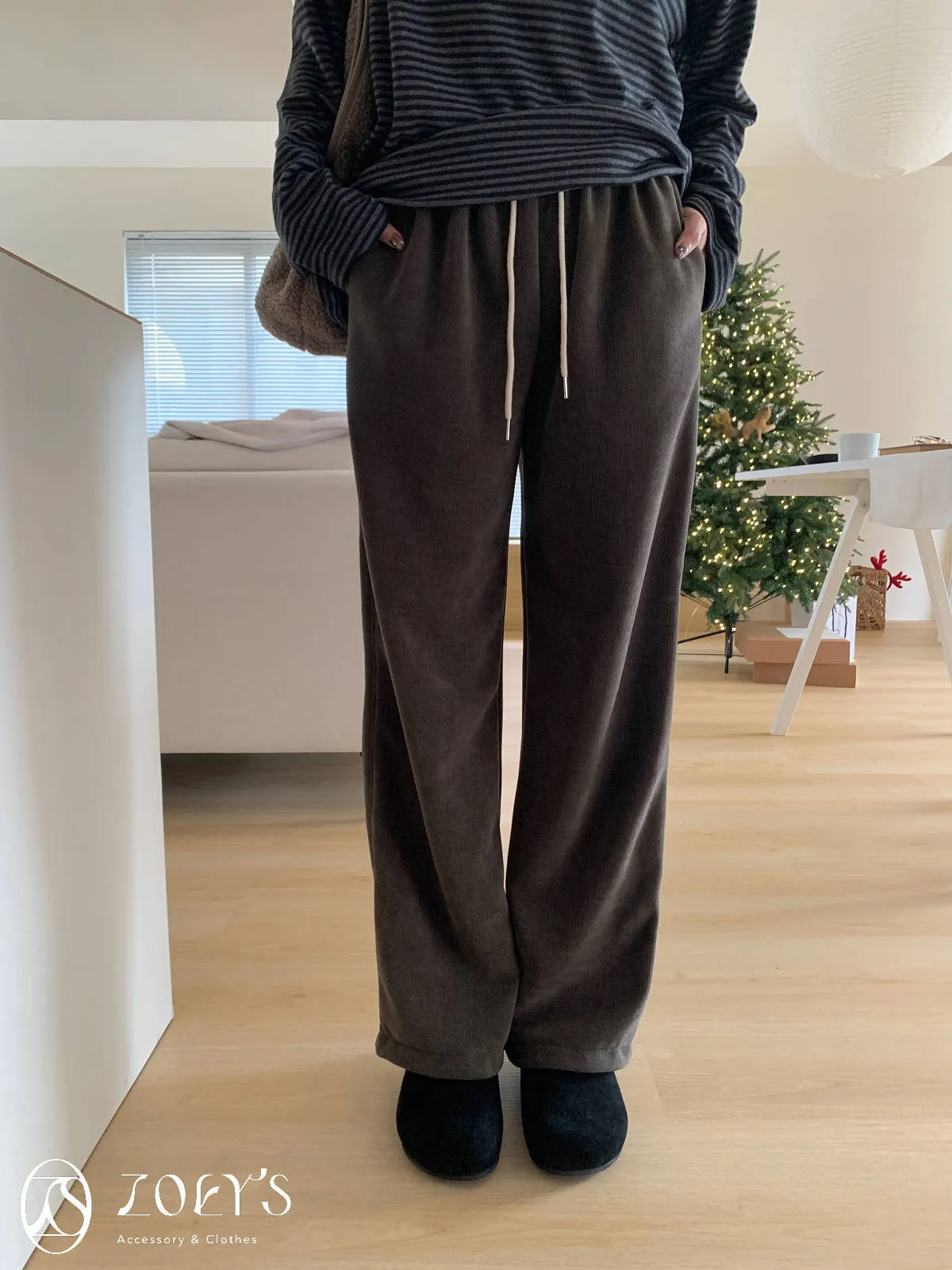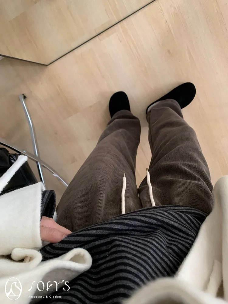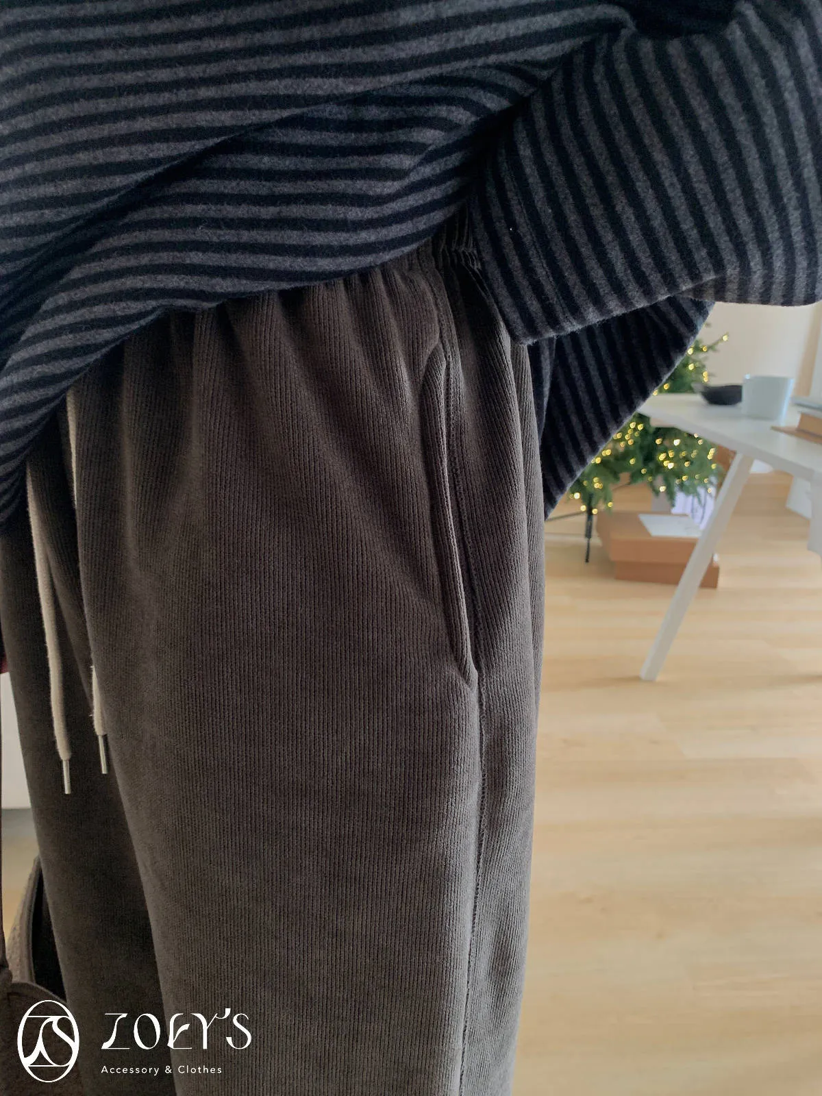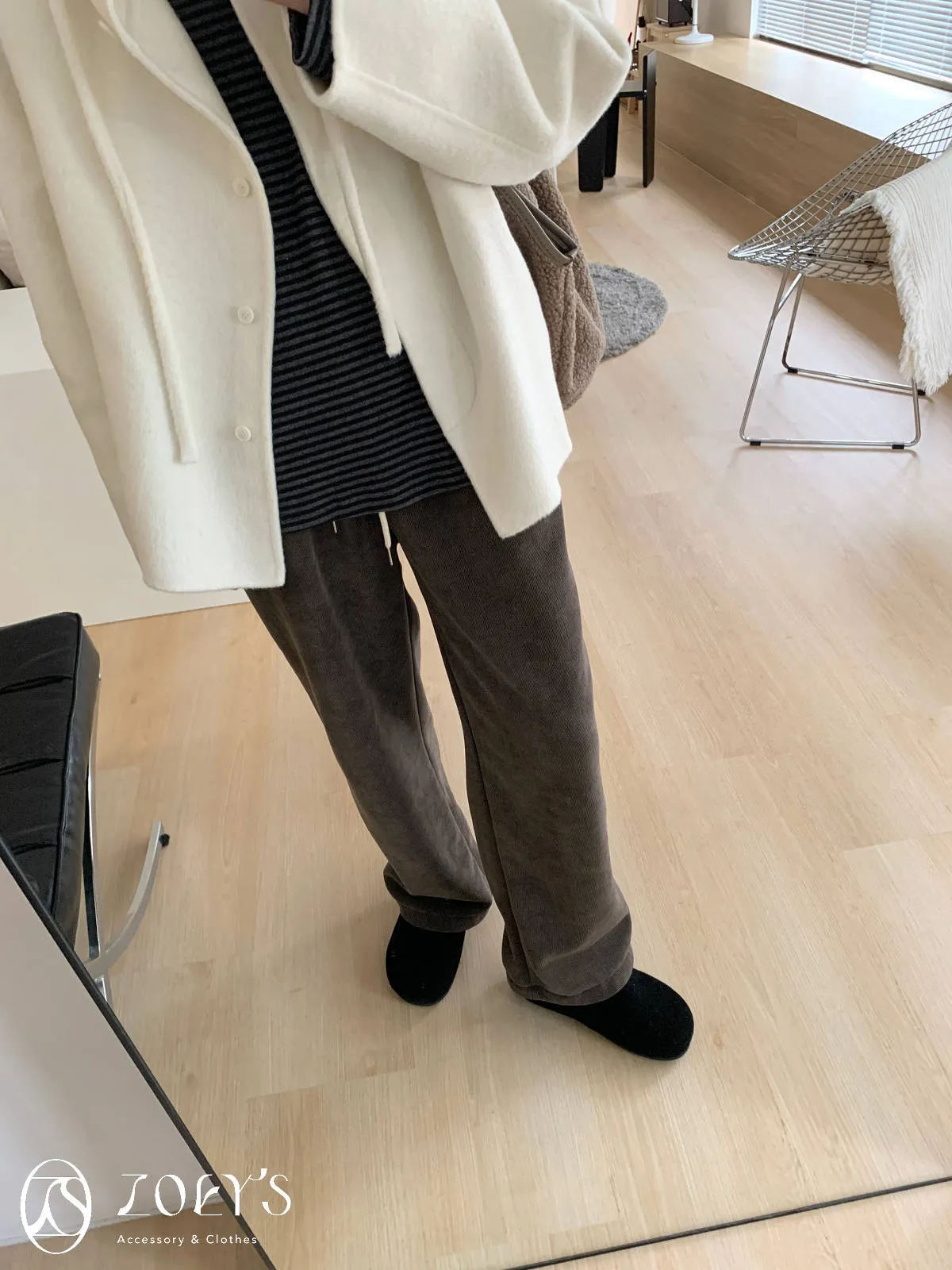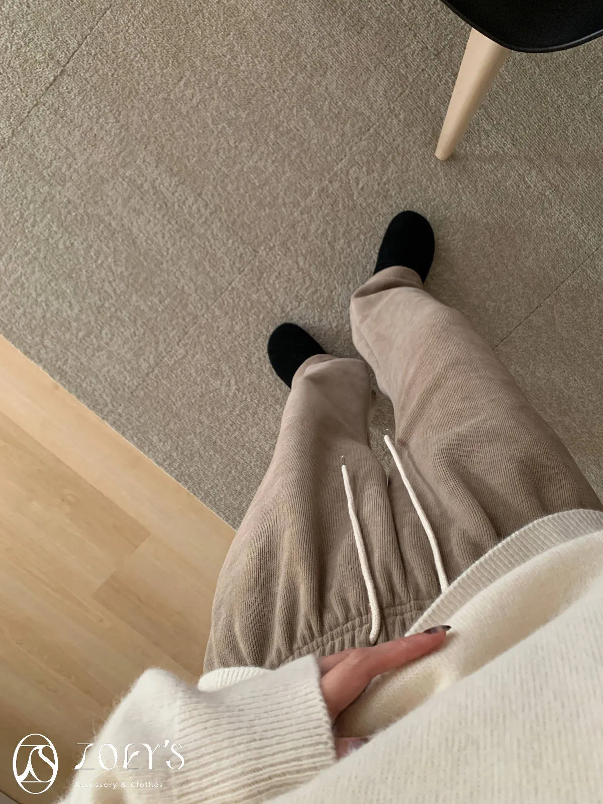 正韓 口袋小皮標療癒厚棉長褲 深灰綠/卡其