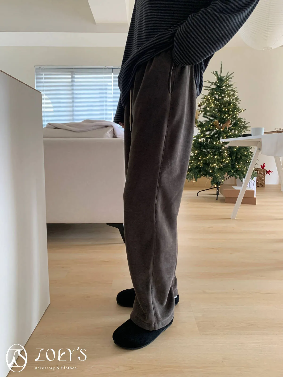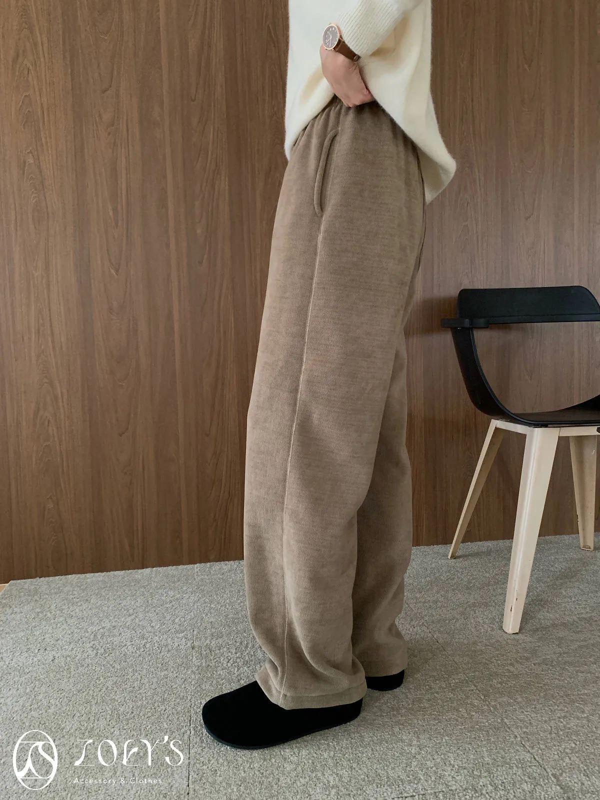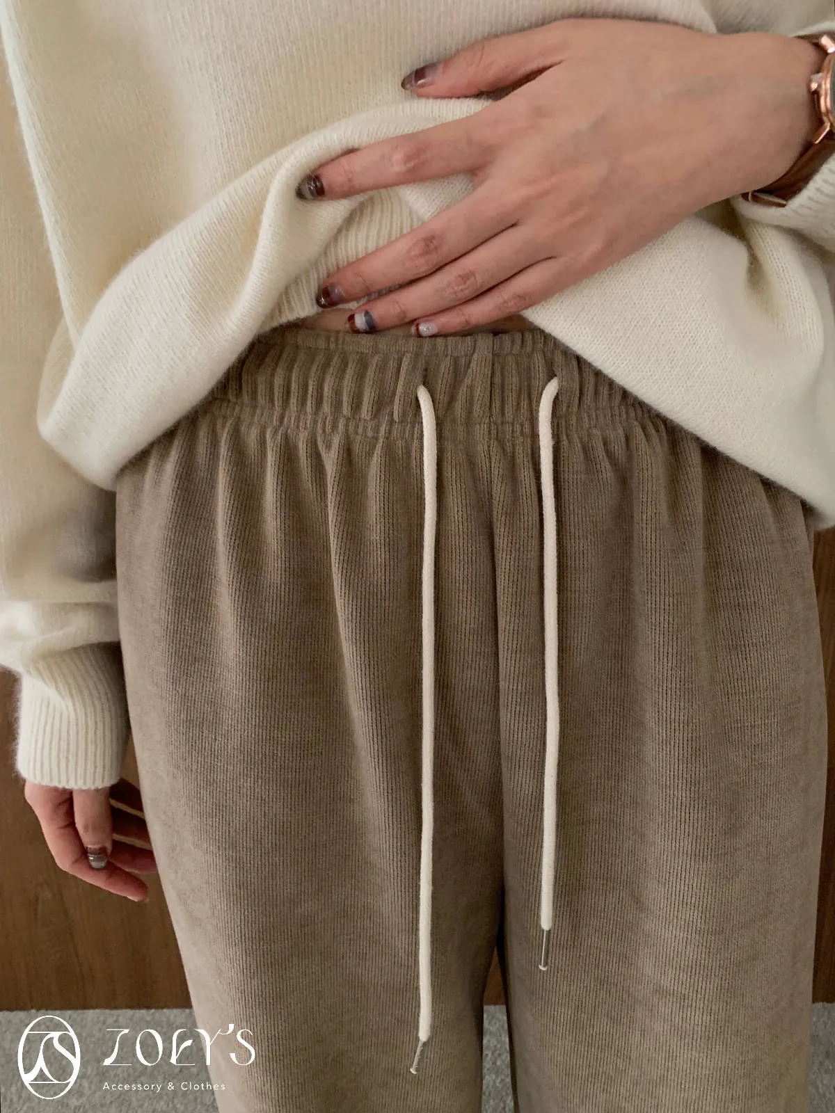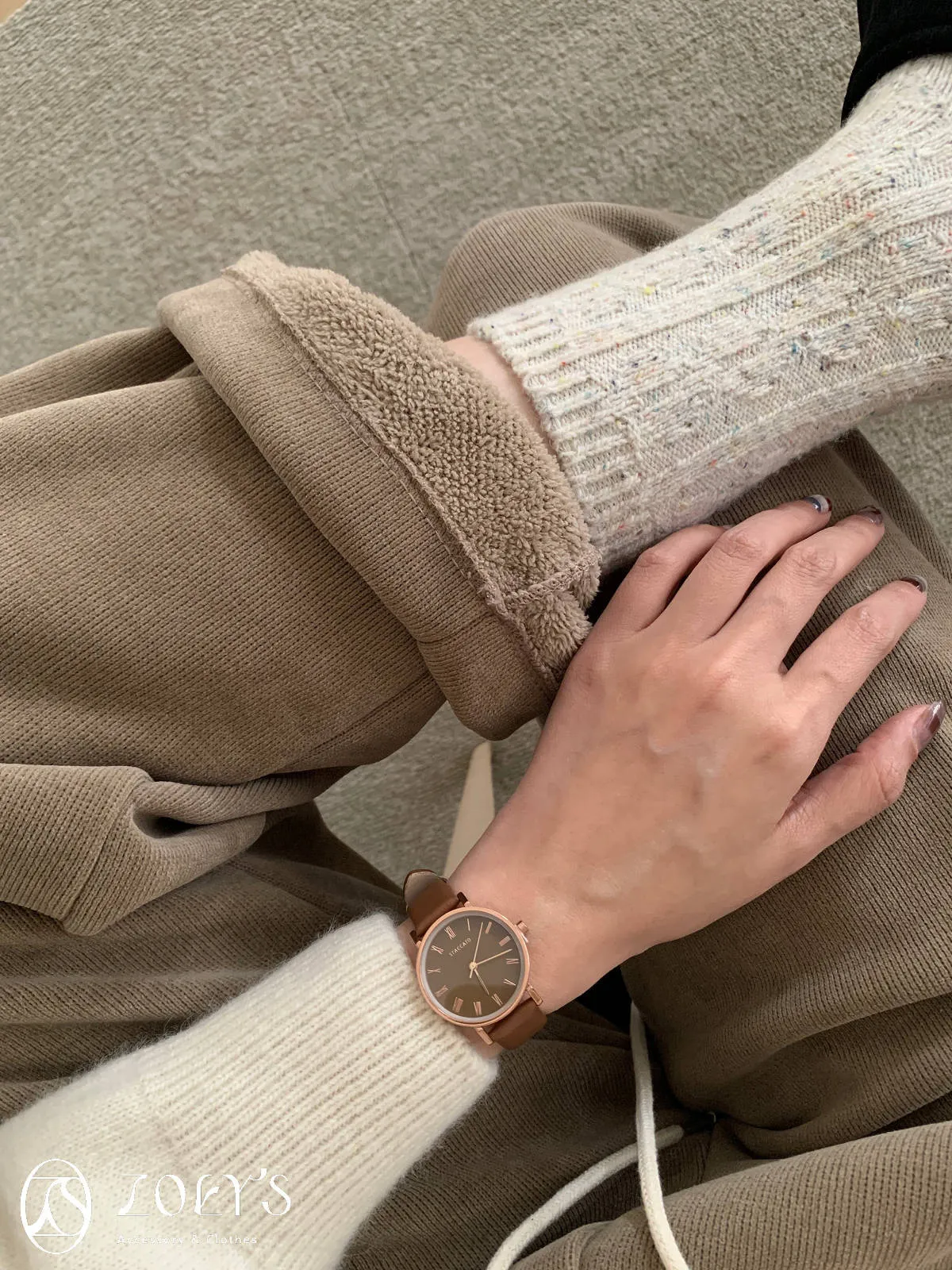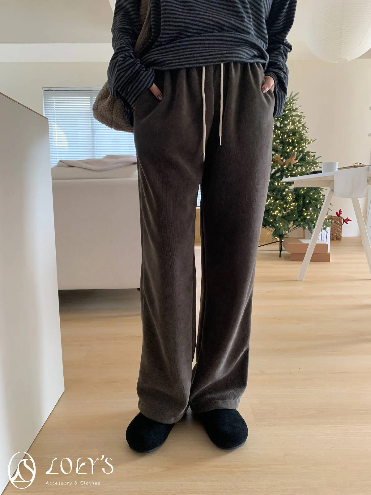 正韓 口袋小皮標療癒厚棉長褲 深灰綠/卡其