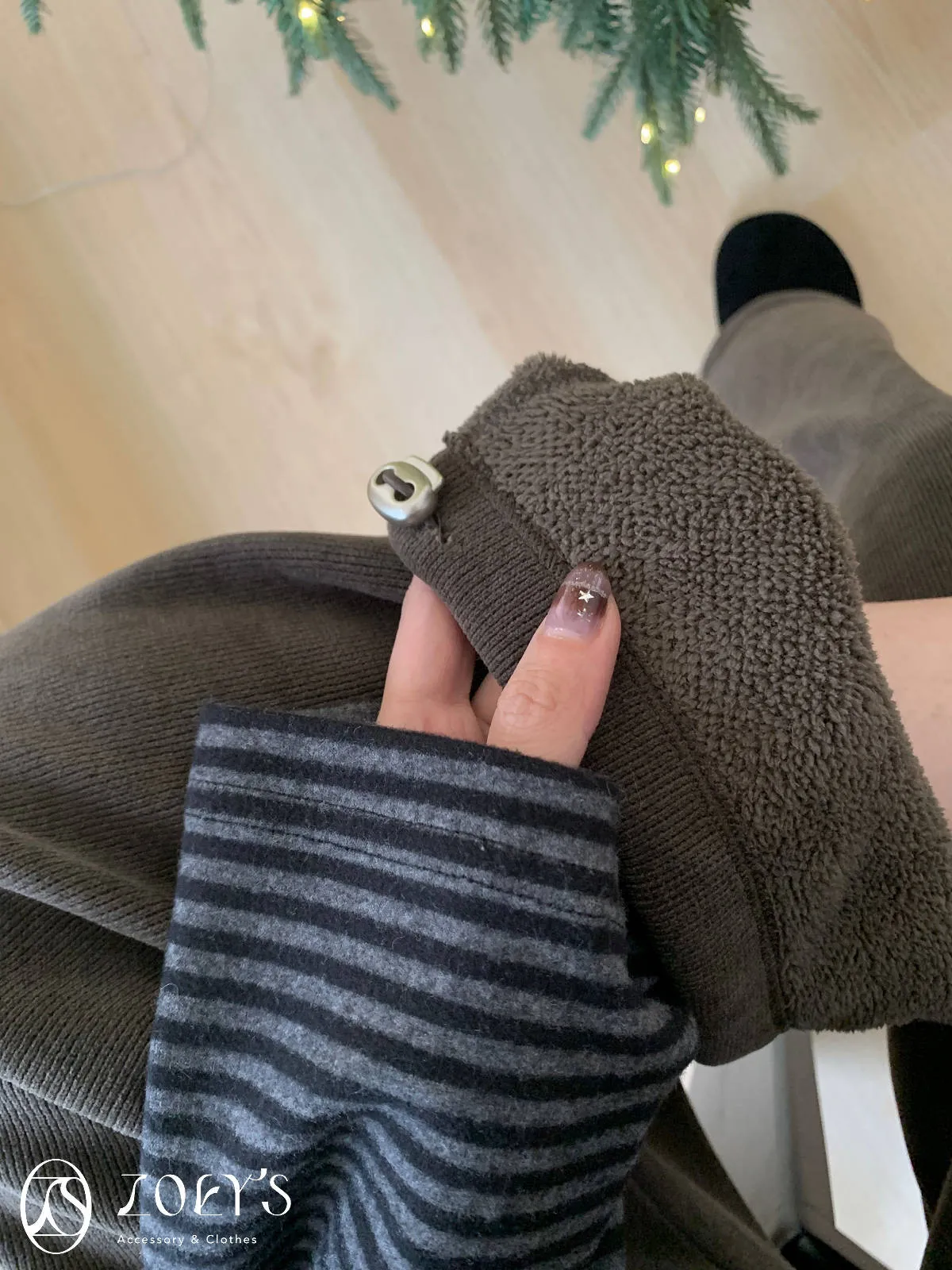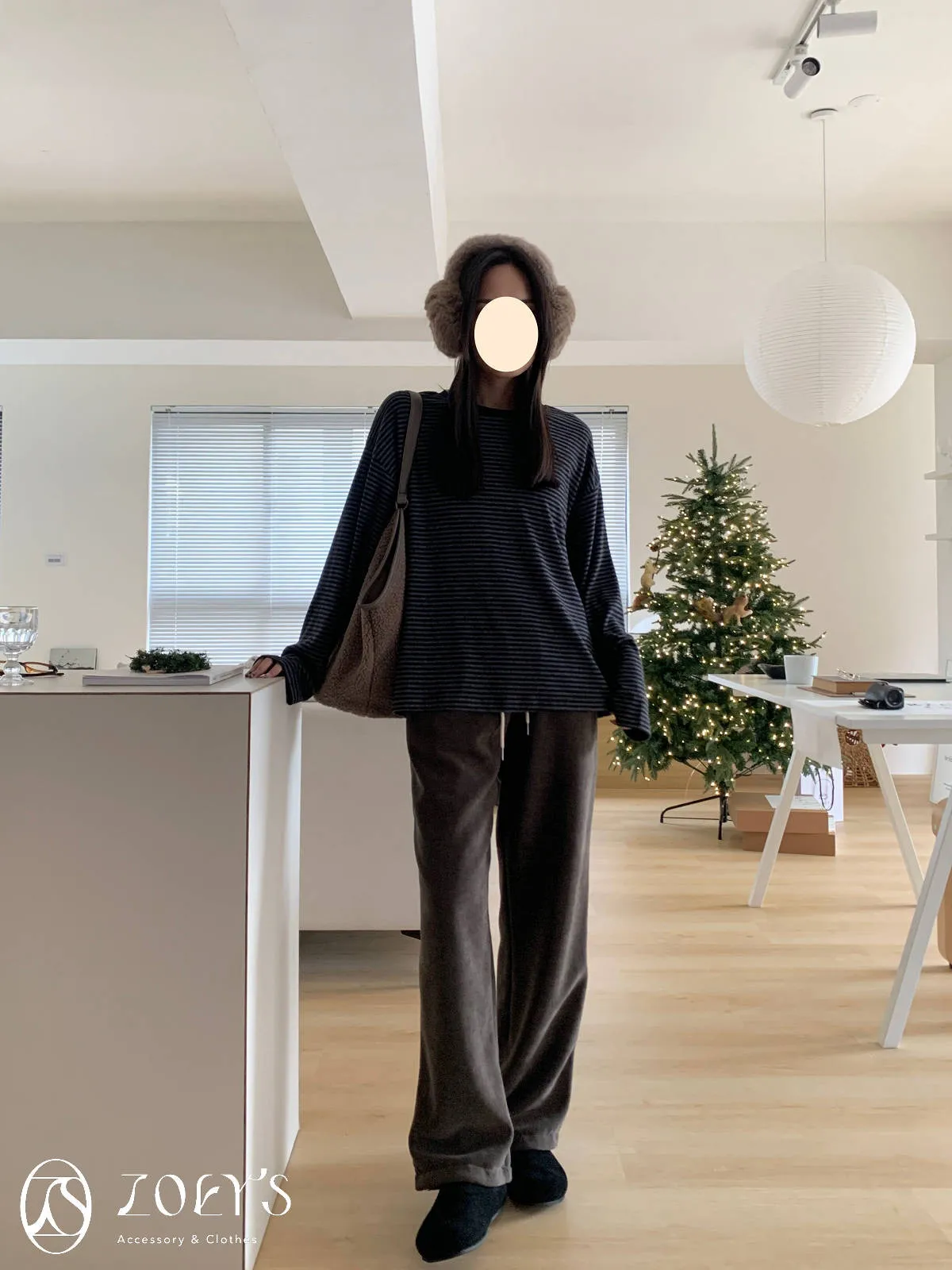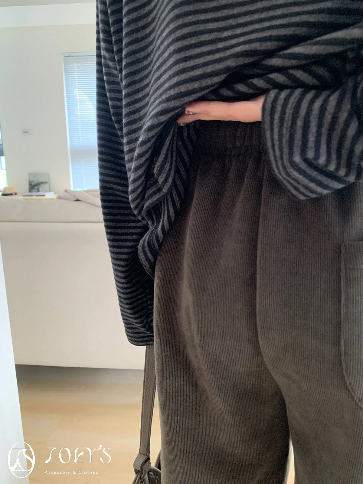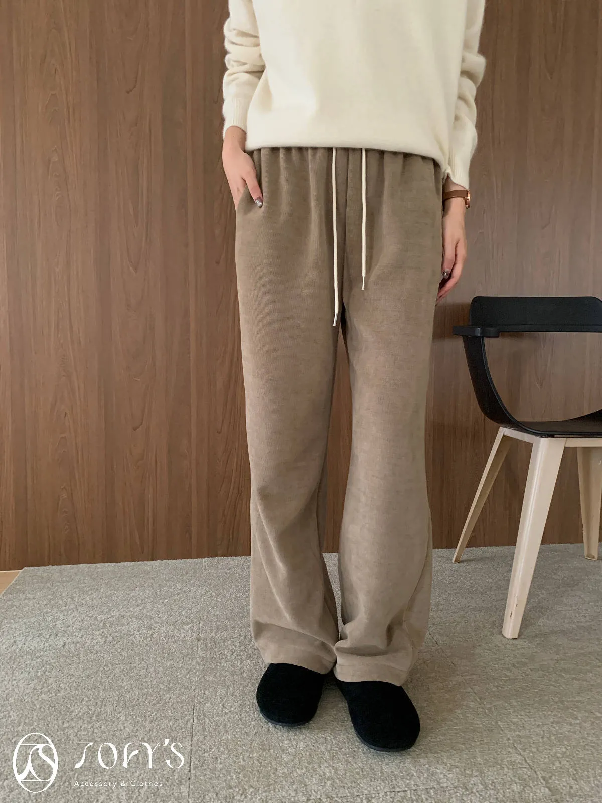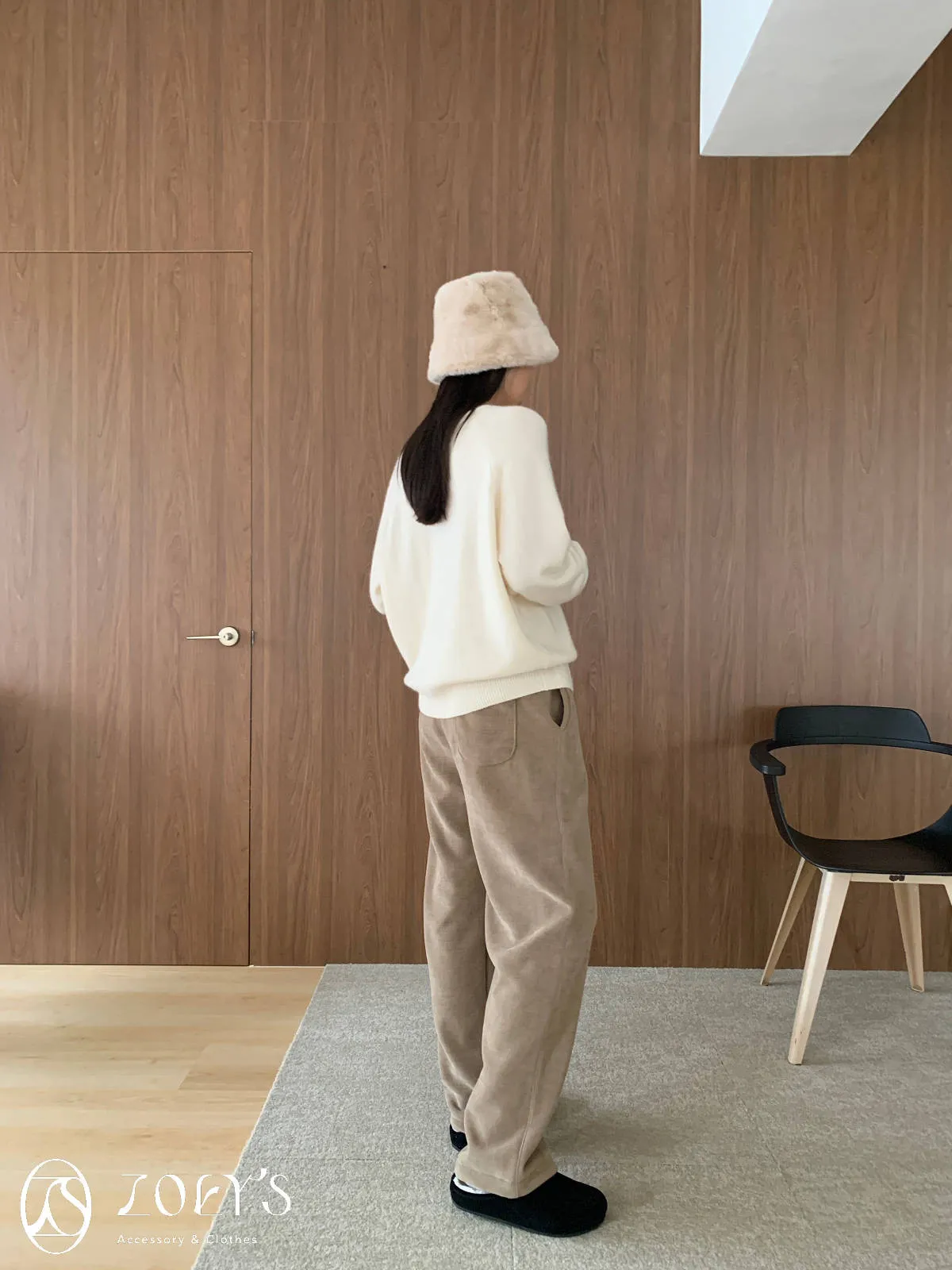 正韓 口袋小皮標療癒厚棉長褲 深灰綠/卡其