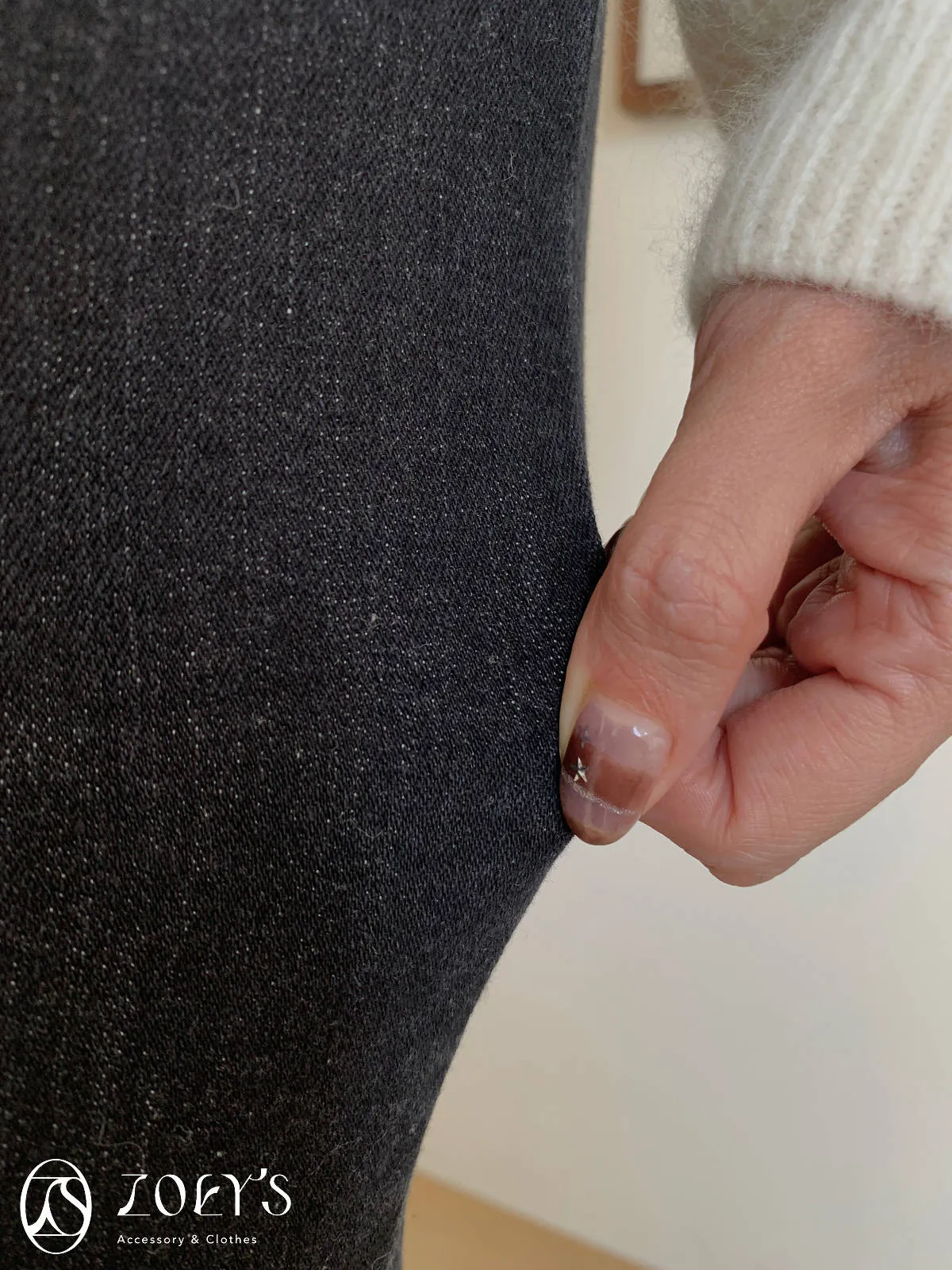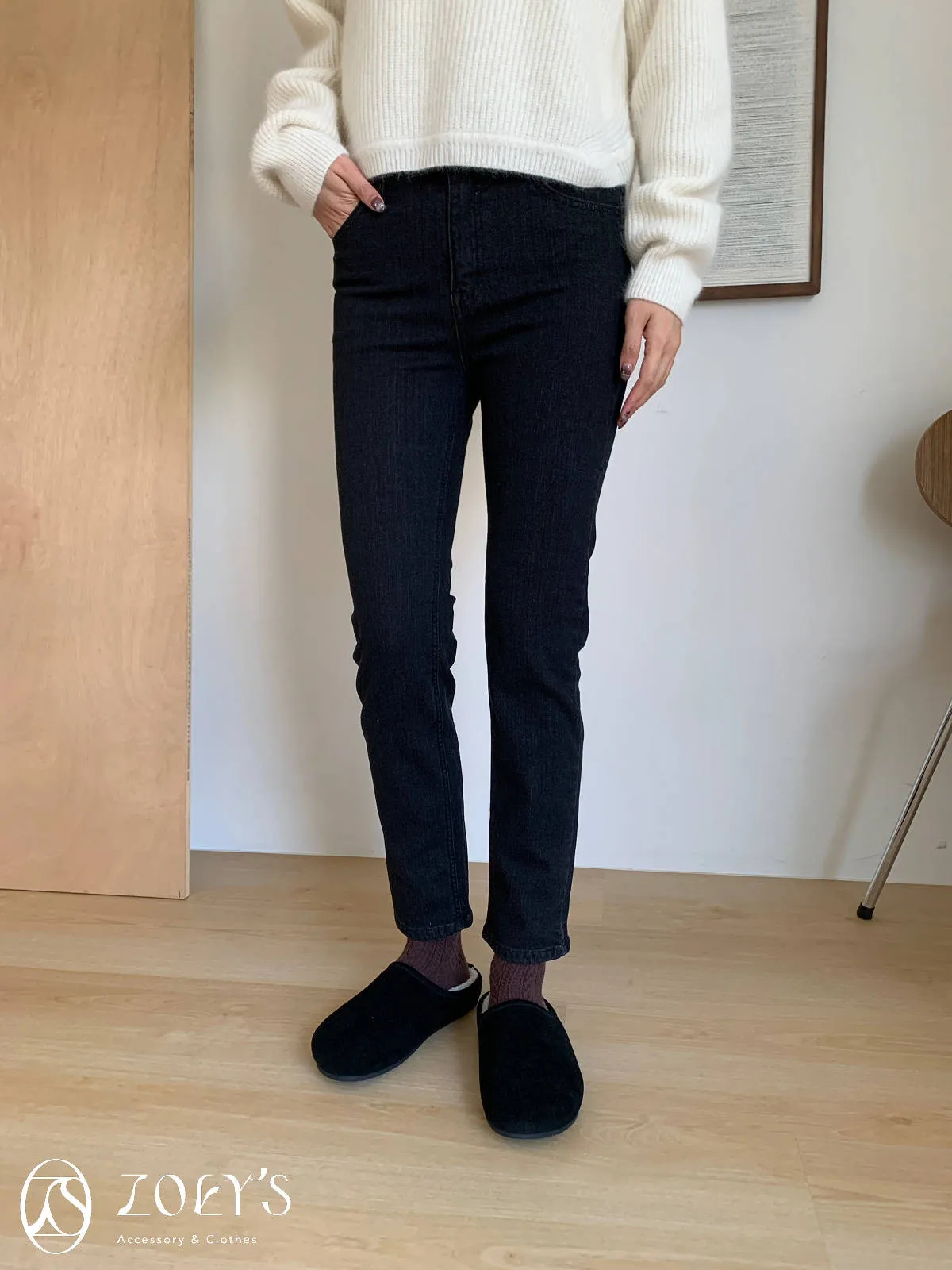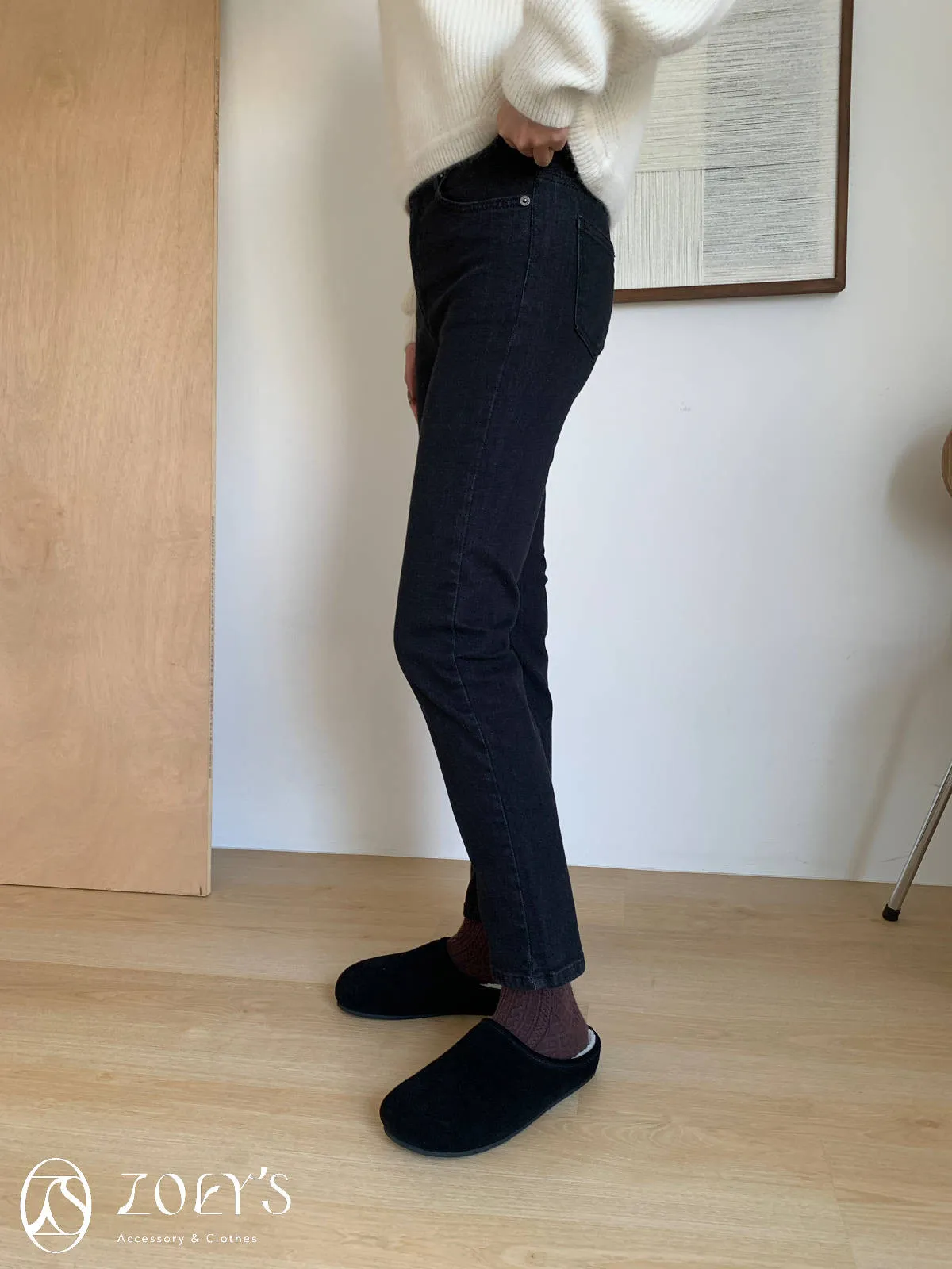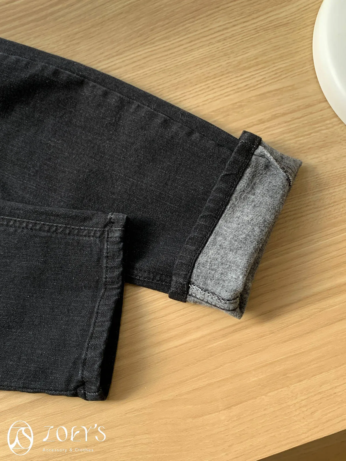 正韓 細直紋感內短絨黑色牛仔緊身褲 S/M/L