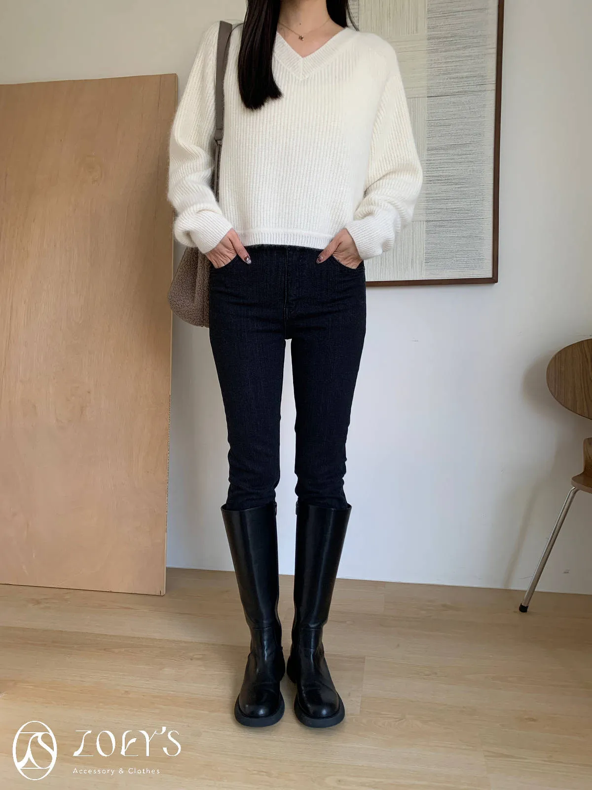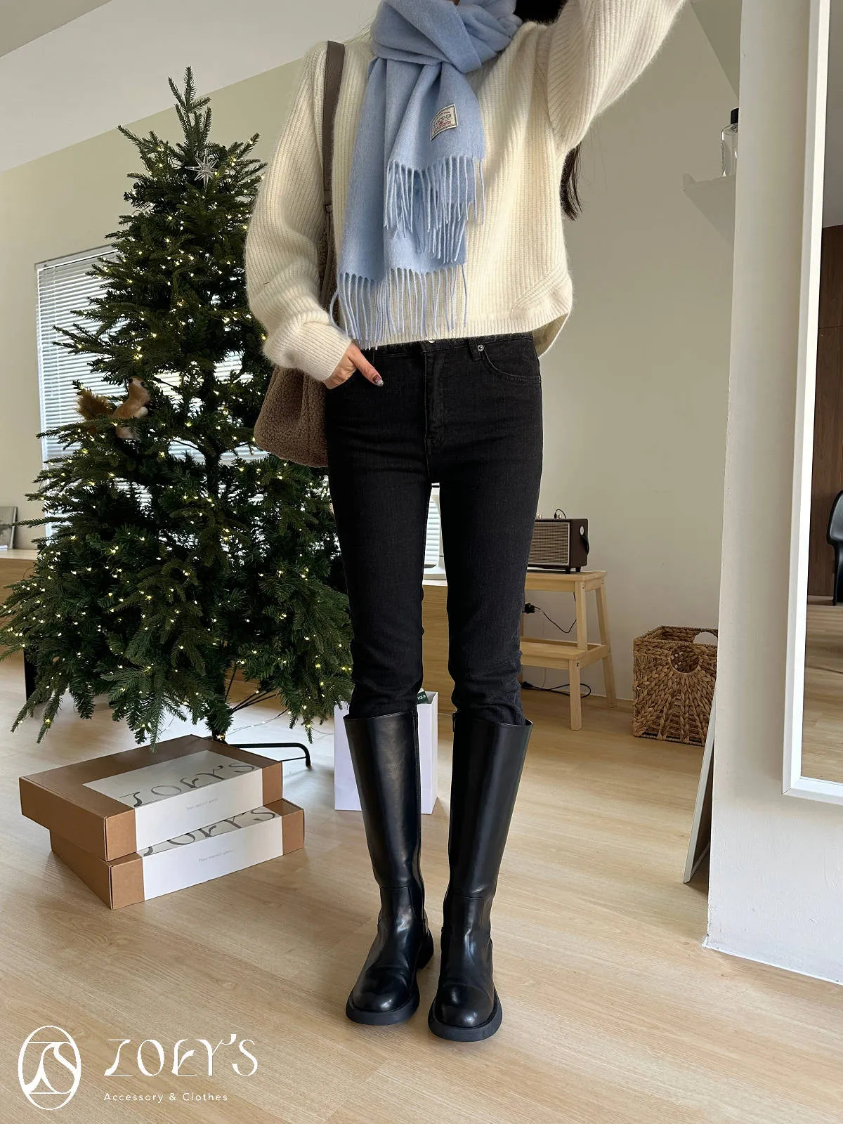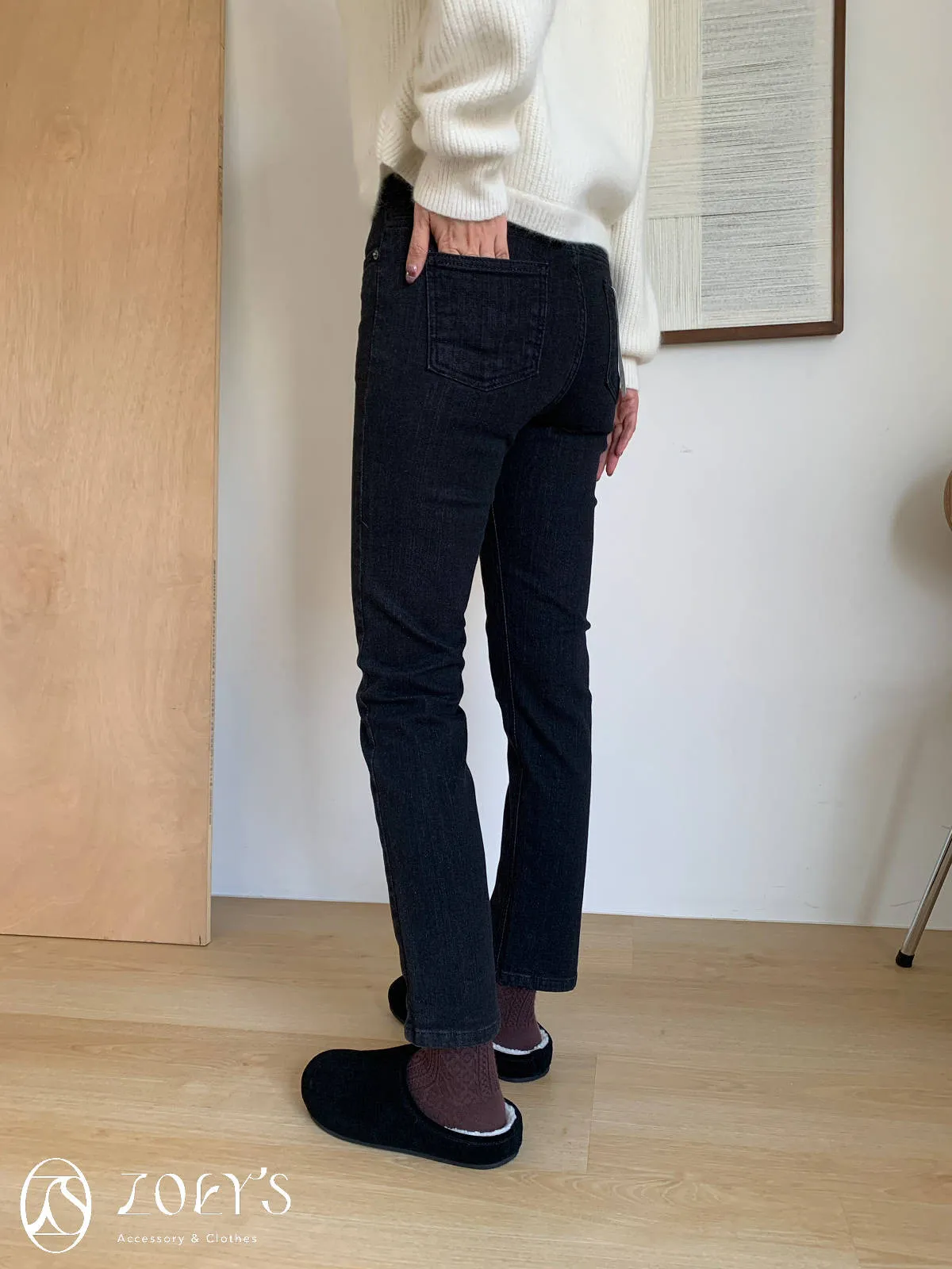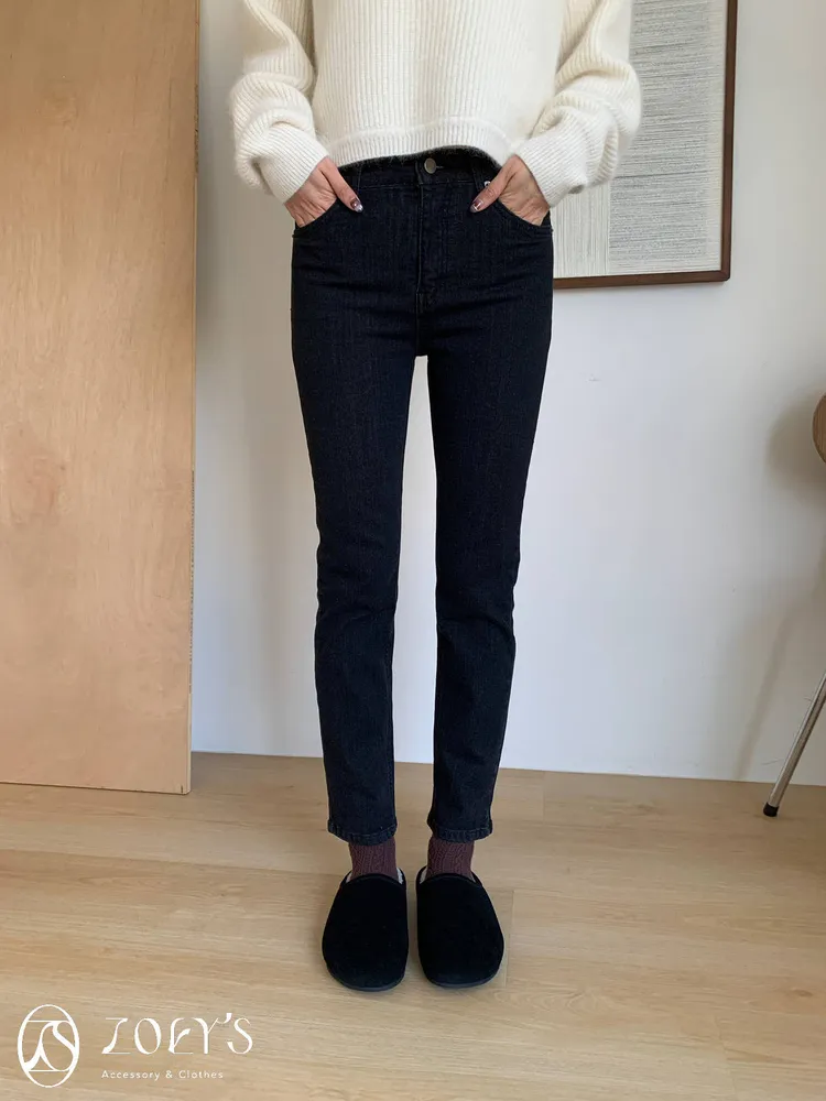 正韓 細直紋感內短絨黑色牛仔緊身褲 S/M/L