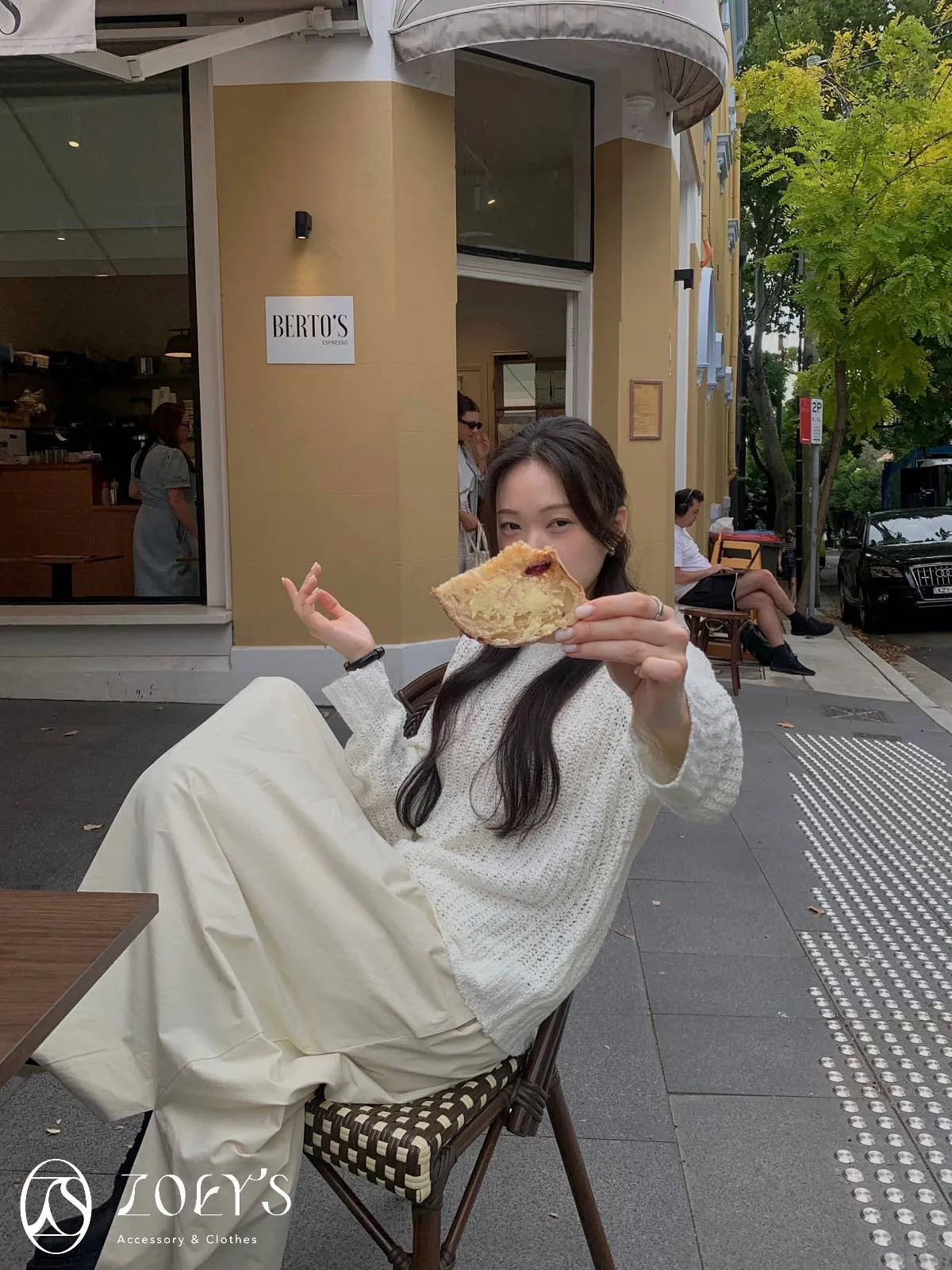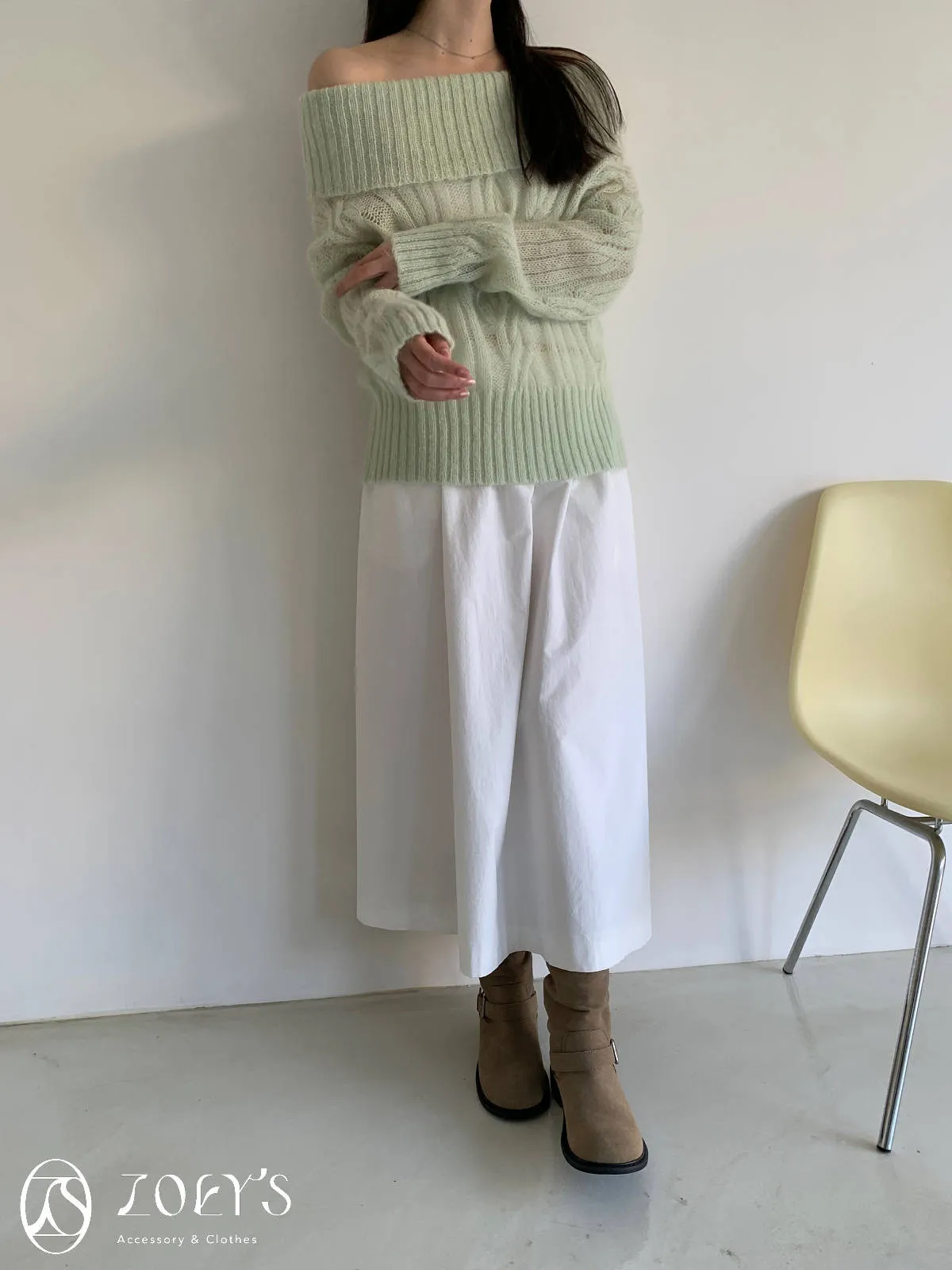 正韓 反折一字領編織羊毛衫 淺綠/米白