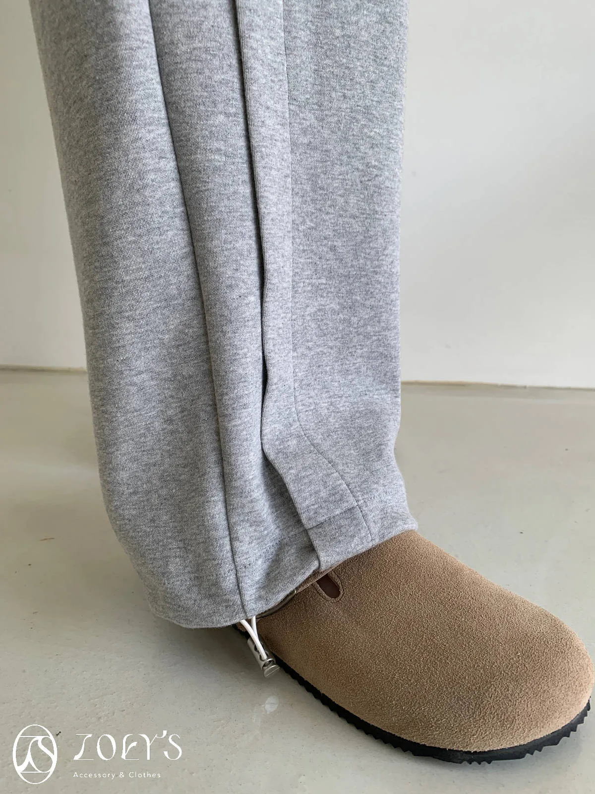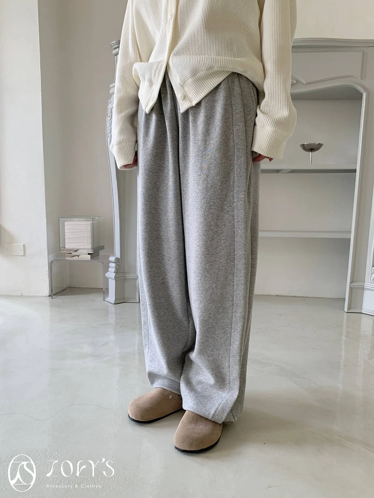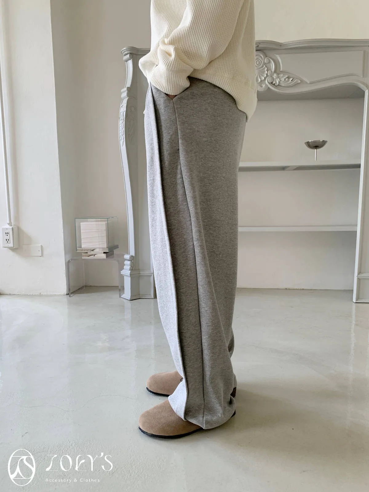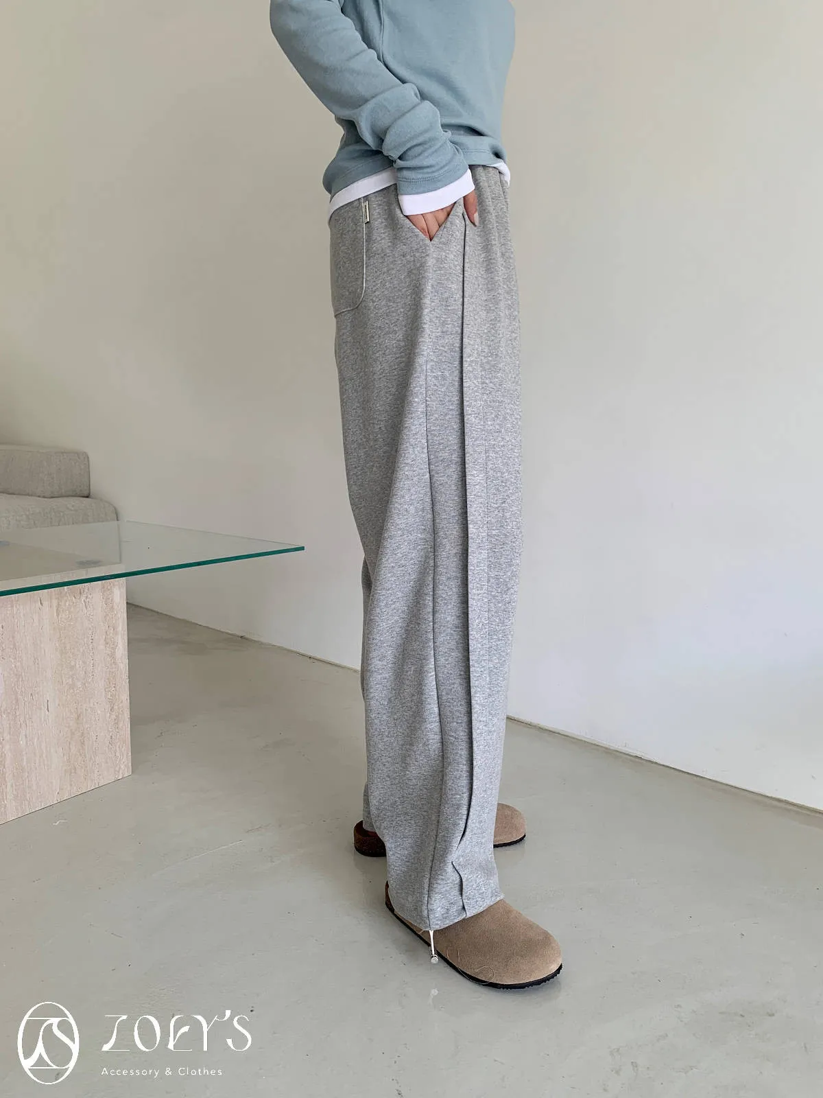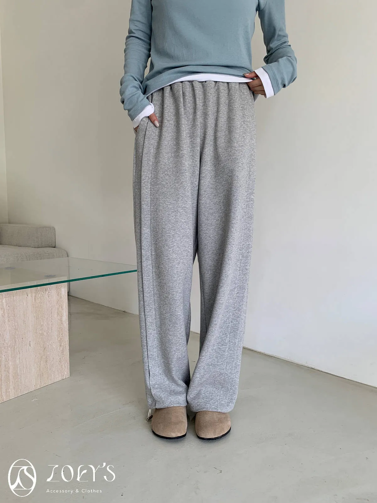 正韓 褶線延伸滑棉長褲 淺灰/米白