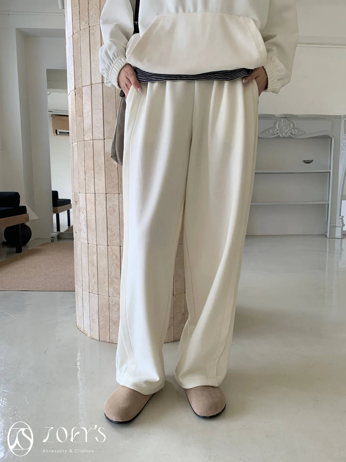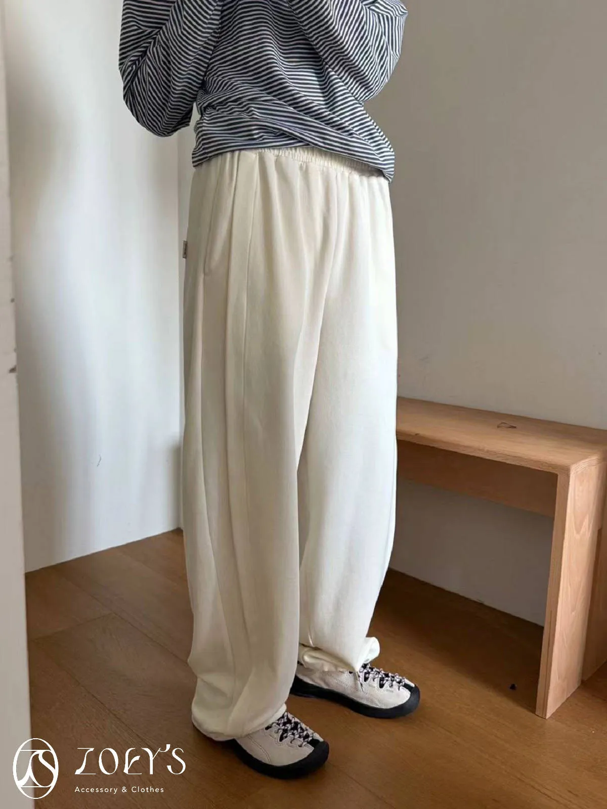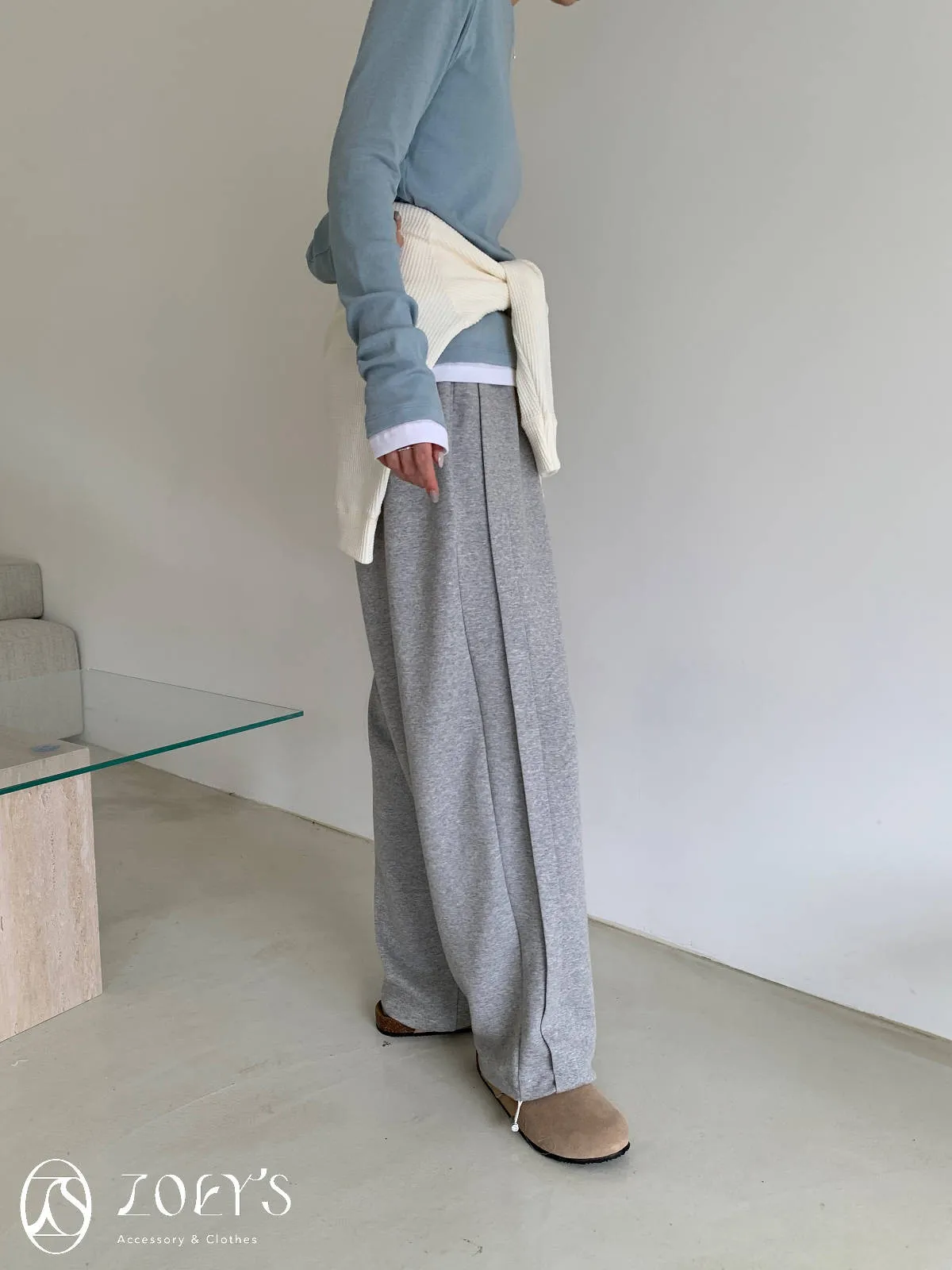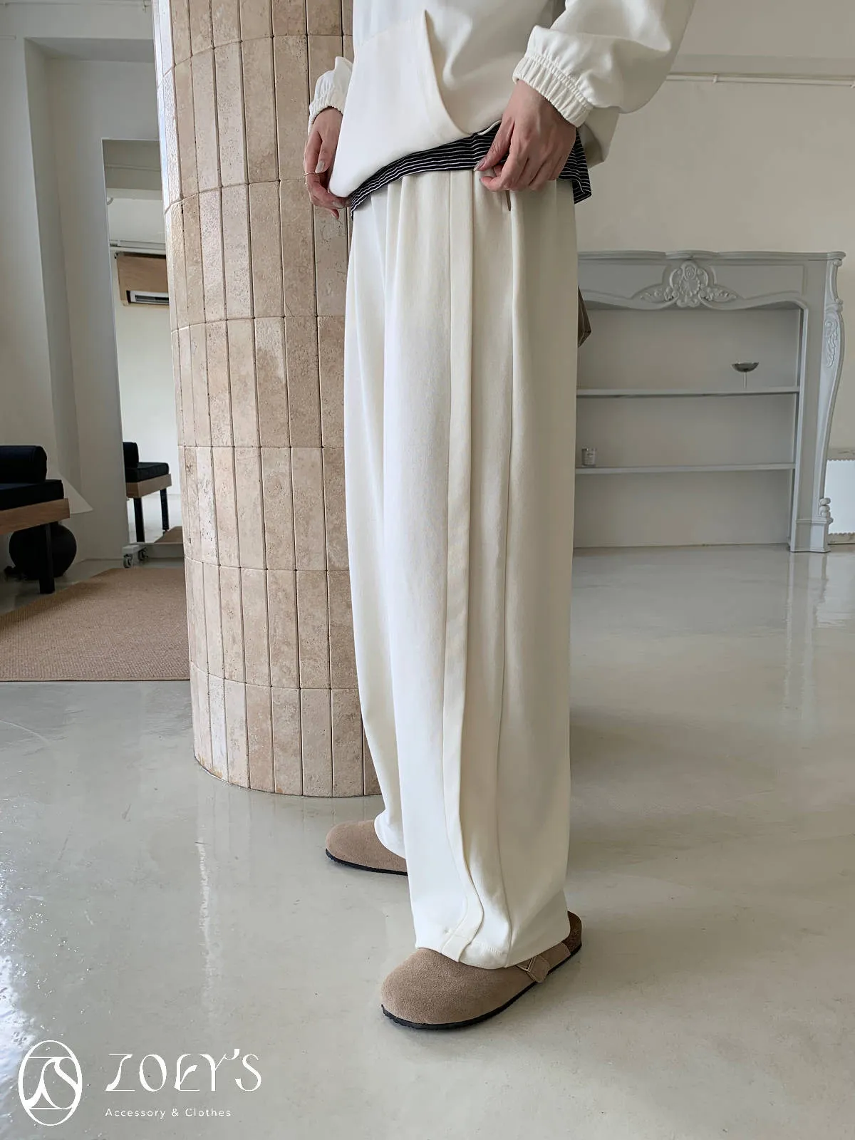 正韓 褶線延伸滑棉長褲 淺灰/米白