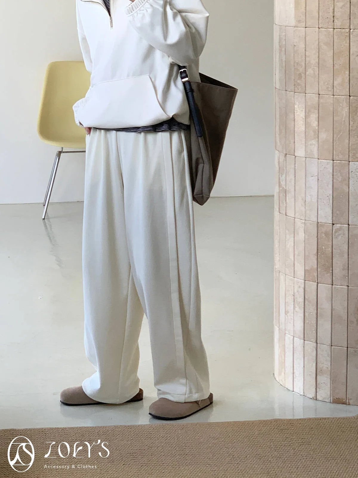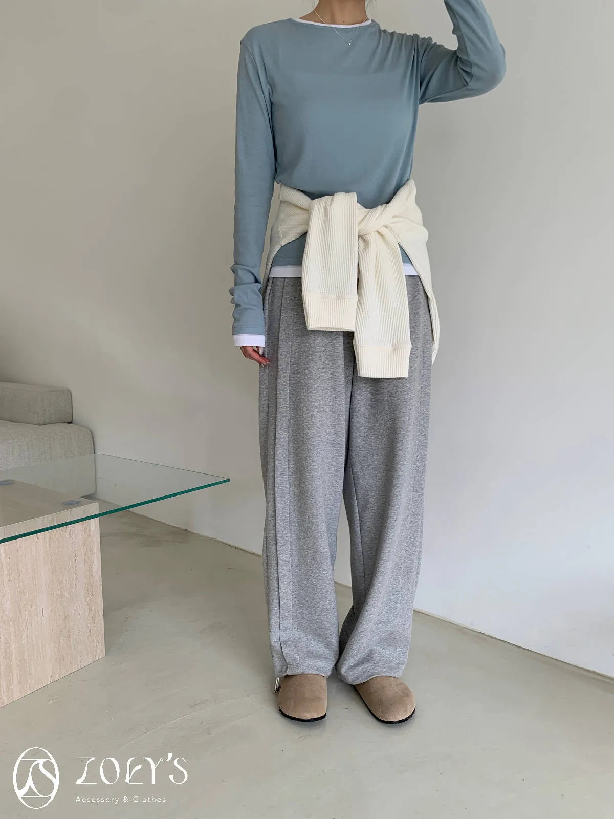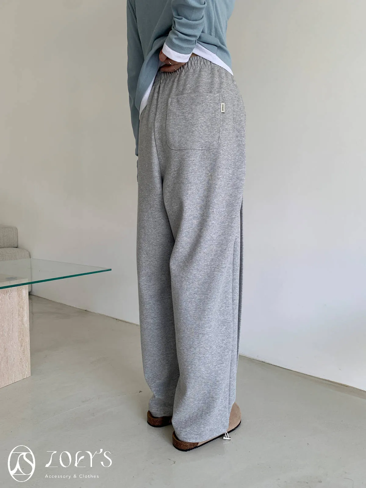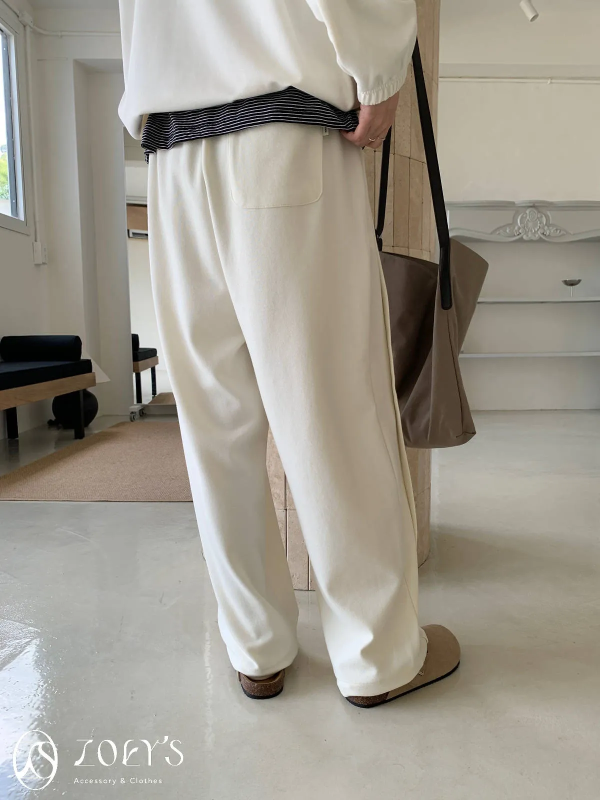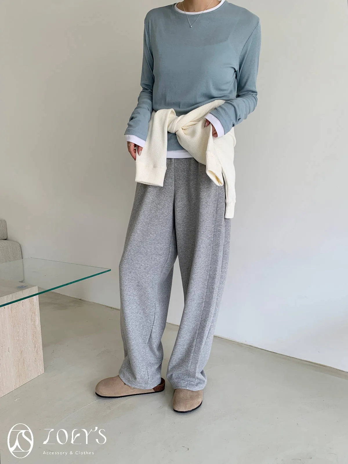 正韓 褶線延伸滑棉長褲 淺灰/米白
