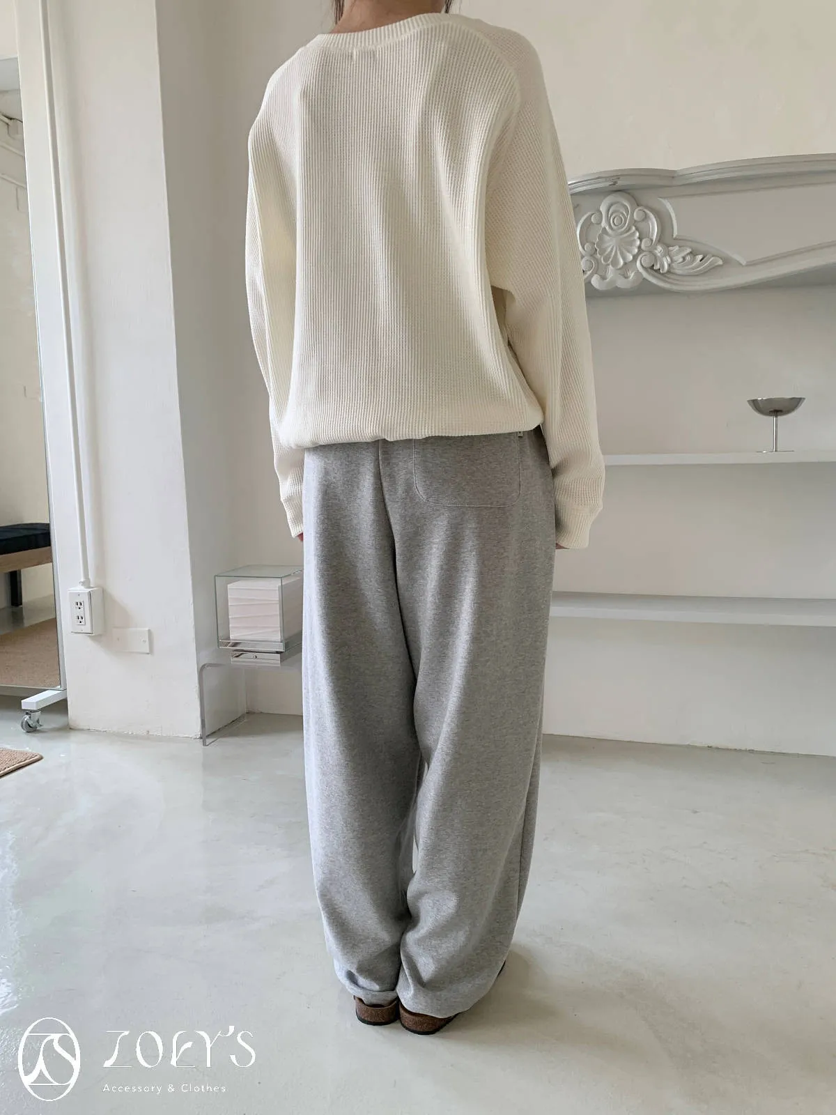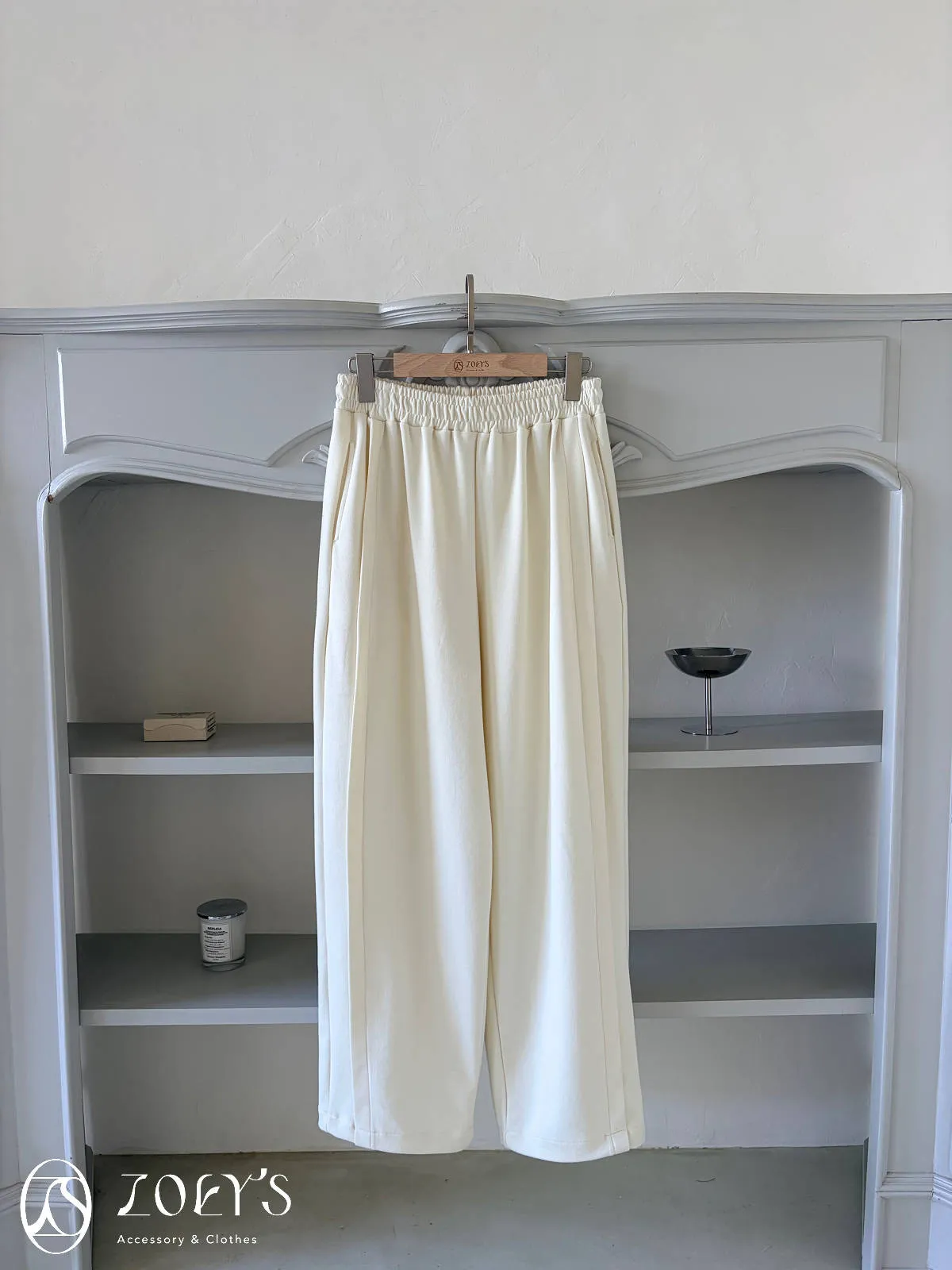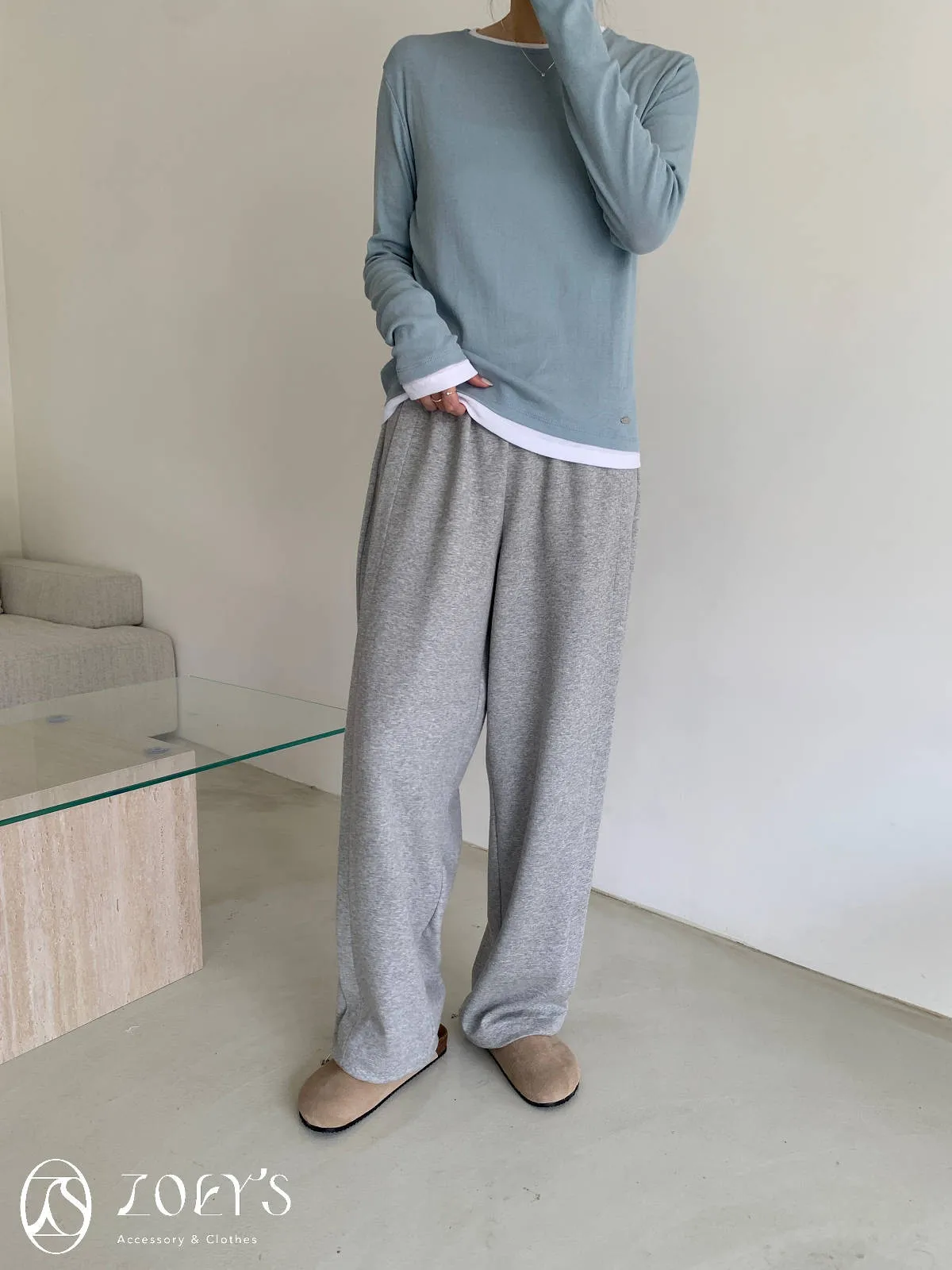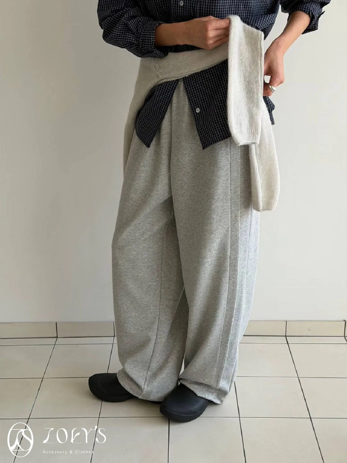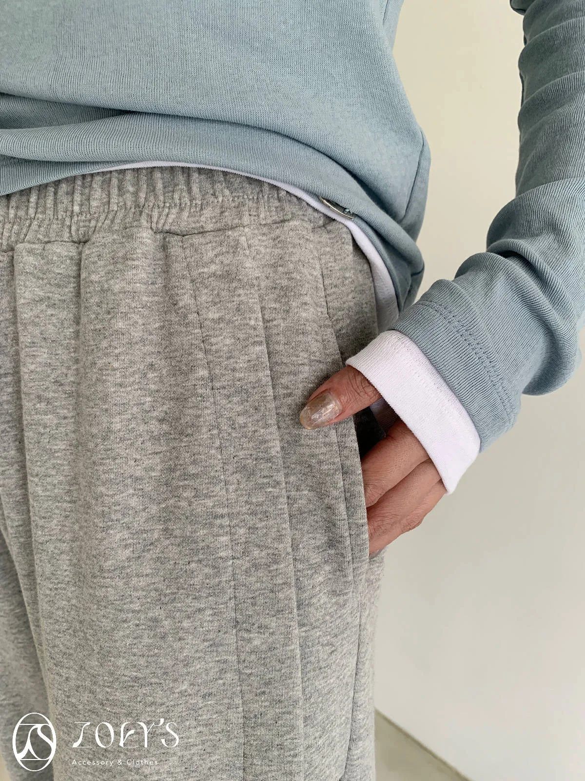 正韓 褶線延伸滑棉長褲 淺灰/米白