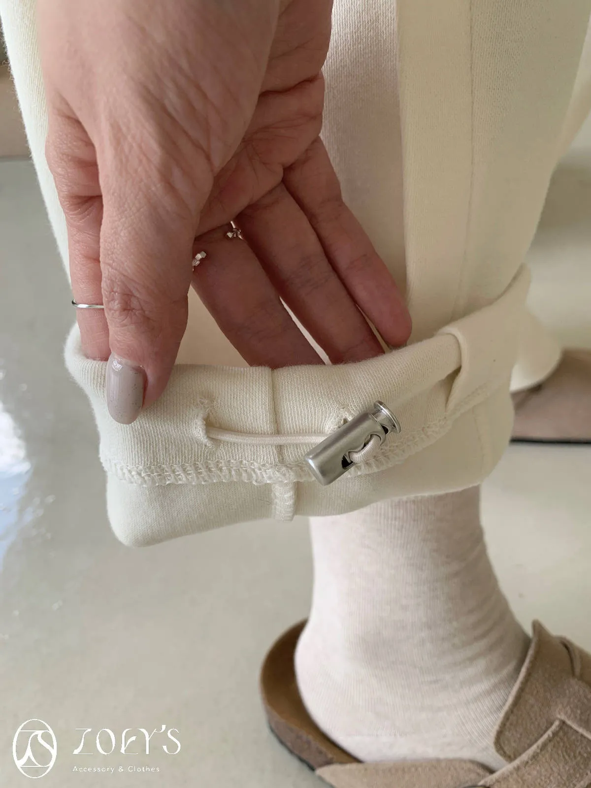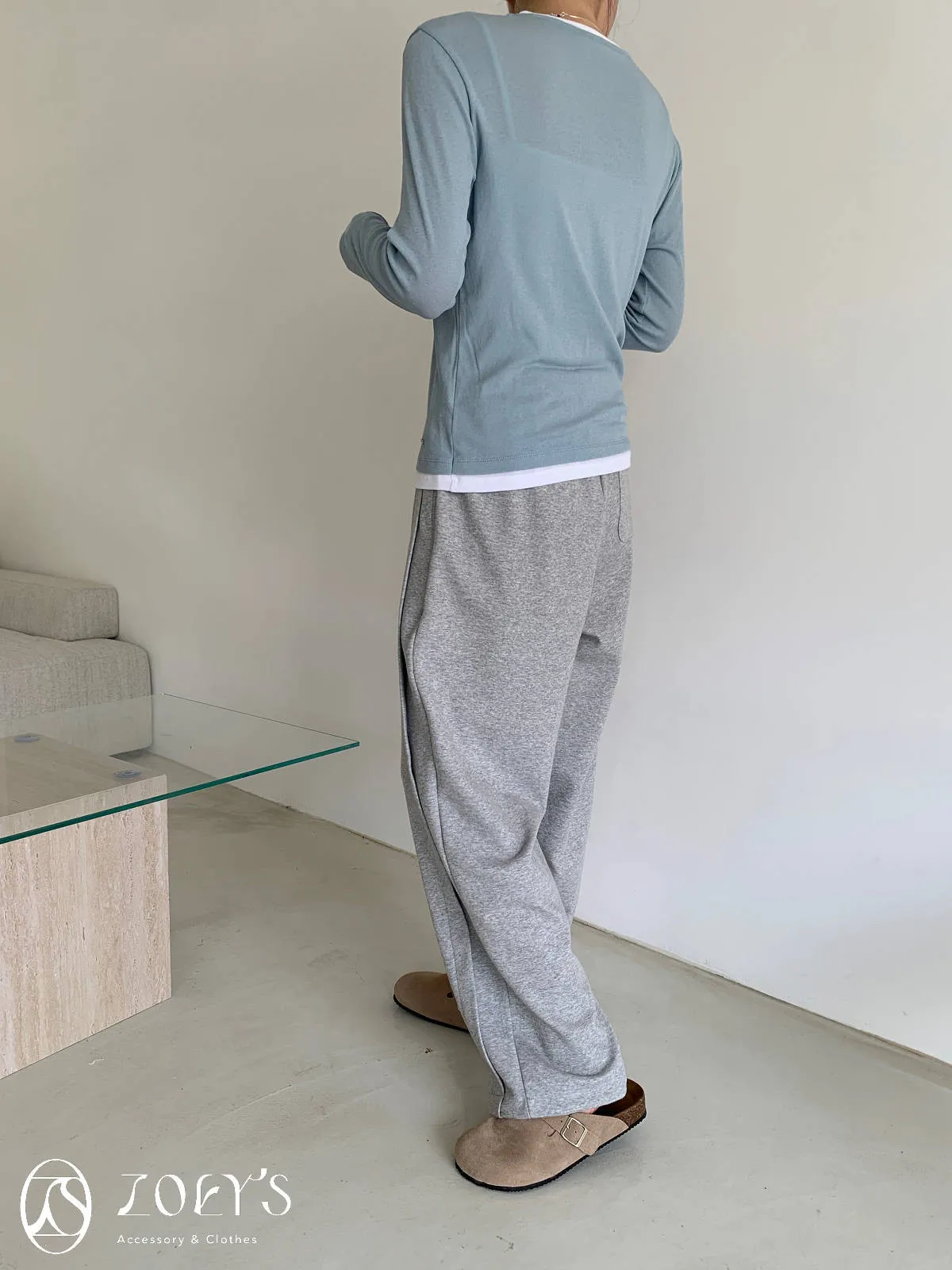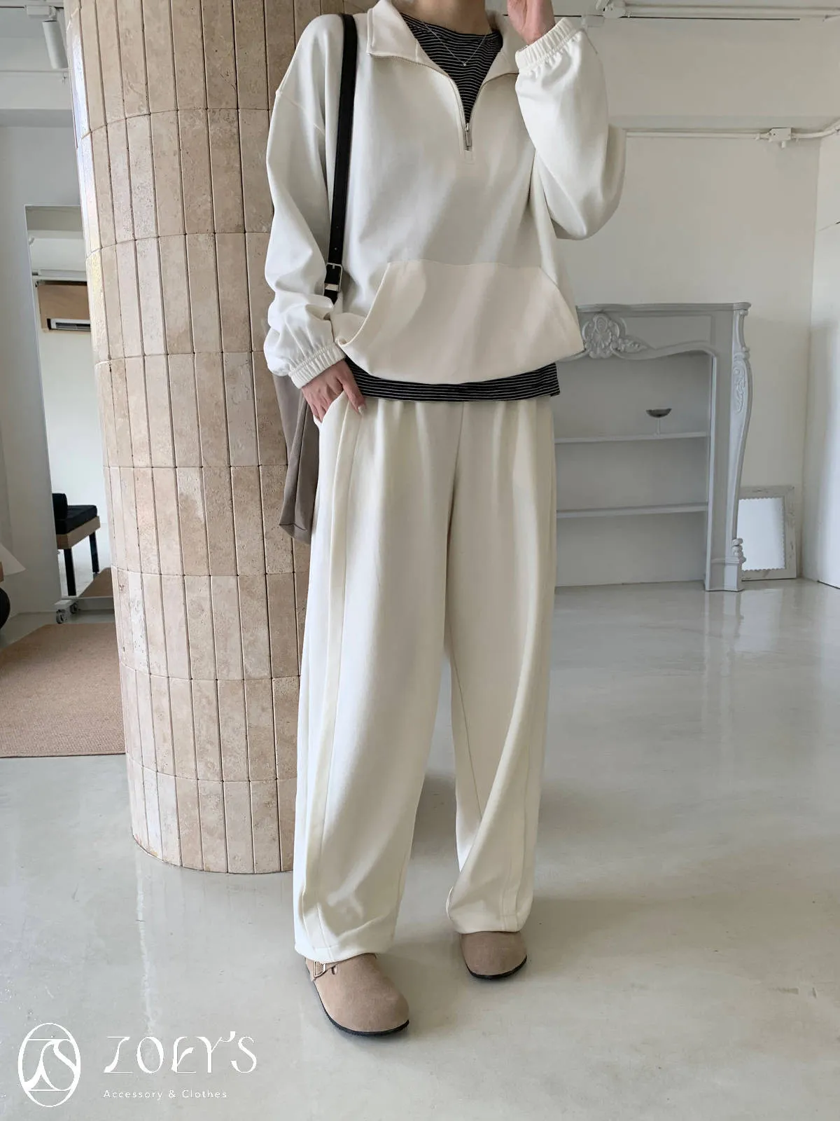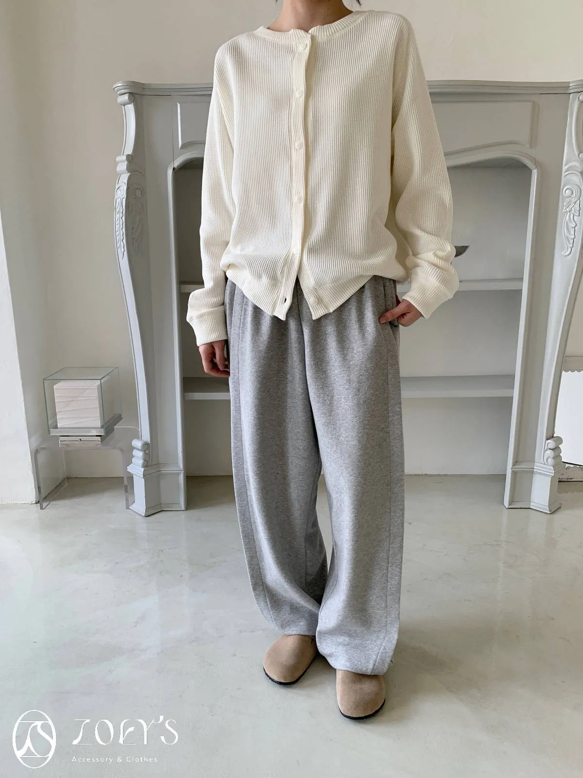 正韓 褶線延伸滑棉長褲 淺灰/米白