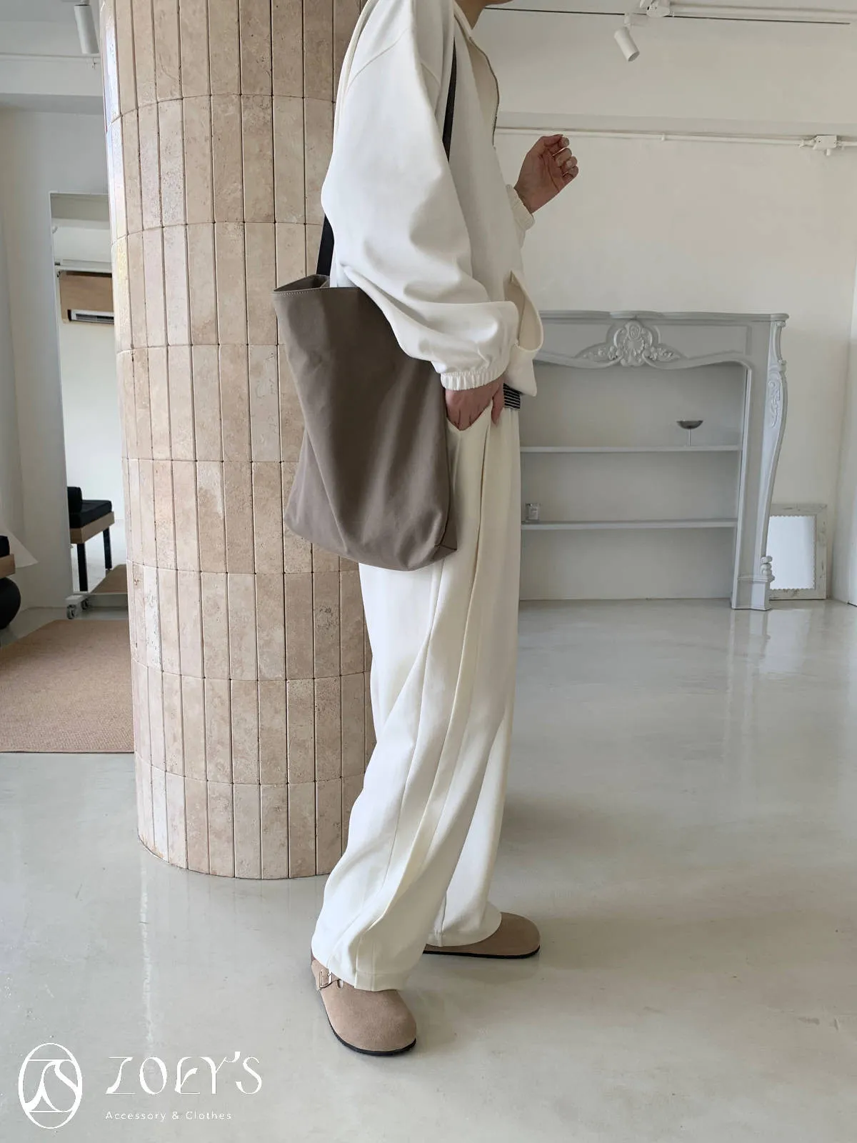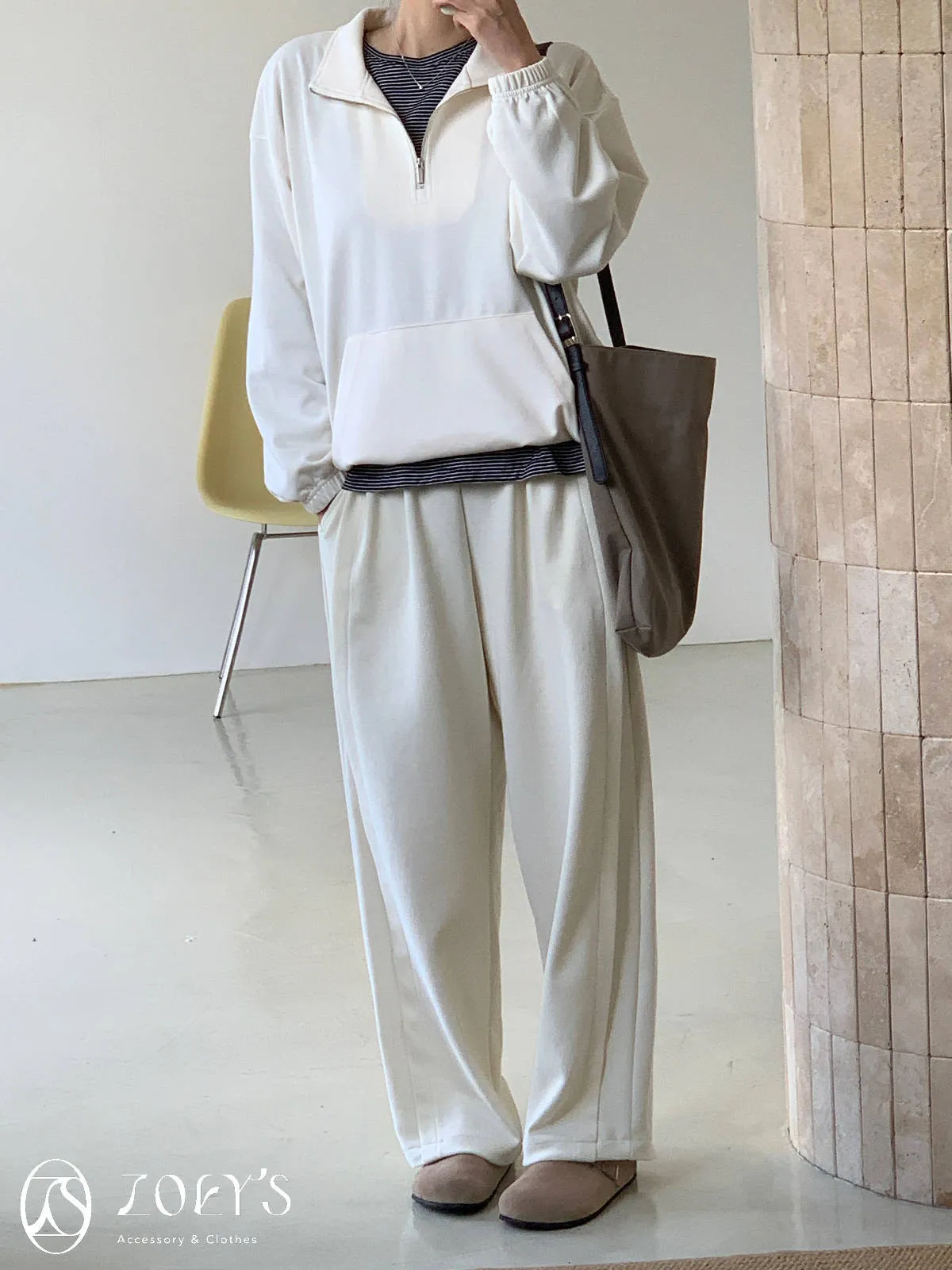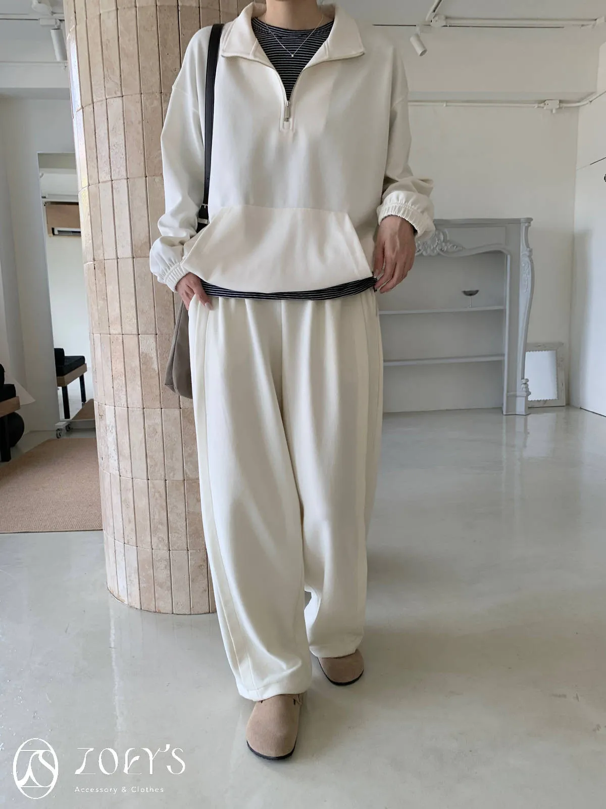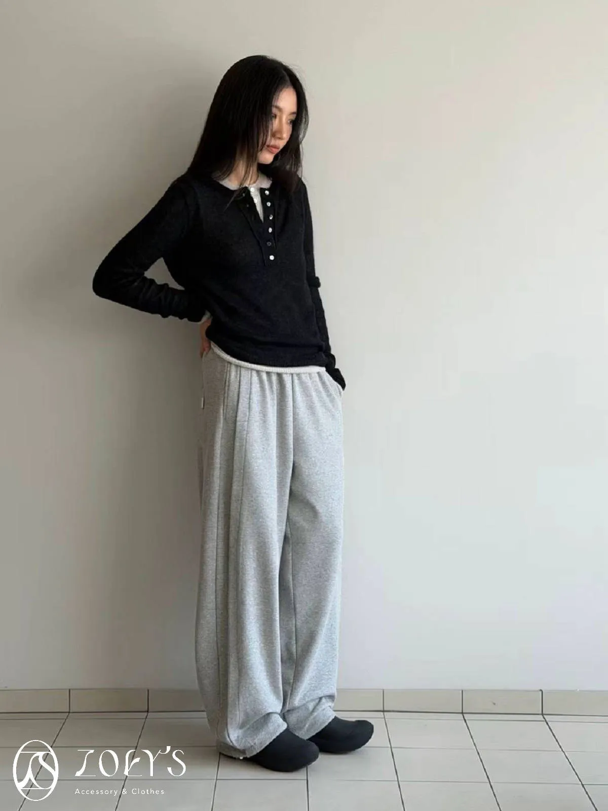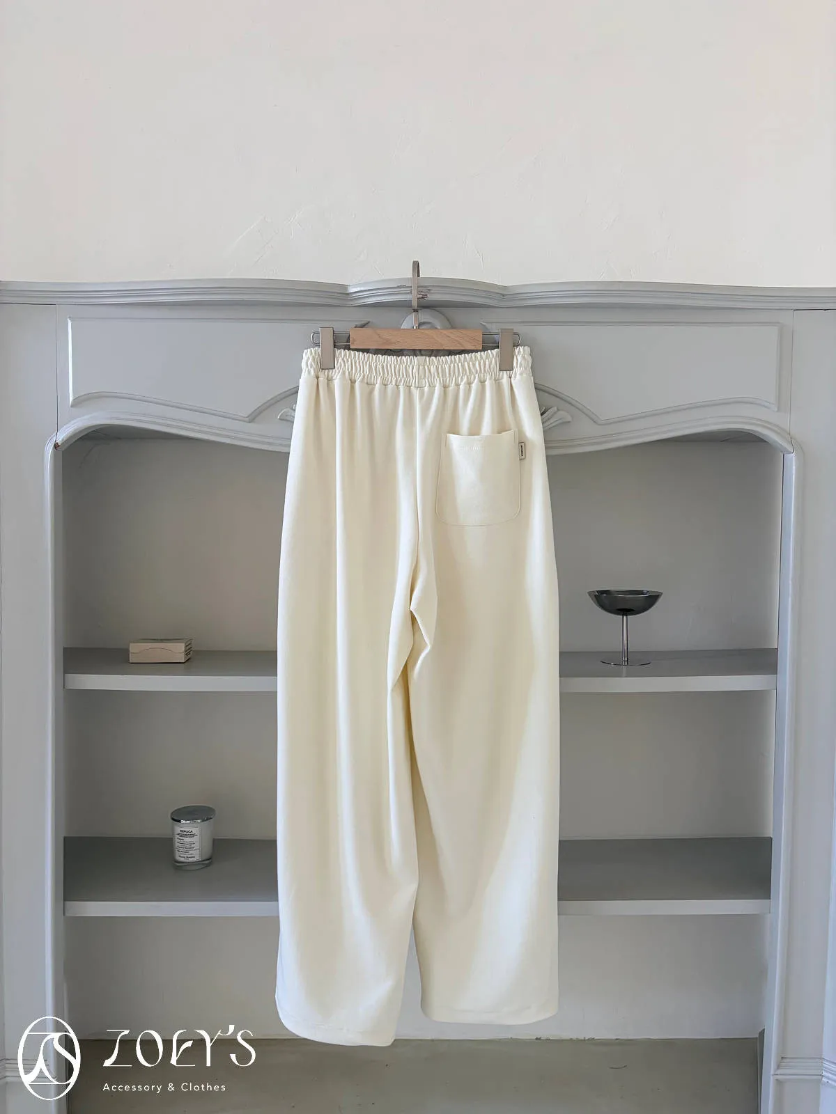 正韓 褶線延伸滑棉長褲 淺灰/米白